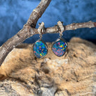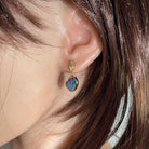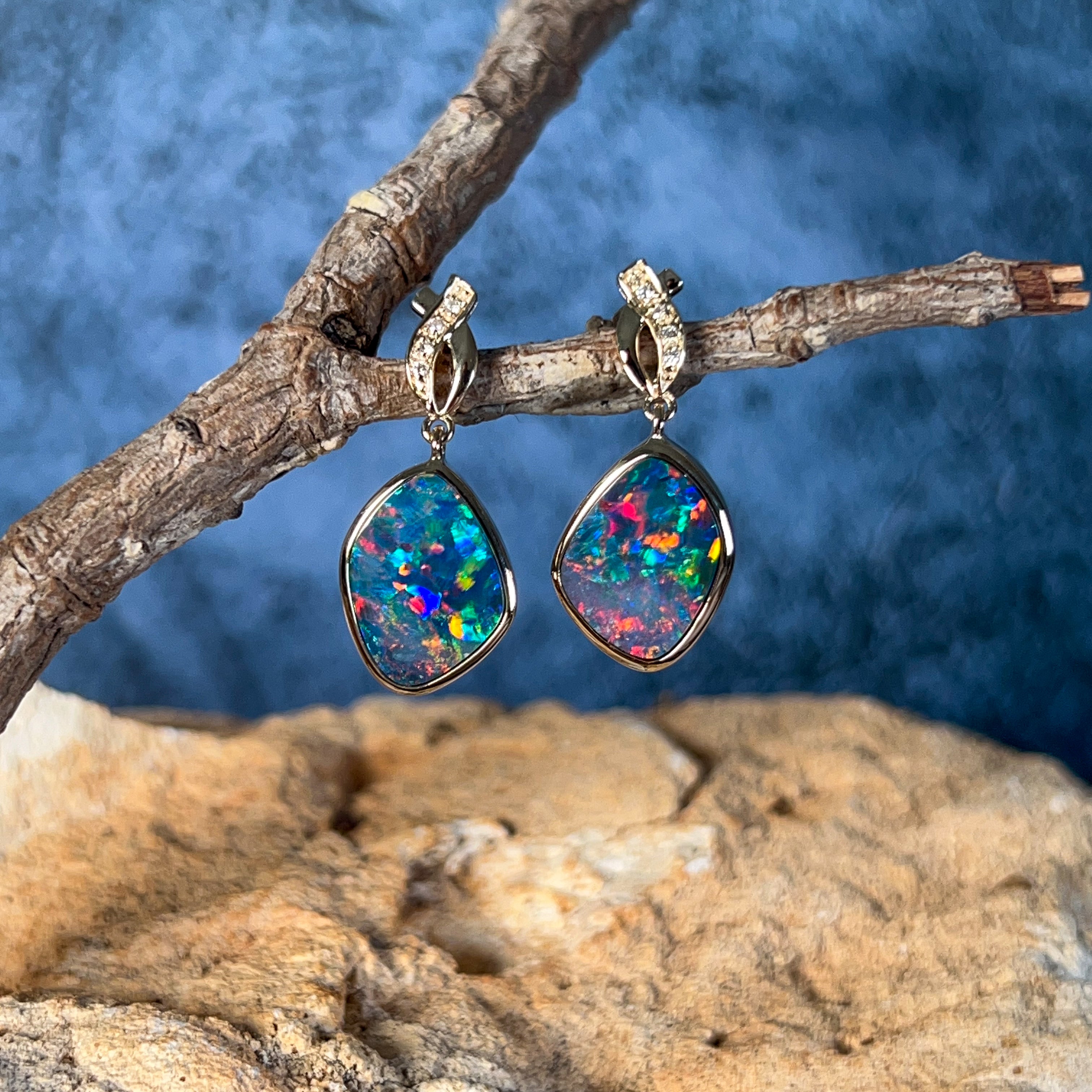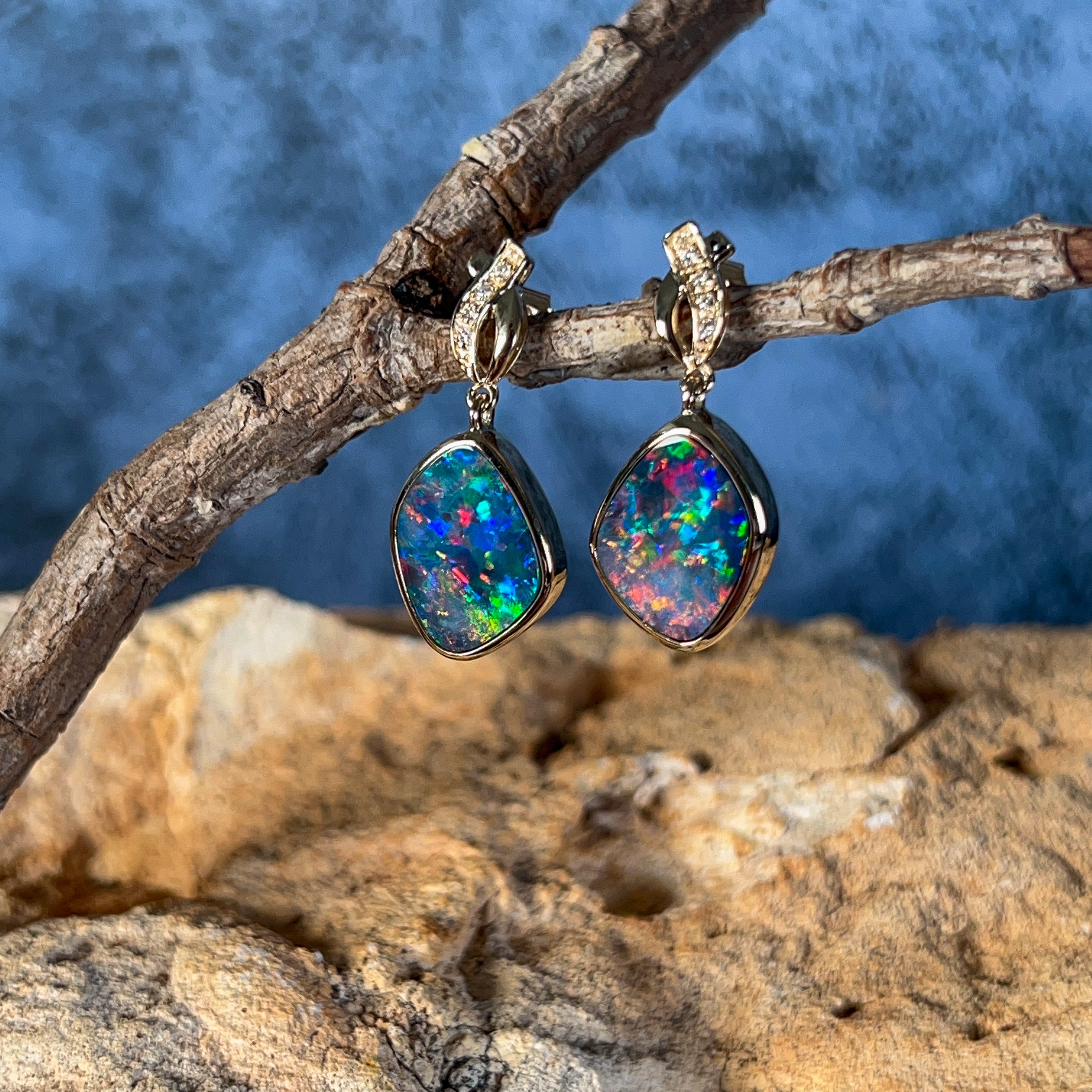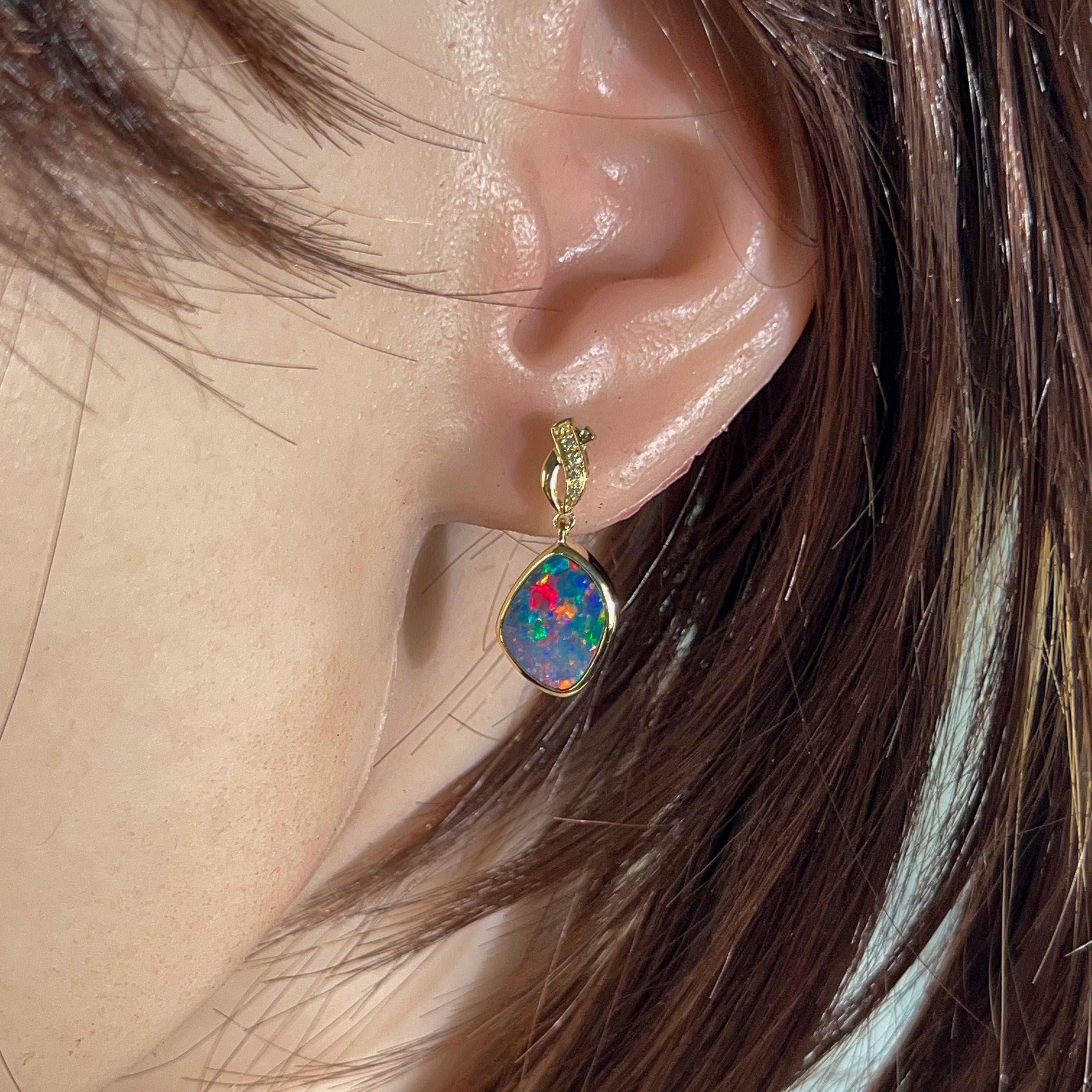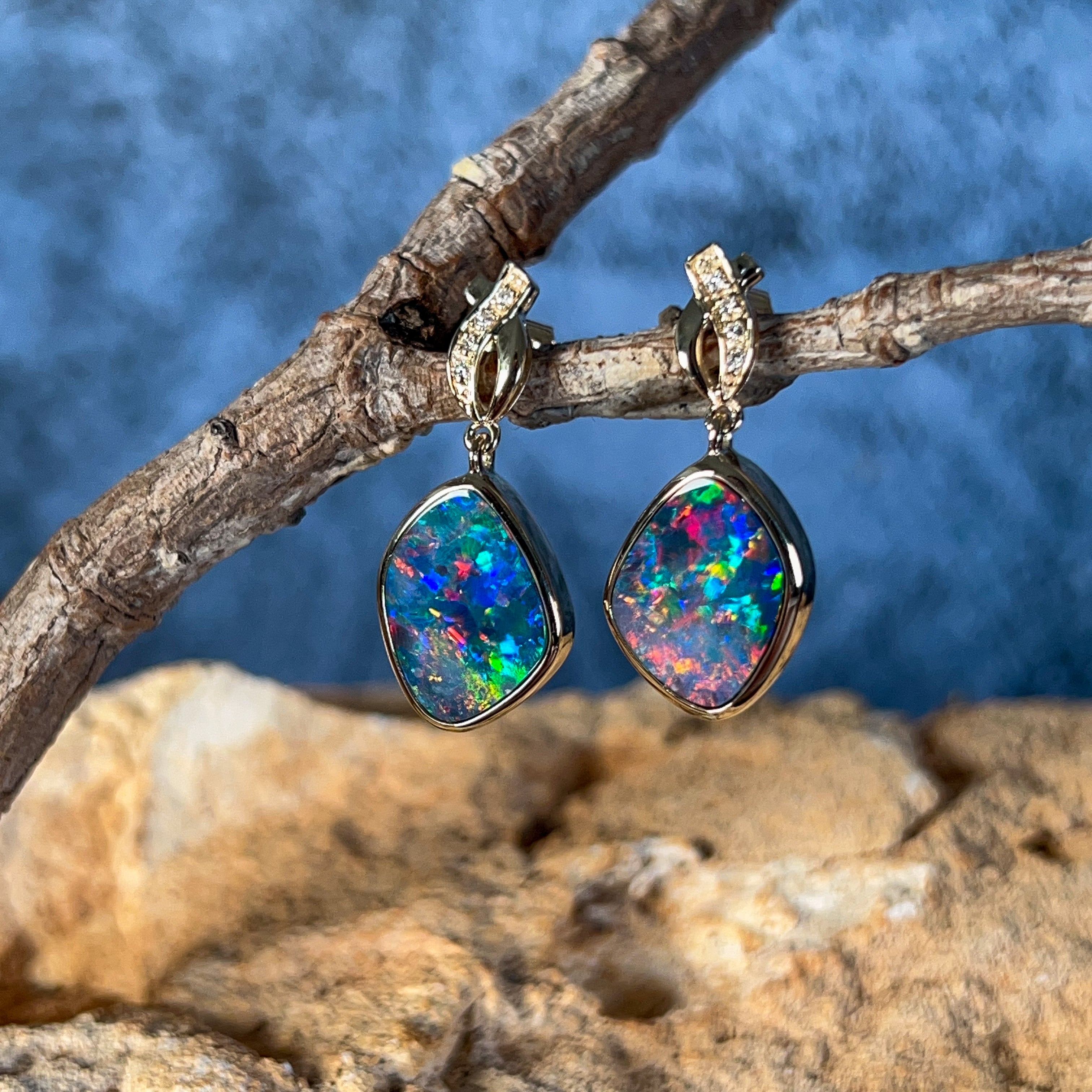 Catch the light and turn heads with these stunning 14kt yellow gold earrings featuring vibrant opal doublets that dance with every movement. Each piece showcases a brilliant 4.7ct opal doublet paired with sparkling diamonds, creating an eye-catching contrast of colour and sparkle. The dangling design lets your opals swing freely, flashing mesmerising blues, greens, and fiery reds as you move. Perfect for adding a playful pop of colour to any occasion, these earrings bring joy and movement to your jewellery collection.