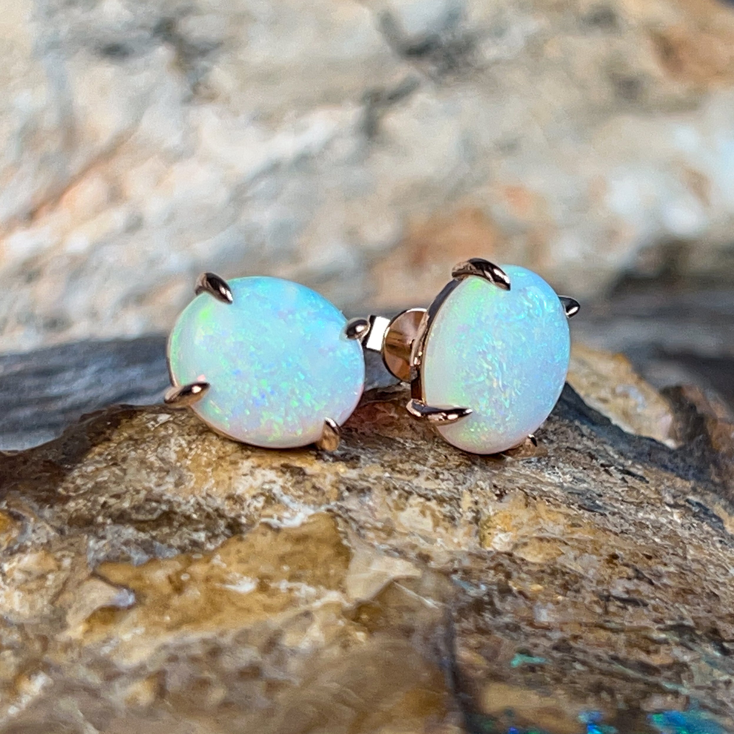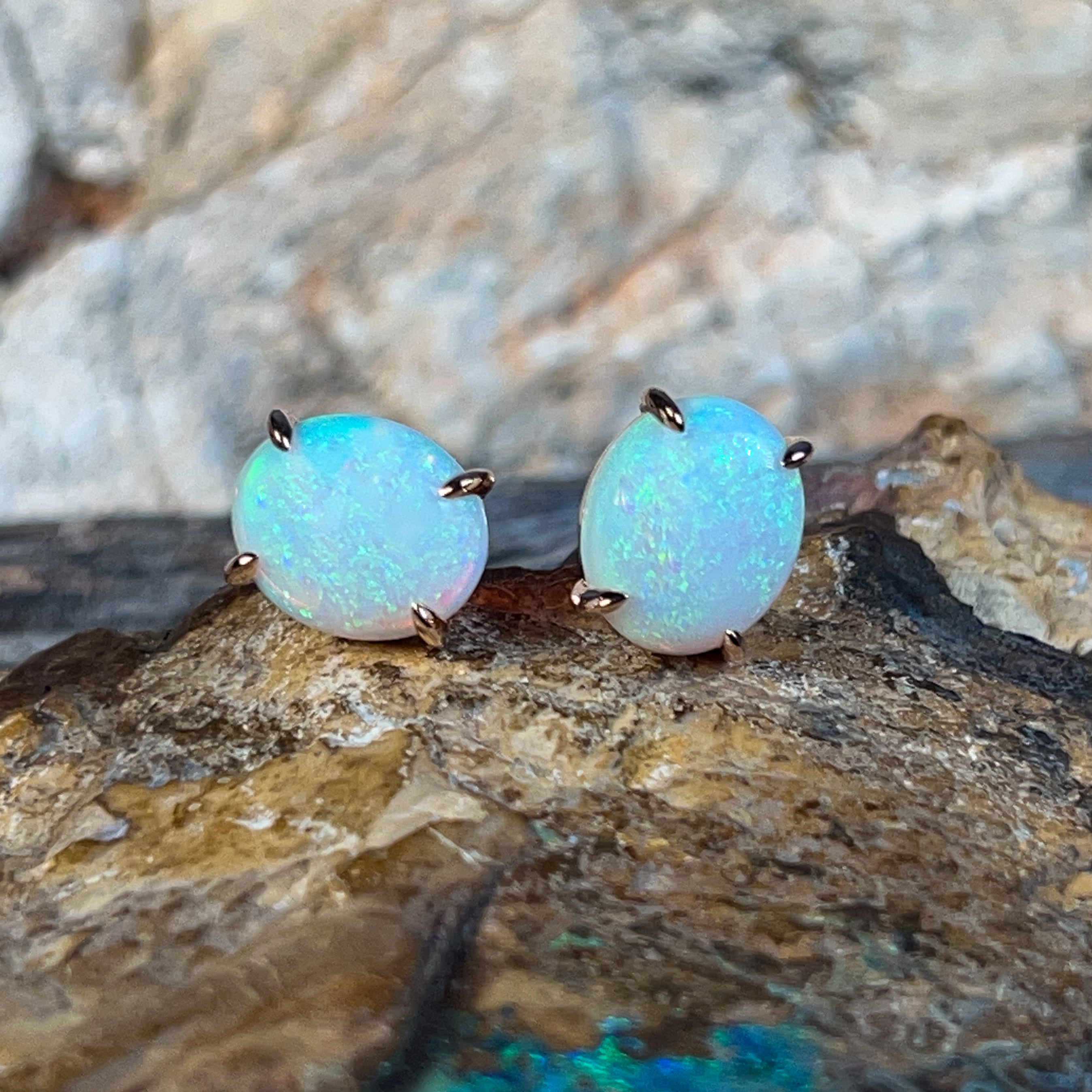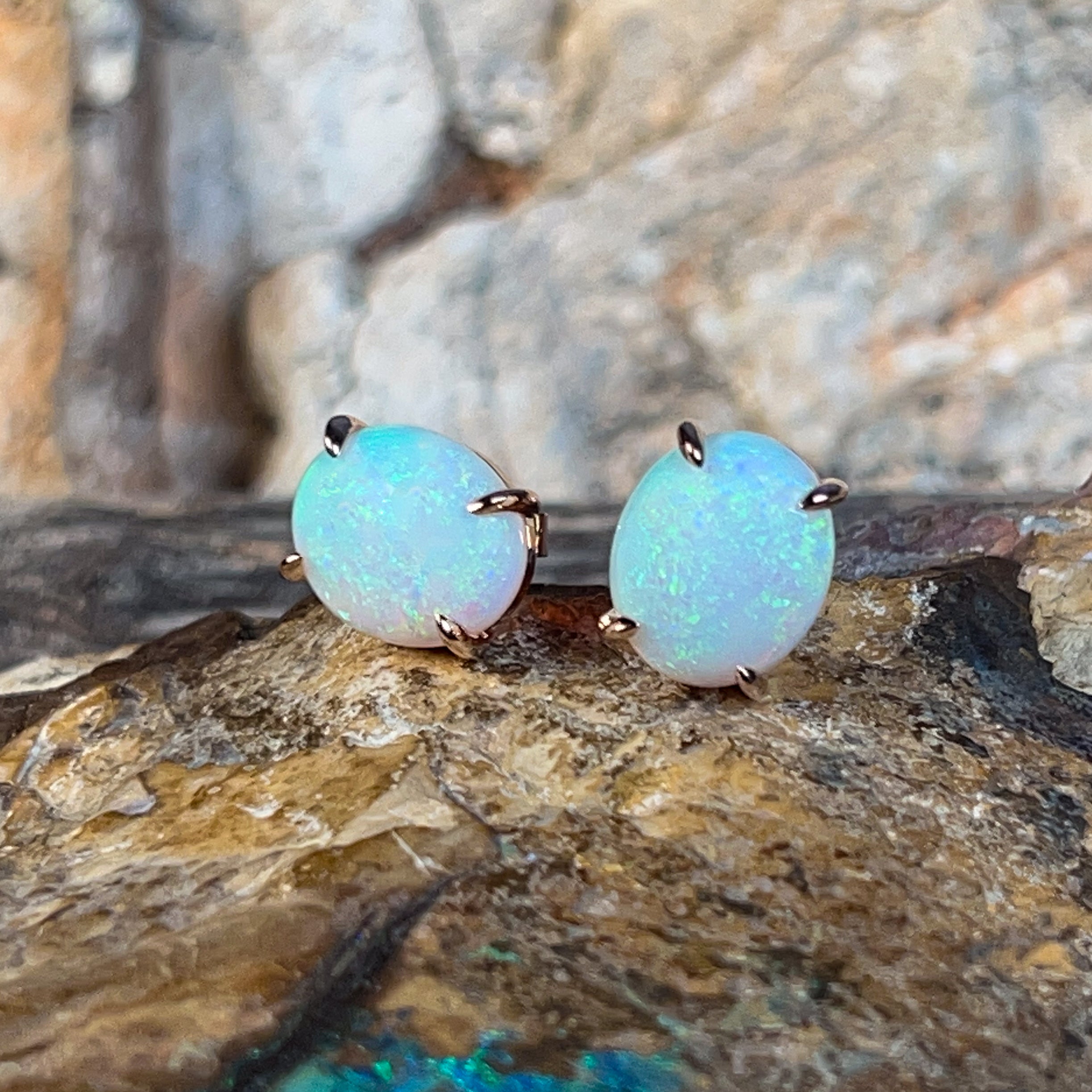 Delicate rose gold cradles luminous light opals in these charming four-claw studs. At 6.2 carats, these beauties showcase soft, dreamy flashes of colour that dance with every movement. Perfect for everyday elegance or that special occasion when you want understated sparkle. The warm glow of 18kt rose gold complements the opal's gentle play-of-colour beautifully, creating a timeless piece that feels both sophisticated and effortlessly chic.