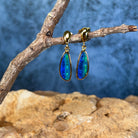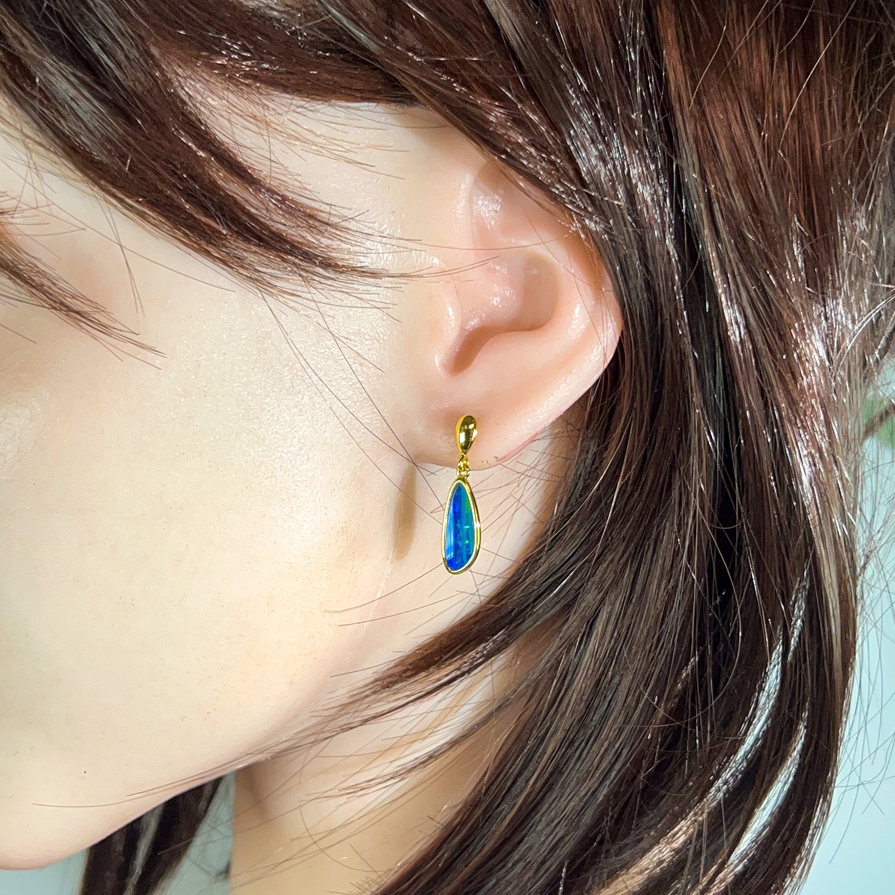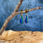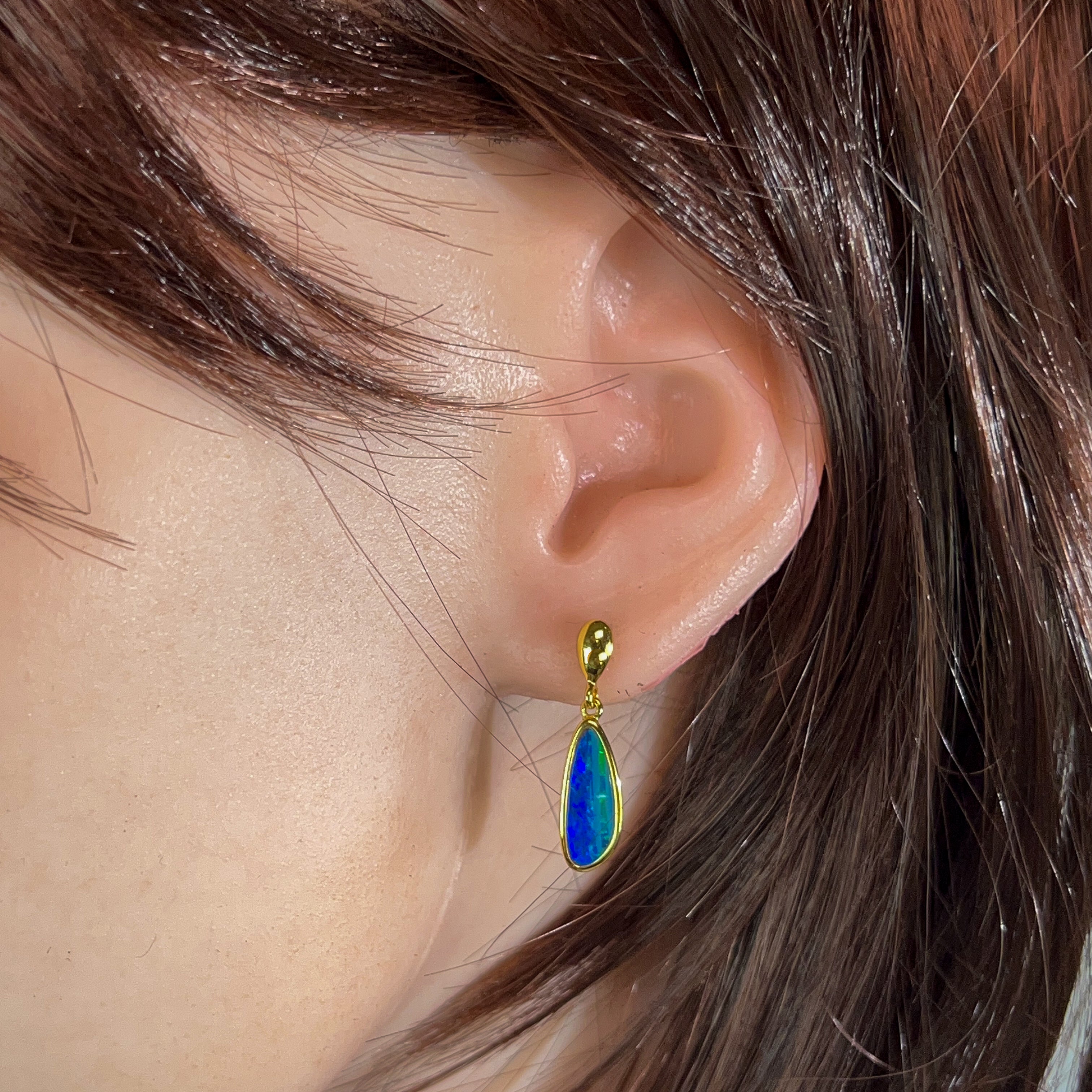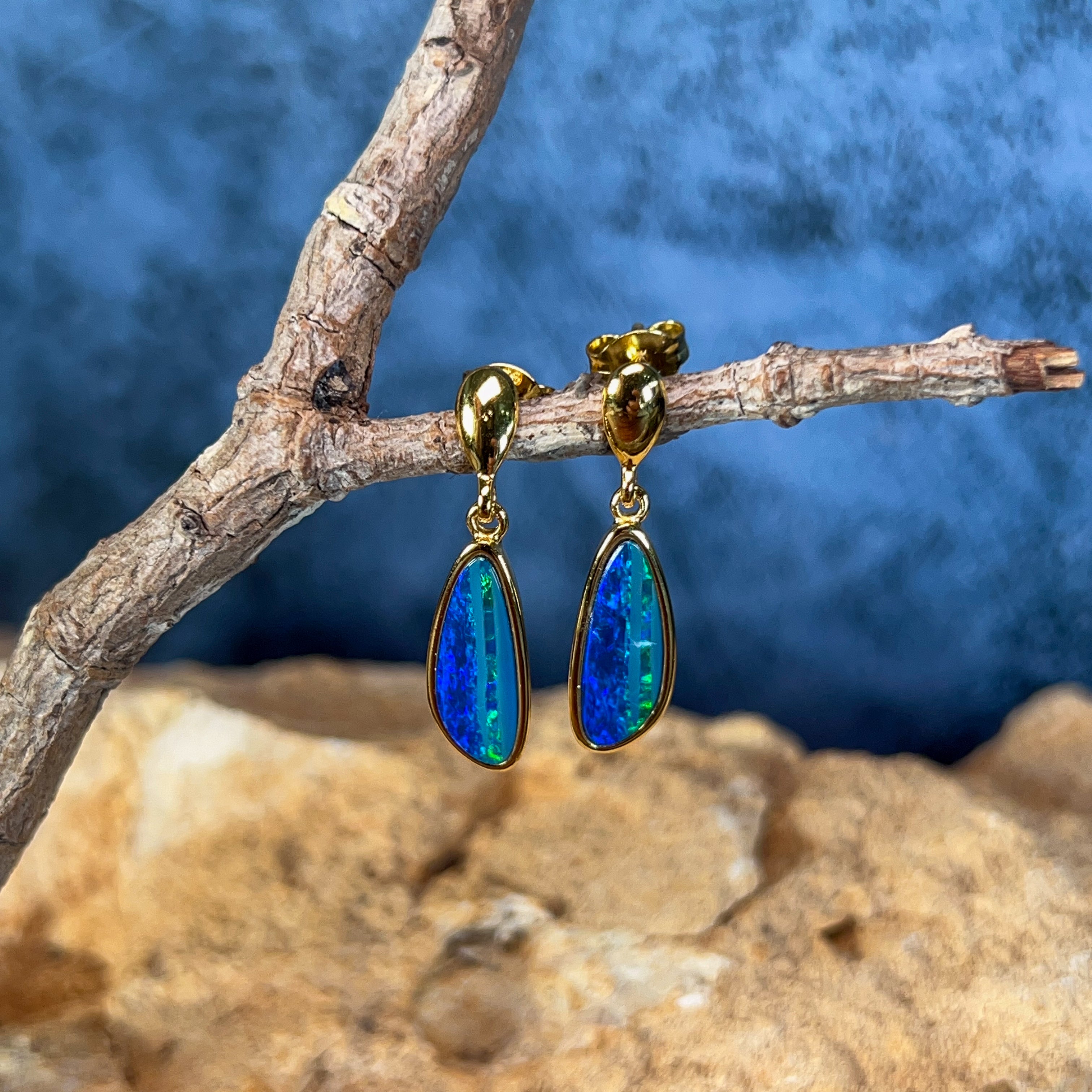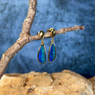 Gold Plated Dangling Opal Doublet 15x6mm Earrings Elevate your jewellery collection with these captivating gold-plated earrings, featuring stunning opal doublets that showcase mesmerising deep blue-green hues. The 15x6mm stones catch light beautifully, creating an ever-changing play of colour that draws admiration. Perfect for those seeking sophisticated elegance with a touch of natural wonder, these dangling earrings add instant glamour to any occasion. The lightweight design ensures all-day comfort, while the rich opal tones complement both warm and cool skin tones effortlessly. A timeless piece that transforms your look from ordinary to extraordinary.