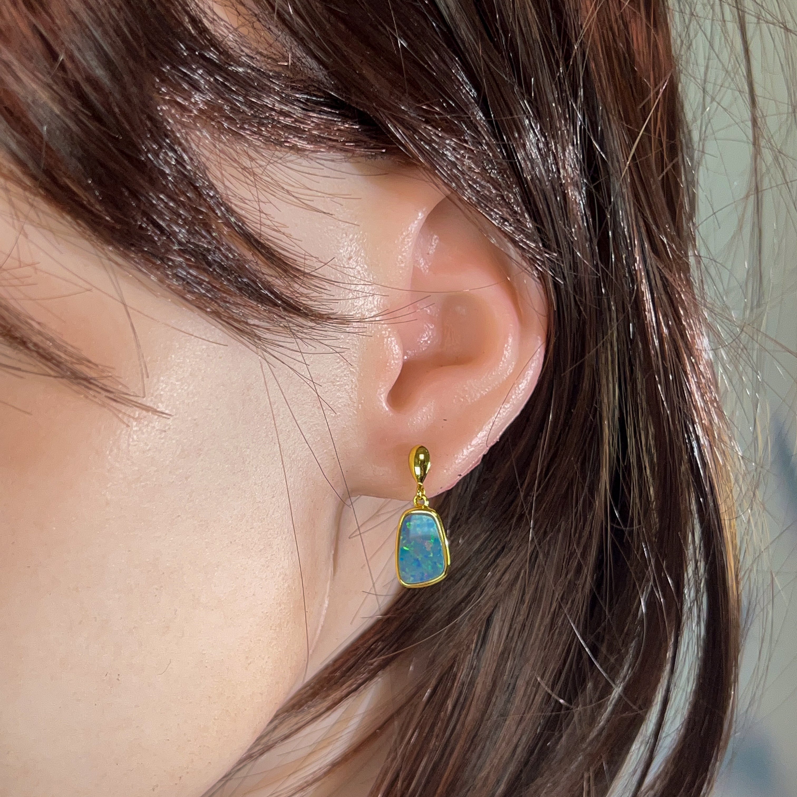 Elevate your everyday elegance with these stunning gold-plated silver opal doublet earrings. Featuring captivating 13x9mm opals that dance with mesmerizing colour and light, these dangling beauties offer the perfect balance of sophistication and movement. The warm gold plating complements the opal's natural play-of-colour, creating a luxurious look that transitions seamlessly from day to night. Lightweight and comfortable for extended wear, these earrings make an unforgettable statement piece that celebrates the timeless allure of genuine opal gemstones.