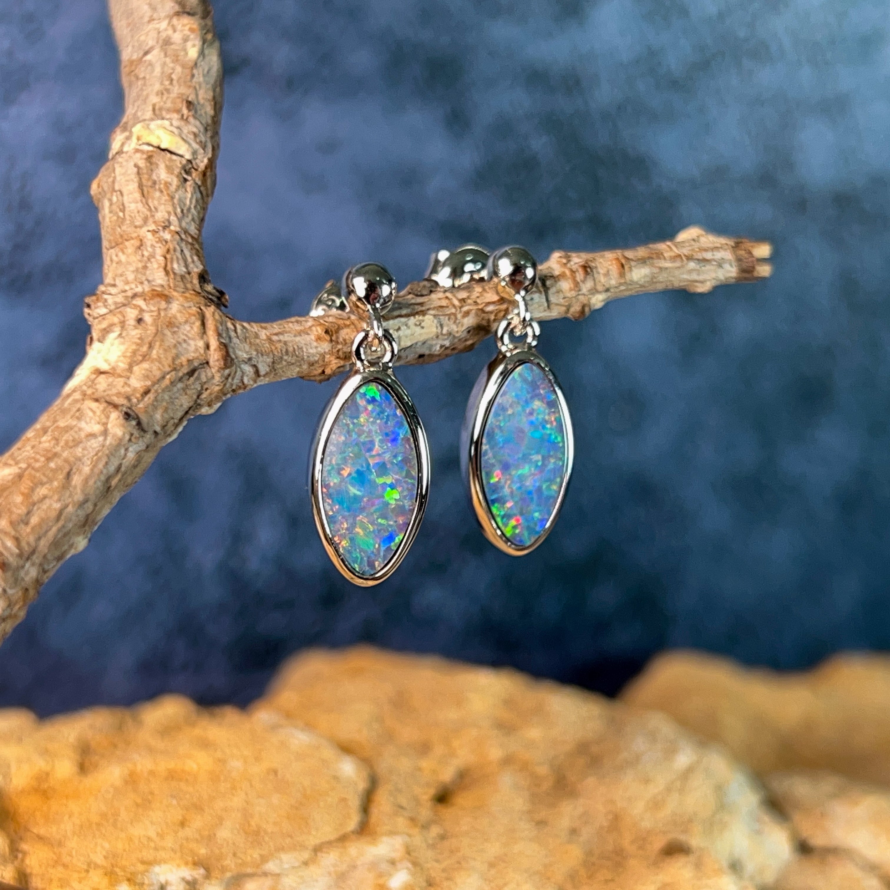 Elegant marquise-shaped opal doublets catch the light with every movement in these sterling silver dangling studs. At 3.35 carats, these earrings deliver sophisticated sparkle without overwhelming your look. The delicate drop design frames the face beautifully while remaining comfortable for everyday wear. Perfect for adding a touch of refined colour to any outfit.