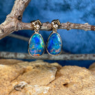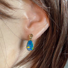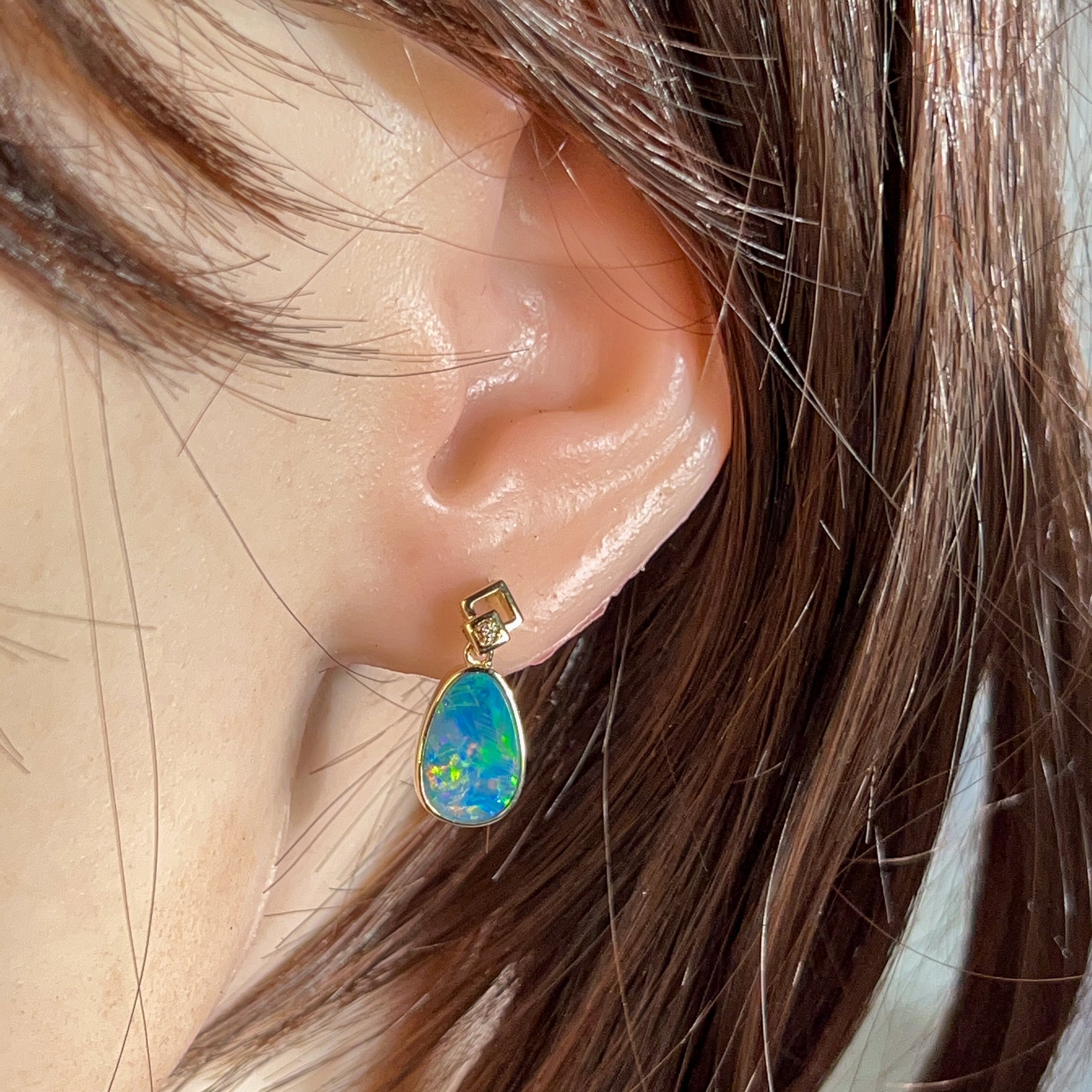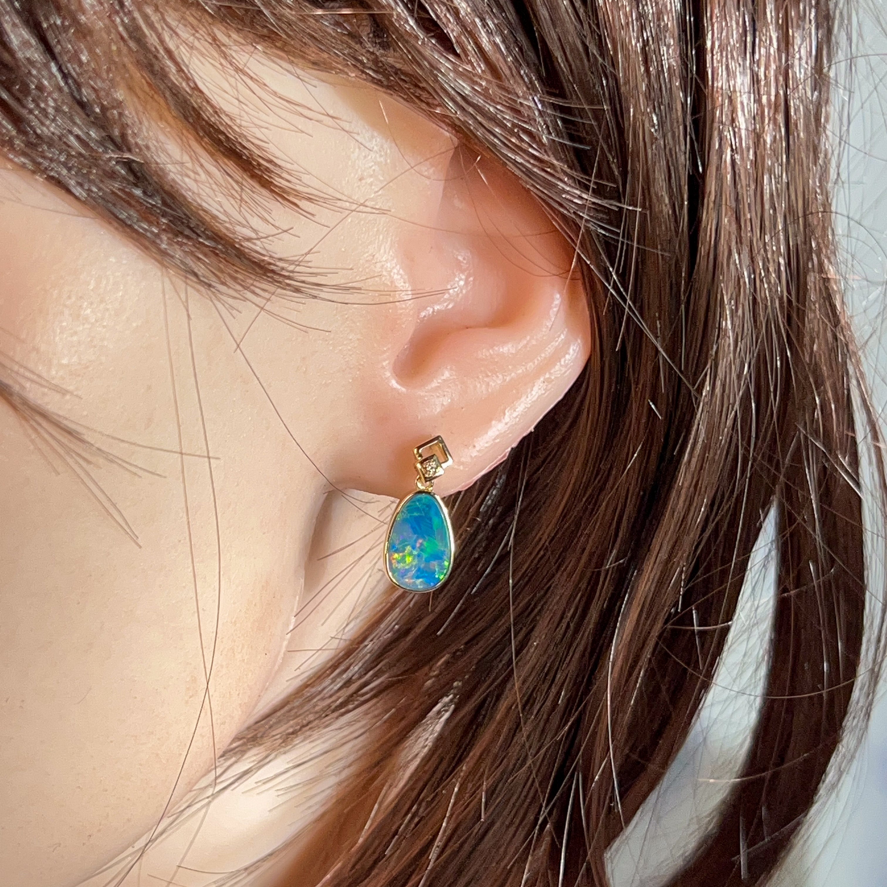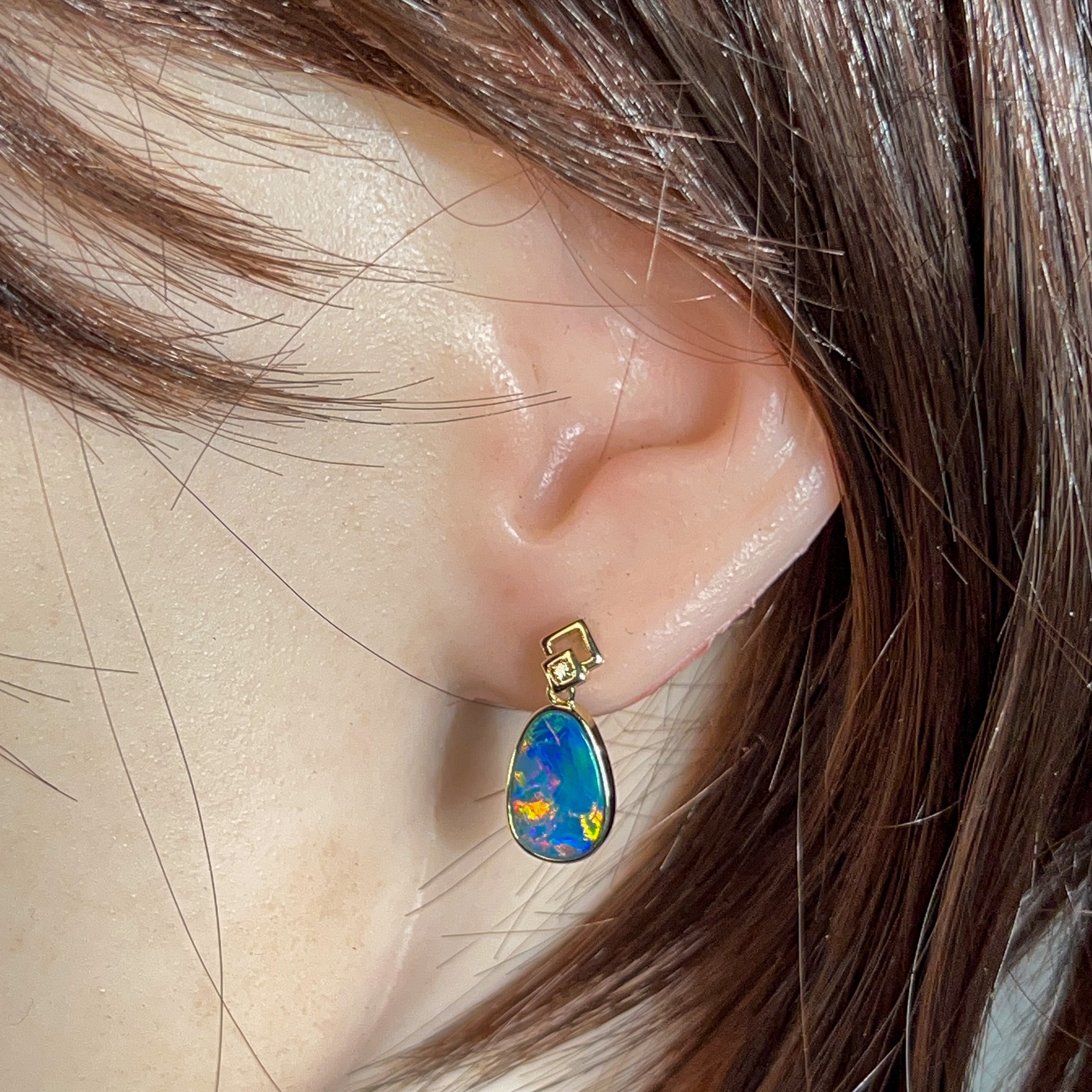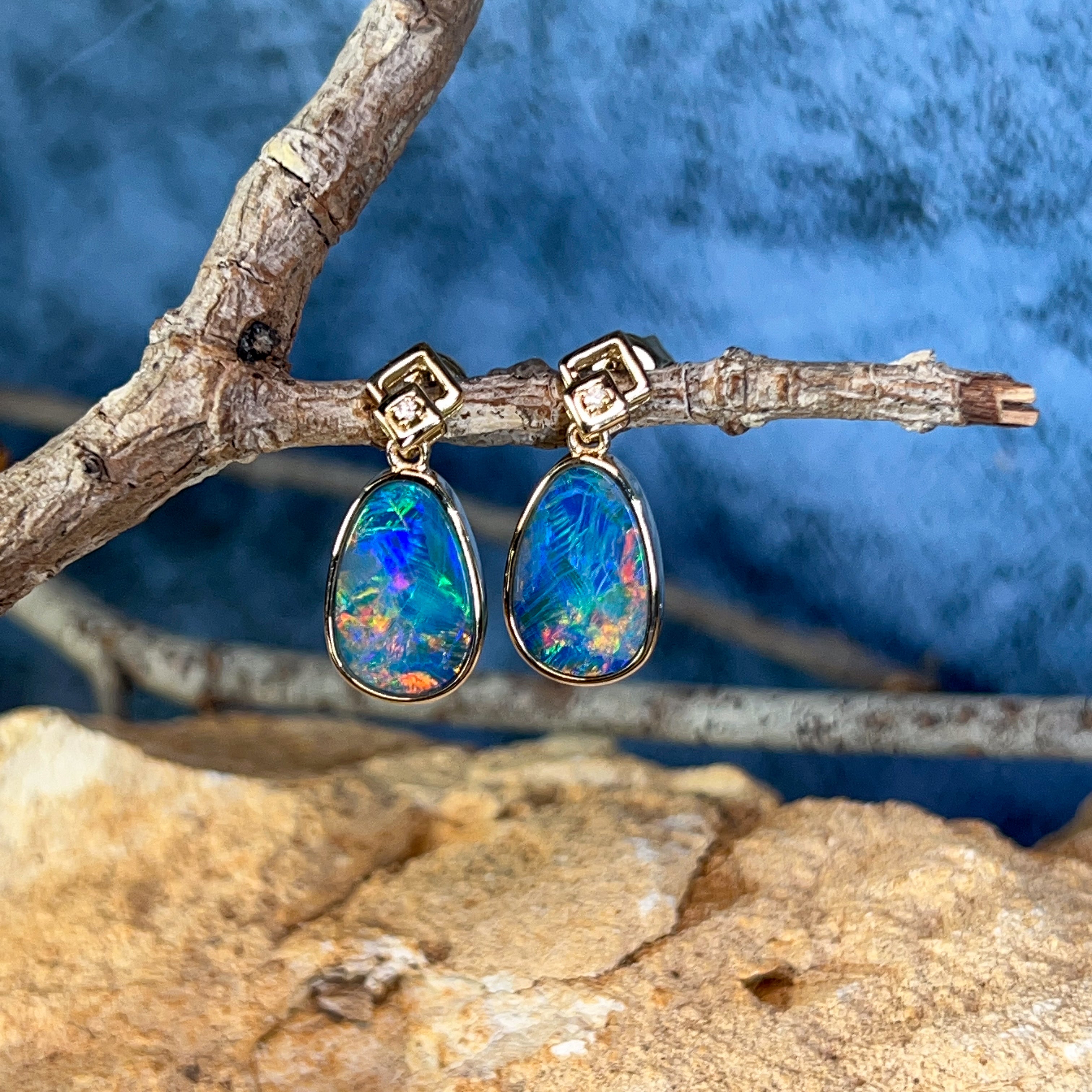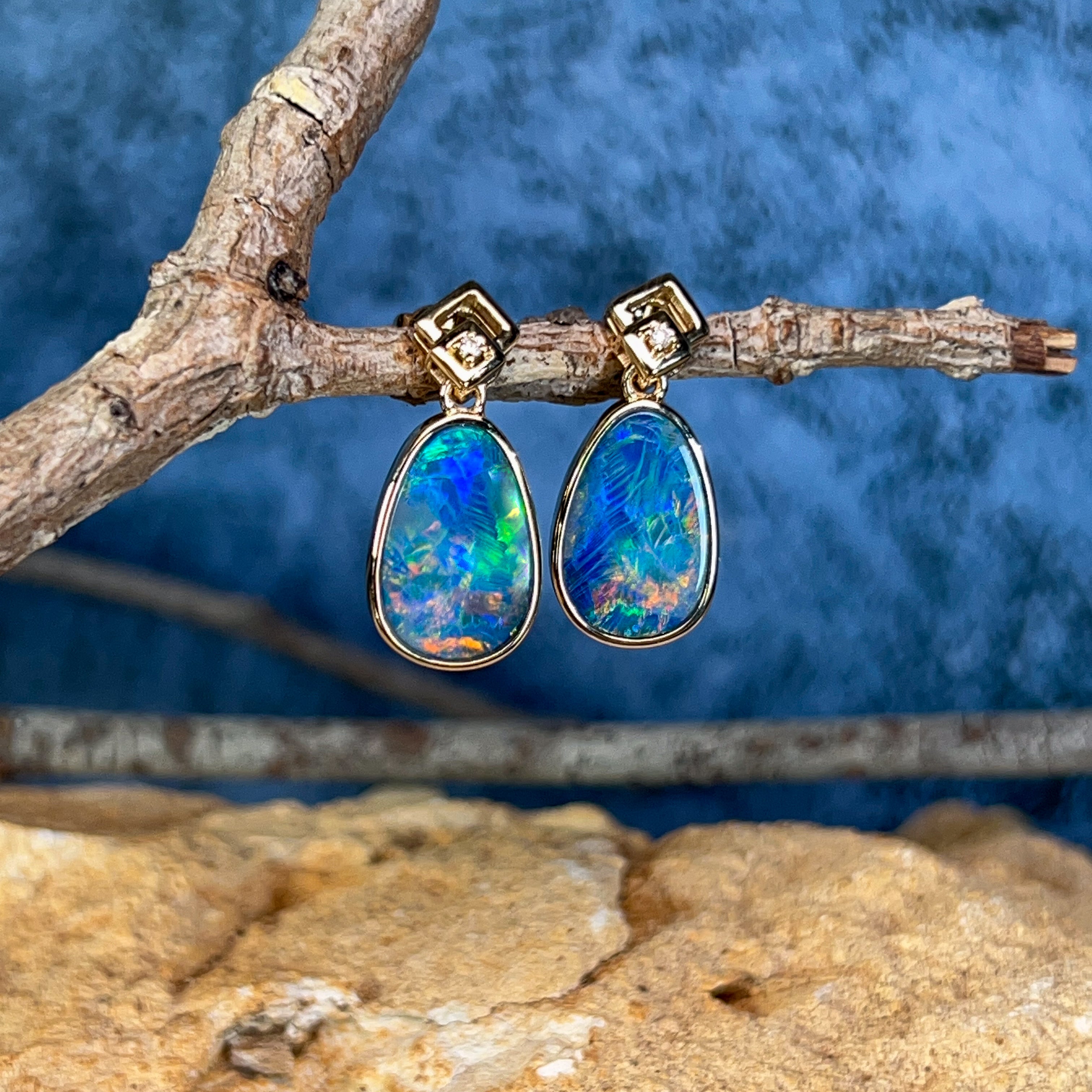 Stunning 14kt yellow gold dangle earrings showcasing vibrant Australian opal doublets that catch the light with mesmerising blue, green, red, and yellow flashes. Each freeform opal weighs 1.91ct and measures 13x8mm, bezel-set for secure elegance. Accented with two round brilliant diamonds (0.02ct, F, VS) for subtle sparkle. Total weight 3.4g. Earring drop 20x9mm. A radiant statement piece that celebrates the natural beauty of Australian opals.