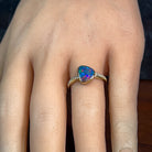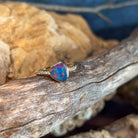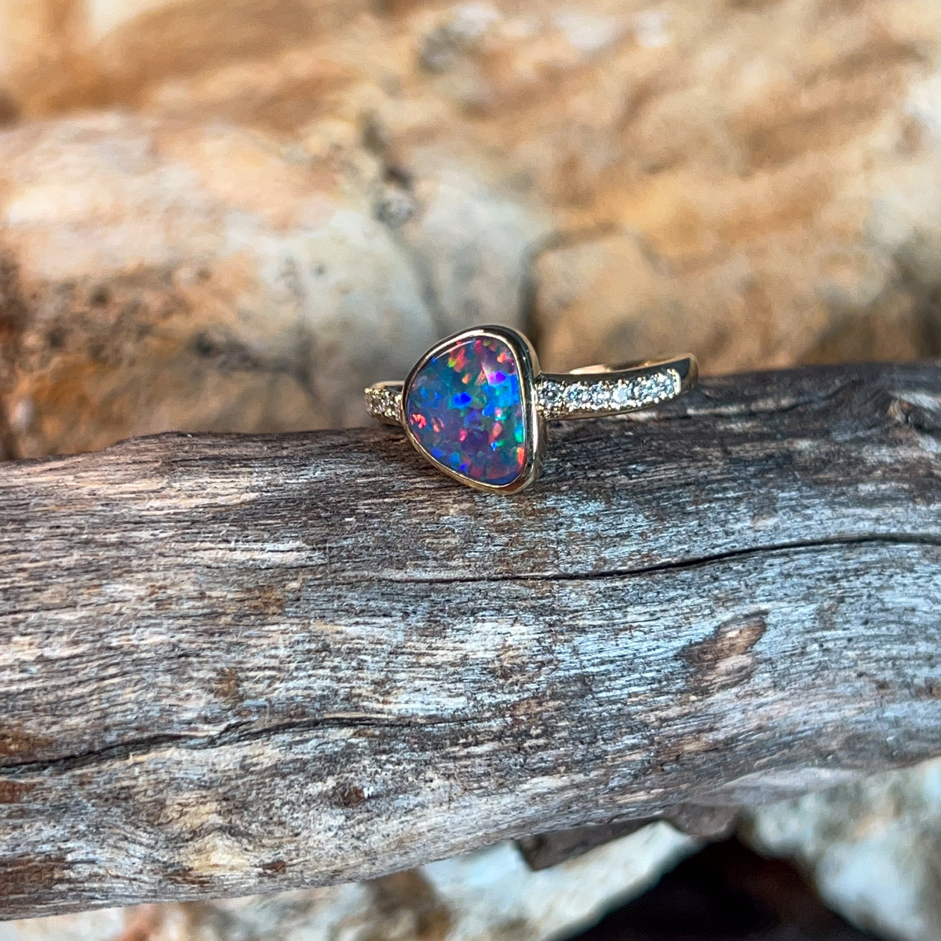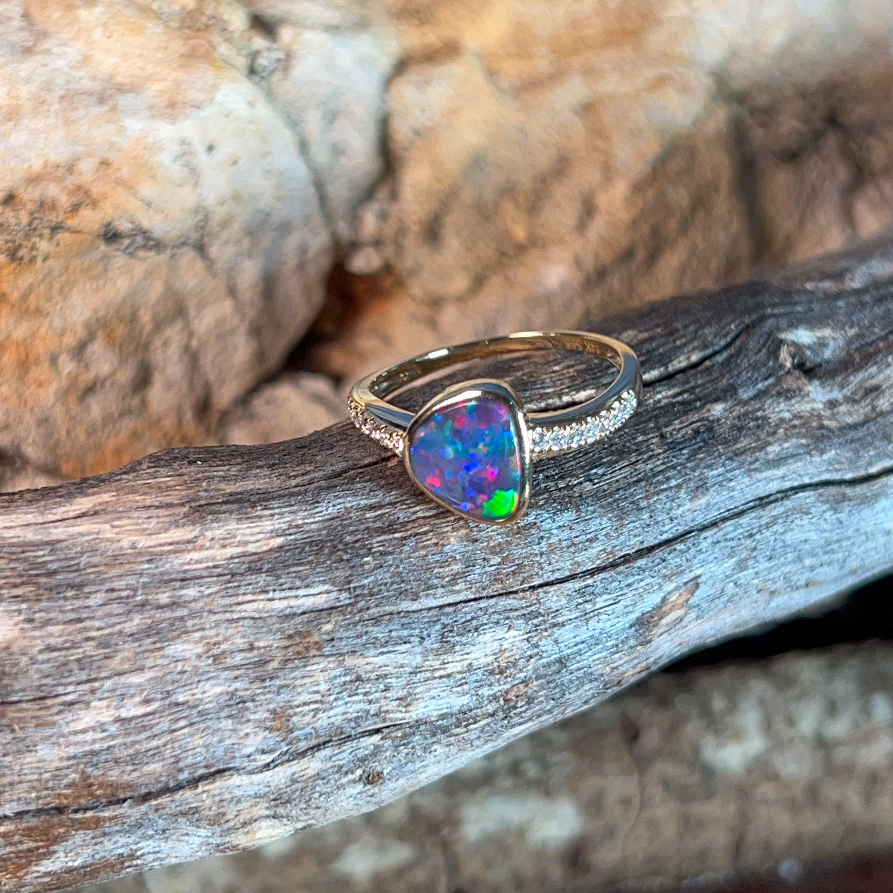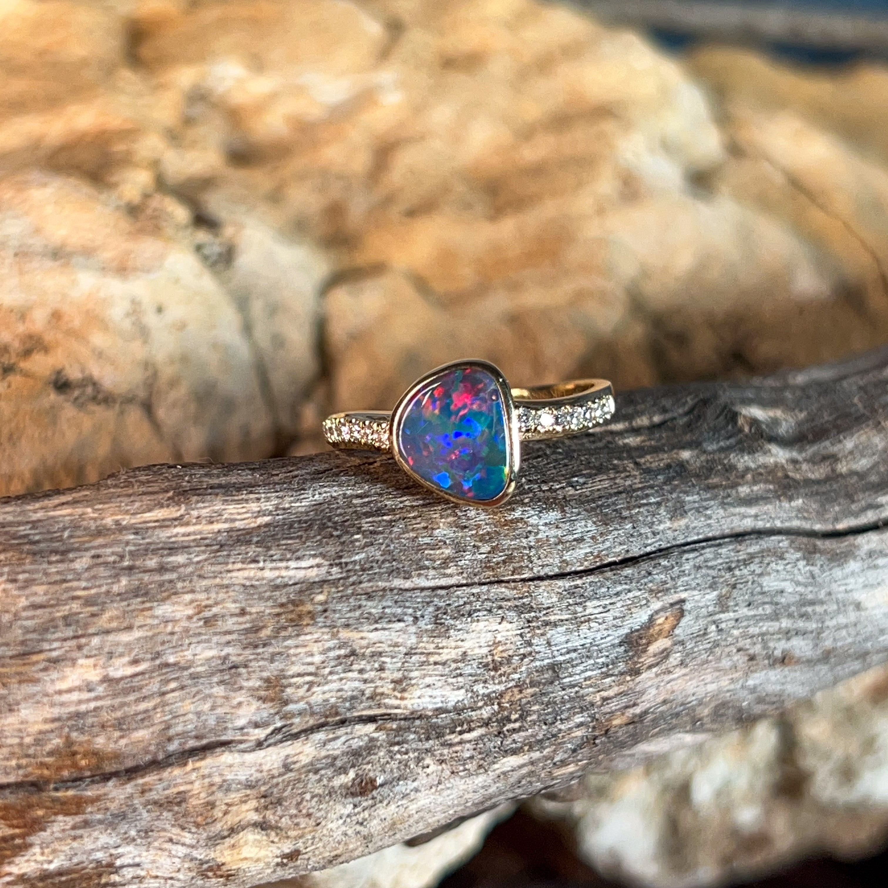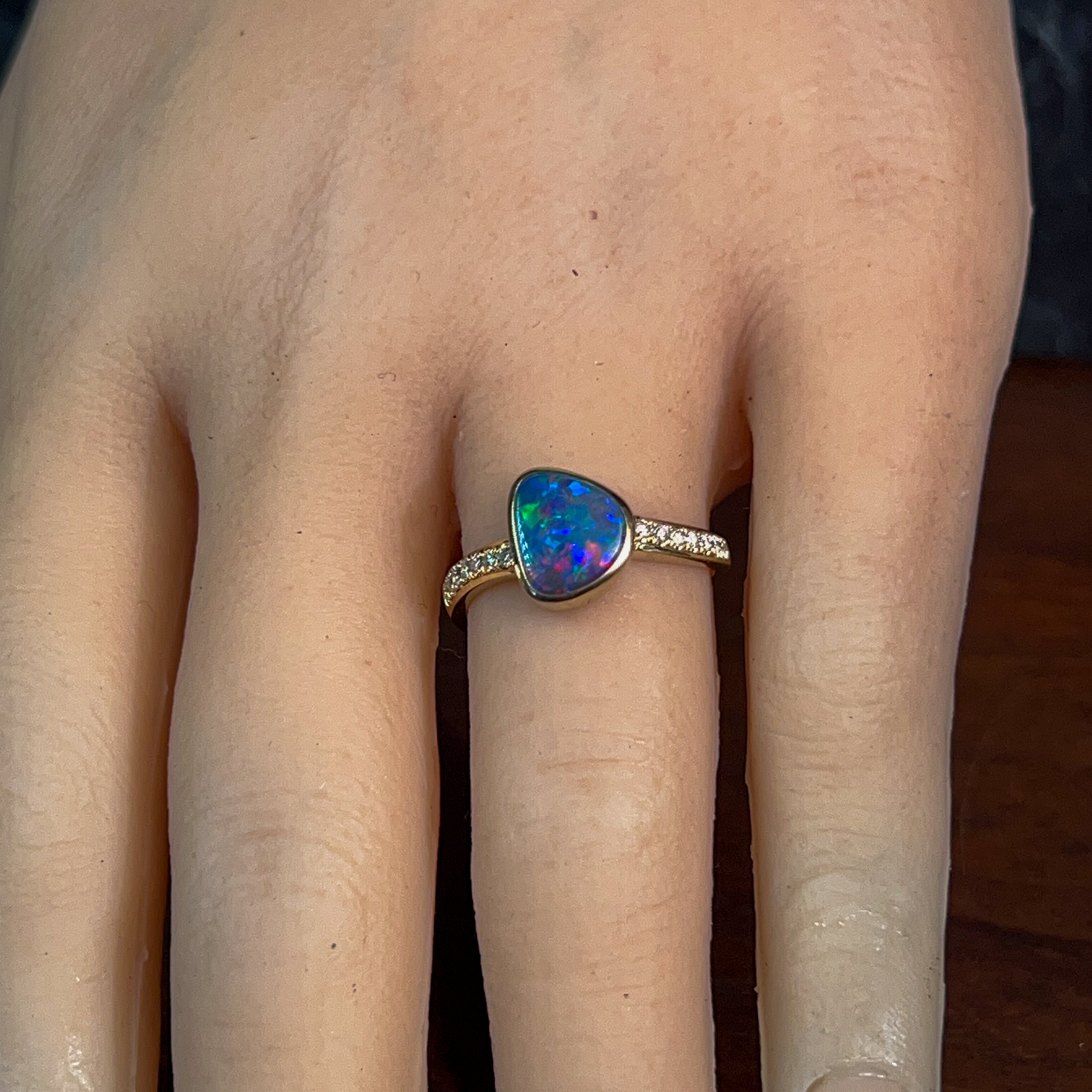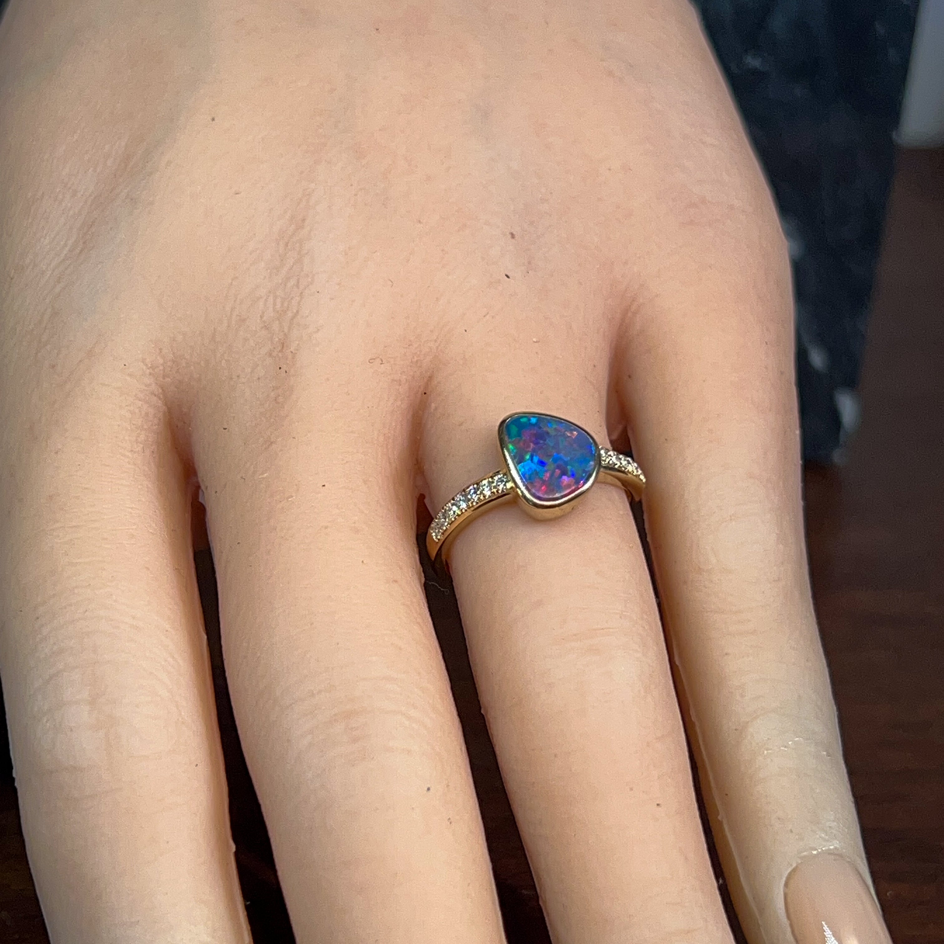 14kt Yellow Gold Opal Engagement Ring Celebrate your love with this stunning opal engagement ring, featuring a vibrant 1.45ct Australian doublet opal in a freeform cut. The opal displays mesmerising blue, red, and green fire that catches the light beautifully. Complementing the opal are sparkling round brilliant diamonds totalling 0.14ct in F colour, VS clarity, set in warm 14kt yellow gold. The elegant design showcases the opal's natural beauty while the diamonds add timeless sophistication. Opal dimensions: 7.6 x 6.5mm Ring weight: 2.15g Ring size: N 1/2 A unique and meaningful choice for an engagement ring that celebrates Australia's most precious gemstone.