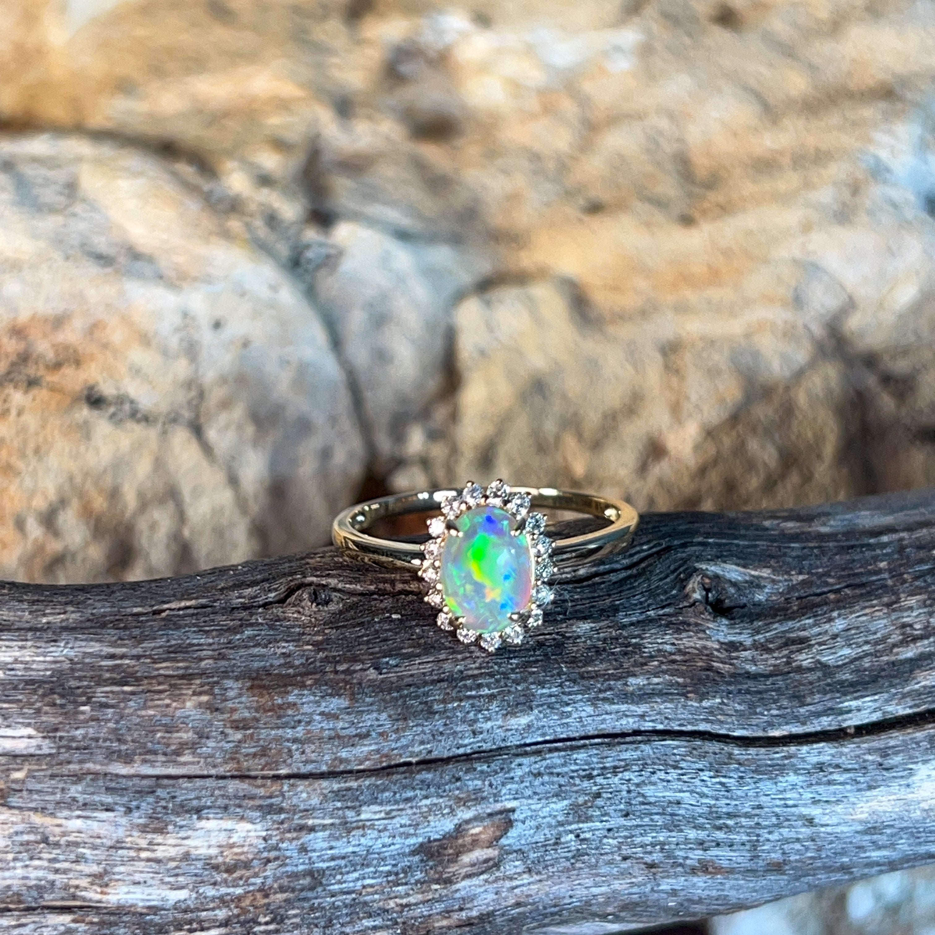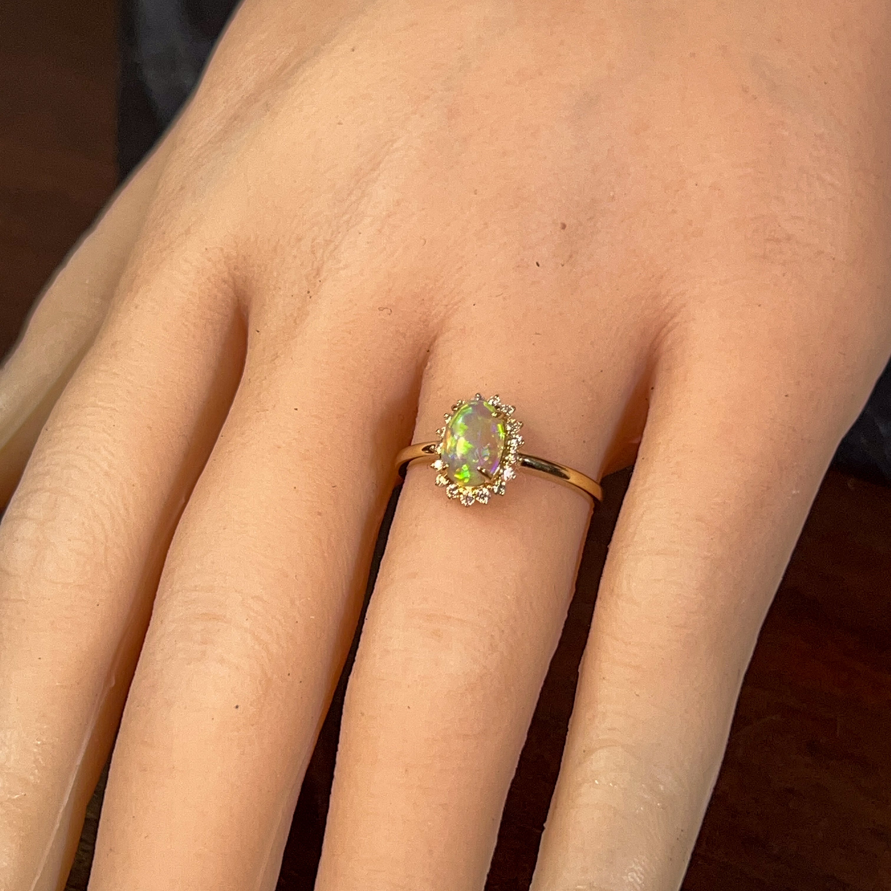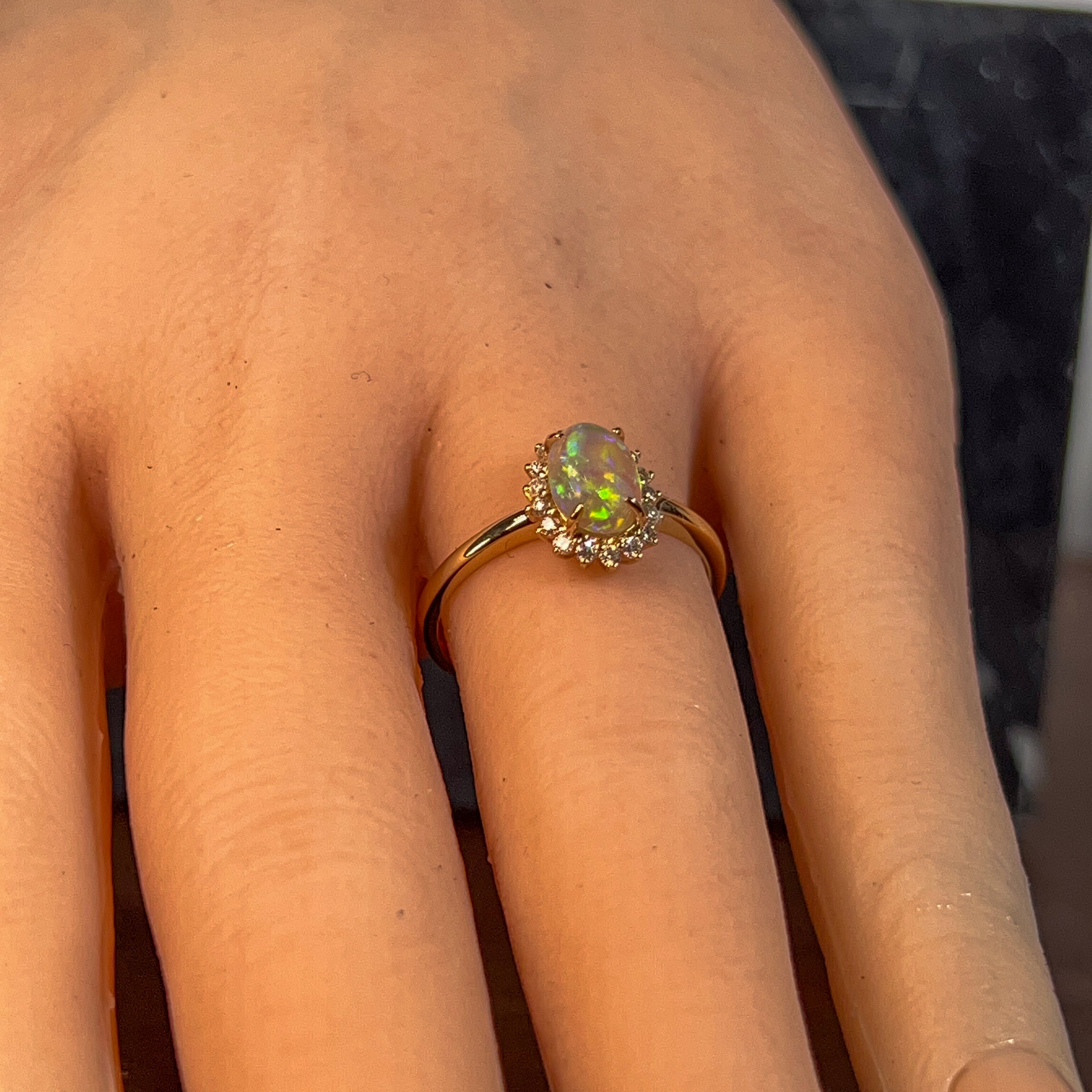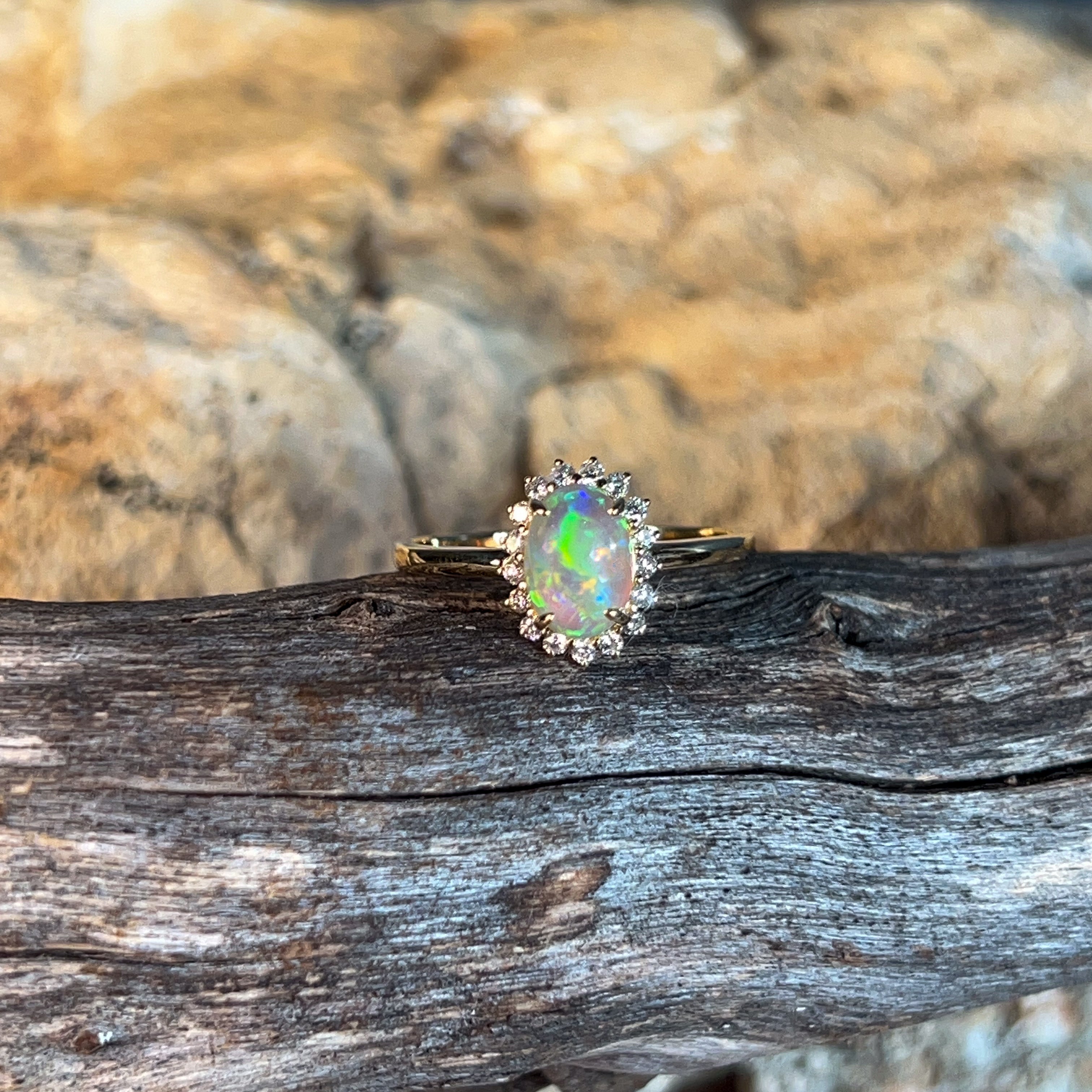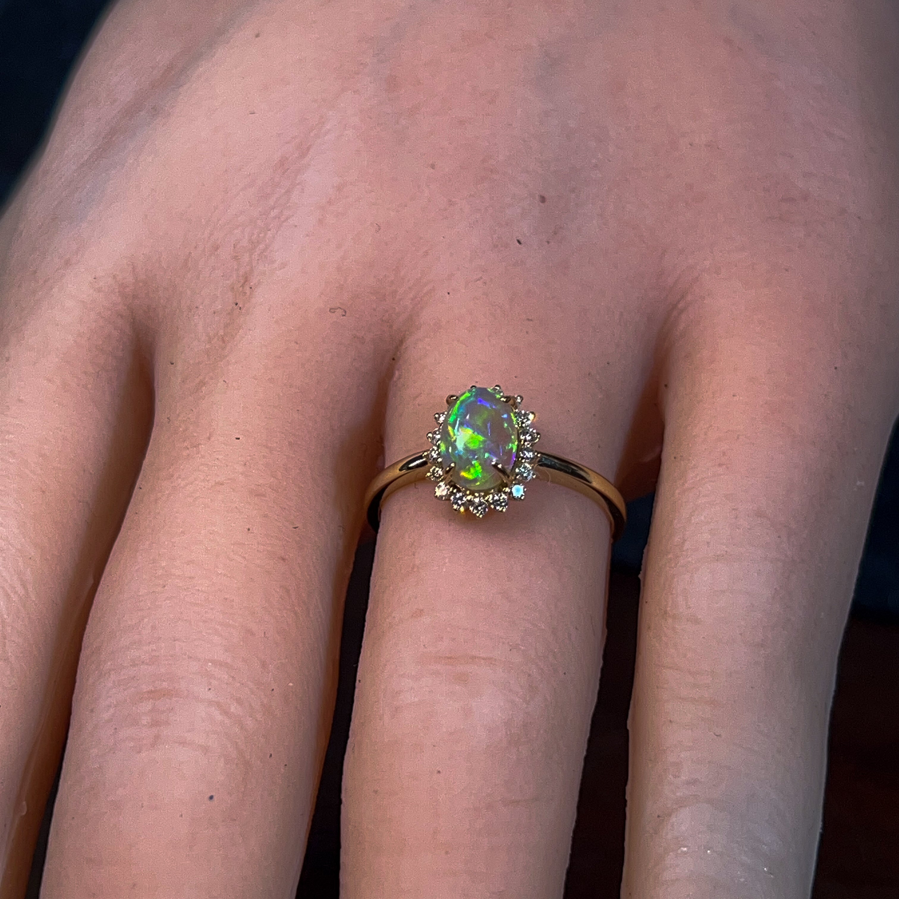 Timeless elegance meets natural beauty in this stunning 18kt yellow gold cluster engagement ring. The centrepiece is a captivating 0.7ct Australian black opal in classic oval cut, displaying mesmerising yellow-green-blue rolling flash that catches light with every movement. Seventeen round brilliant diamonds (0.17ct, F colour, VS clarity) frame the opal in a traditional cluster design, creating a sophisticated halo effect that enhances the opal's vibrant play of colour. Weighing just 1.78g, this ring combines delicate craftsmanship with enduring style. Currently sized at N1/2, it's the perfect choice for those seeking a distinctive engagement ring that celebrates the unique beauty of Australian gemstones.