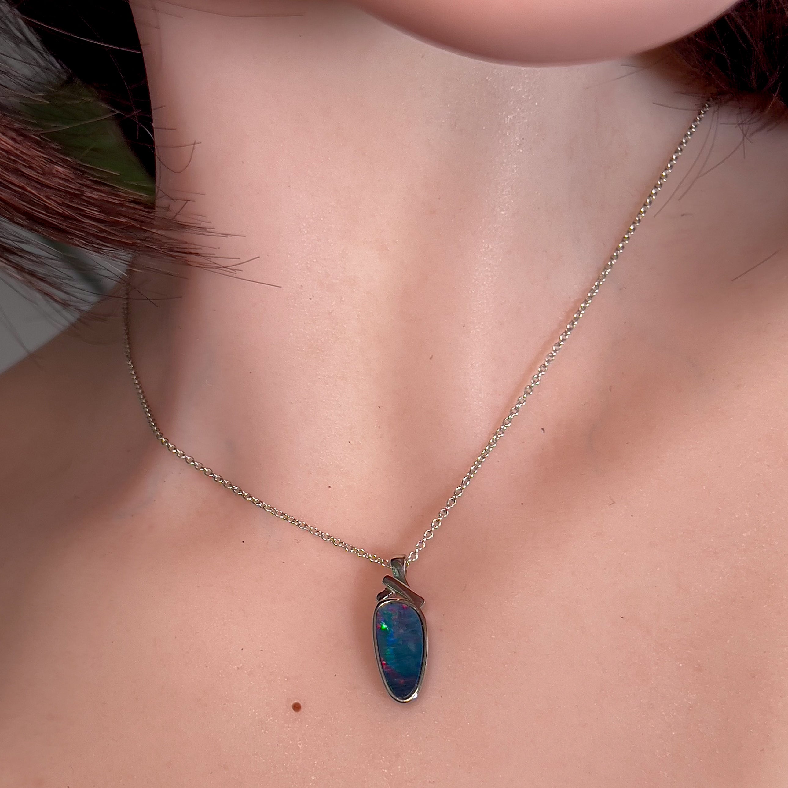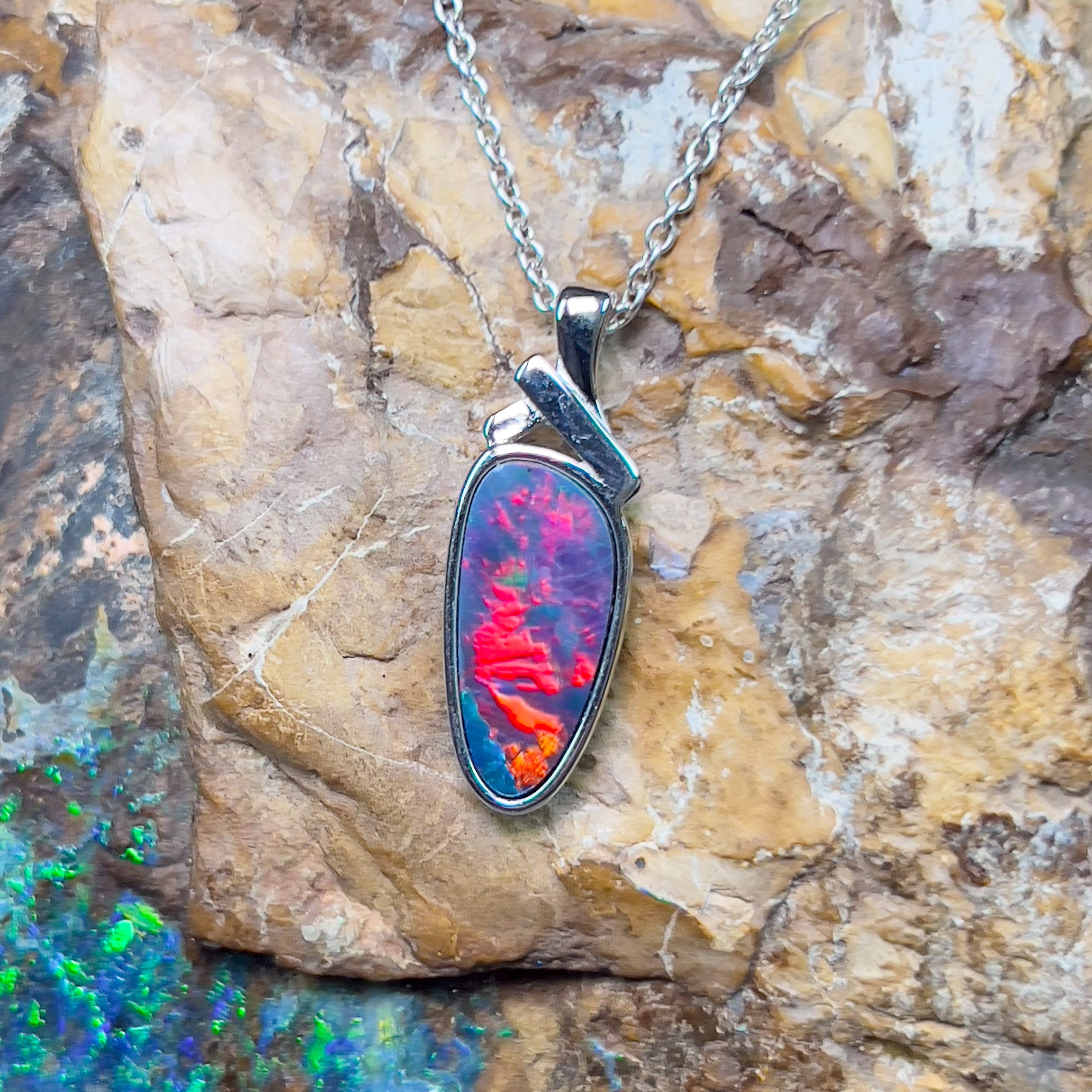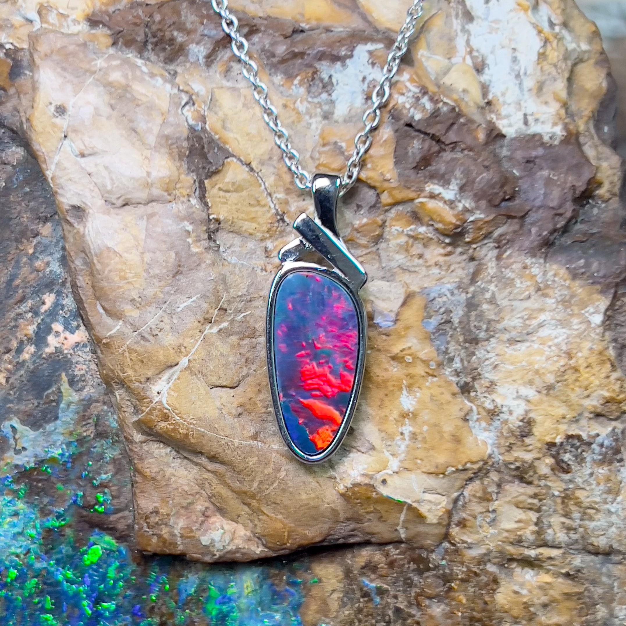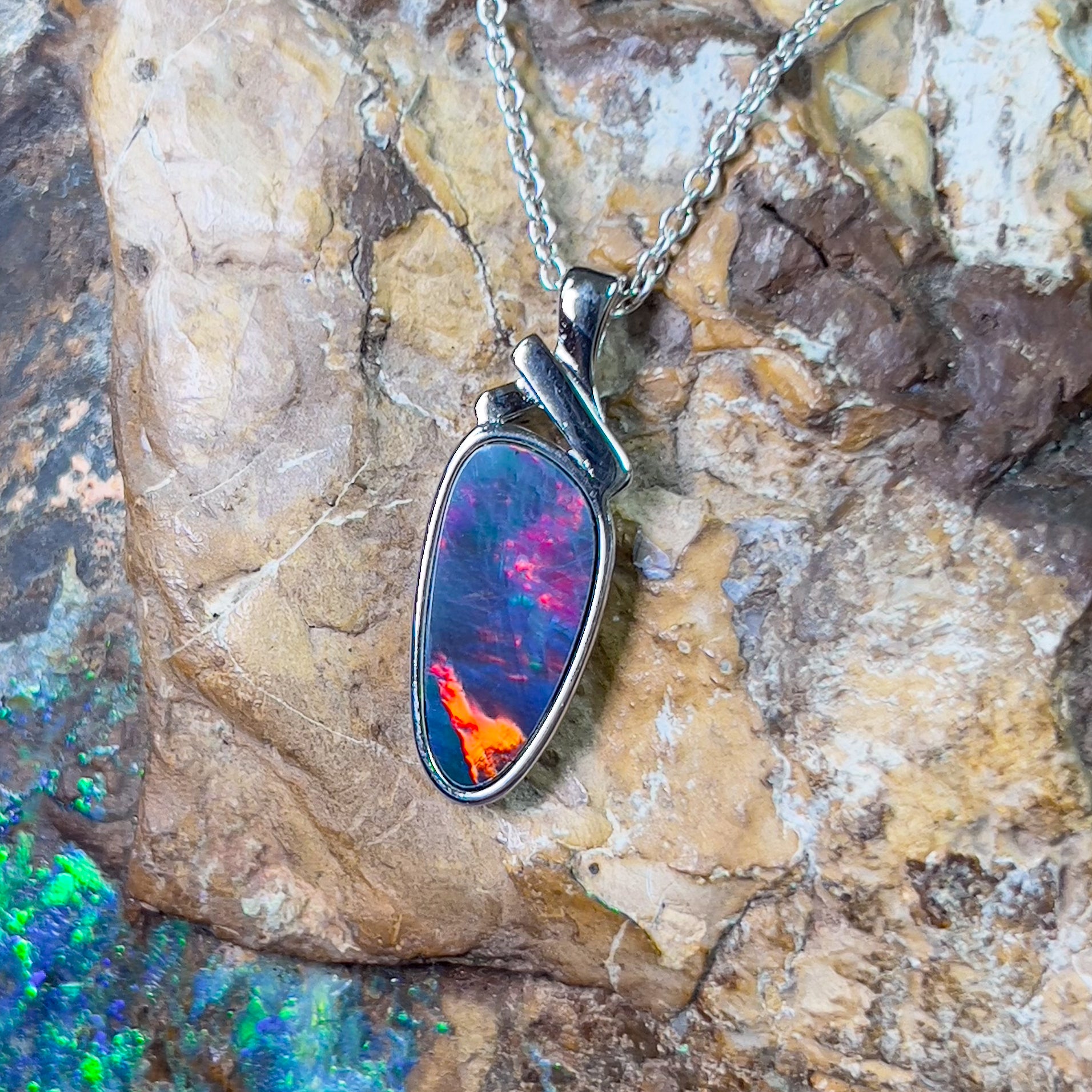 Add a touch of intrigue and elegance to your look with our Sterling Silver Opal doublet long drop shape pendant. Its stunning red and blue fire will catch everyone's eye. Elevate your accessory game and be the center of attention!