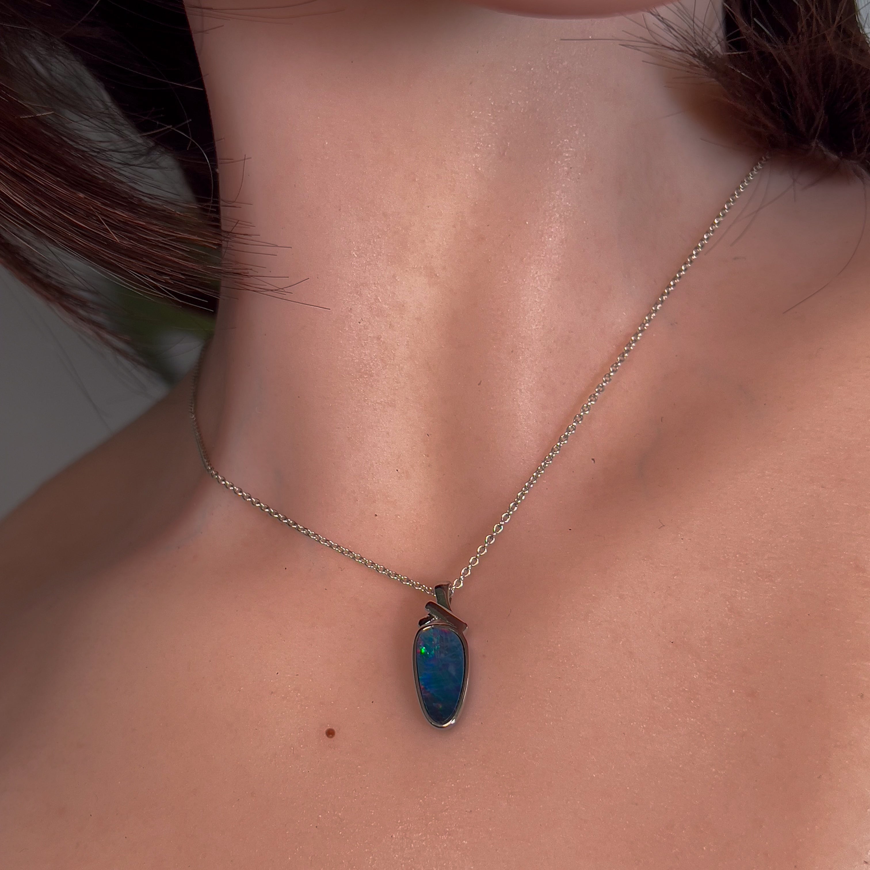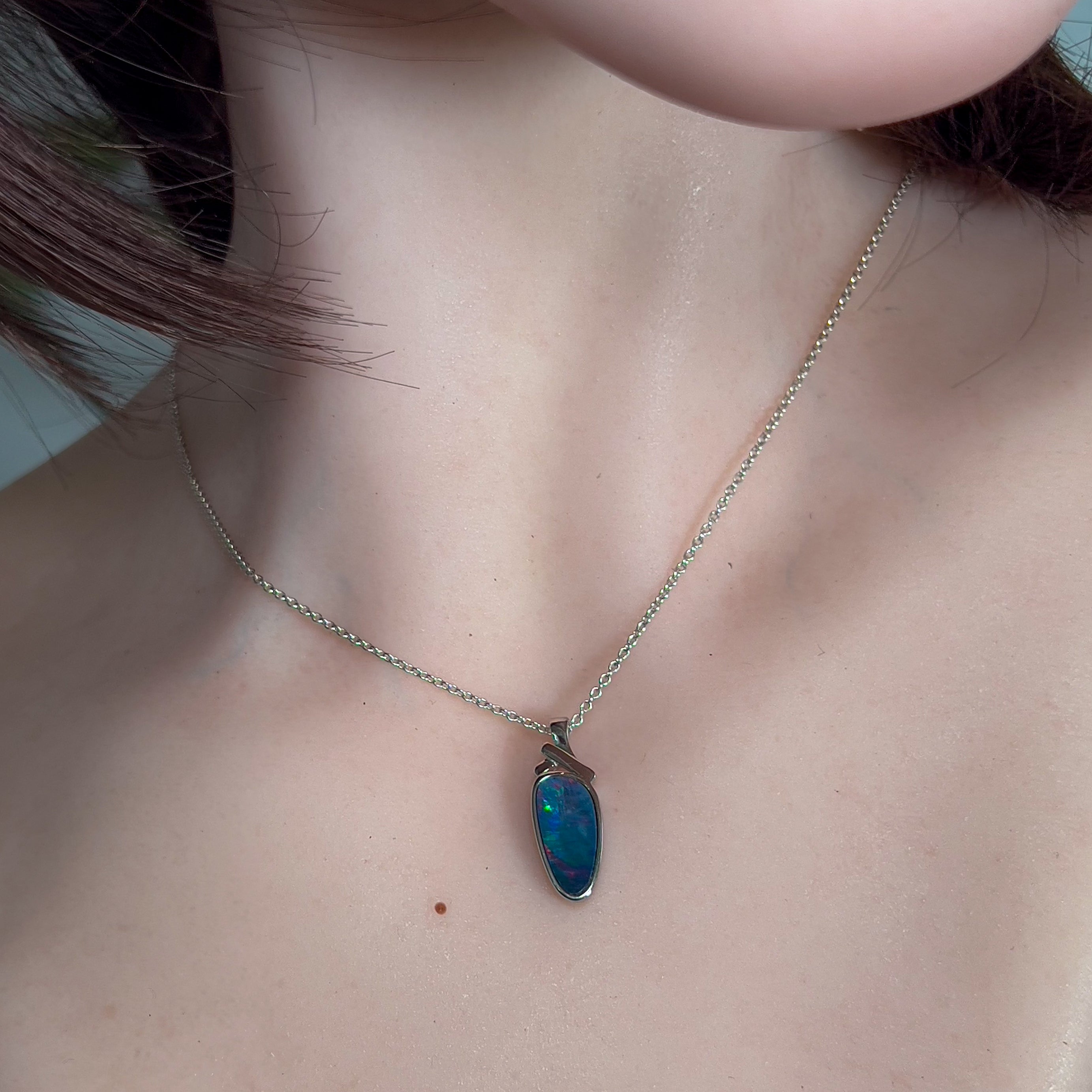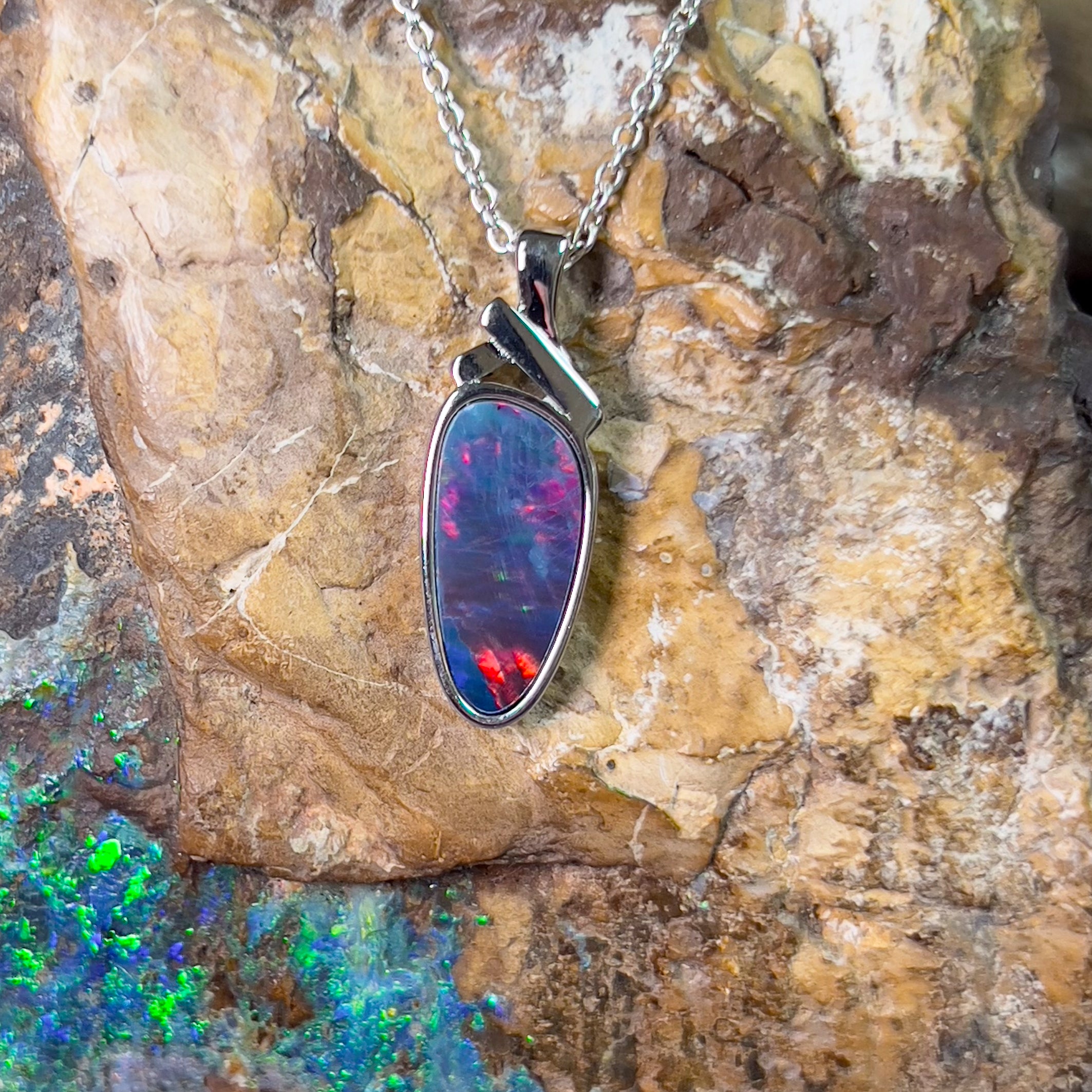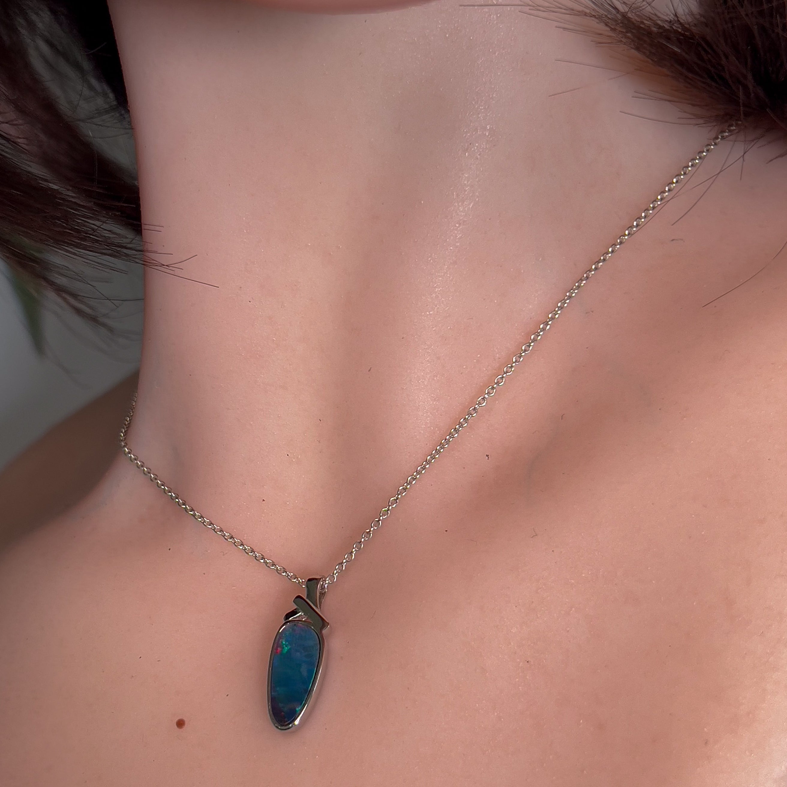 Add a touch of intrigue and elegance to your look with our Sterling Silver Opal doublet long drop shape pendant. Its stunning red and blue fire will catch everyone's eye. Elevate your accessory game and be the center of attention!