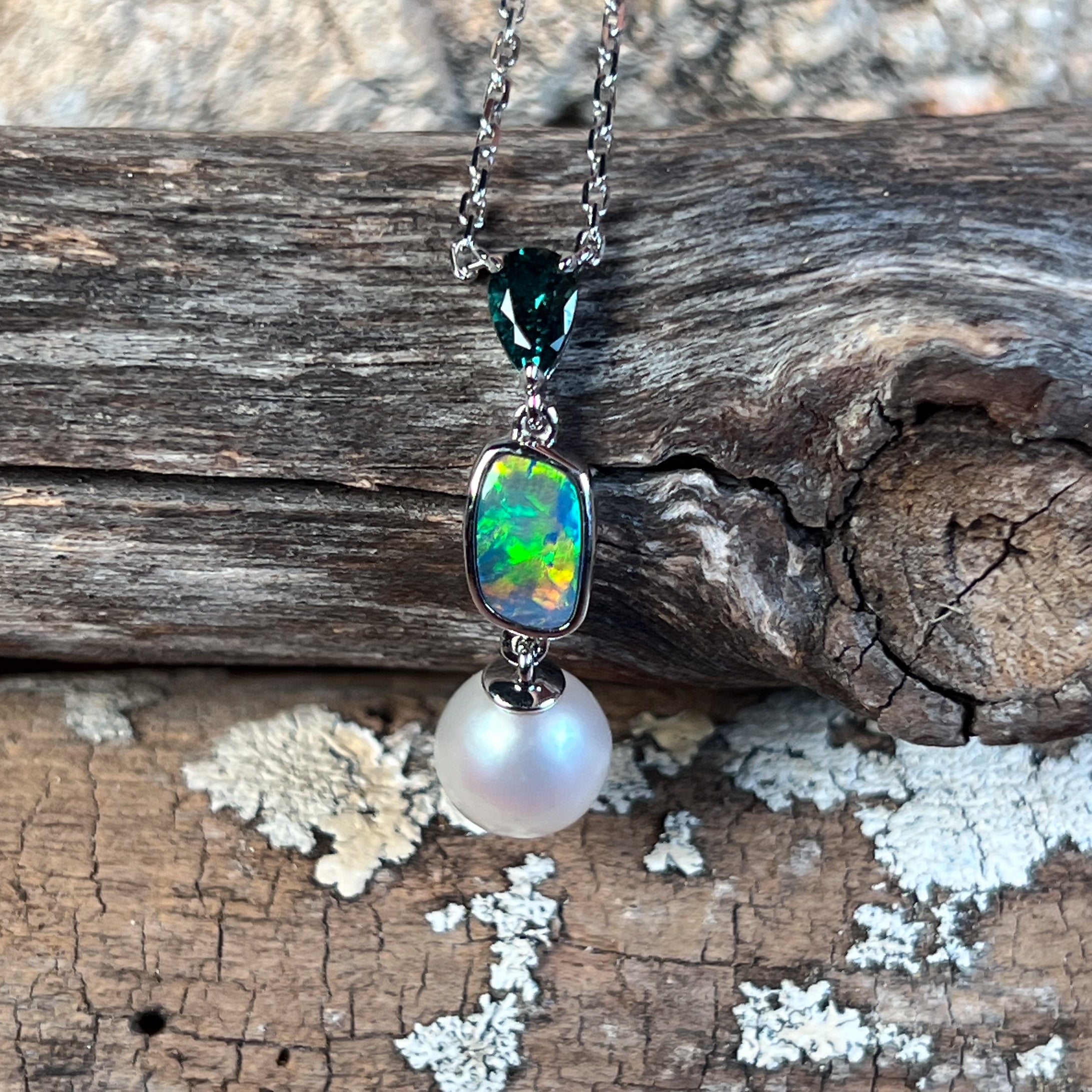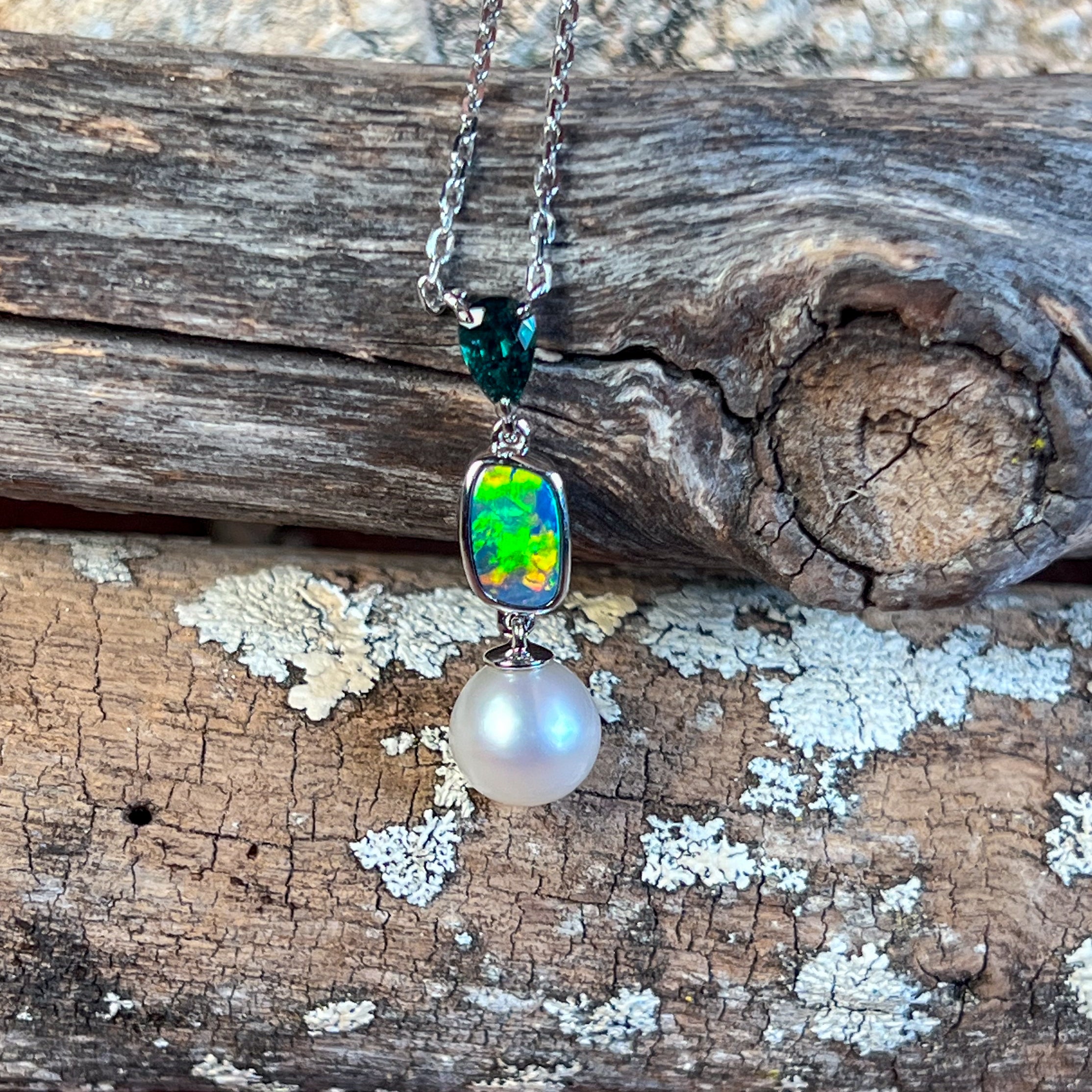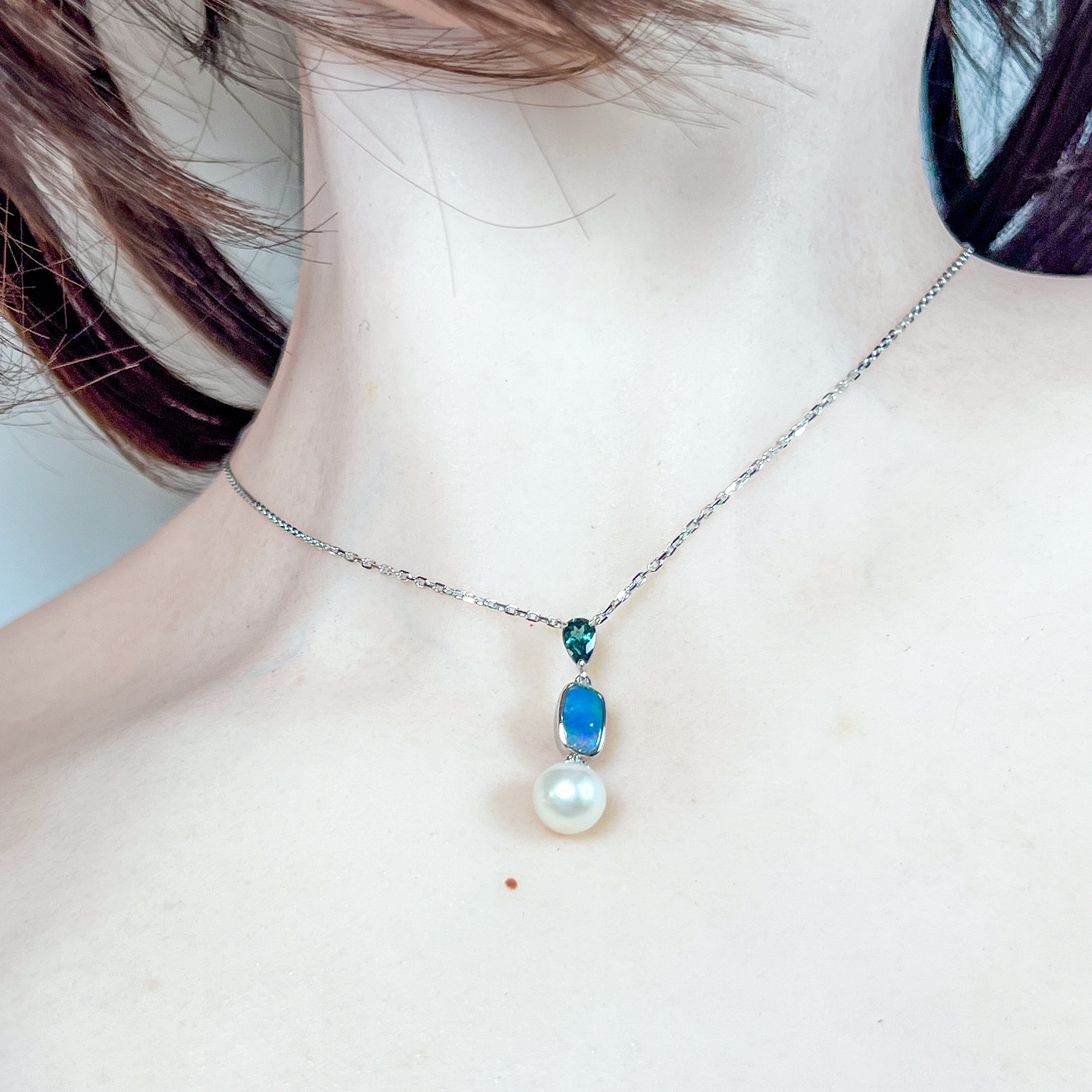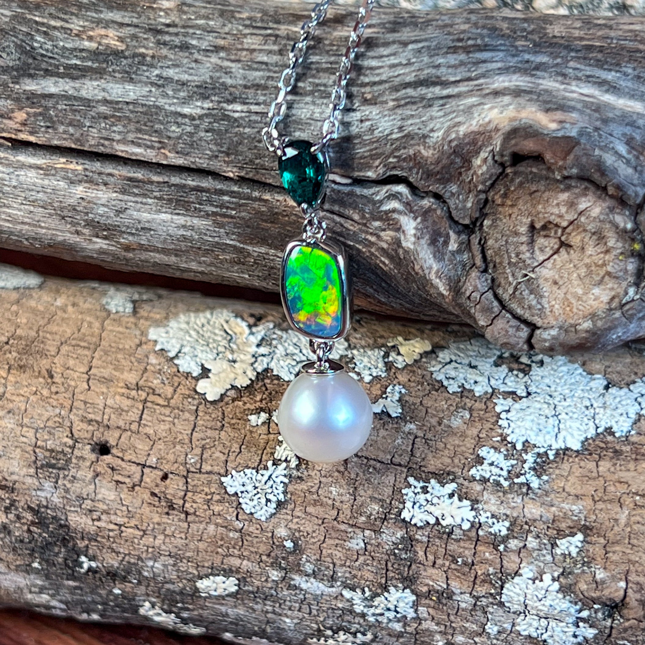 14kt White Gold drop style South Sea Pearl 8.5mm, Opal doublet and Tourmaline necklace