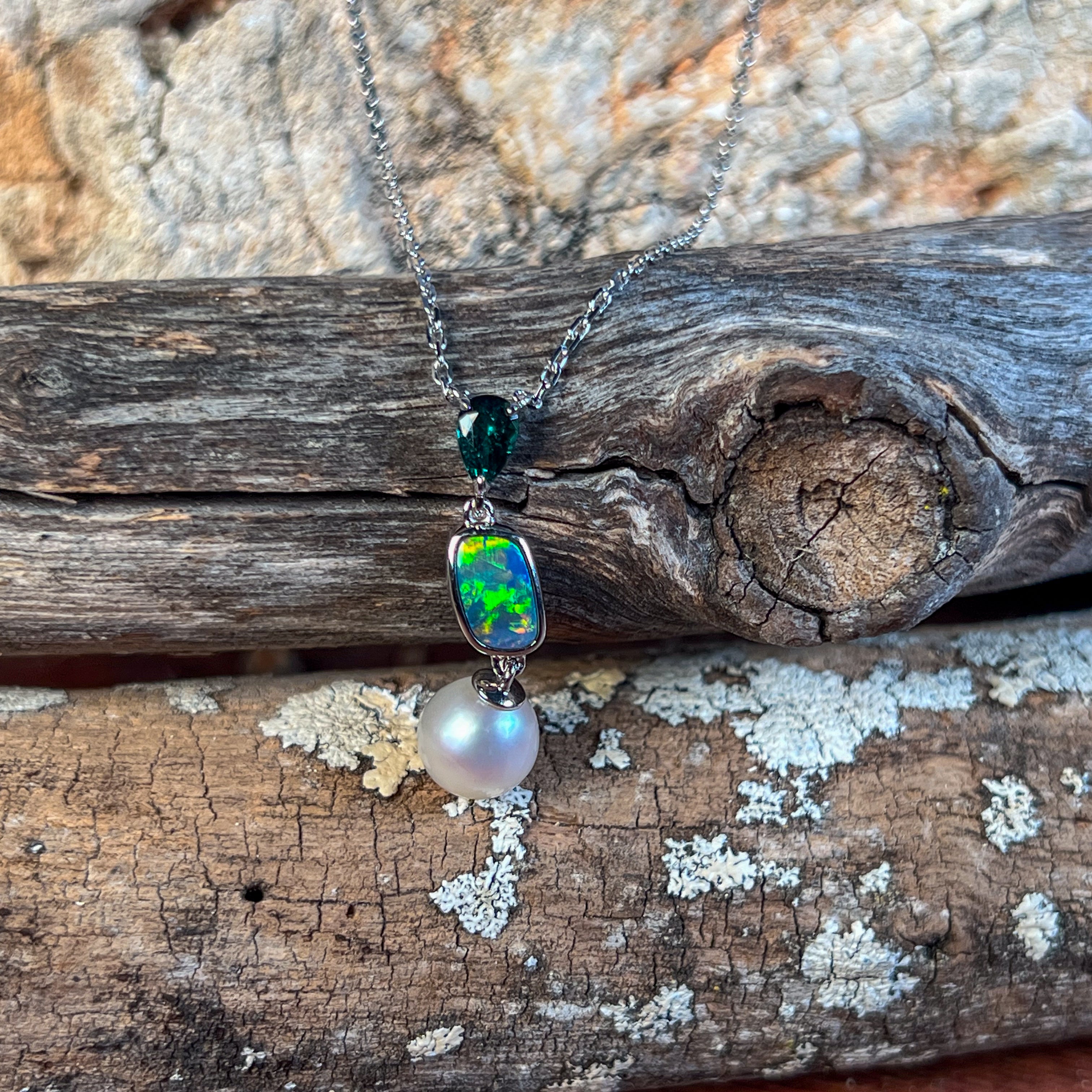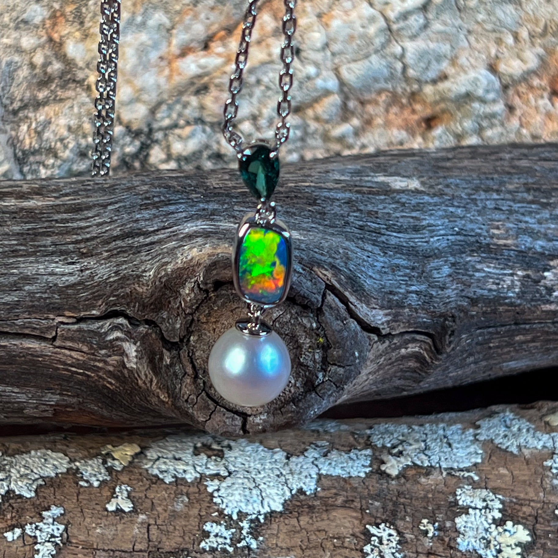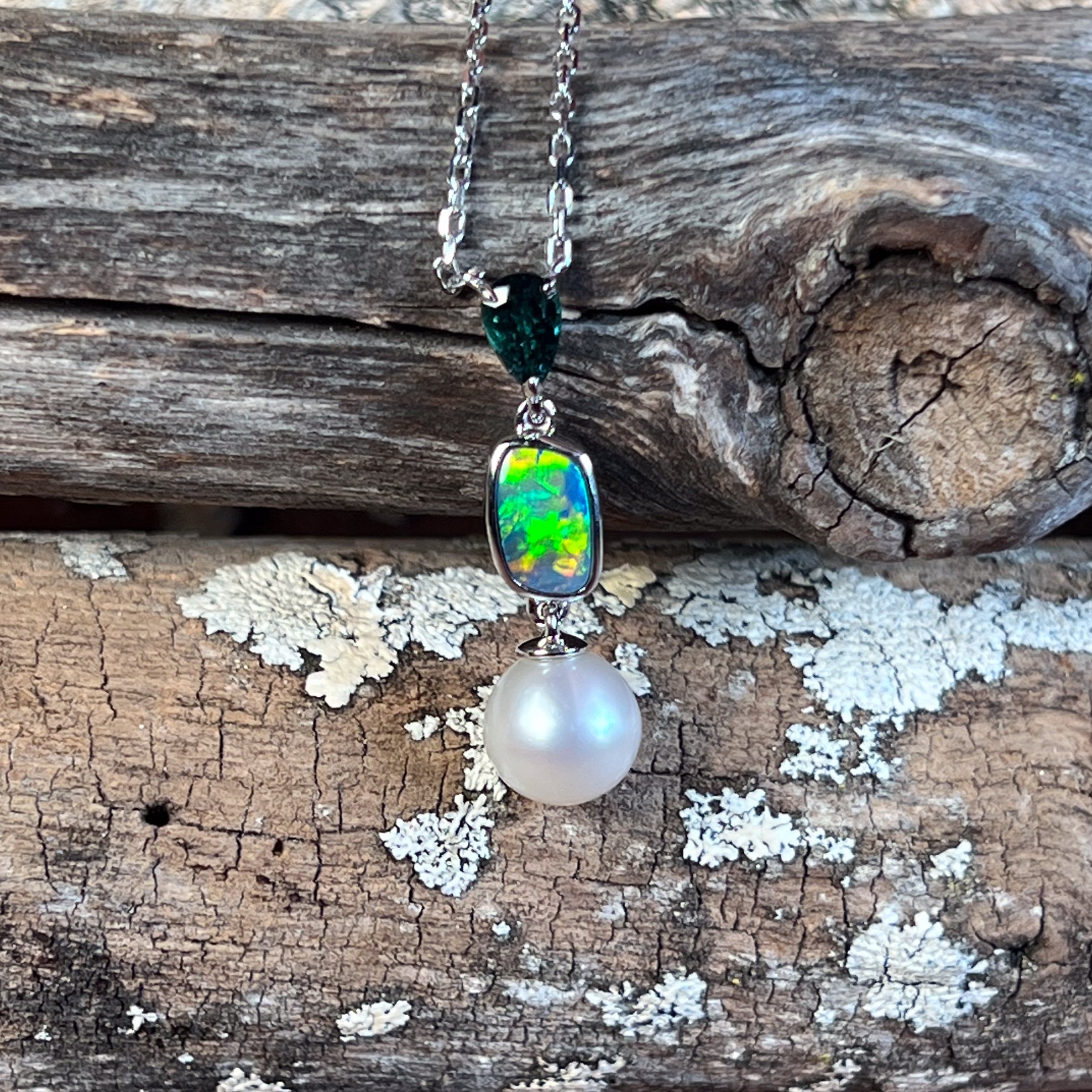 14kt White Gold drop style South Sea Pearl 8.5mm, Opal doublet and Tourmaline necklace