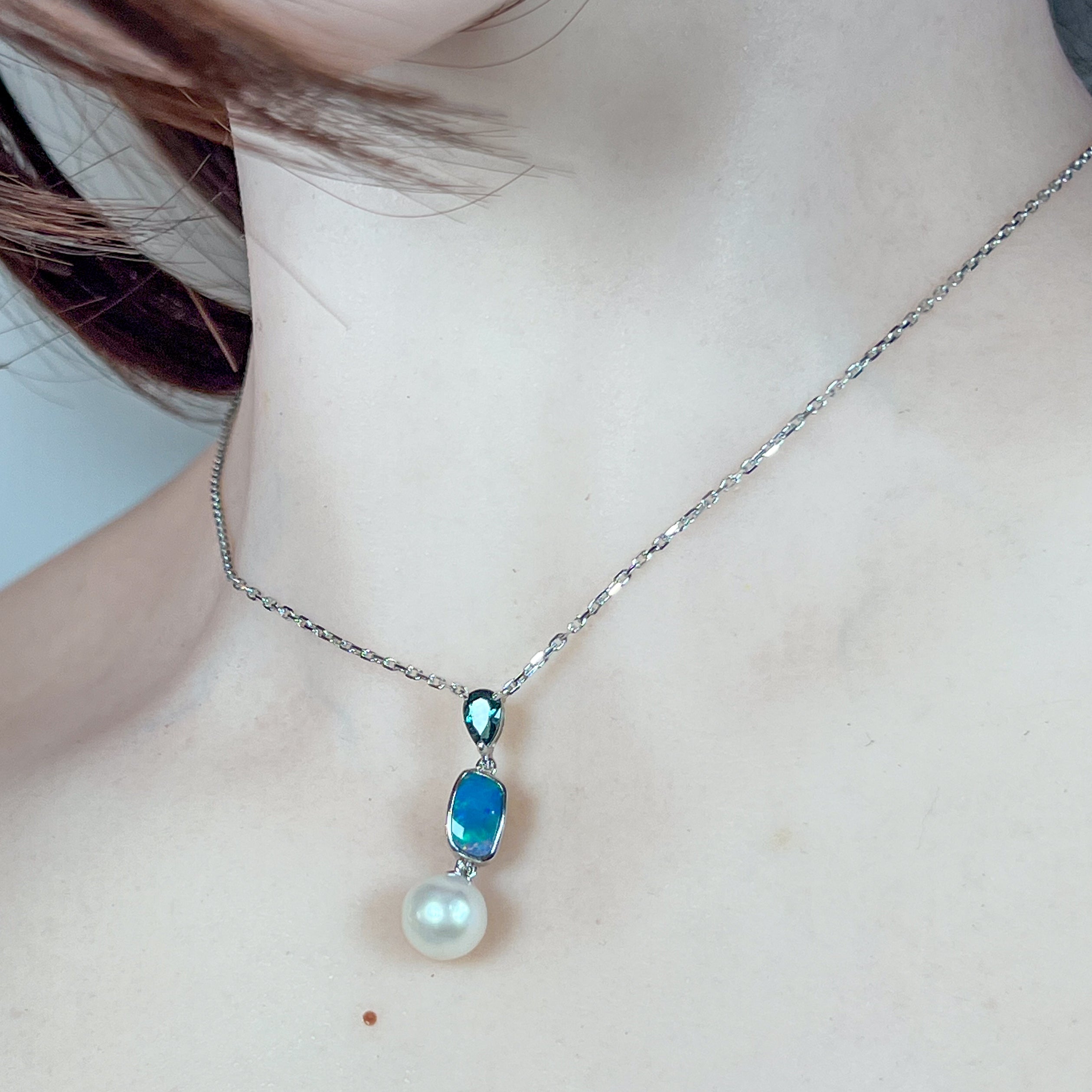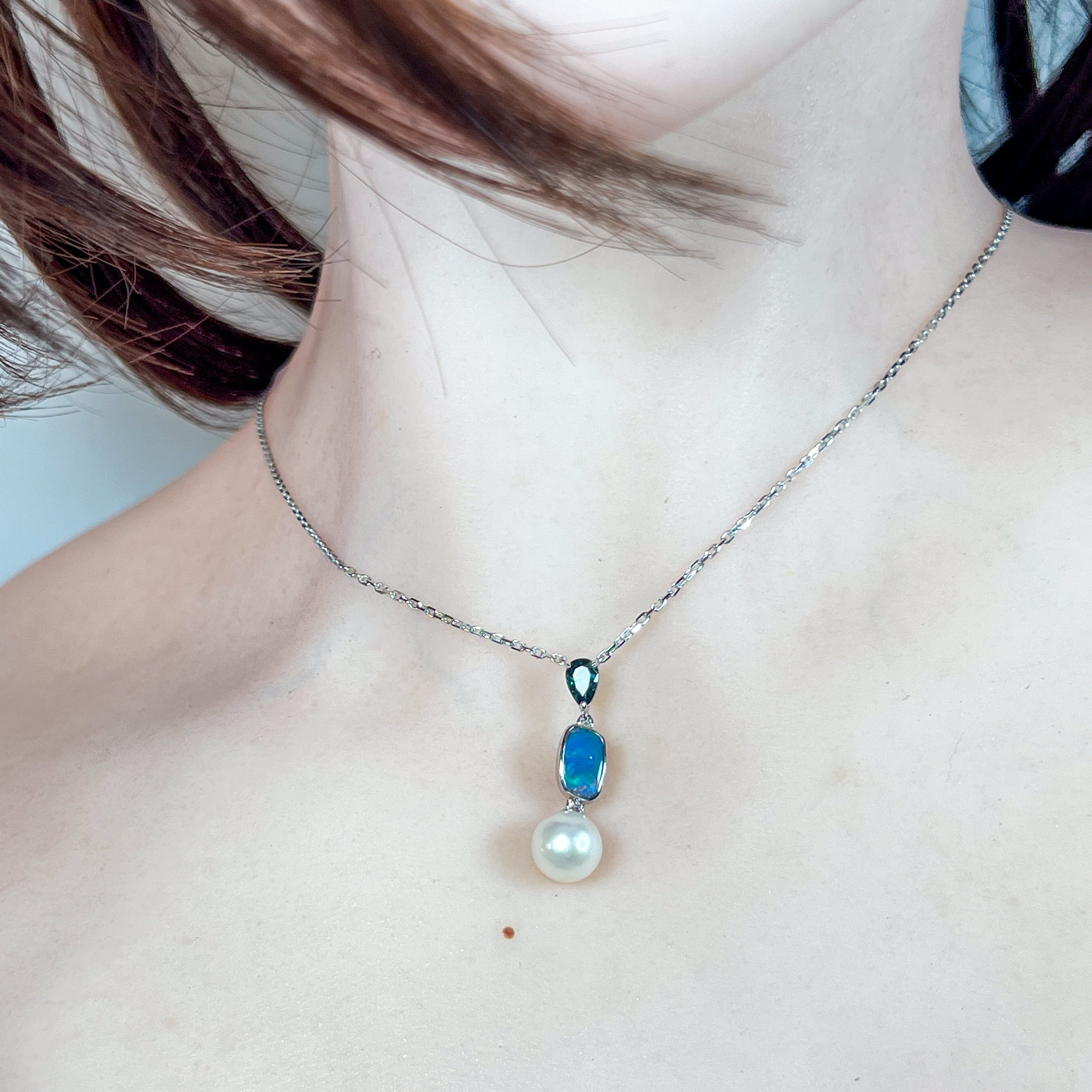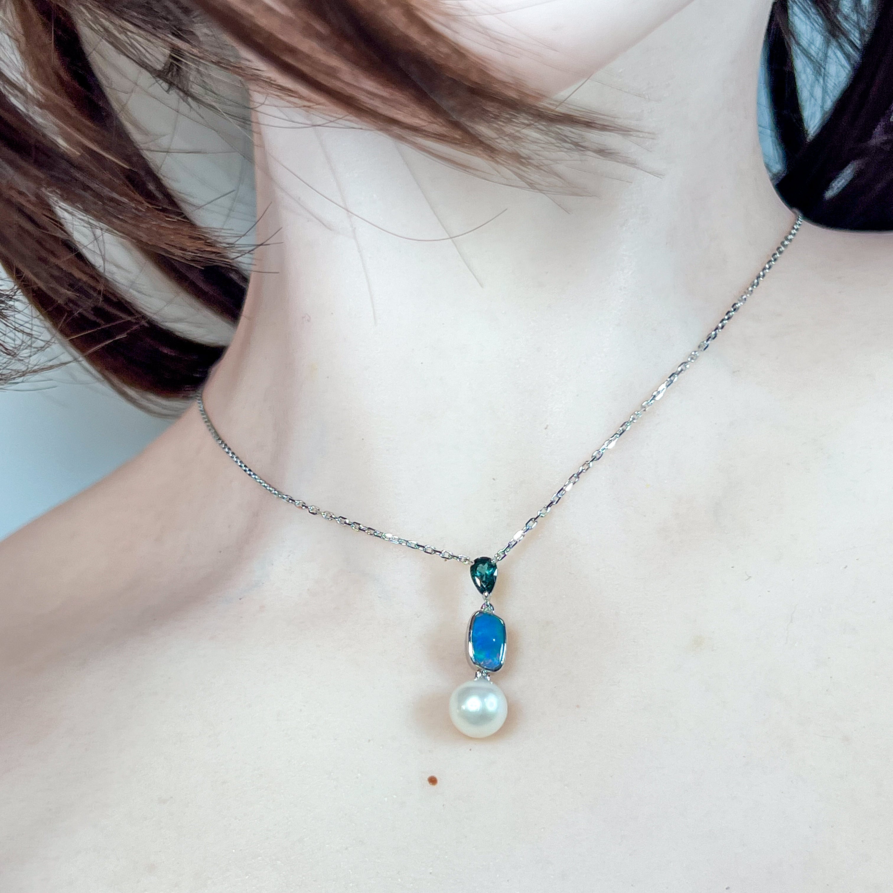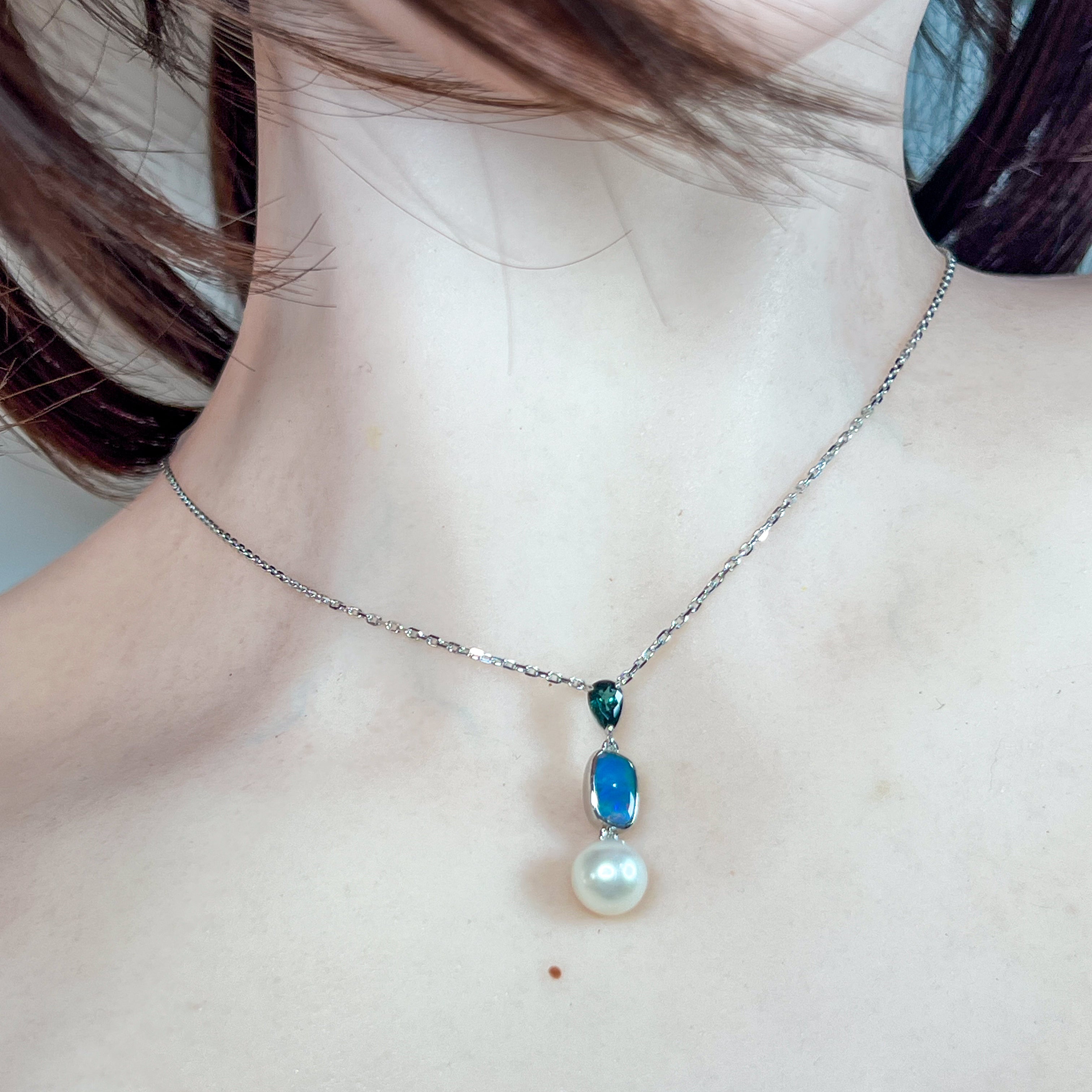 14kt White Gold drop style South Sea Pearl 8.5mm, Opal doublet and Tourmaline necklace