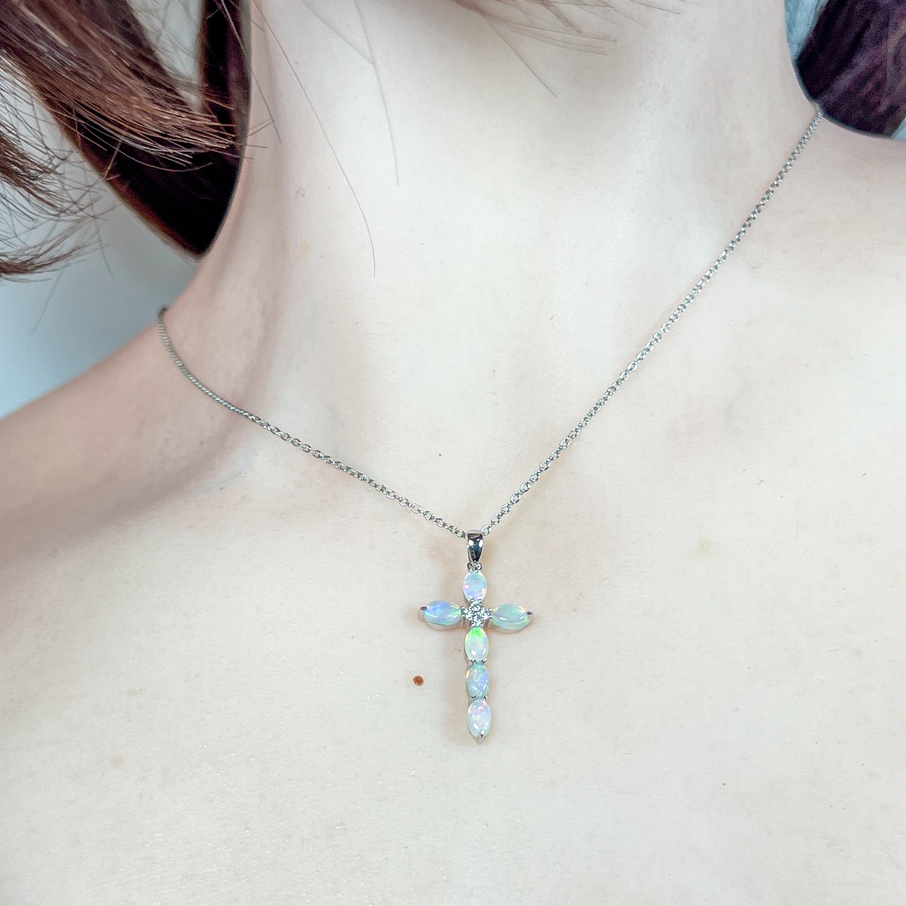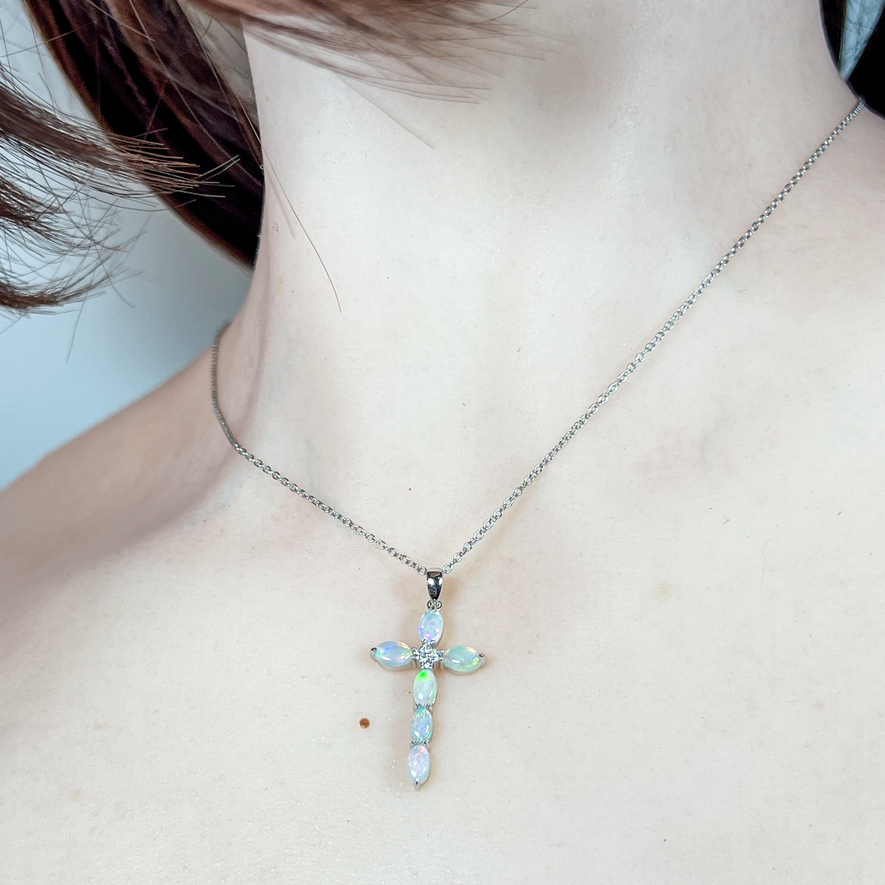 14kt White Gold Crystal Opal 6x3mm and diamond cross pendant