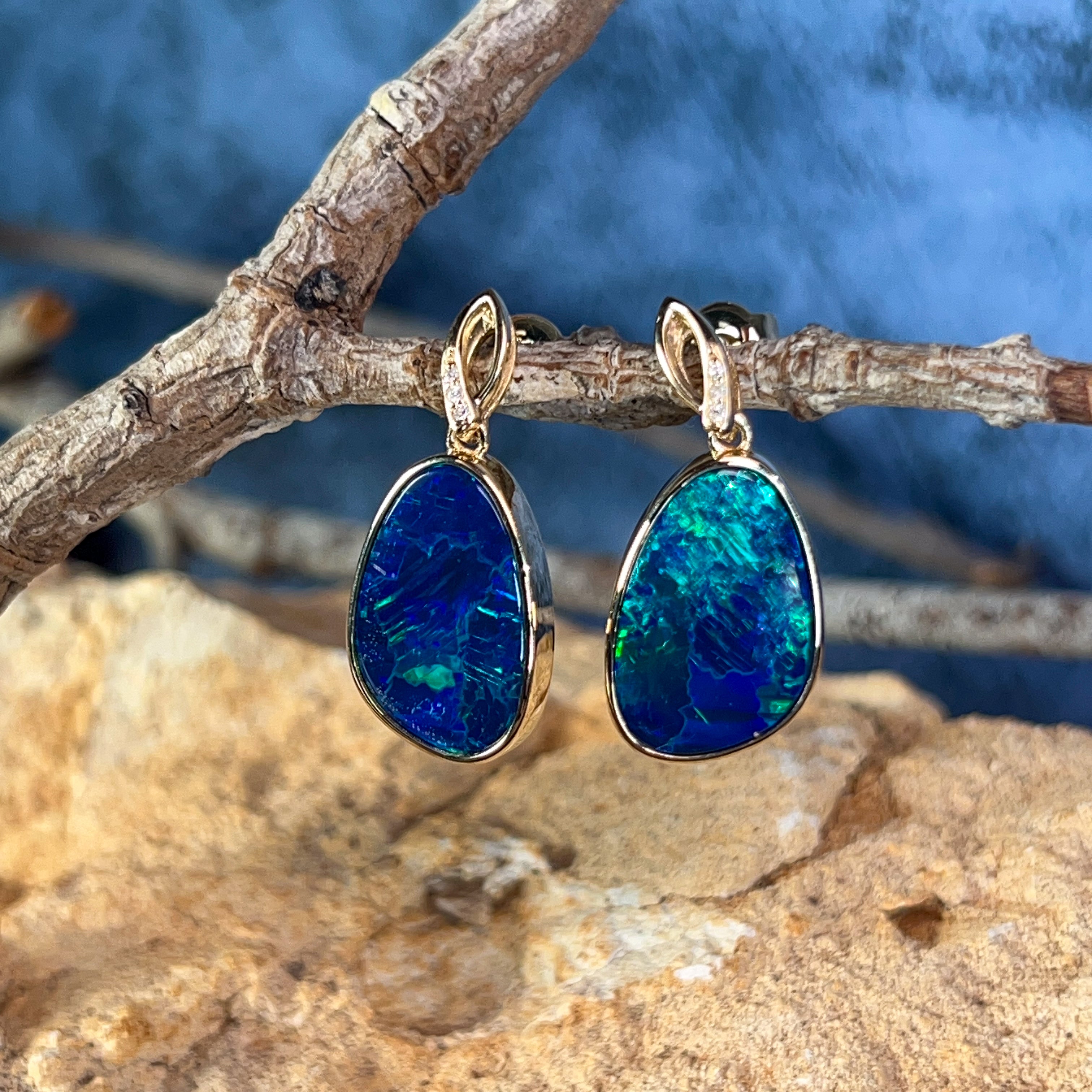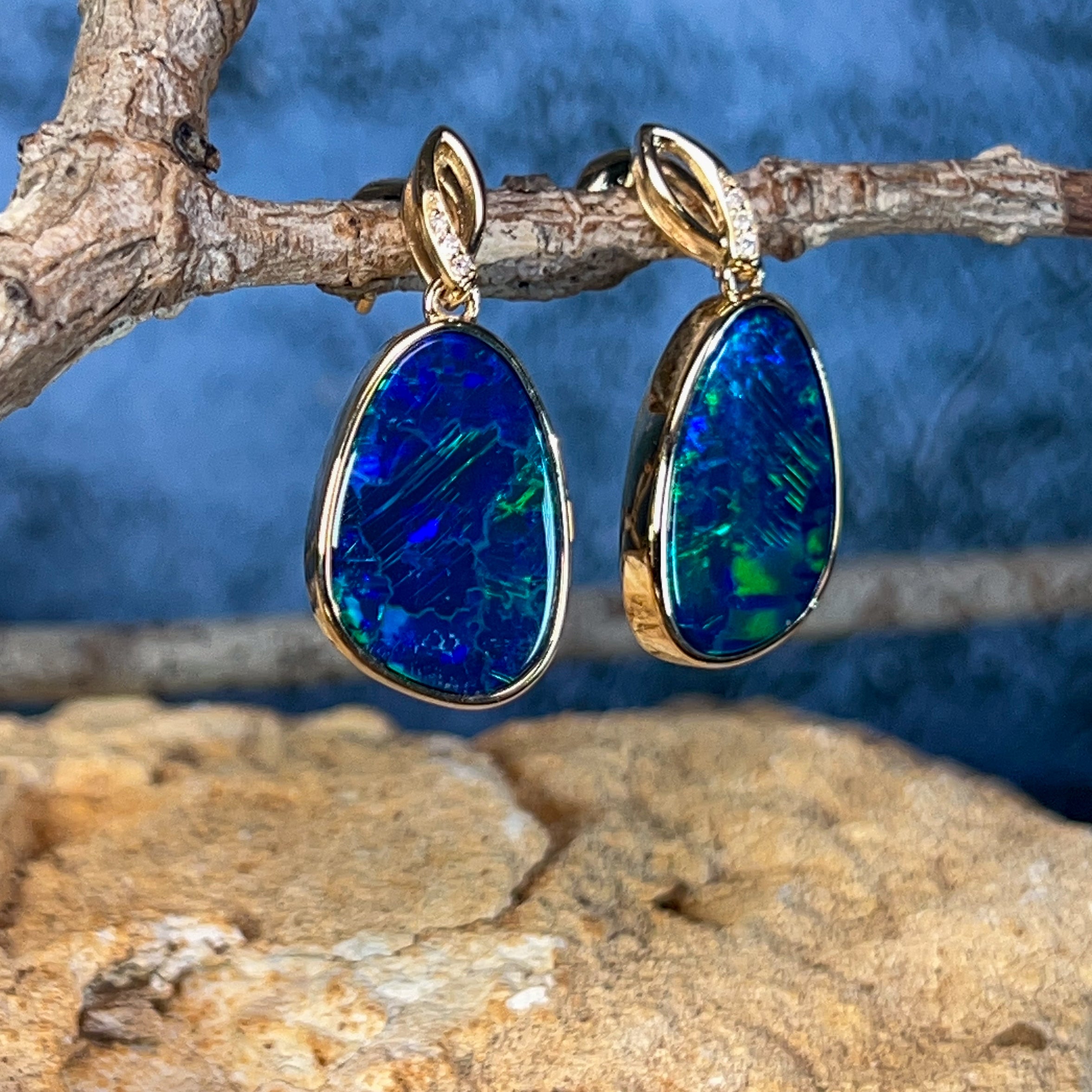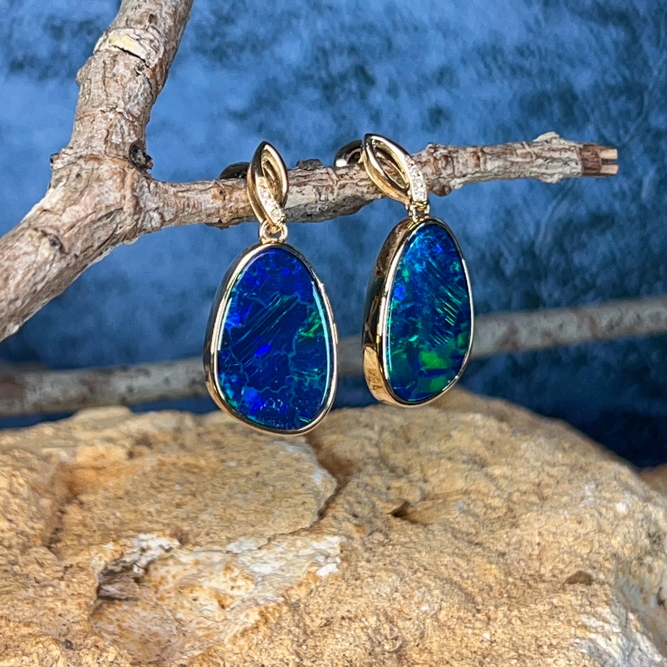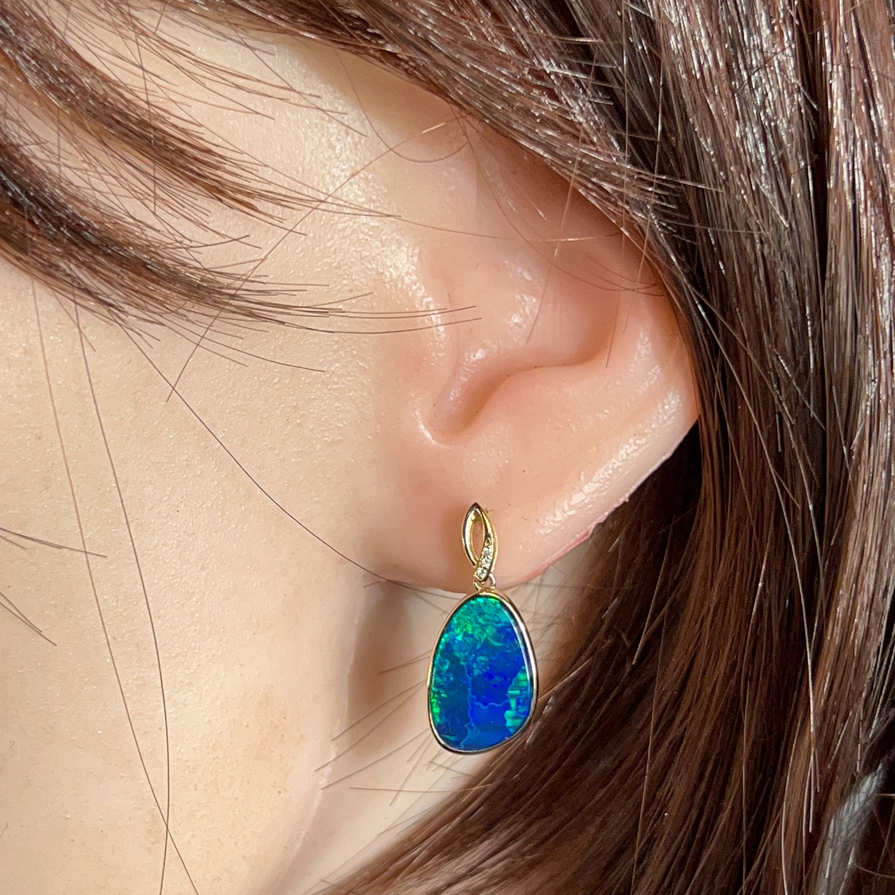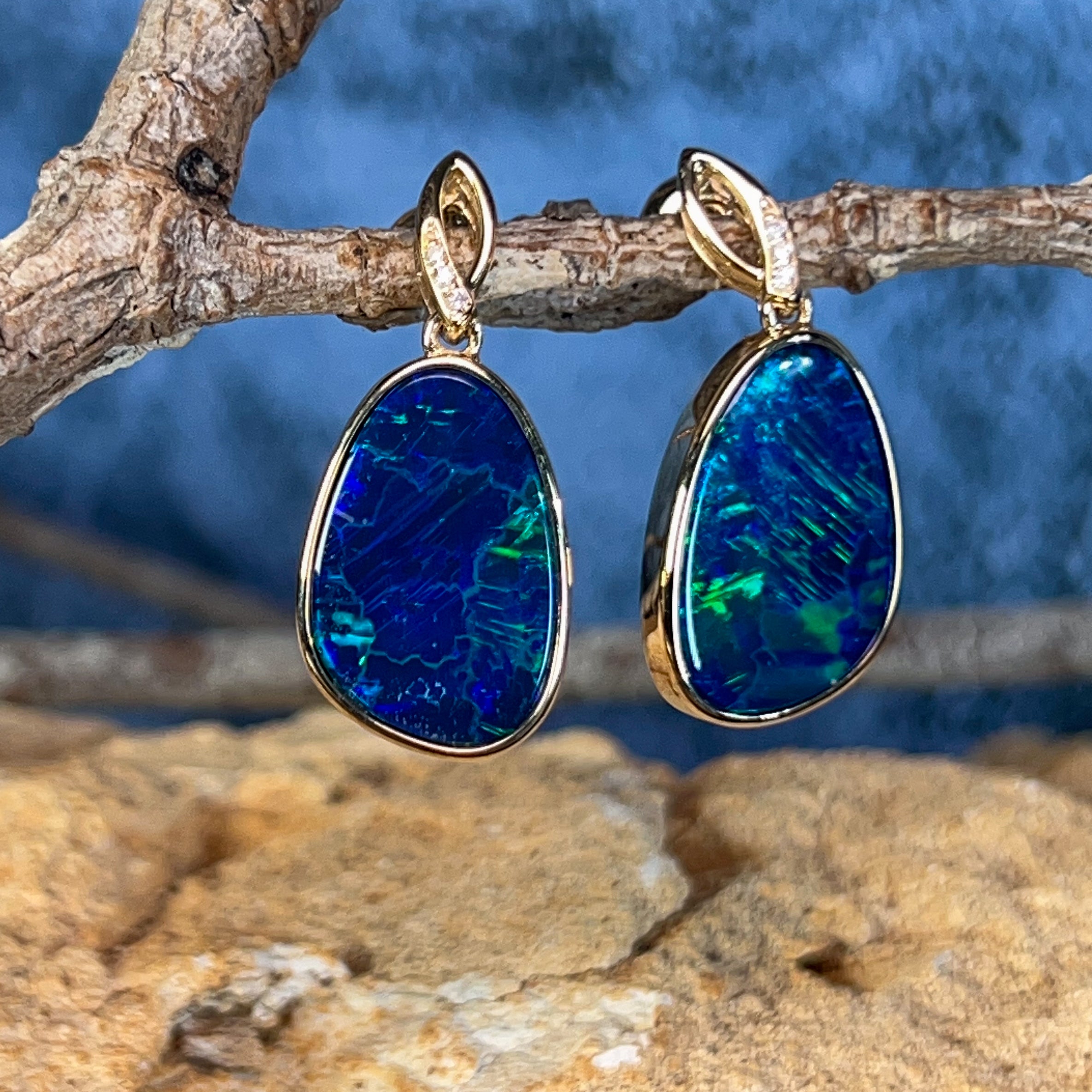 14kt Yellow Gold dangling Blue Green 7.55ct Opal doublet and diamond earrings