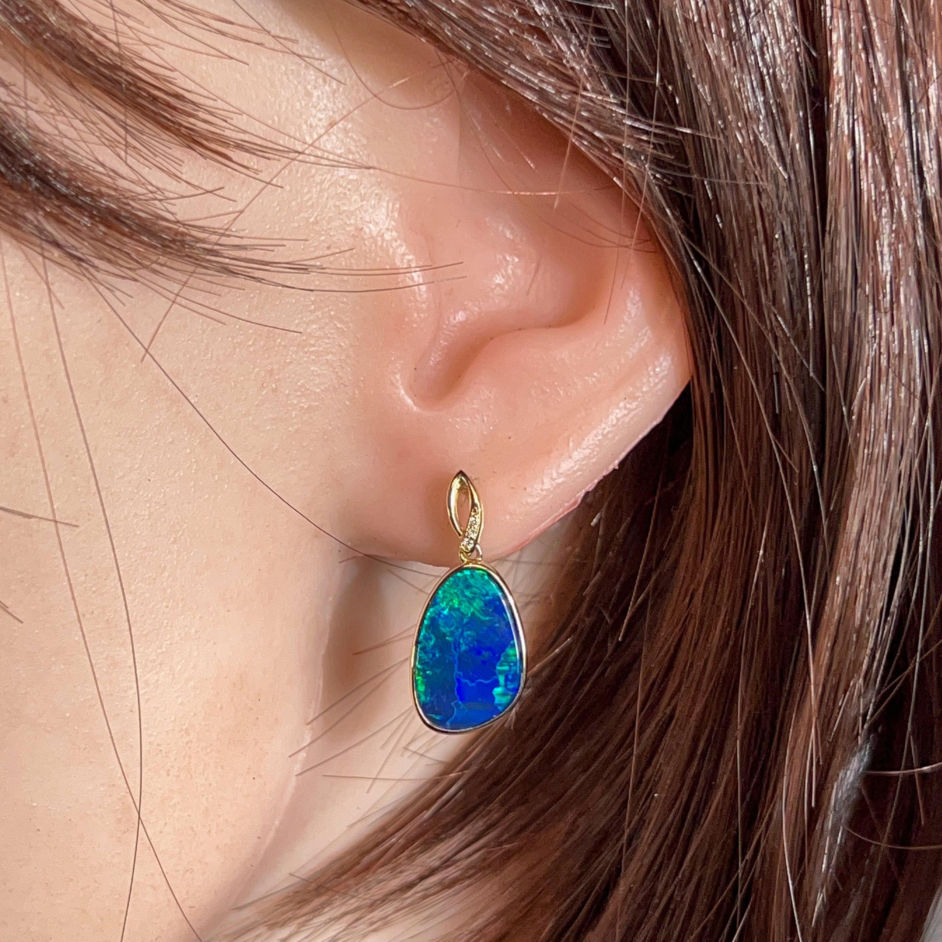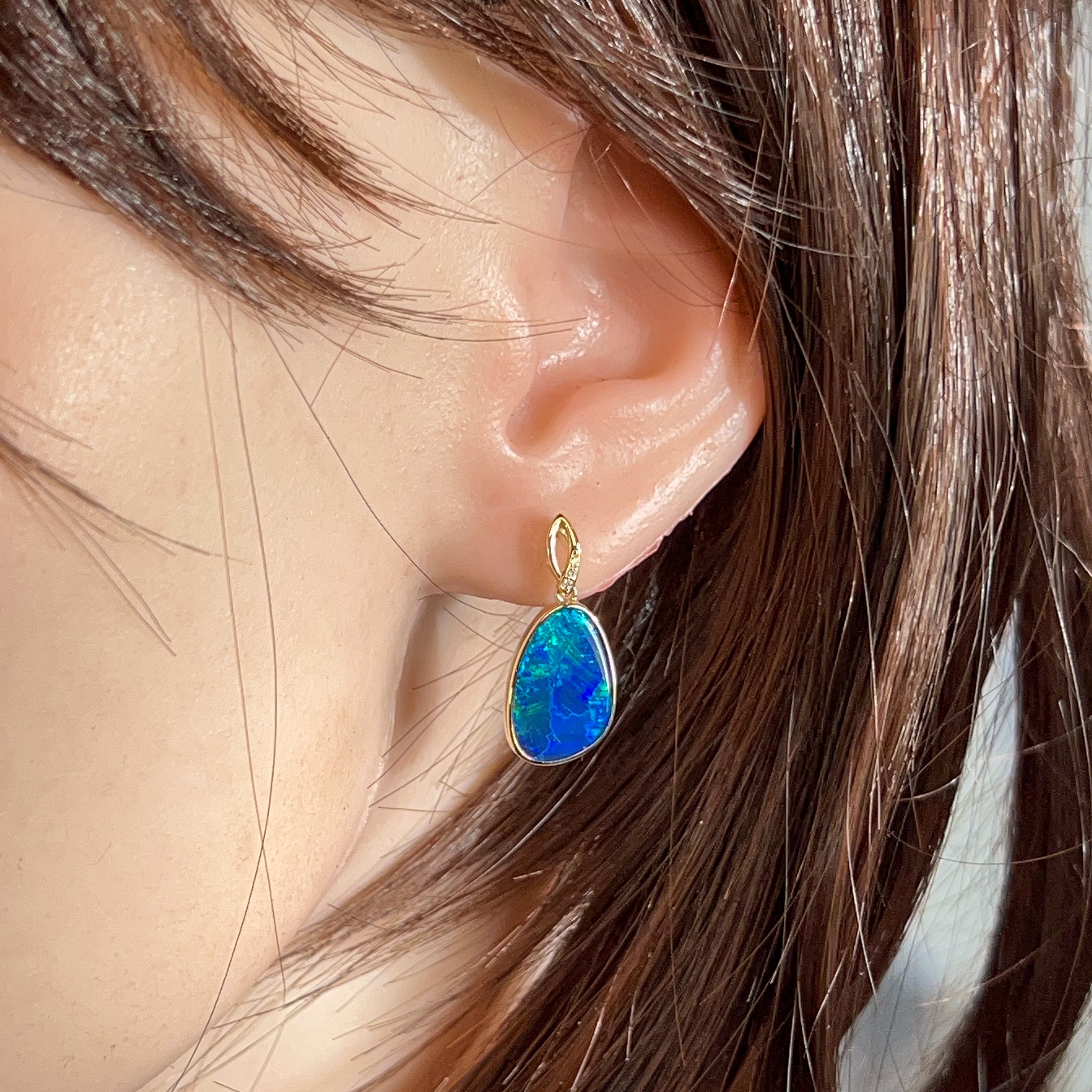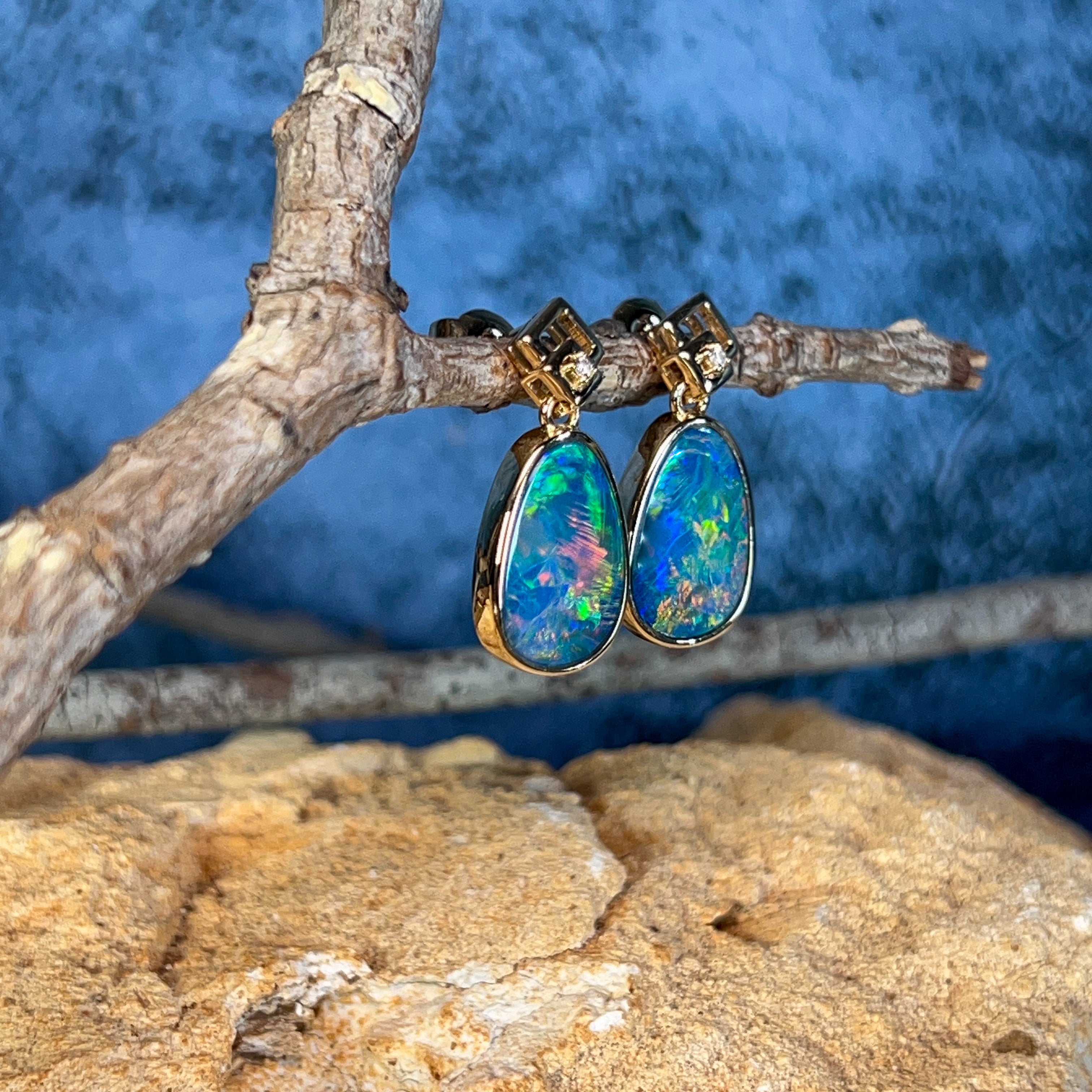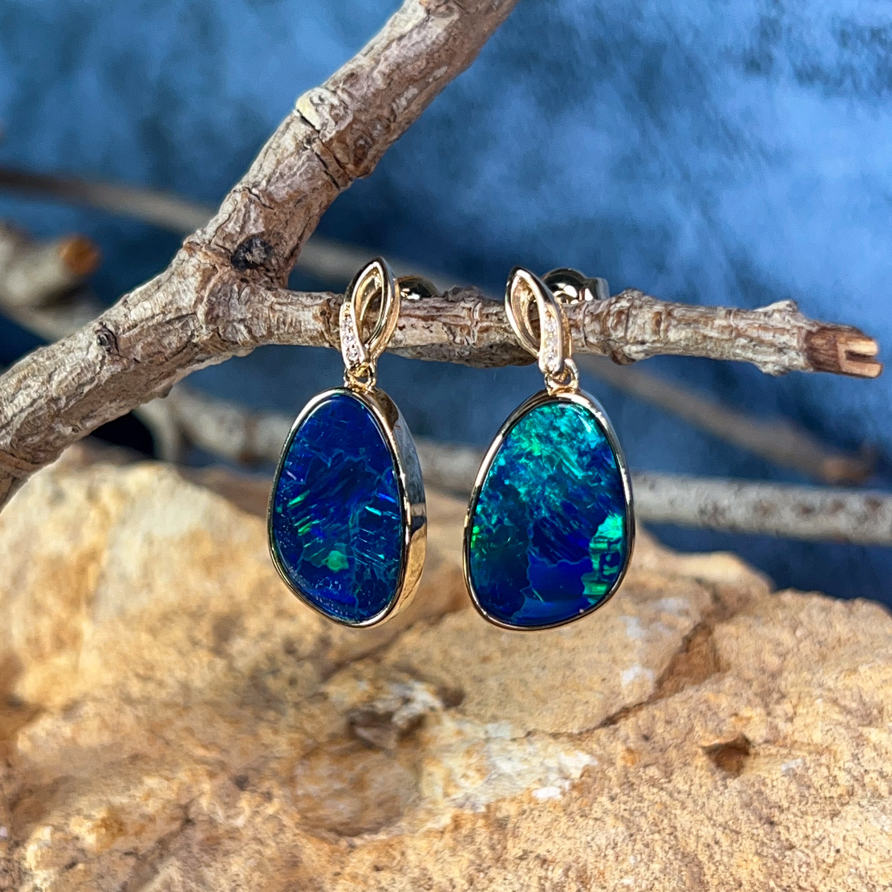 14kt Yellow Gold dangling Blue Green 7.55ct Opal doublet and diamond earrings