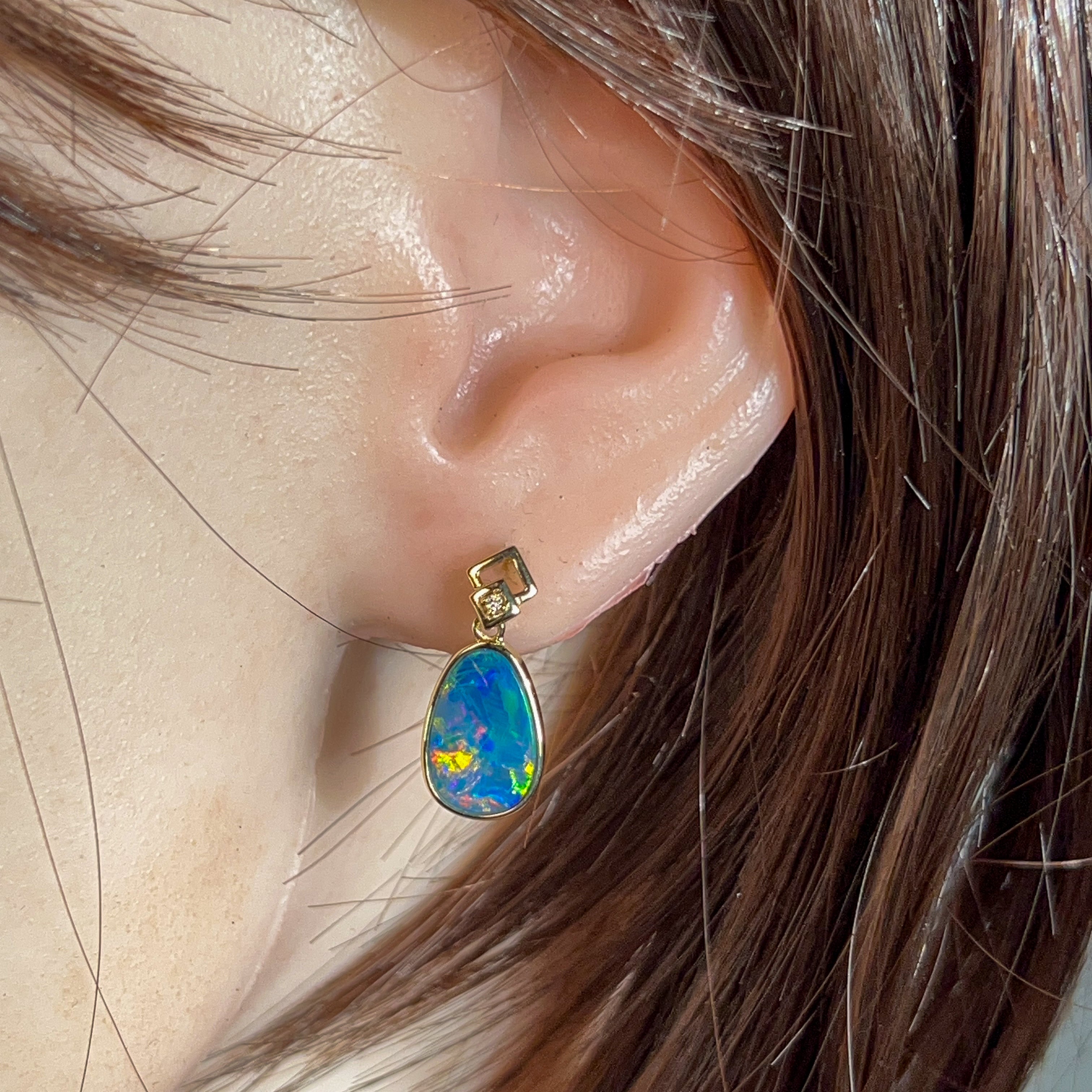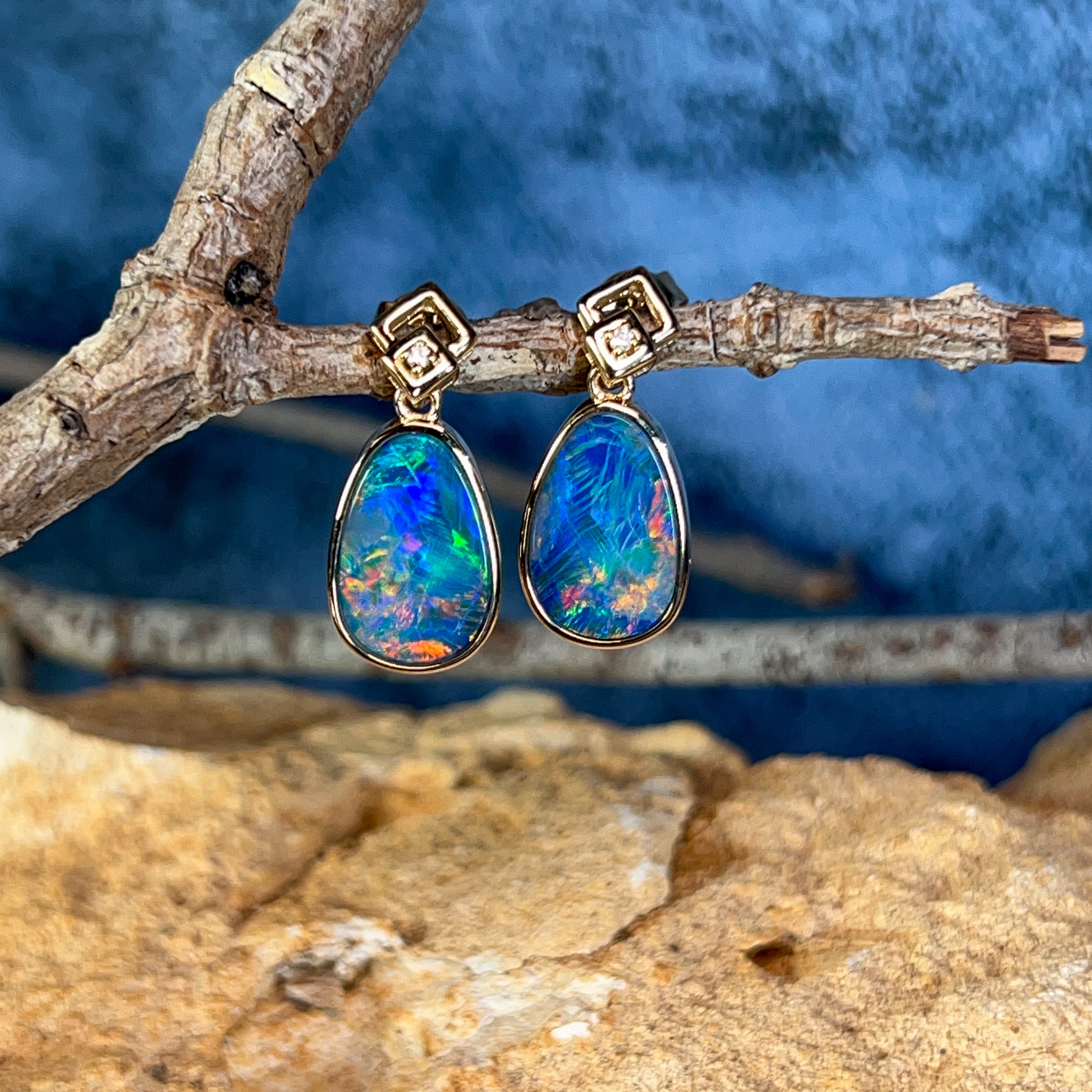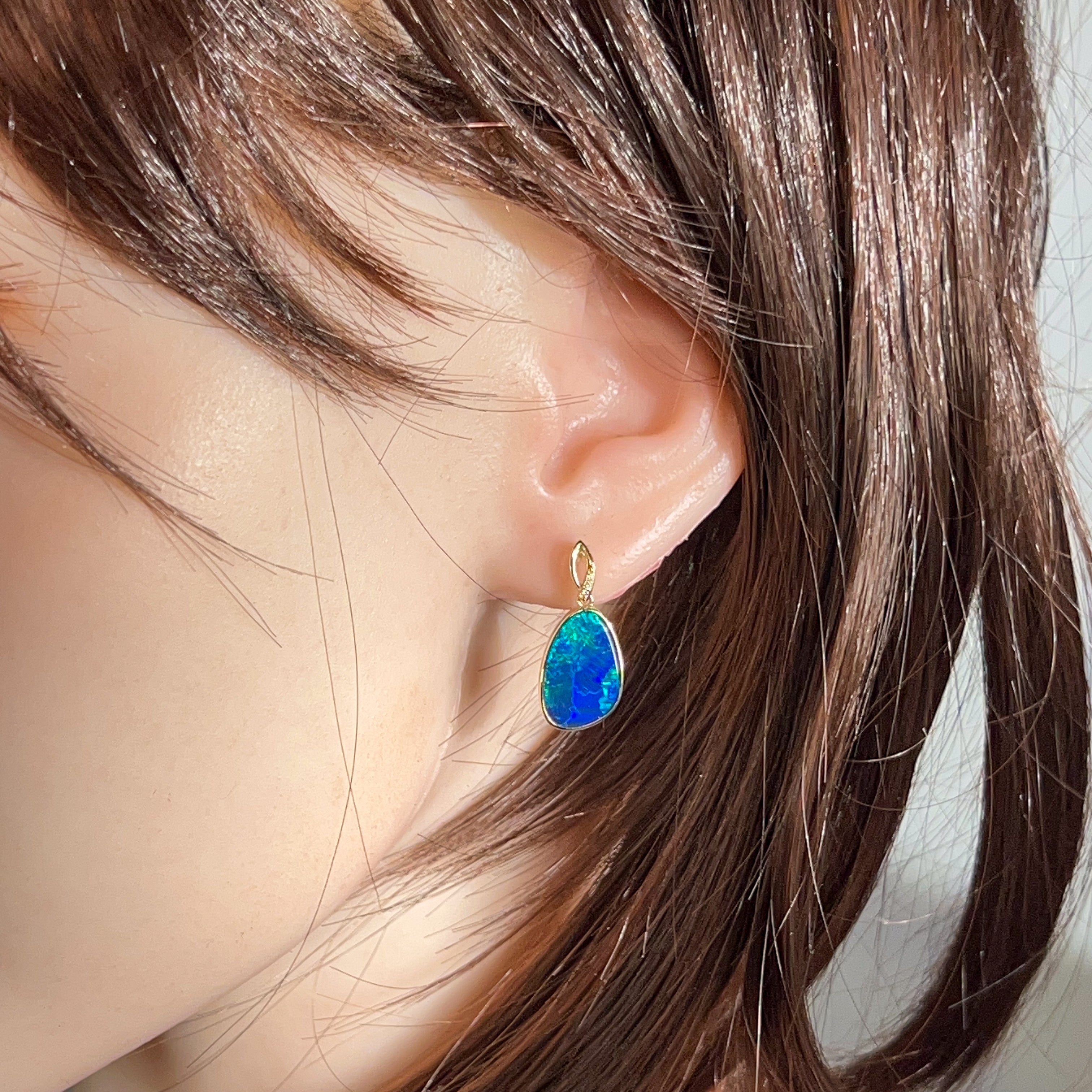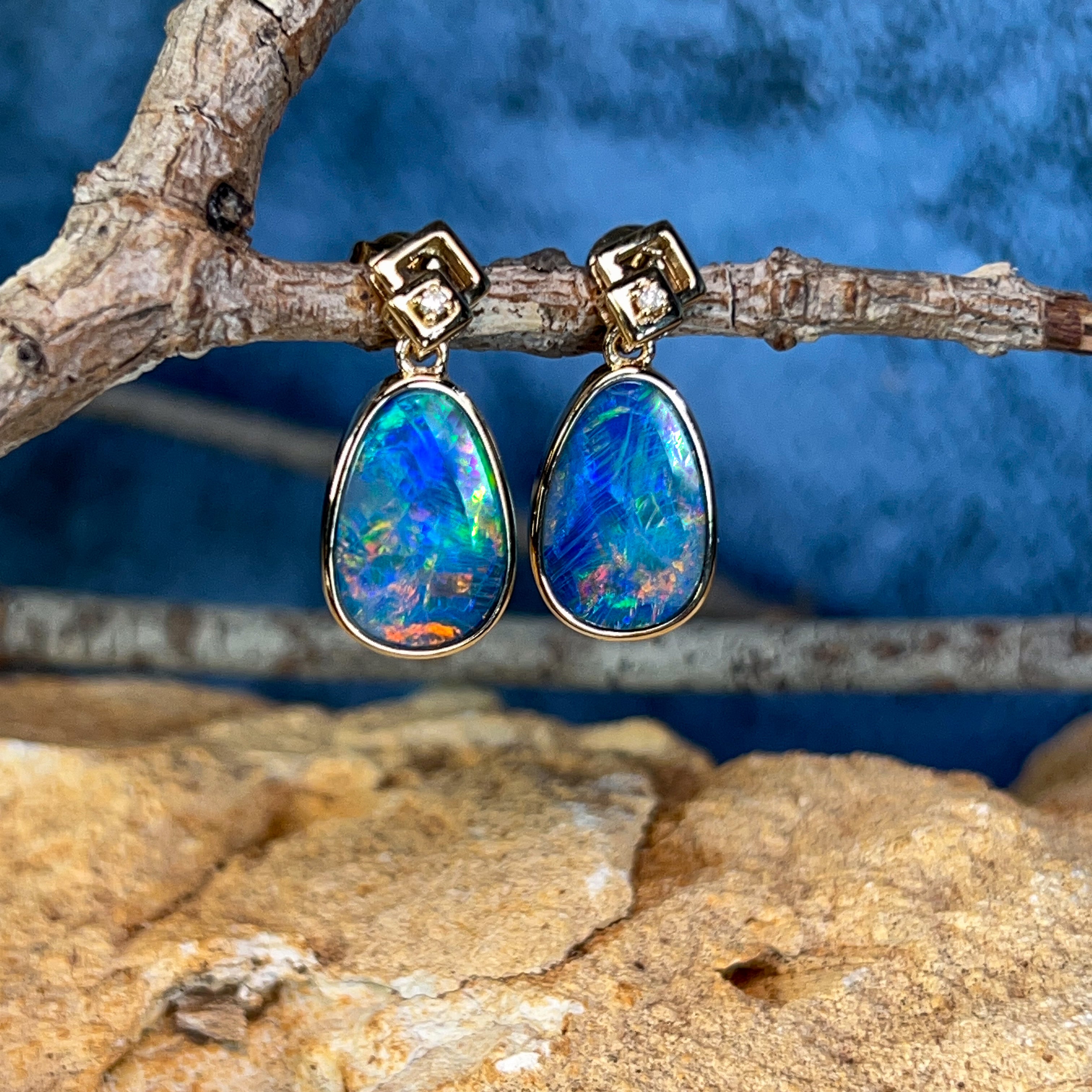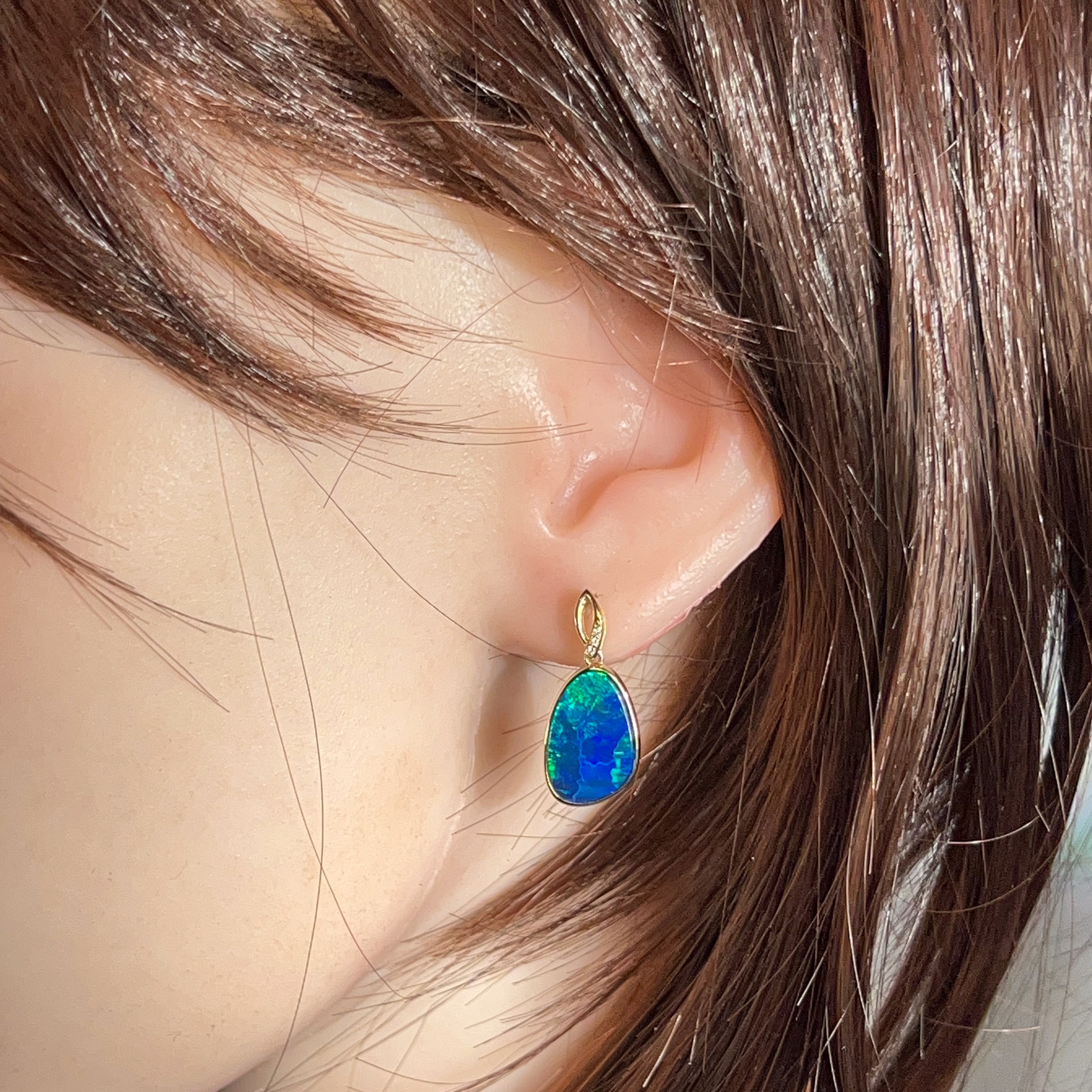 14kt Yellow Gold dangling Blue Green 7.55ct Opal doublet and diamond earrings