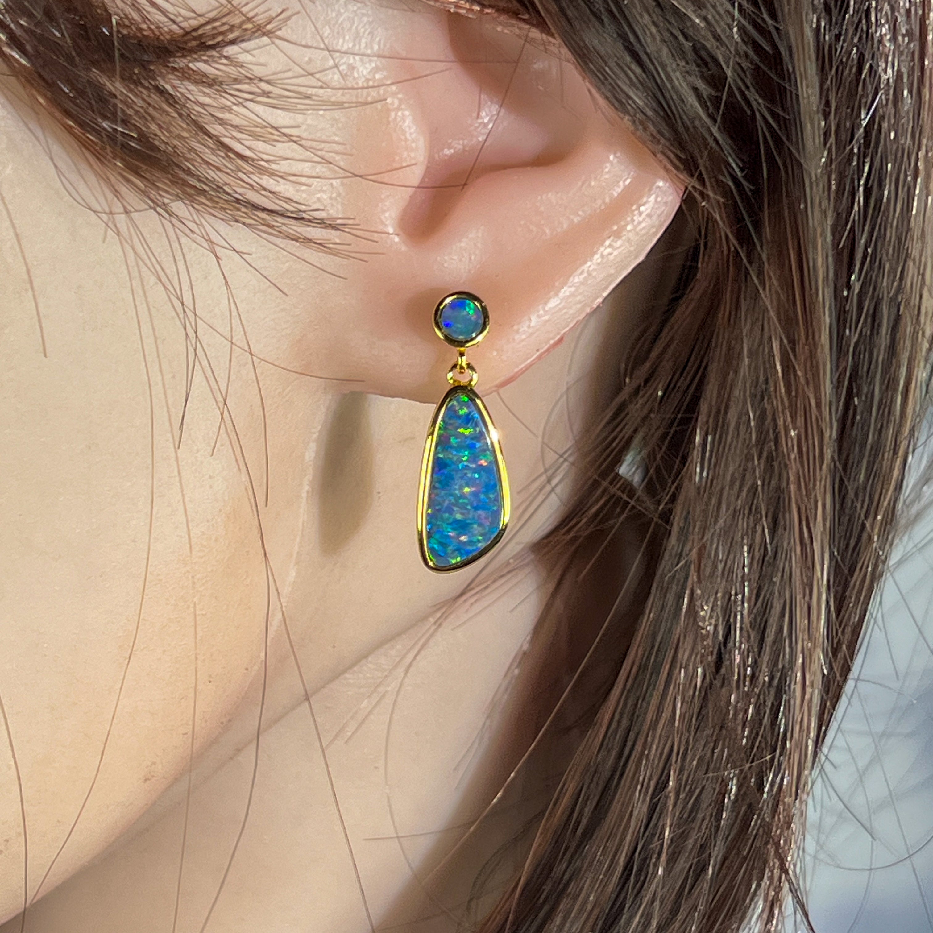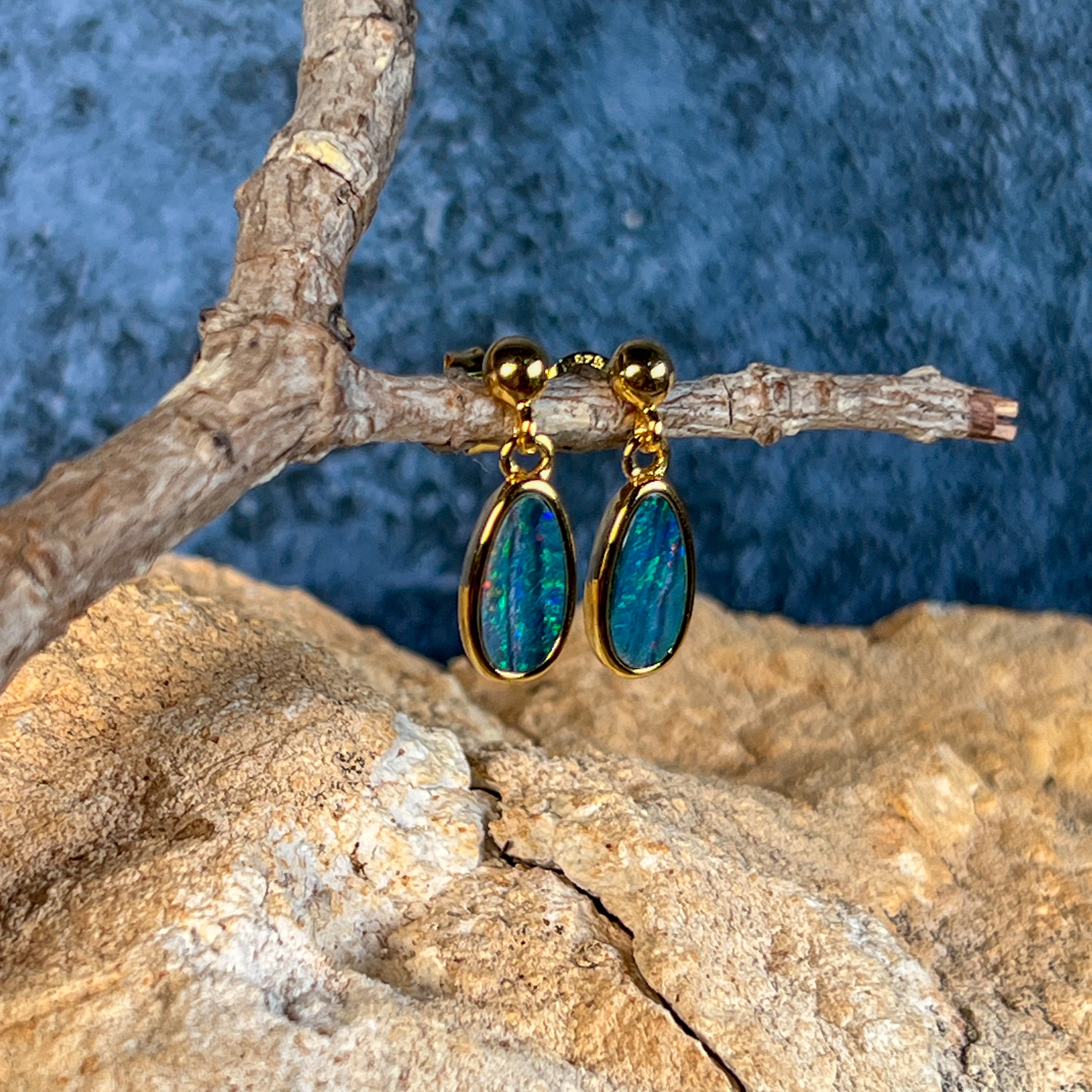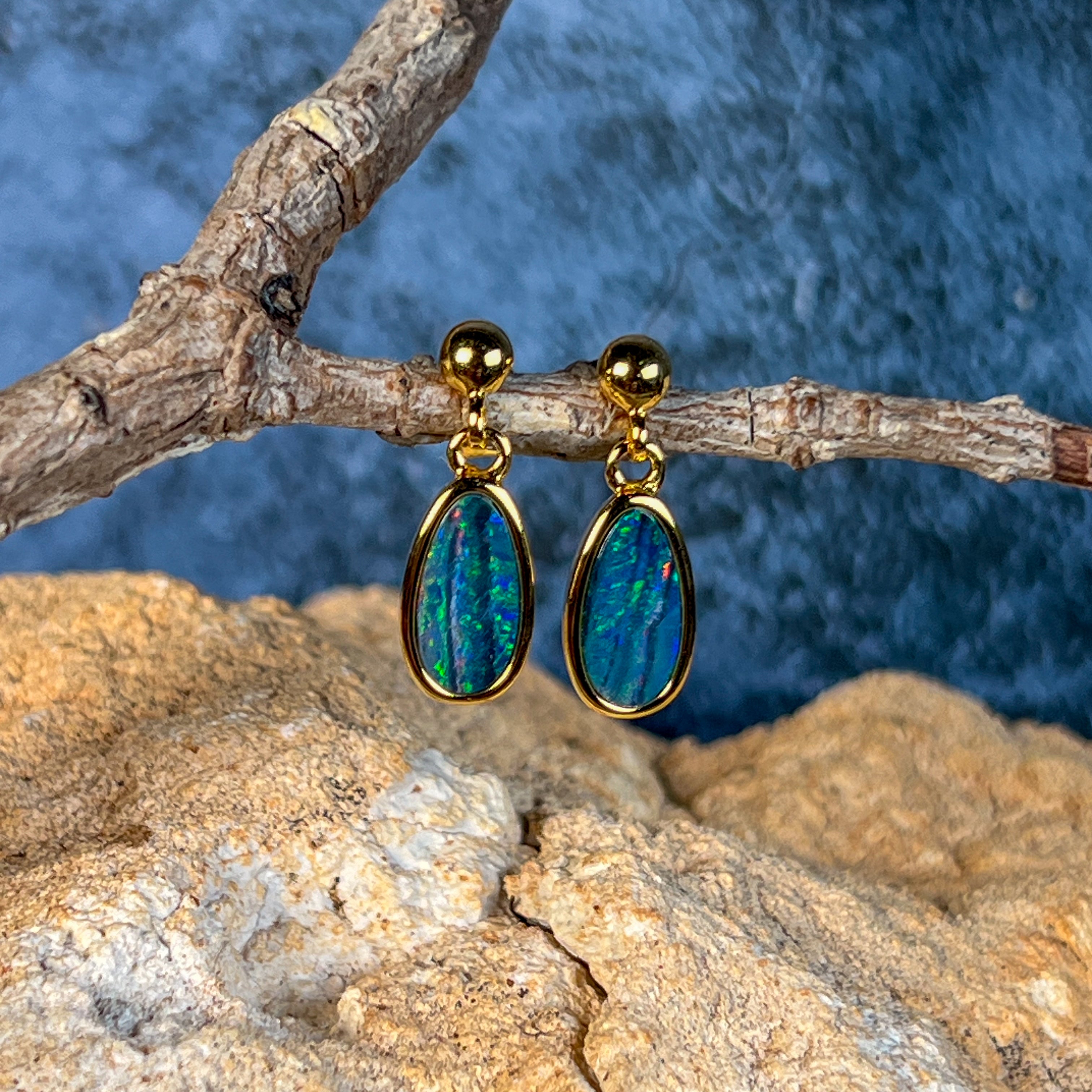 Gold Plated Silver short dangling Green Blue Opal doublet earrings
