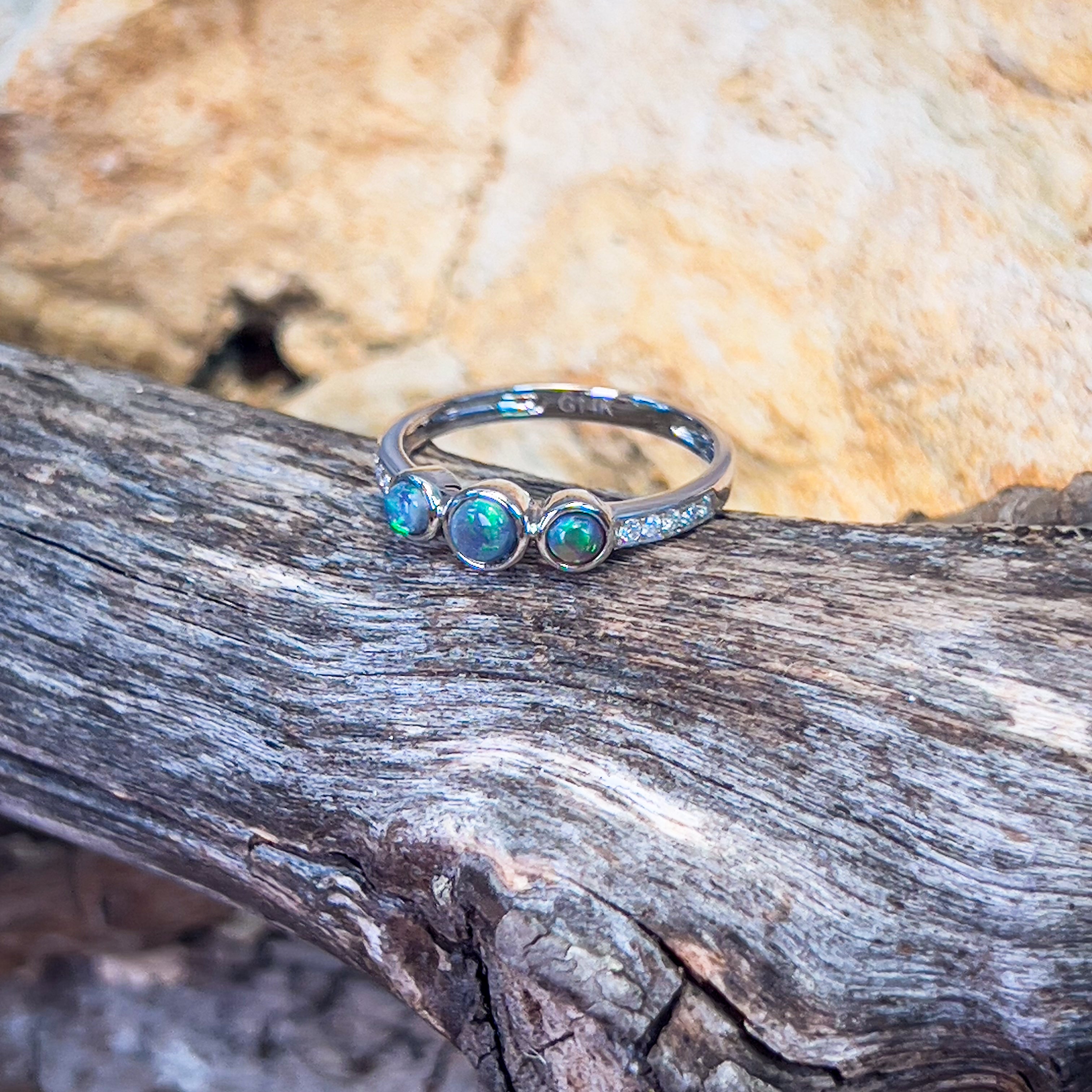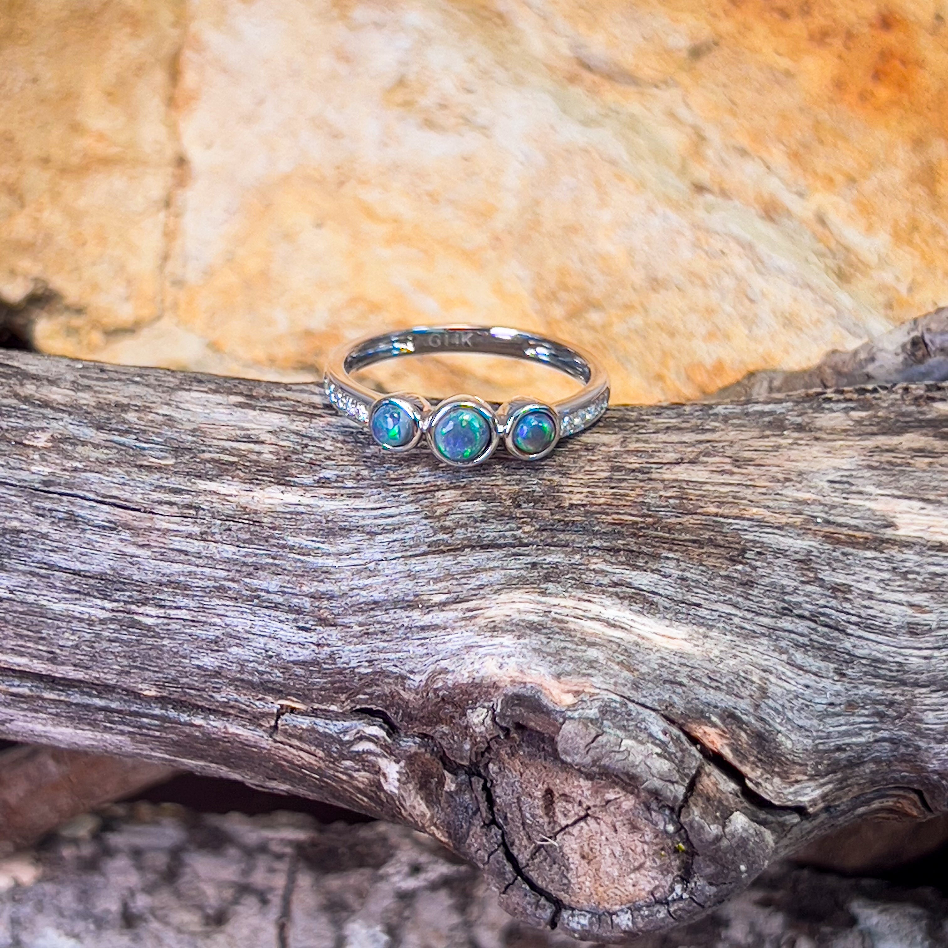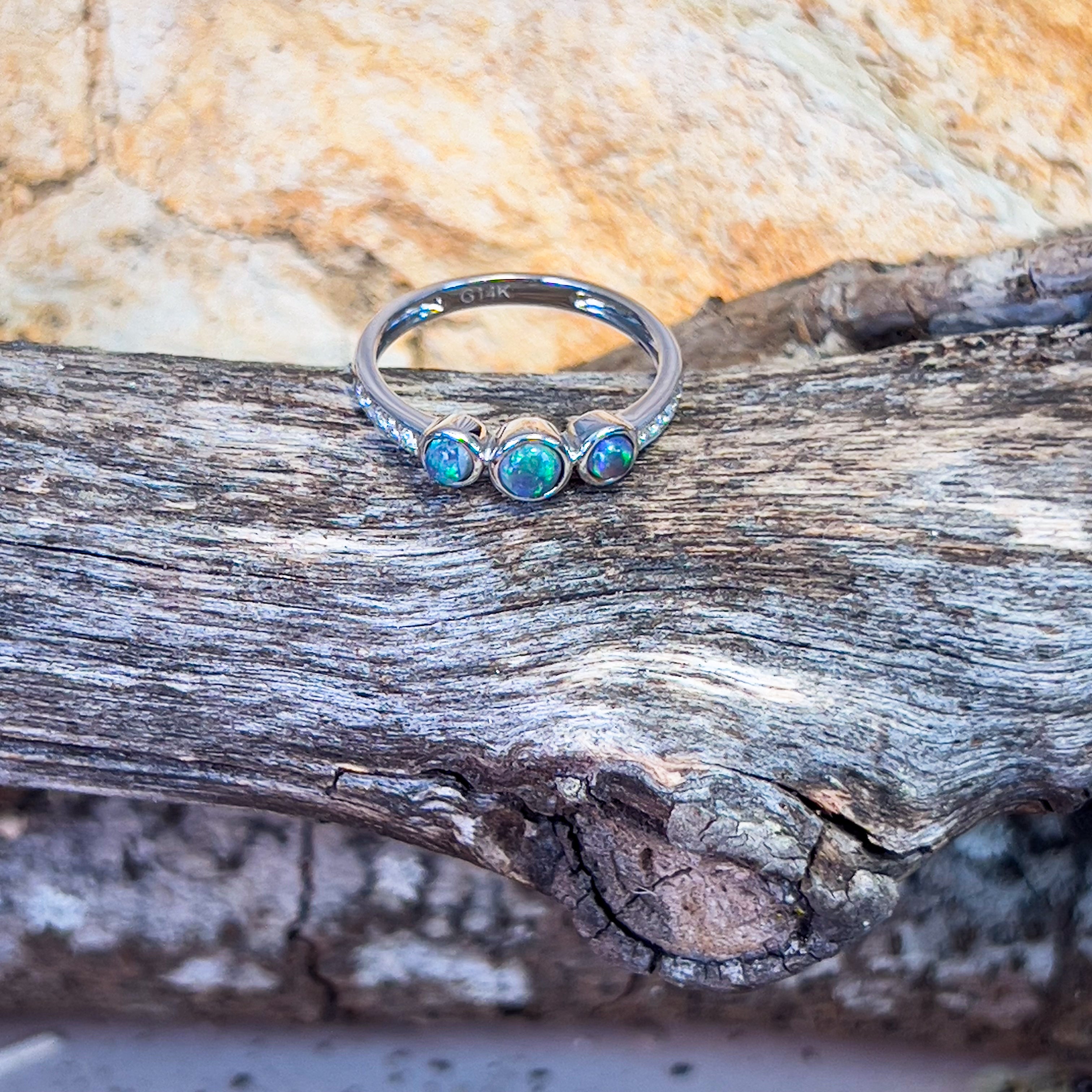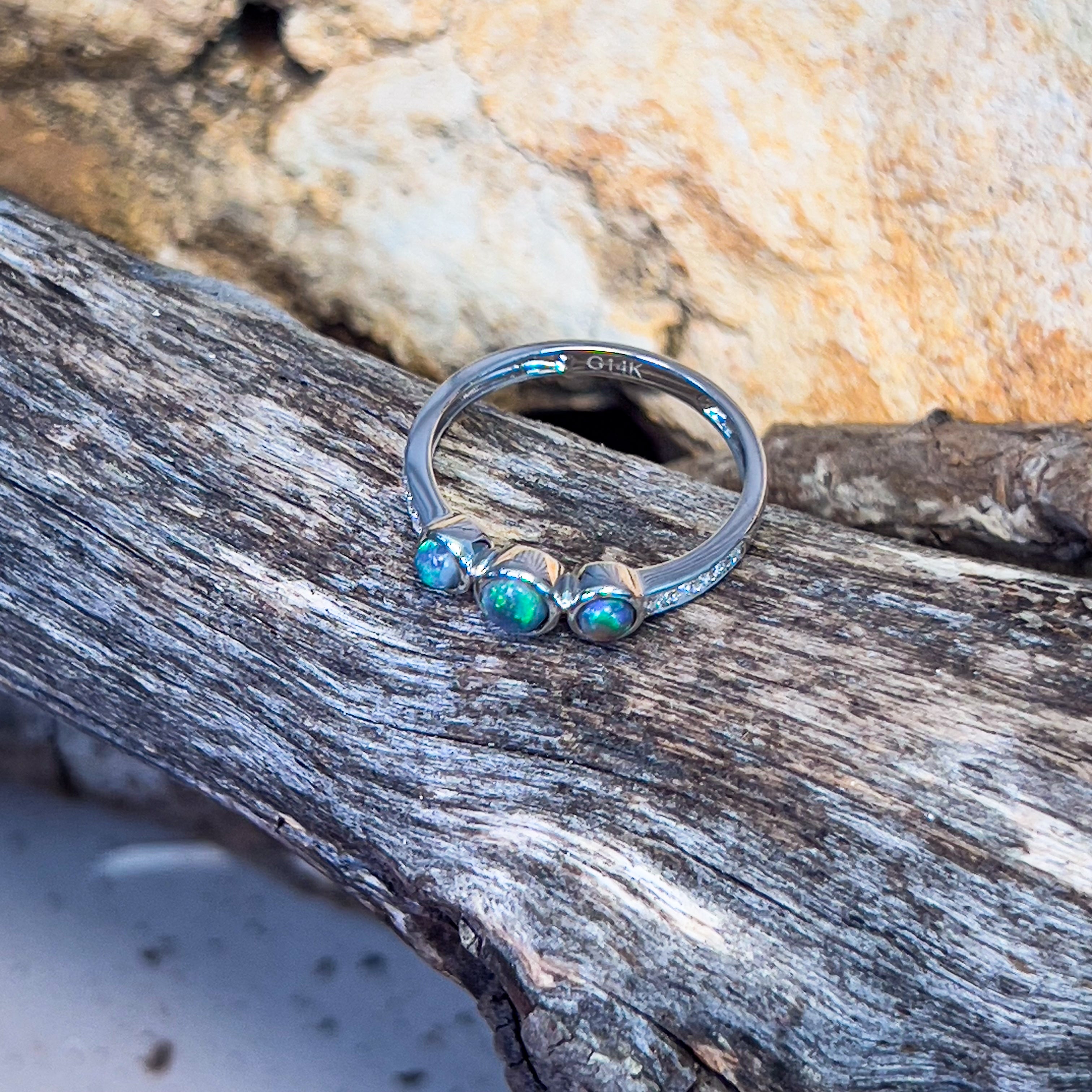 Shine bright with our 14kt White Gold 3 Black Opal and Diamond Ring. This dainty ring features stunning black opals and sparkling diamonds, sure to catch the eye. Stand out in style with this unique piece.