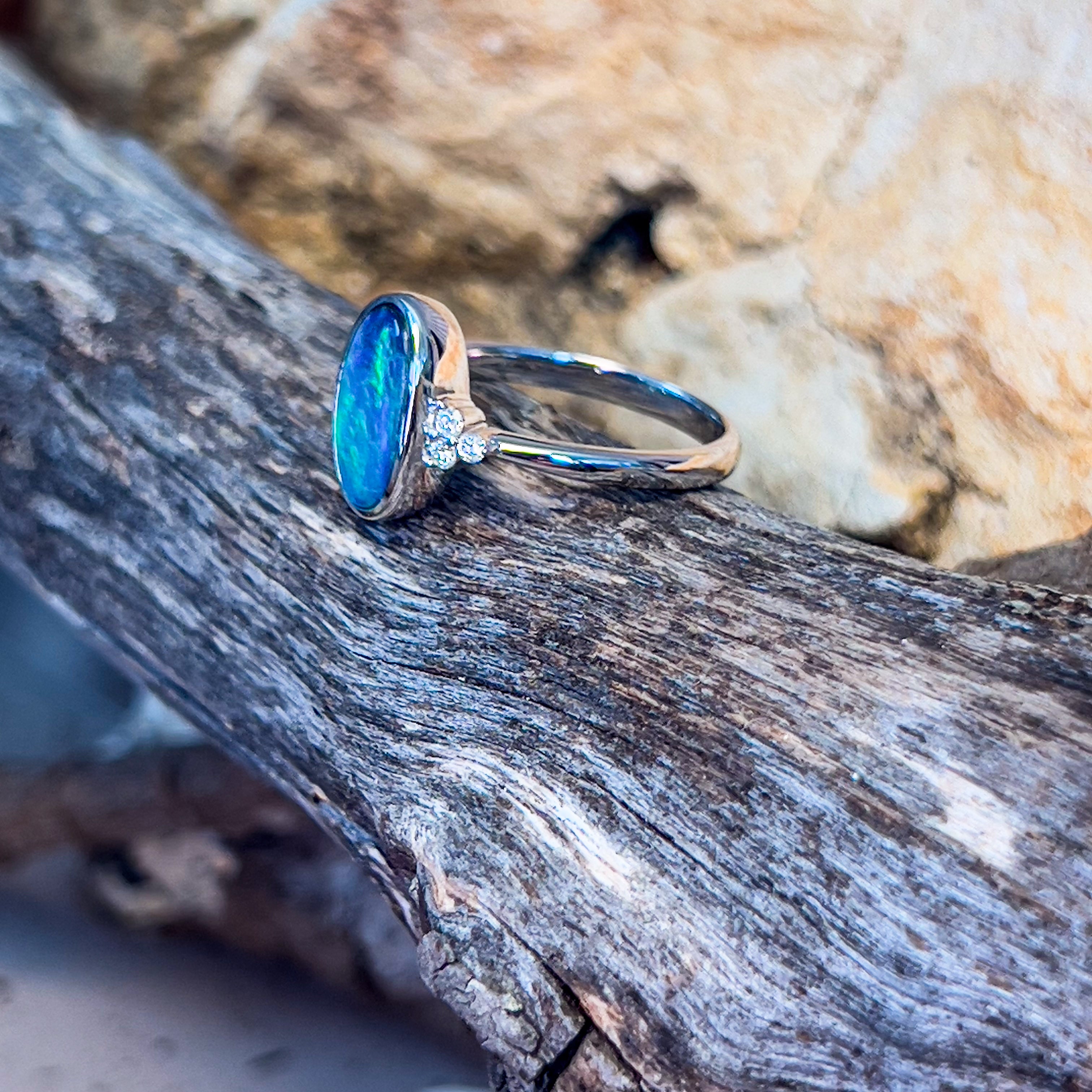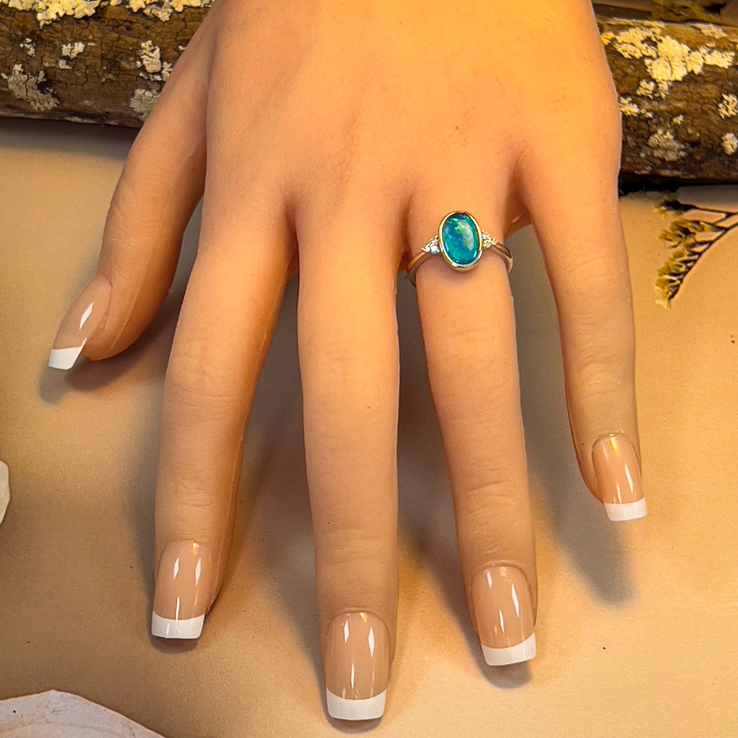 Indulge in the mesmerizing beauty of this 14kt White Gold Black Opal 1.43ct and diamond ring. The colorful and luminous ocean blue and green color play of the opal is sure to captivate your senses. Perfect for an engagement ring, this piece is truly one of a kind.