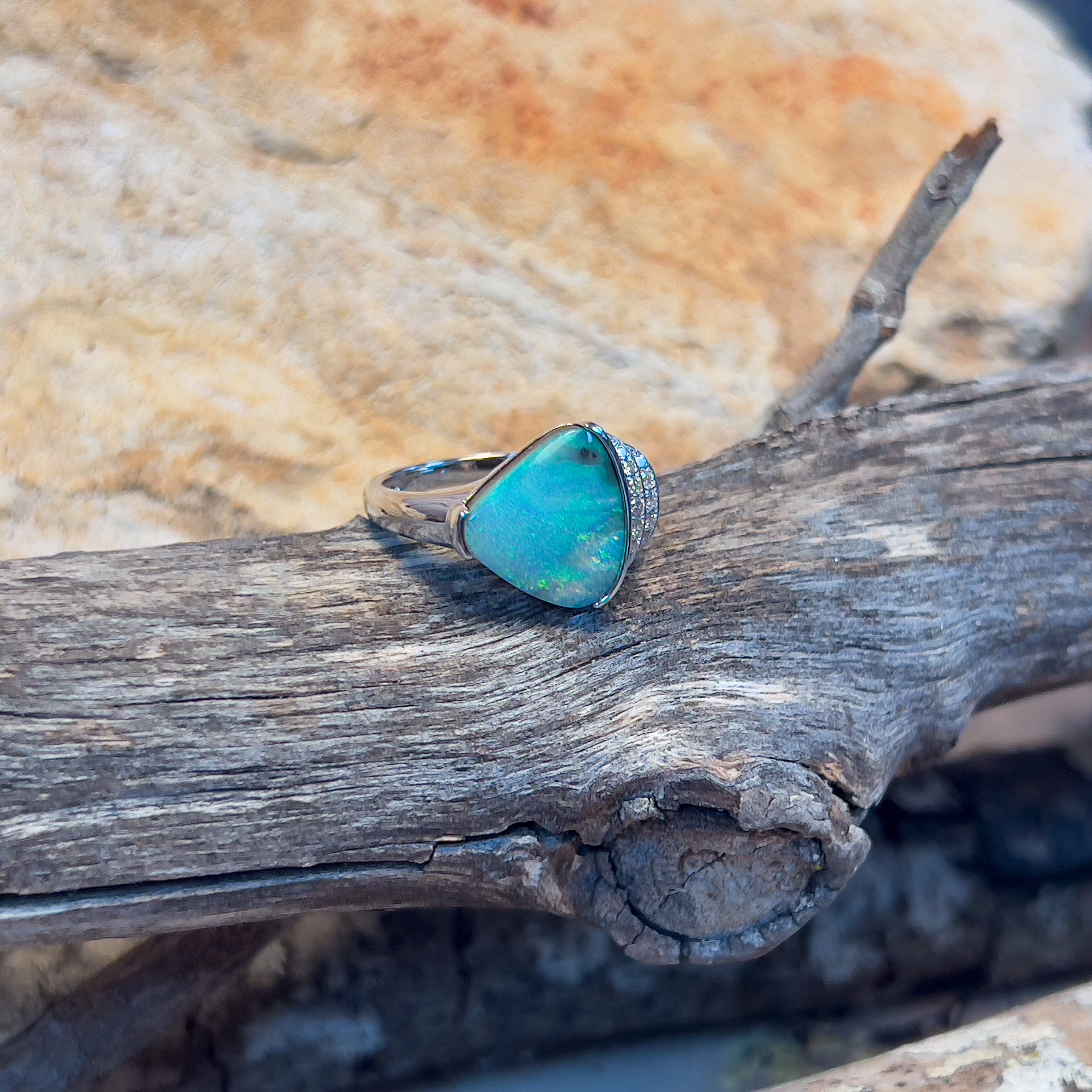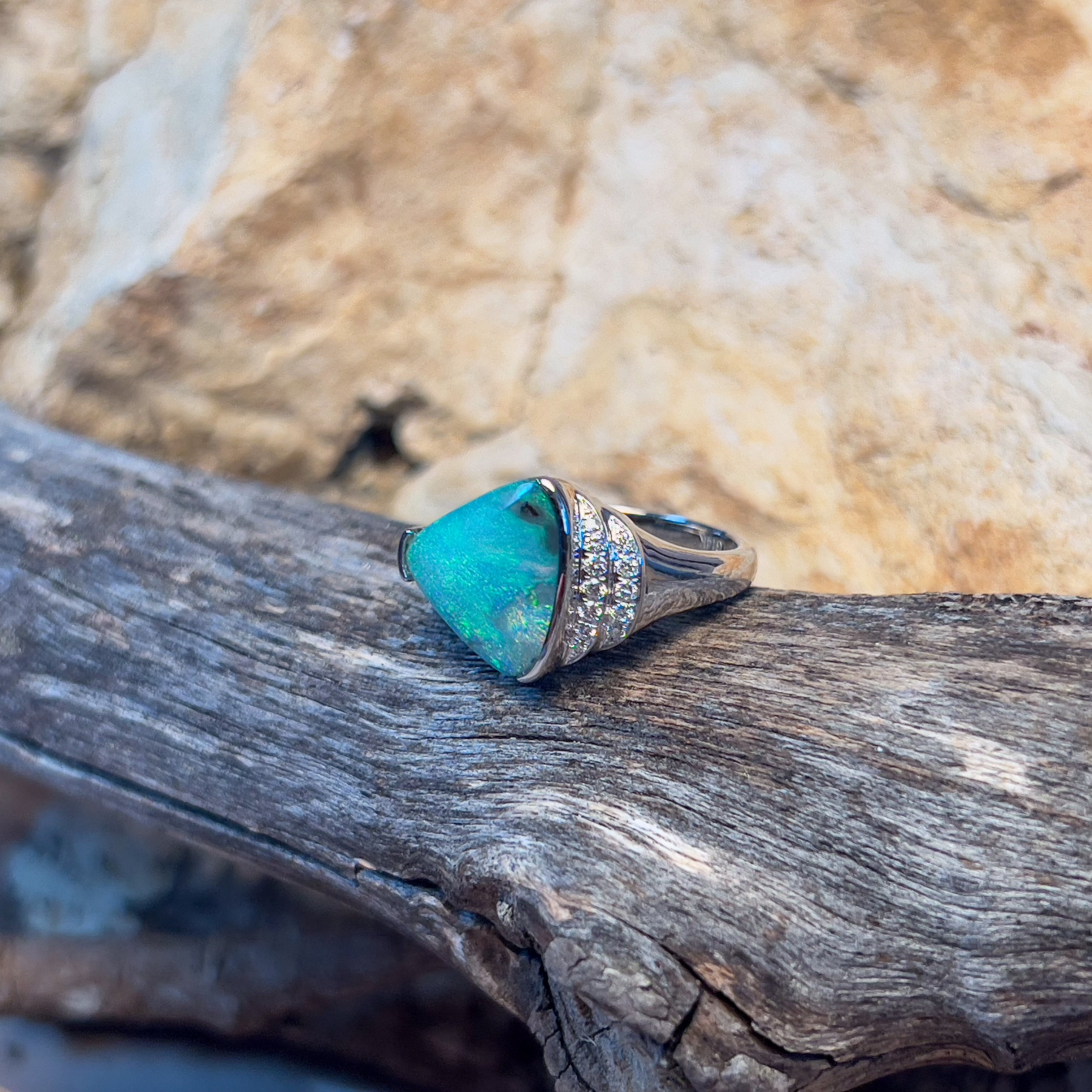 Experience the captivating beauty of our 14kt White Gold Boulder Opal Ring, featuring a stunning 3.9ct aqua blue Queensland Boulder opal. Surrounded by sparkling diamonds, this opal jewellery piece exudes elegance and charm. Elevate any outfit with the mesmerizing colors of this unique gemstone.
