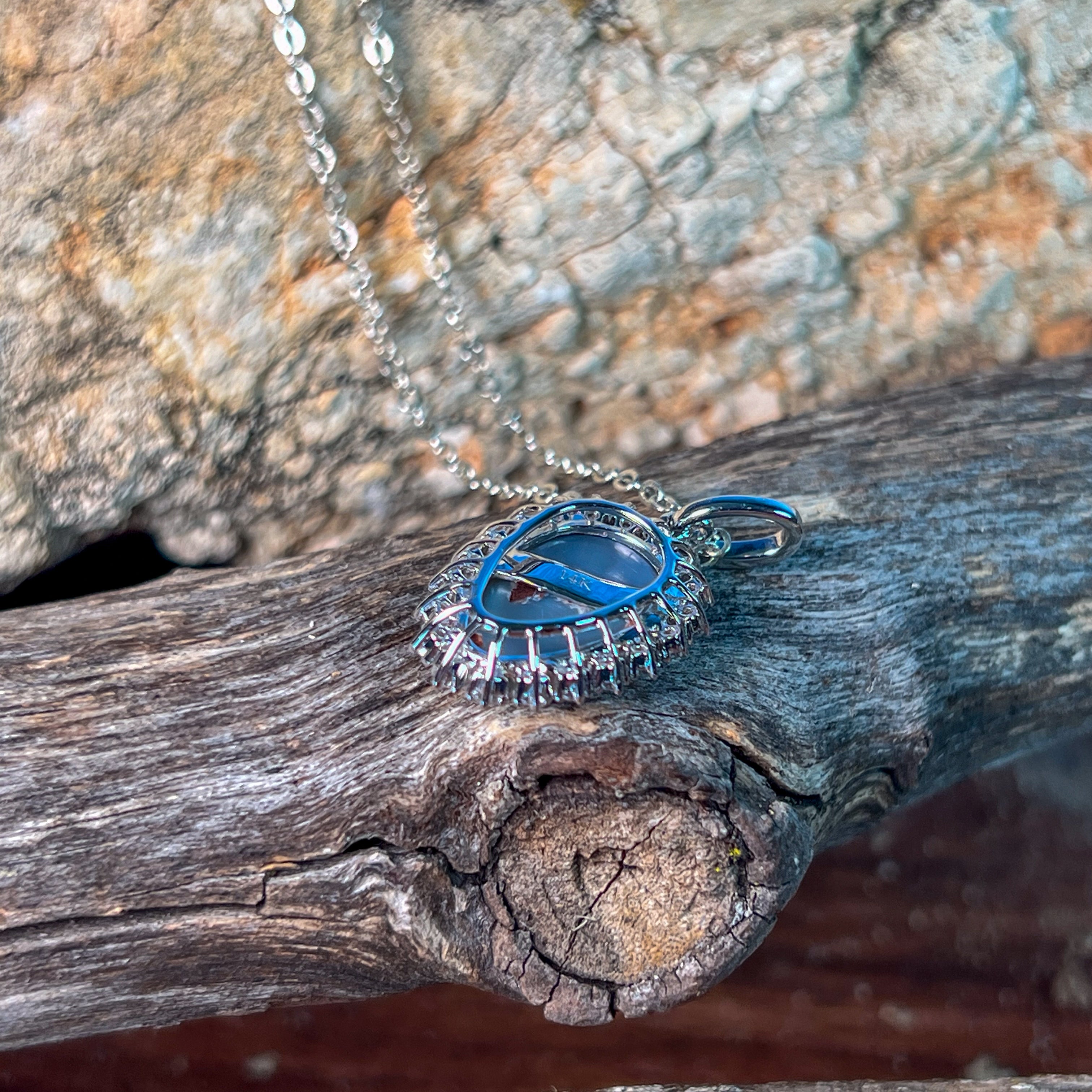 This exquisite 14kt white gold cluster ring showcases a stunning 3.68ct black opal in a graceful teardrop shape, surrounded by vibrant sapphires. The deep play of colors in the black opal catches the light beautifully, while the sapphires add a rich contrast that enhances its fiery allure. Perfect for those seeking a unique statement piece, this ring blends elegance with bold sophistication. Elevate your collection with this captivating design that highlights the rare beauty of Australian opals and fine gemstones.