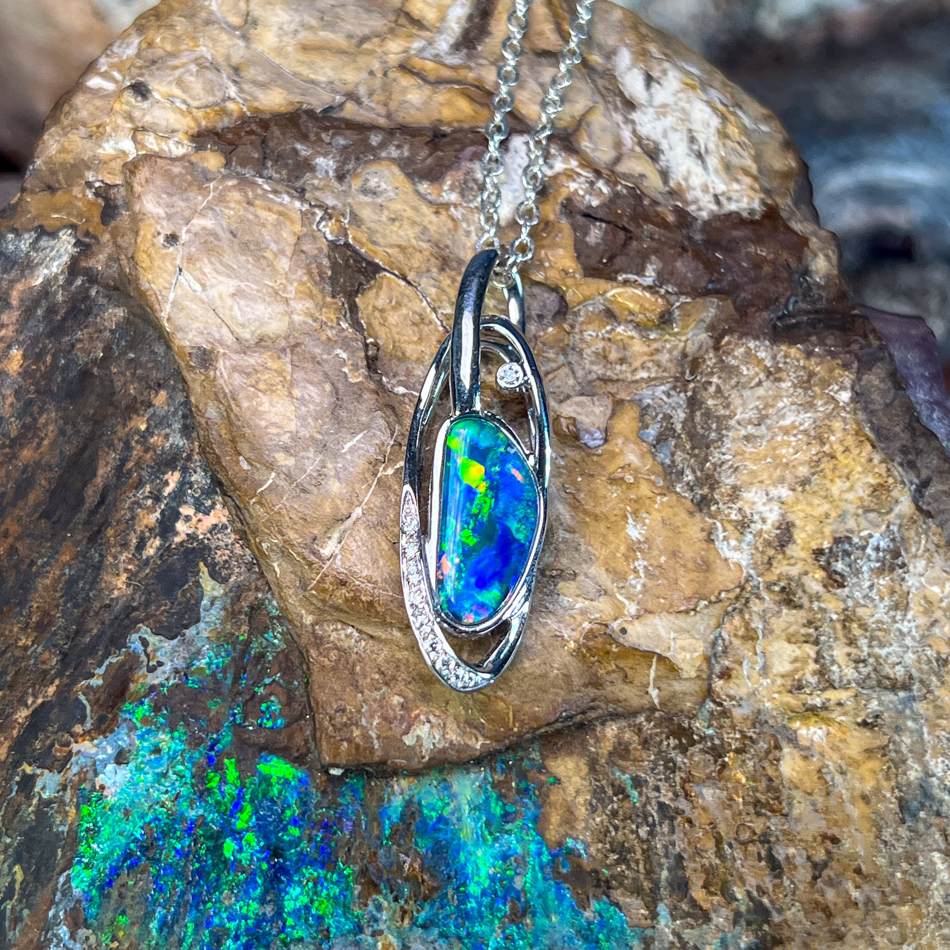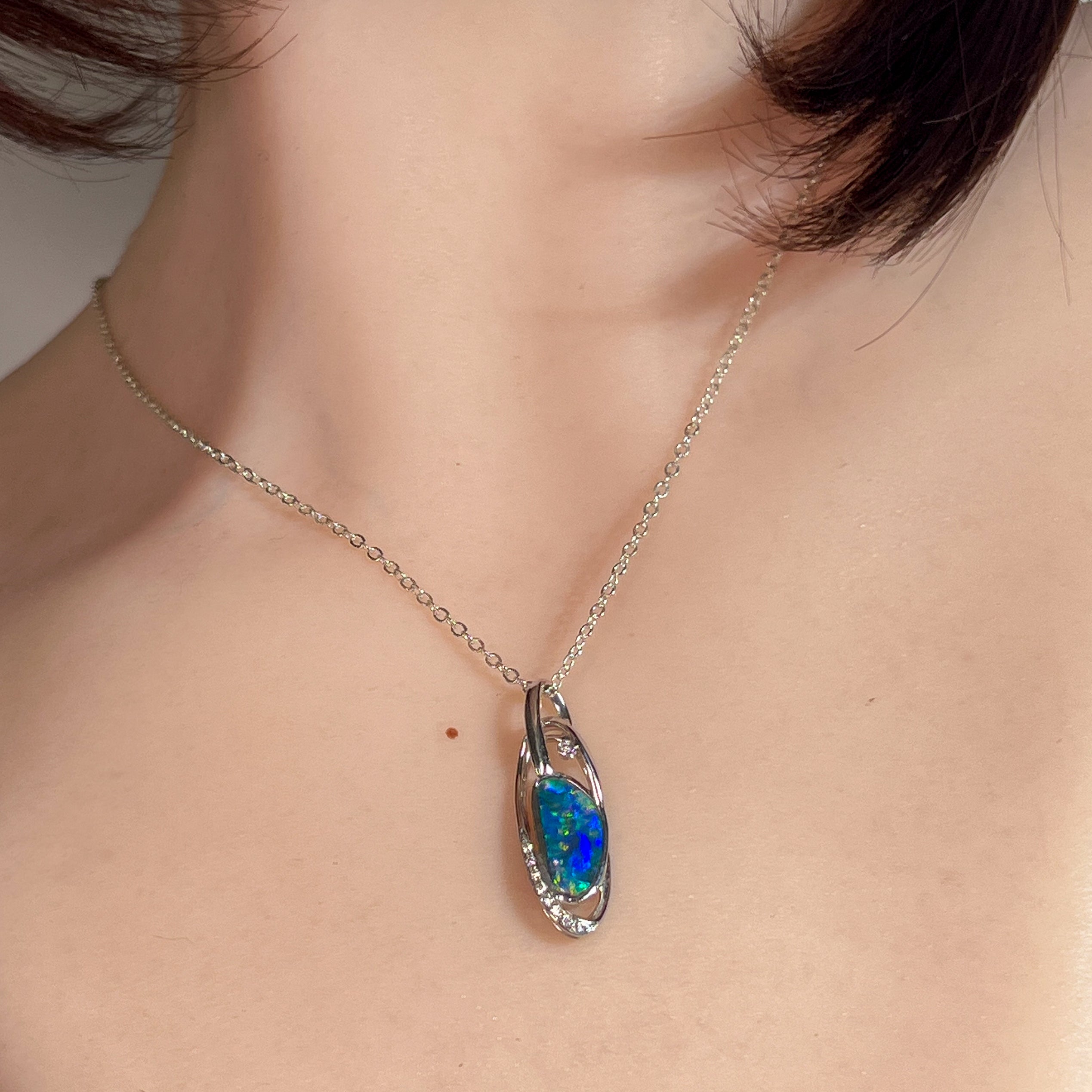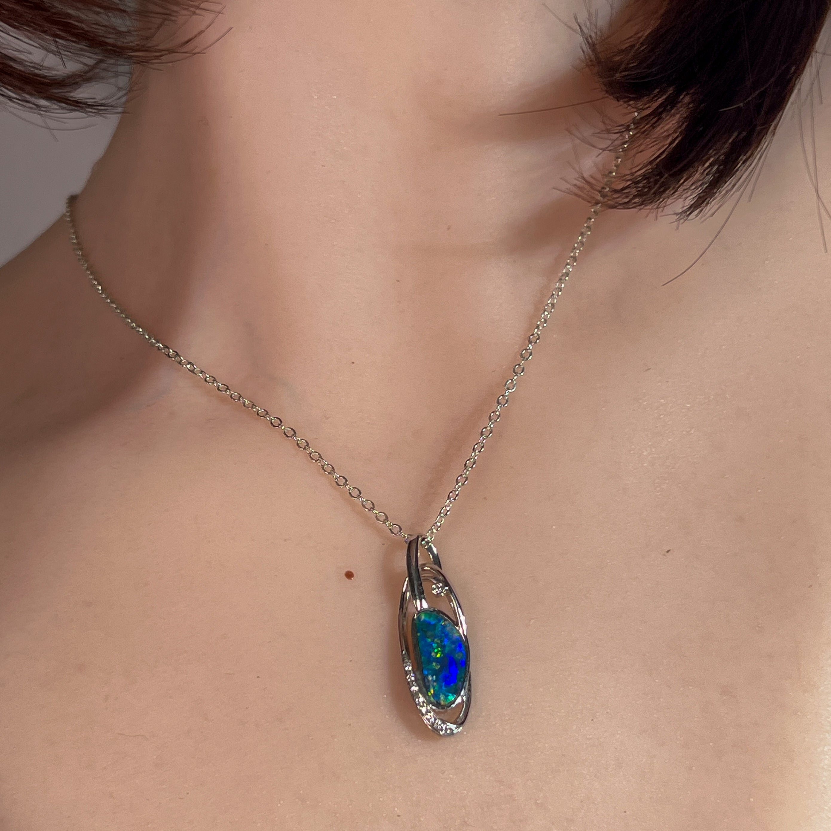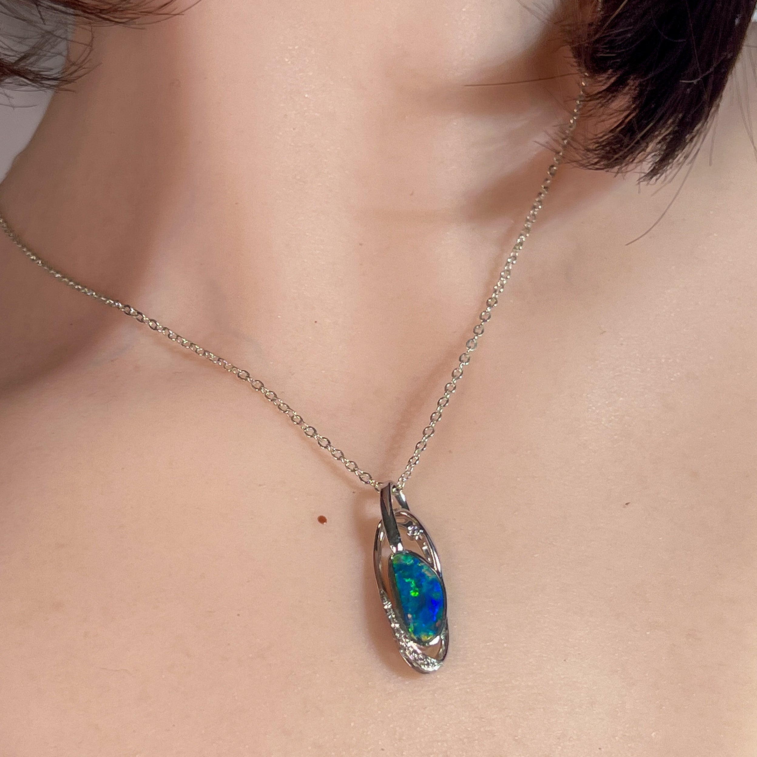 Indulge in the luxury of our 14kt White Gold Opal Necklace, a modern and elegant design featuring a breathtaking freeform opal doublet, accented with sparkling diamonds. A perfect statement piece for the sophisticated and exclusive woman. Elevate your style with this exquisite opal necklace.