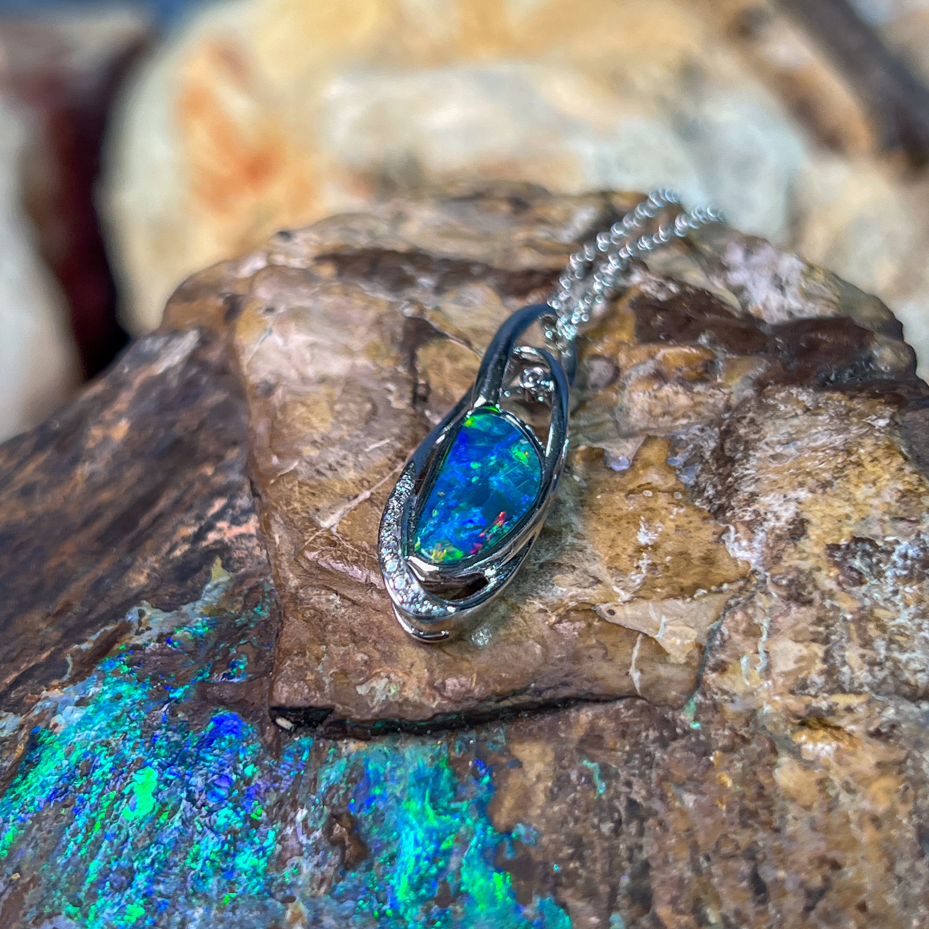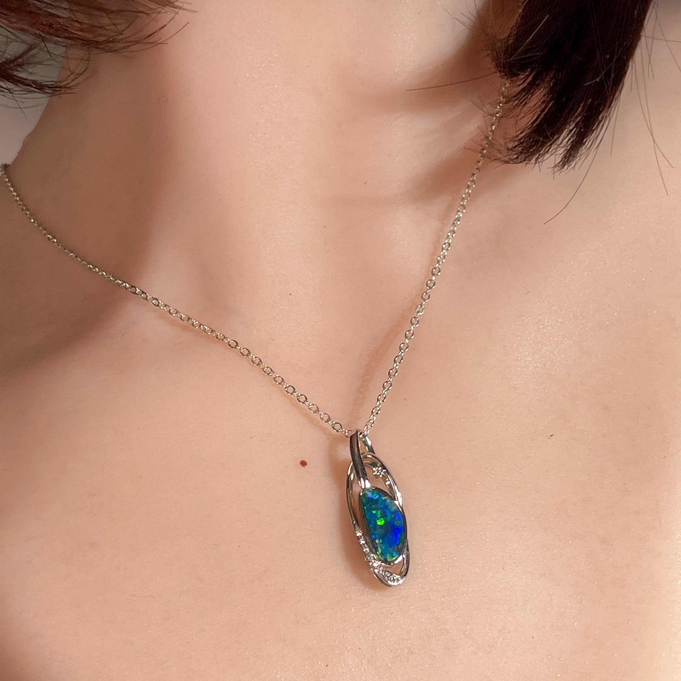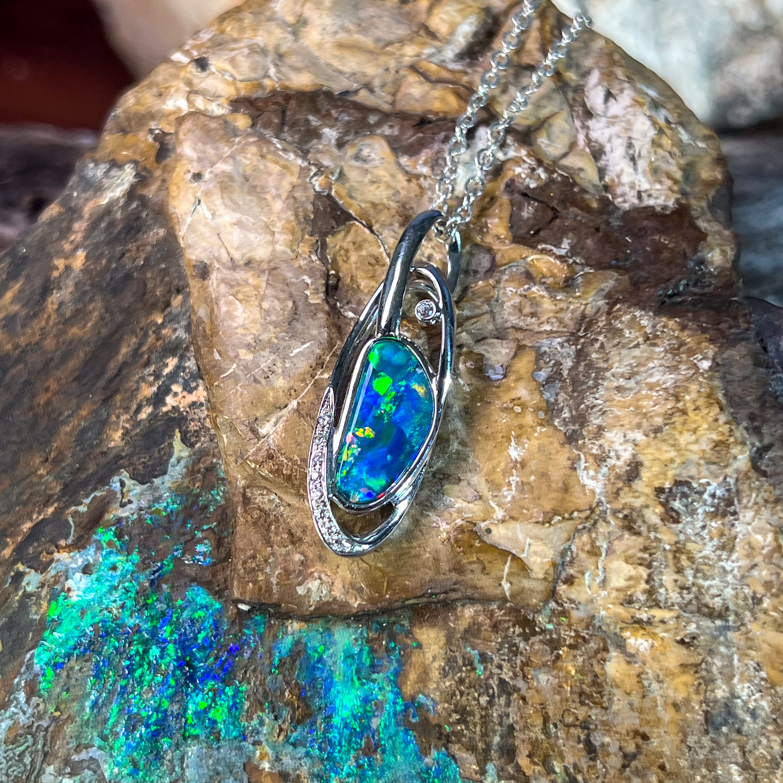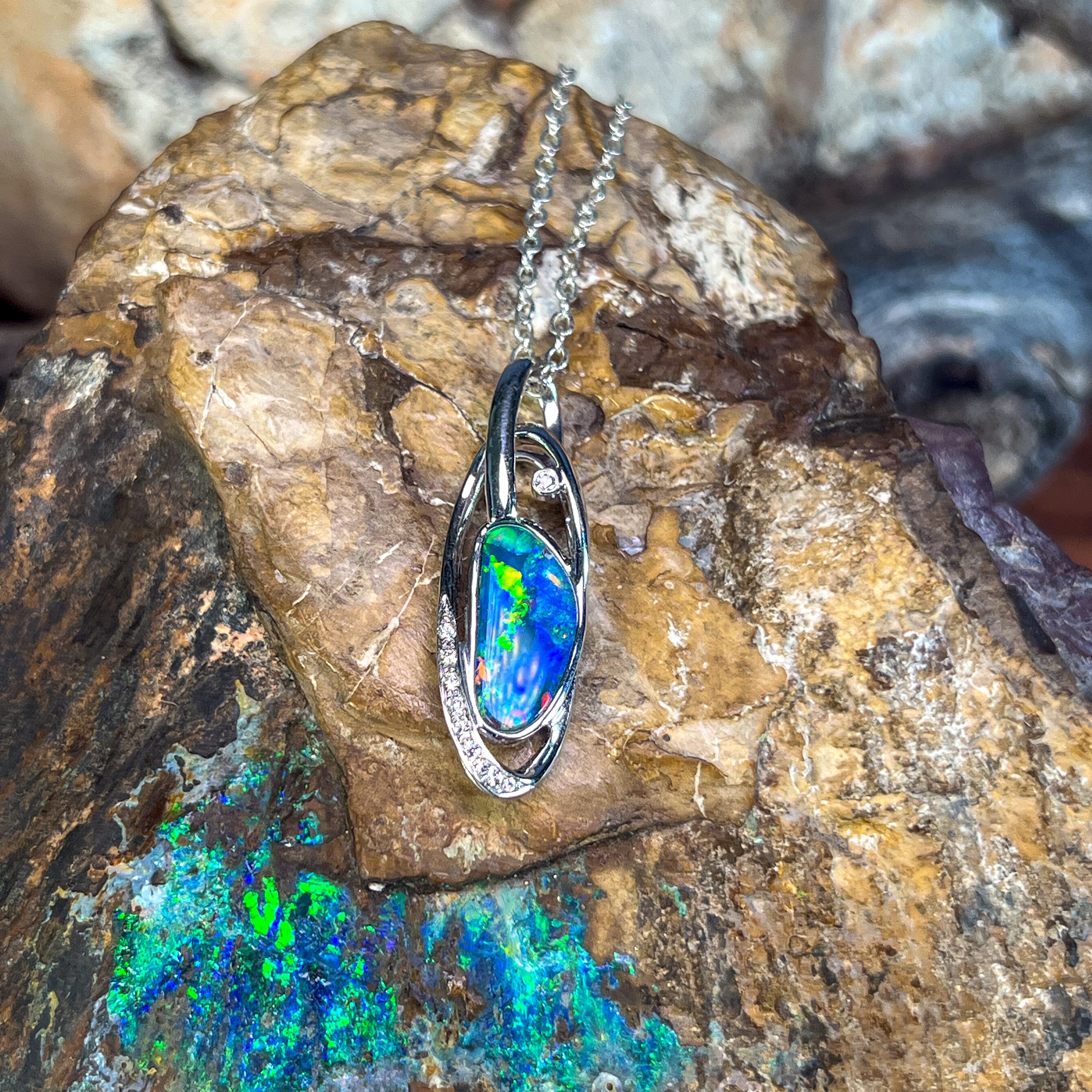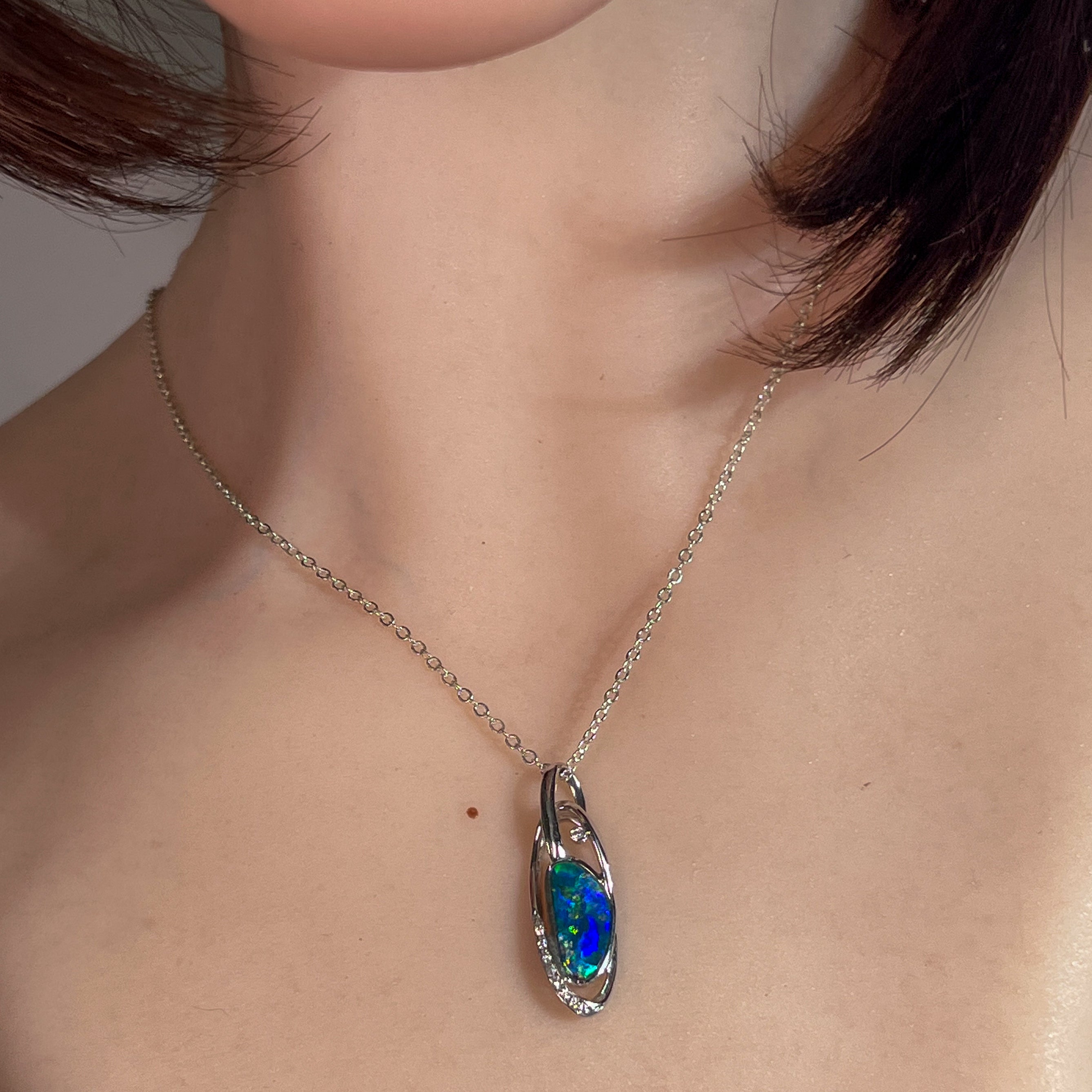 Indulge in the luxury of our 14kt White Gold Opal Necklace, a modern and elegant design featuring a breathtaking freeform opal doublet, accented with sparkling diamonds. A perfect statement piece for the sophisticated and exclusive woman. Elevate your style with this exquisite opal necklace.