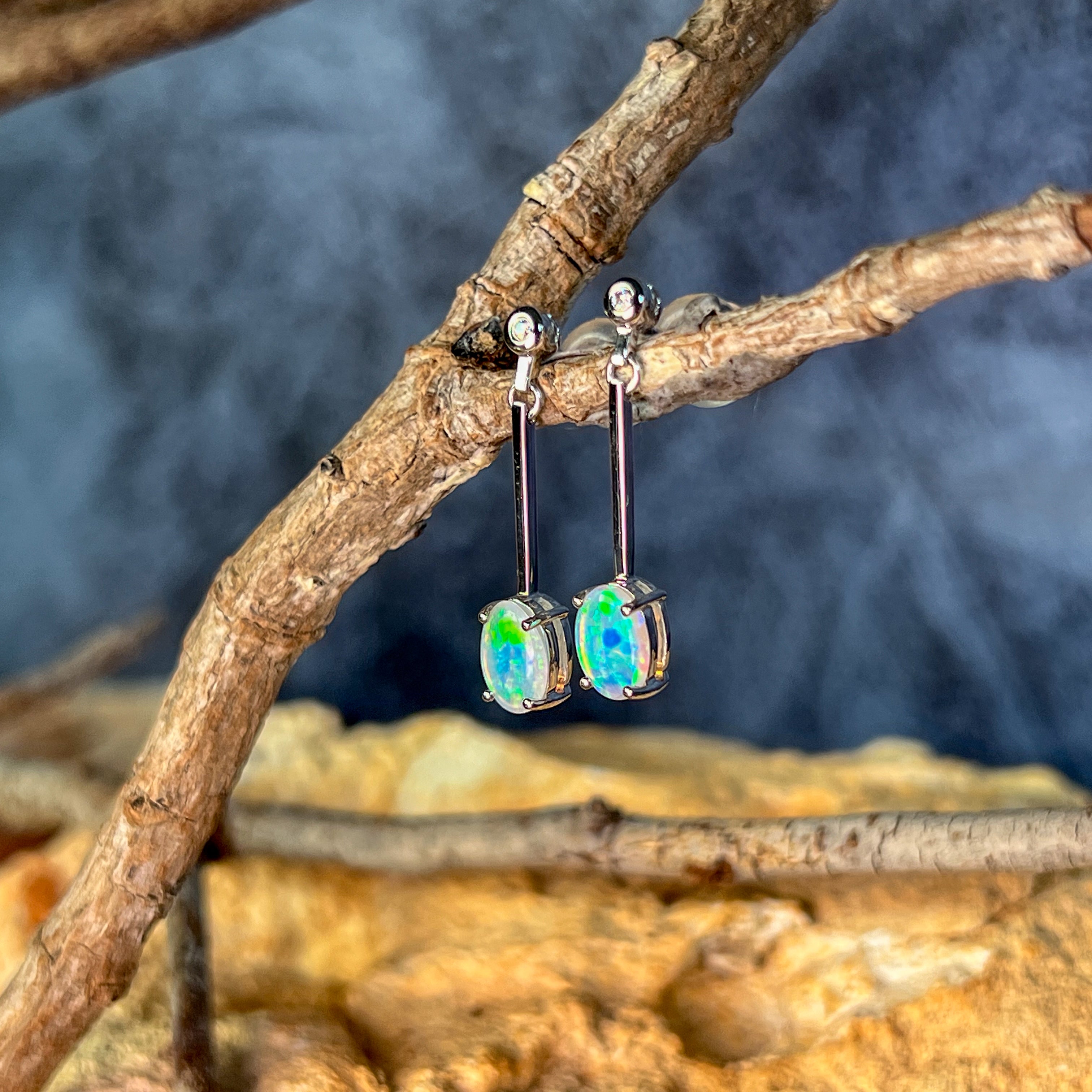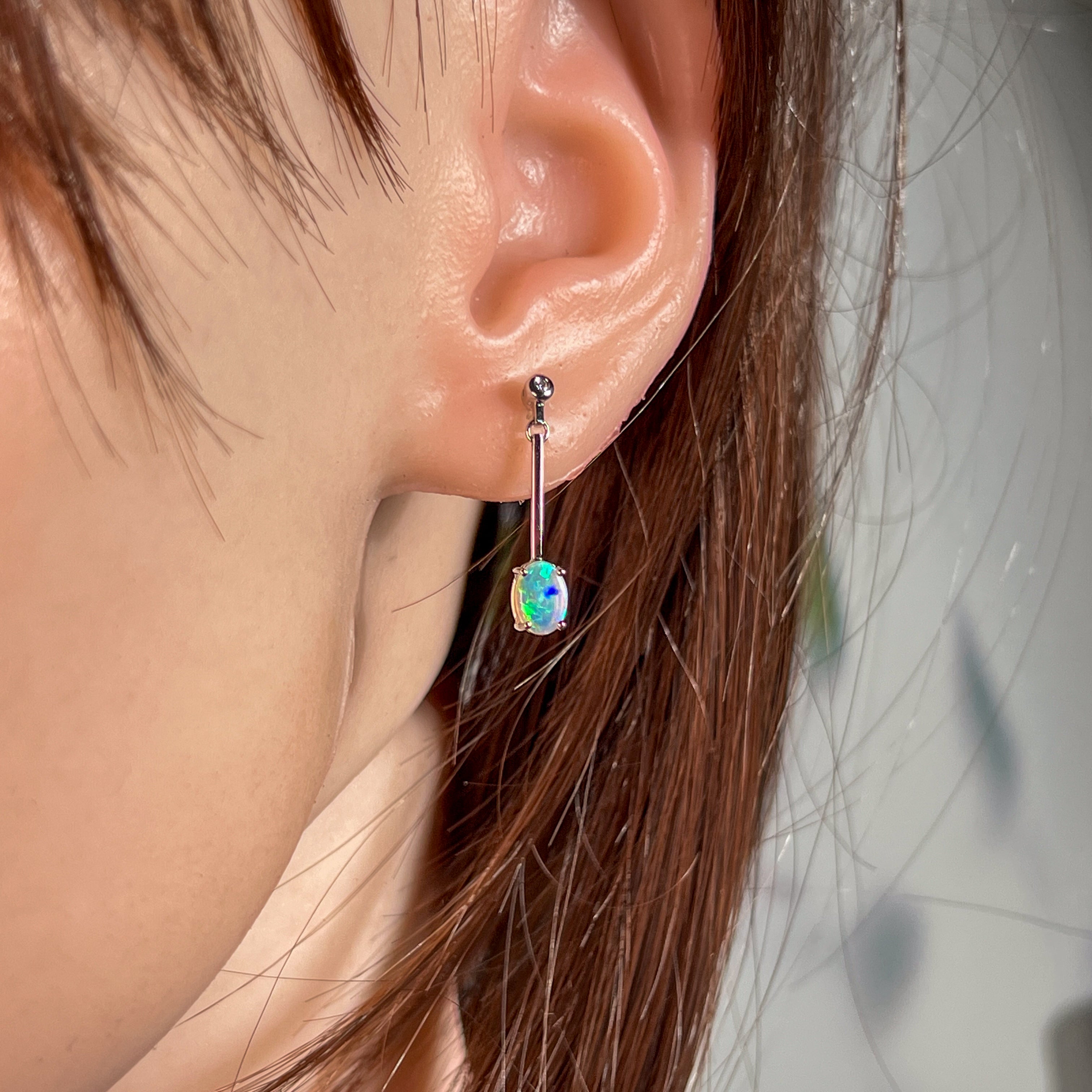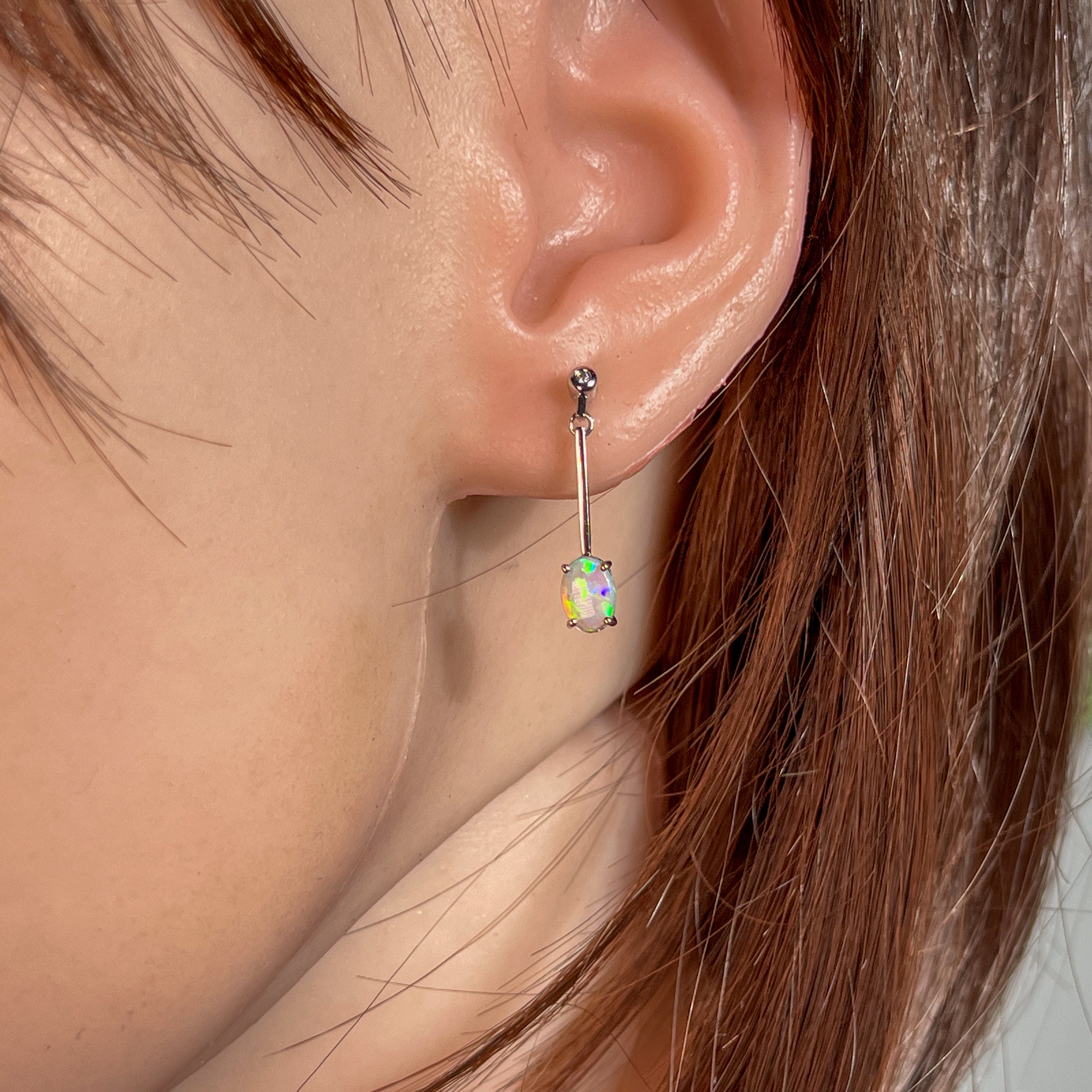 Enhance your style with our stunning 14kt White Gold long bar drop style Crystal Opal earrings. The opal dangle earrings are the perfect gift for her, adding a touch of elegance and charm to any outfit. Elevate your look and show off your unique sense of fashion with these beautiful earrings.