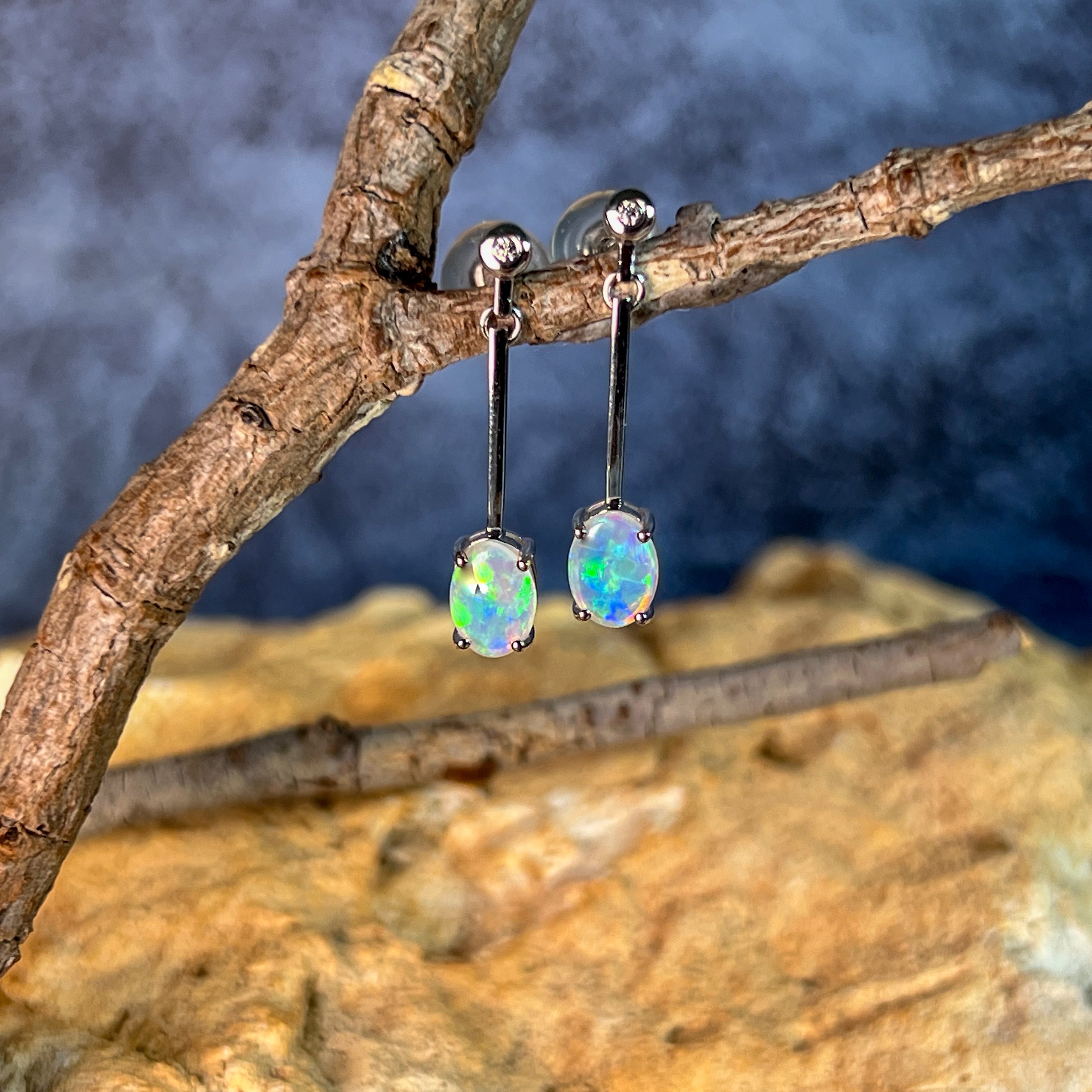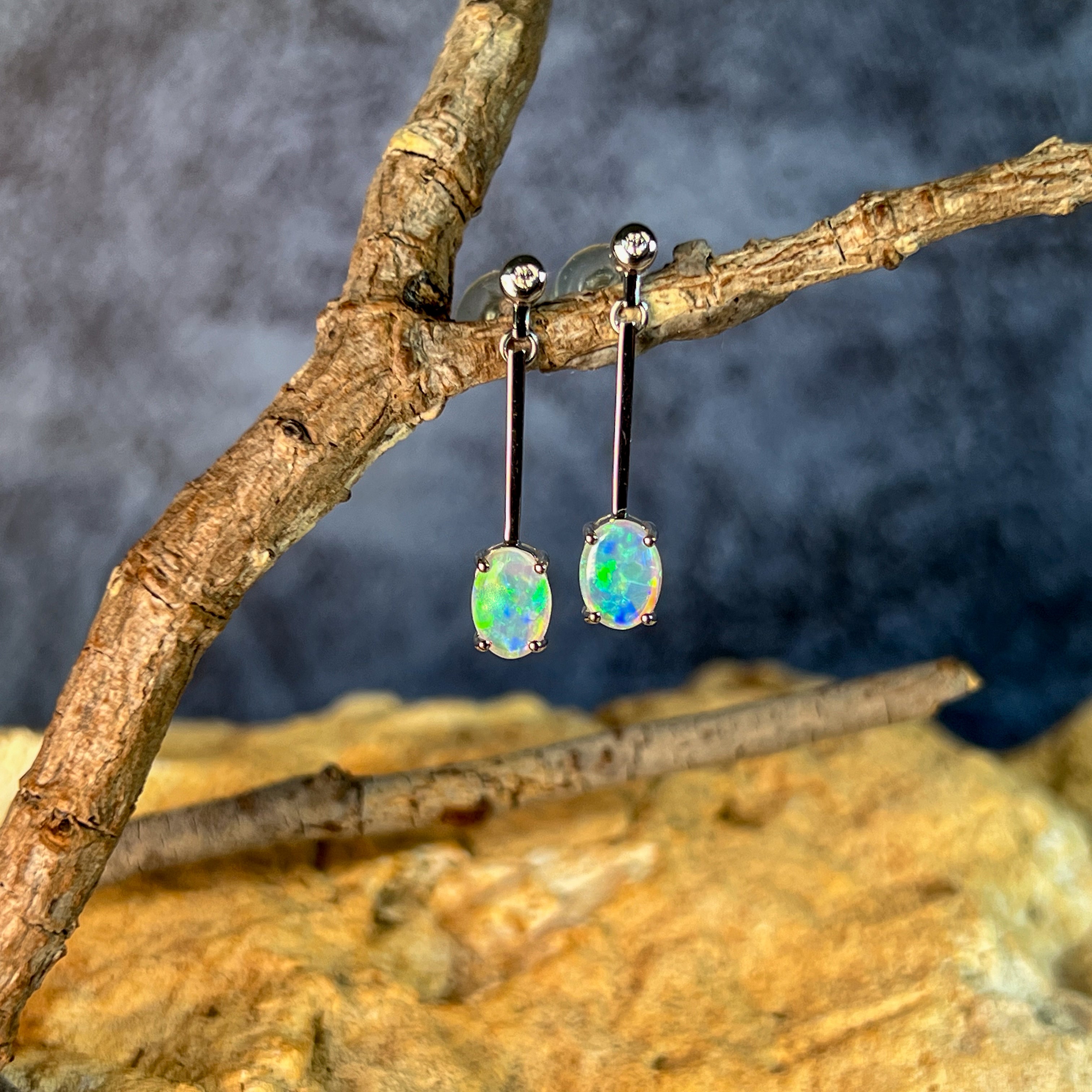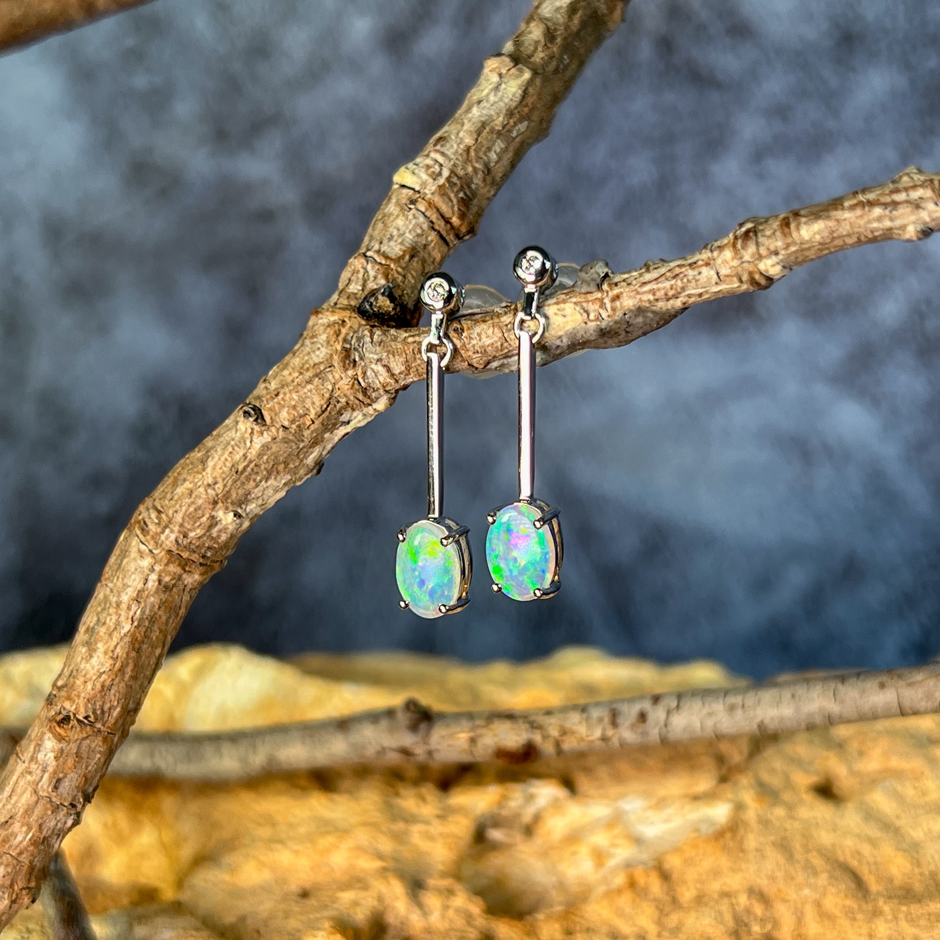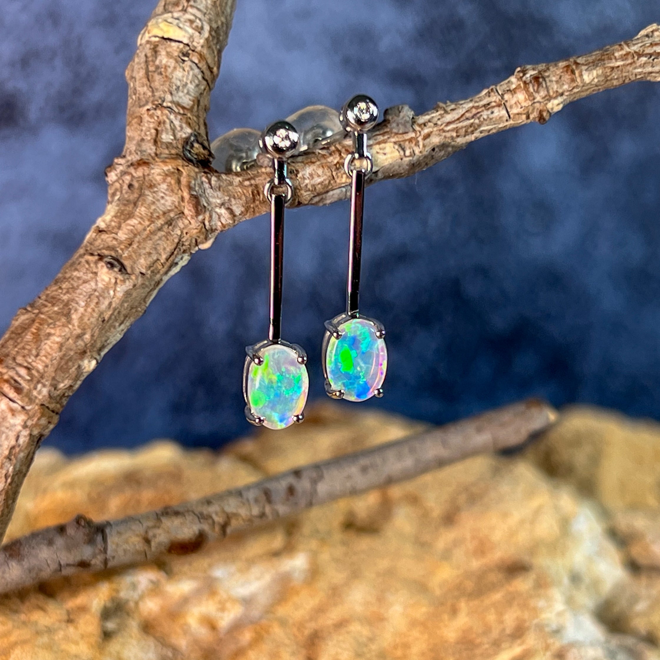 Enhance your style with our stunning 14kt White Gold long bar drop style Crystal Opal earrings. The opal dangle earrings are the perfect gift for her, adding a touch of elegance and charm to any outfit. Elevate your look and show off your unique sense of fashion with these beautiful earrings.