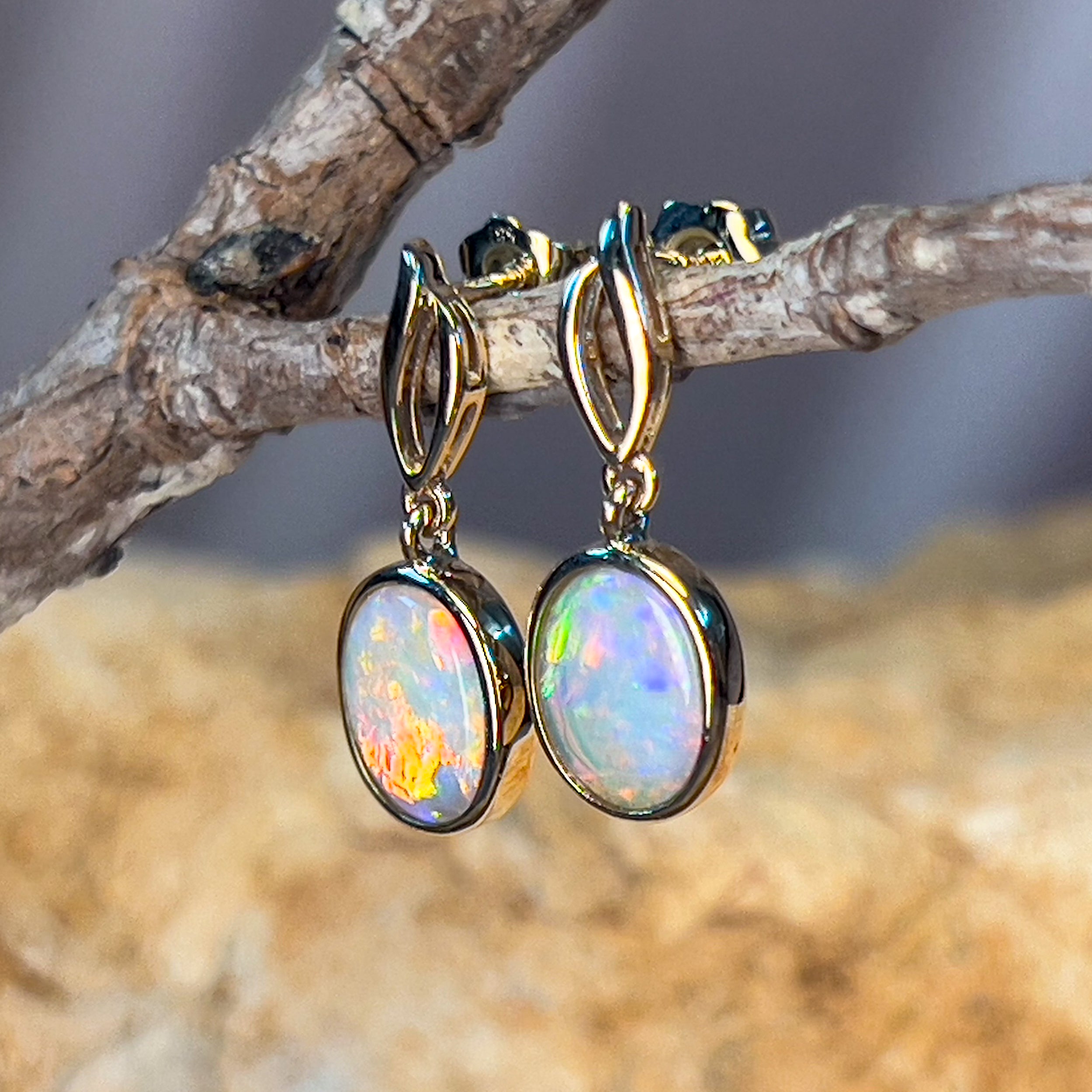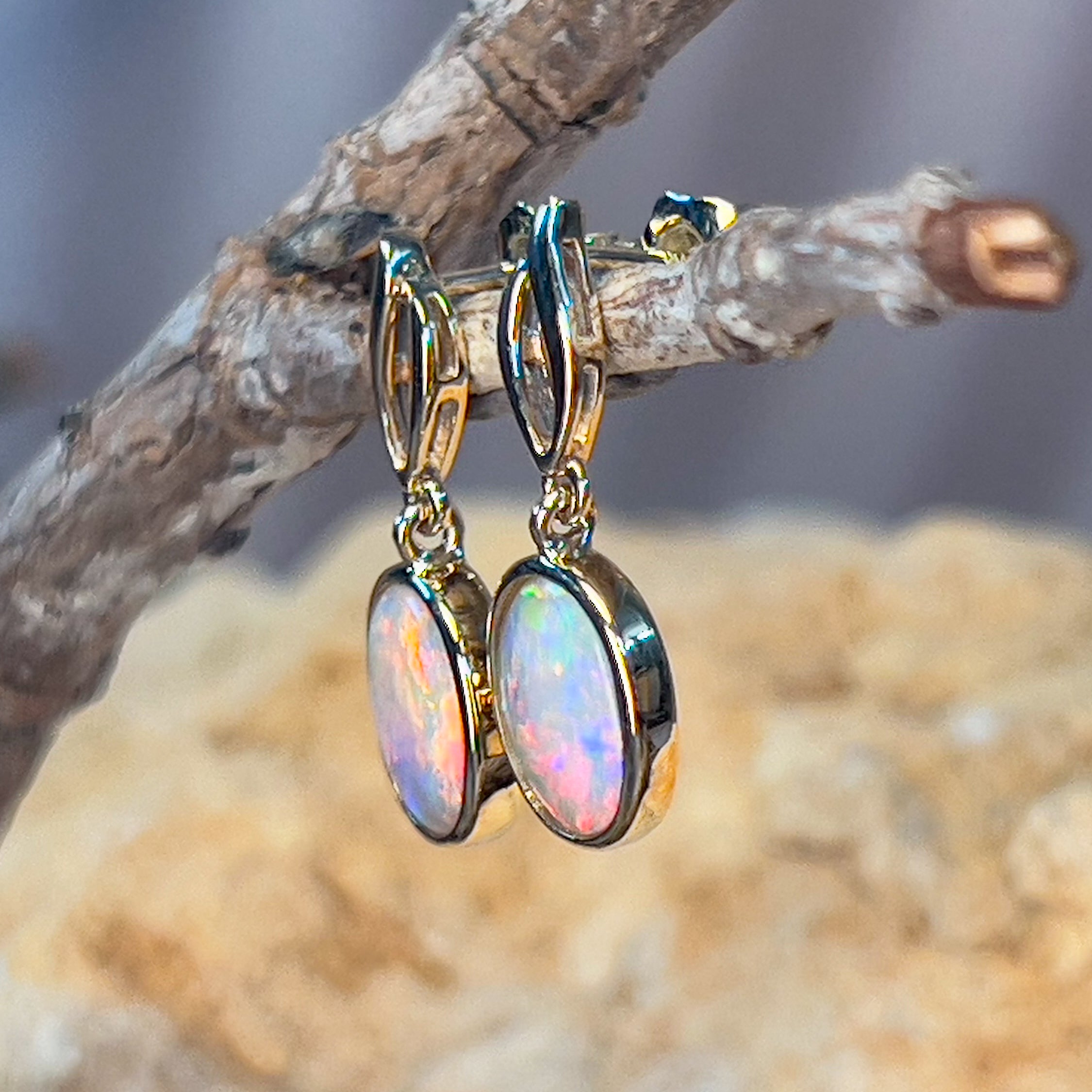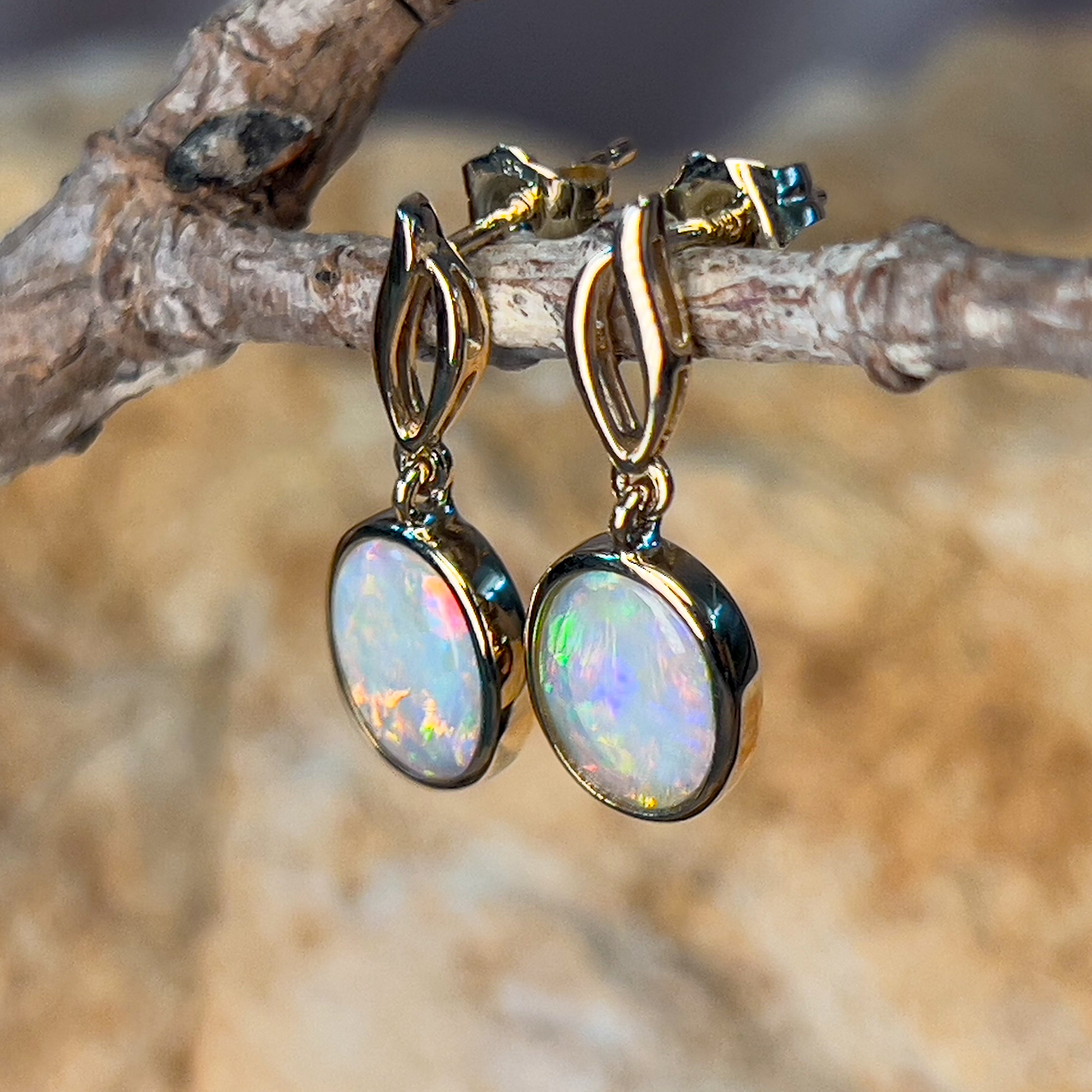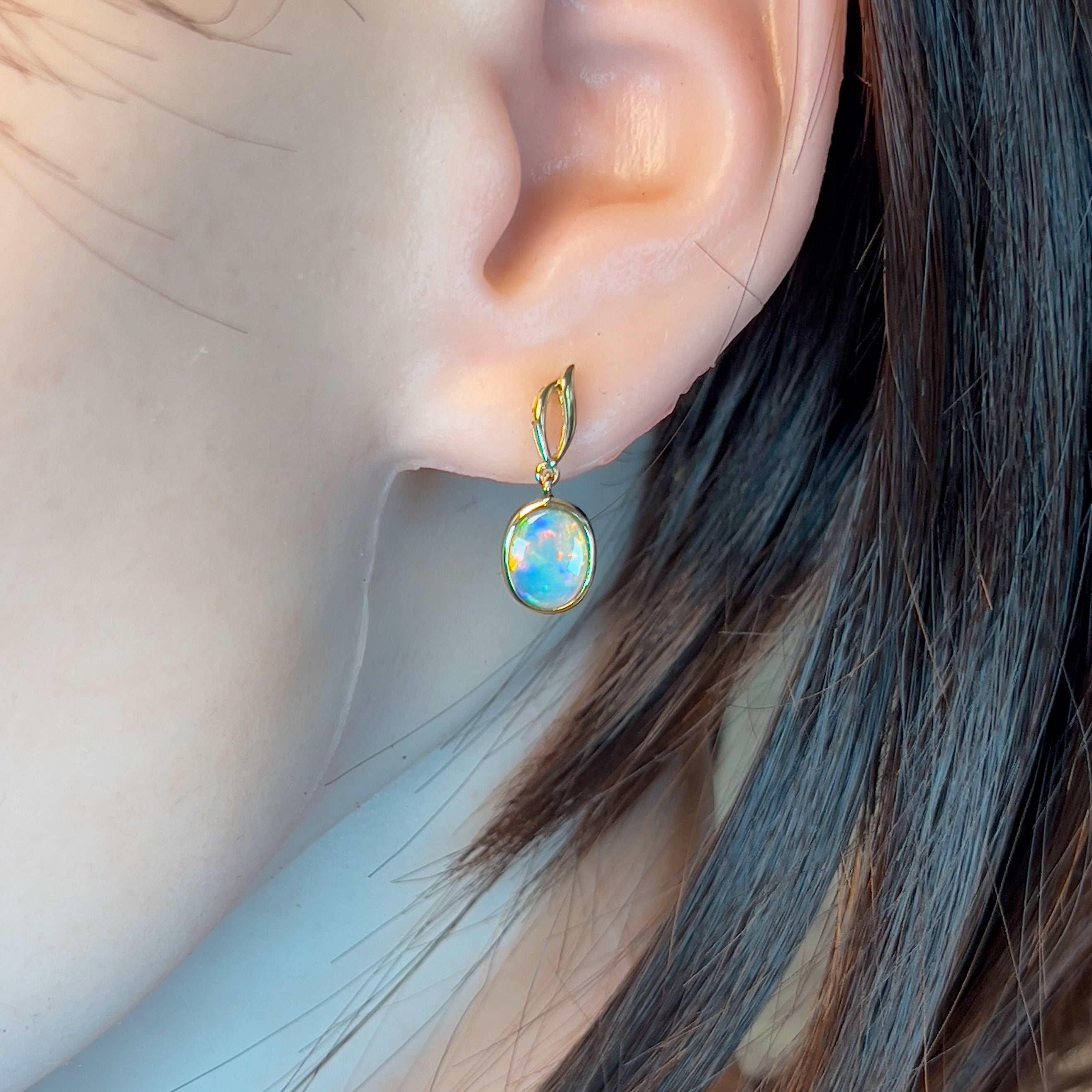 These beautiful 14kt Yellow Gold dangling Oval shape earrings are the perfect addition to your opal jewellery collection. The opal stones add a touch of elegance and the delicate gold drop design will elevate any outfit. A must-have for any fashion-conscious individual looking for a classic yet unique piece of jewellery.