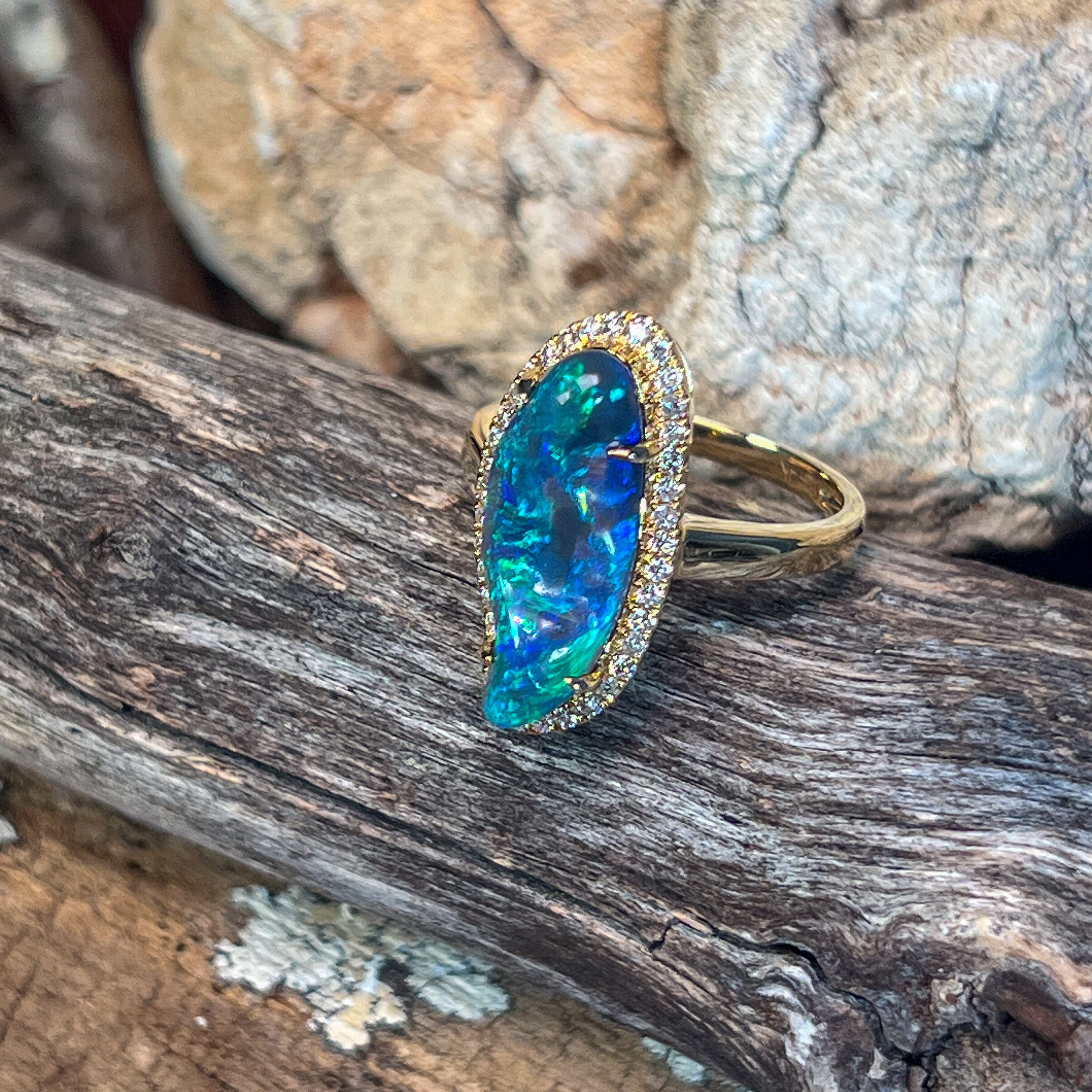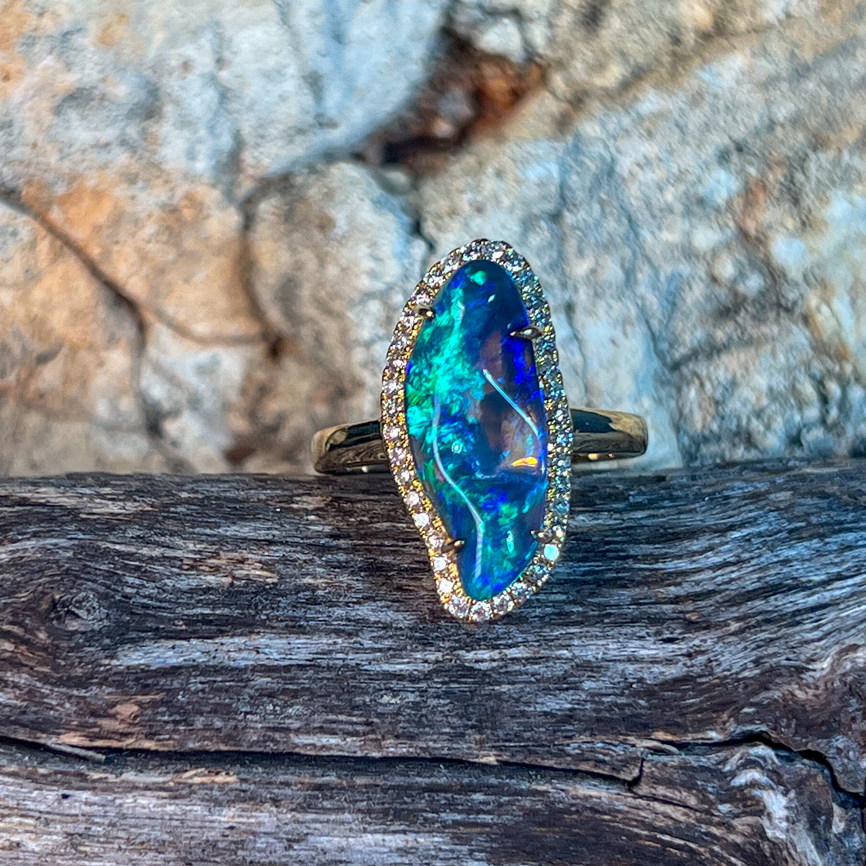 14kt Yellow Gold freeform Black Opal 2.73ct and diamond ring