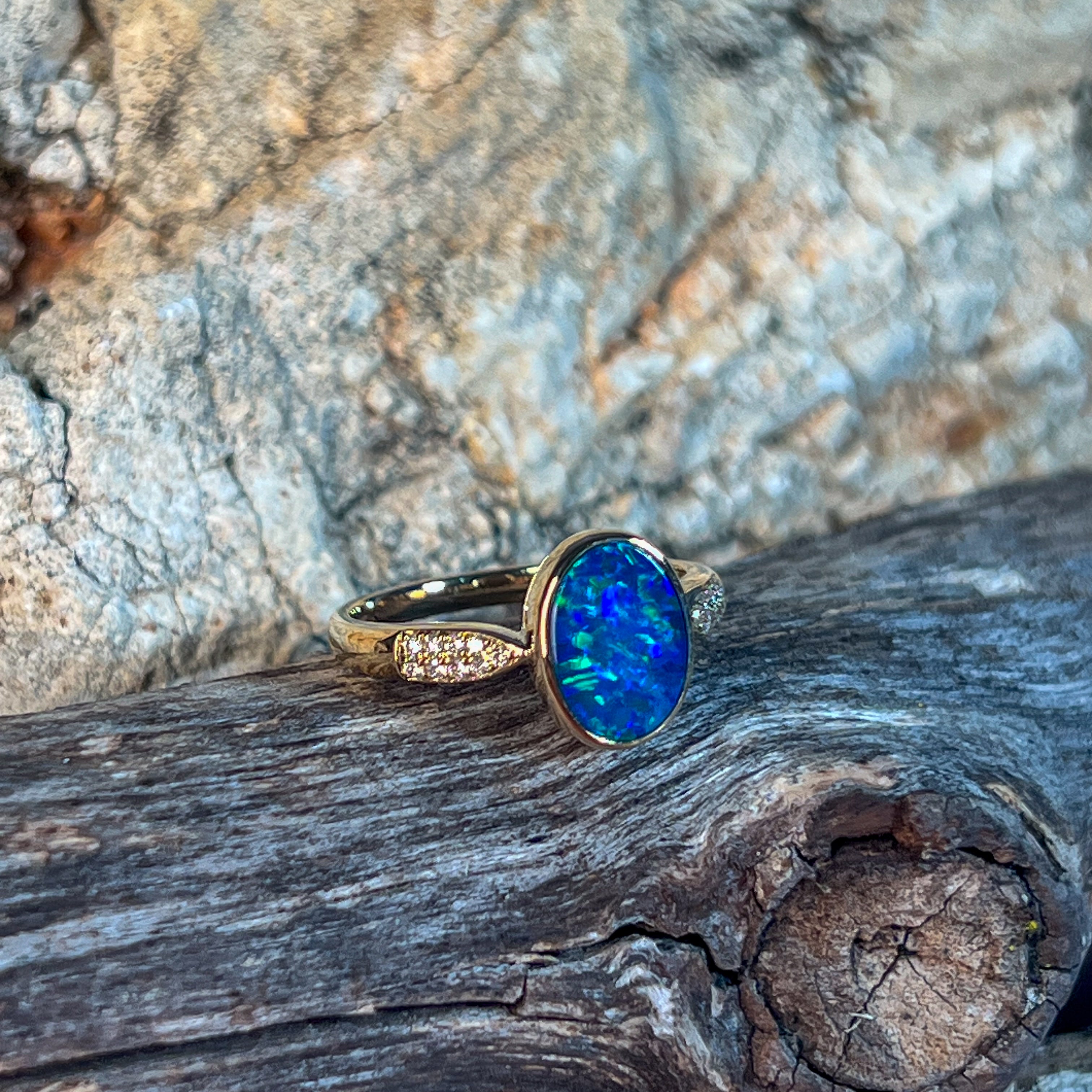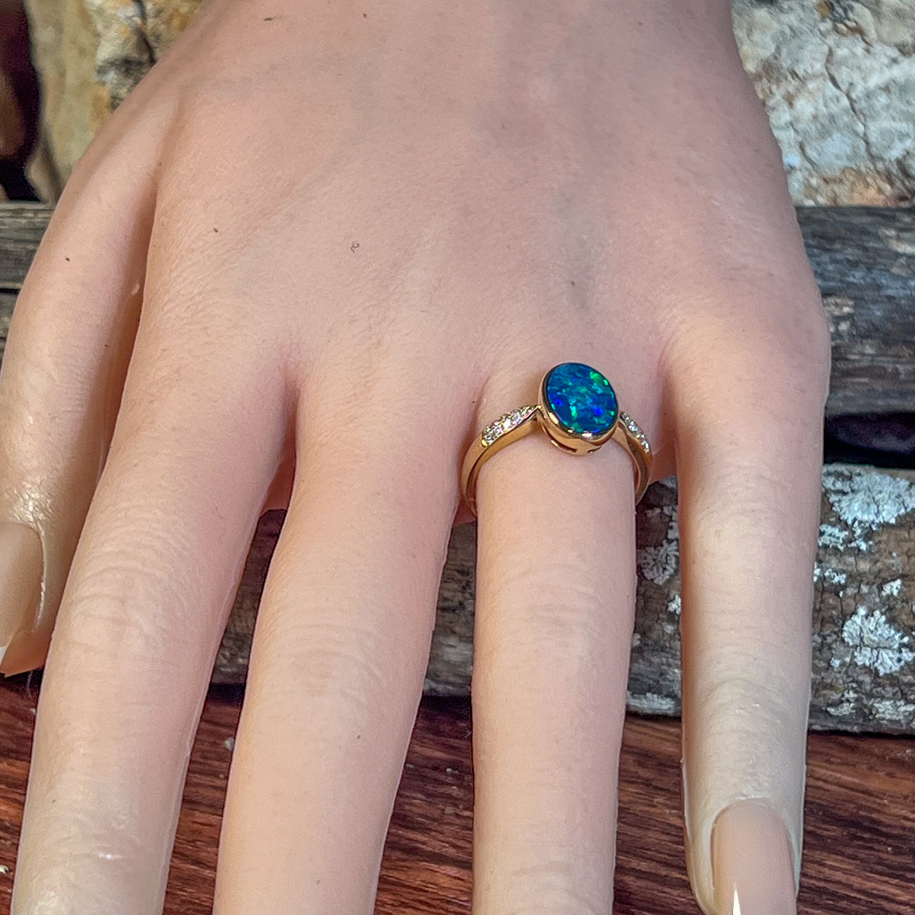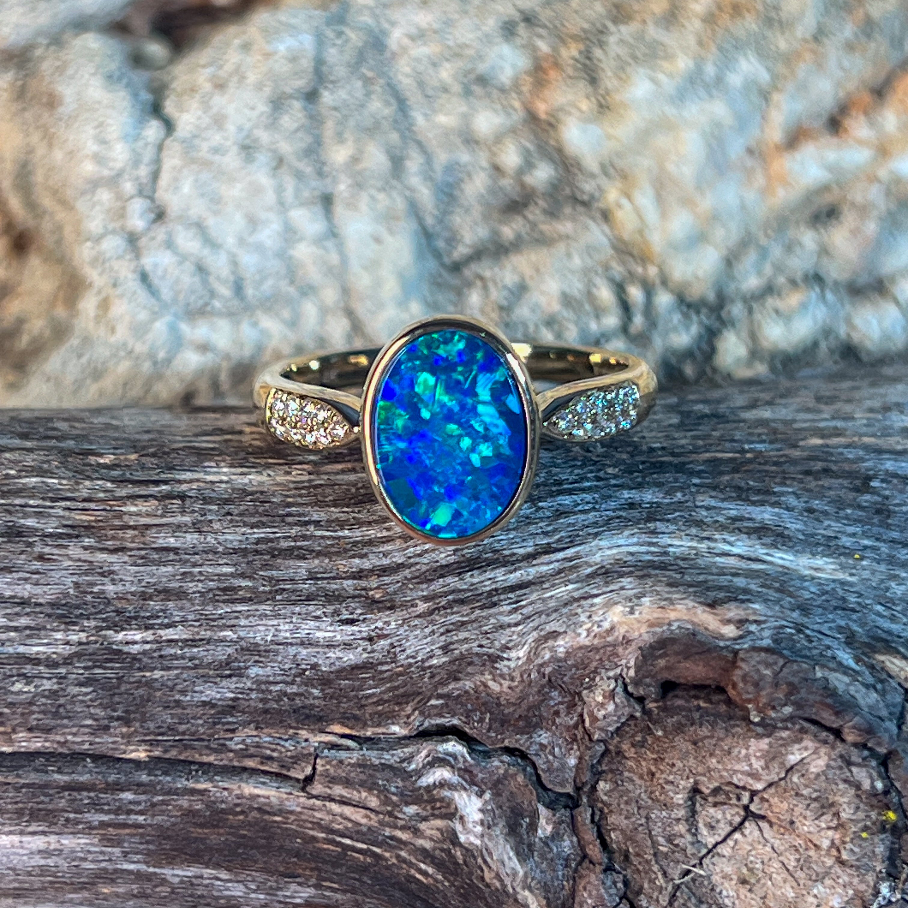 This exquisite 14kt yellow gold ring features a stunning 1.33ct opal doublet set in a classic bezel, showcasing a captivating deep blue color. Accented with sparkling diamonds, it combines timeless elegance with vibrant beauty, making it a perfect statement piece for any occasion.