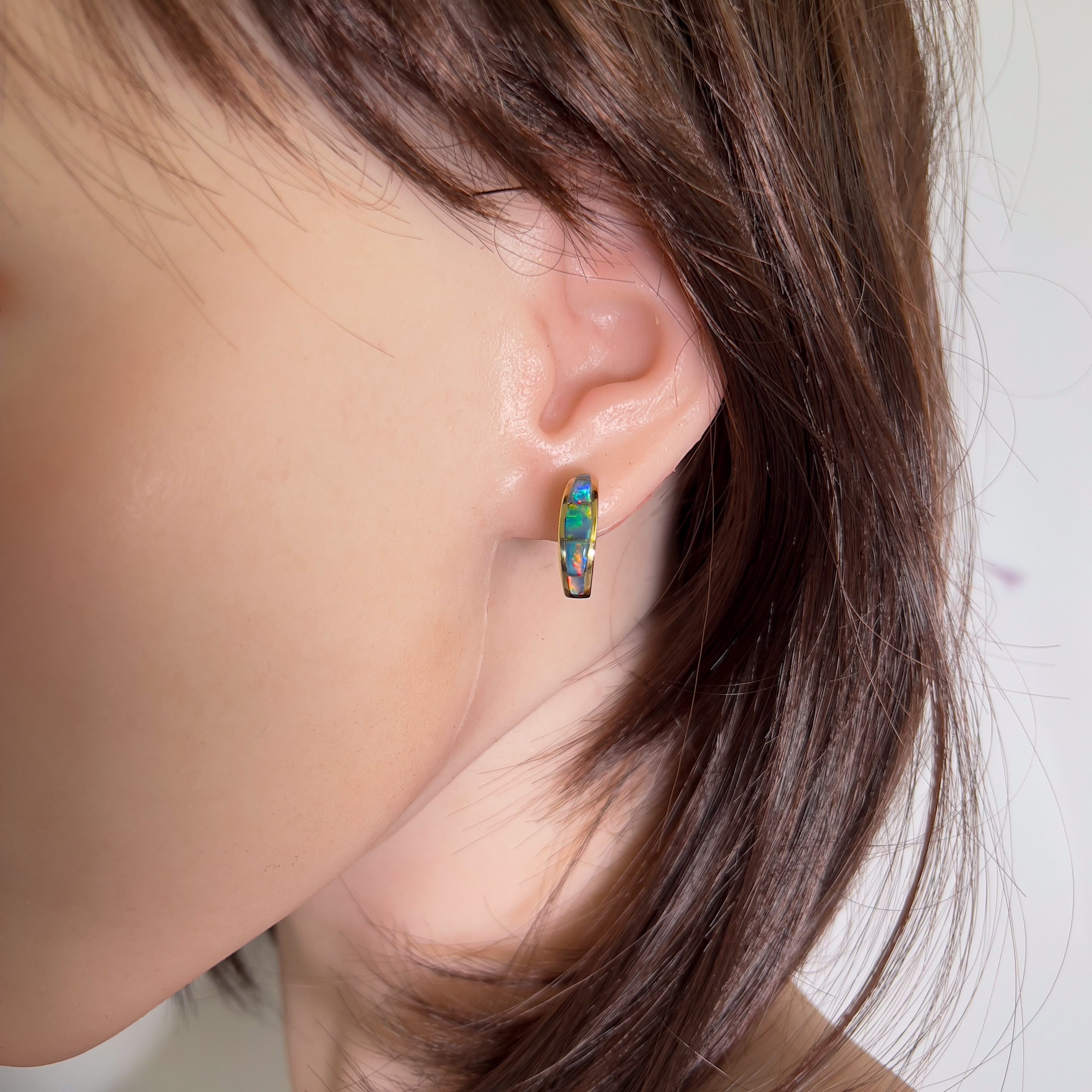 Add some playful charm to your look with our 14kt Yellow Gold Opal inlay huggie style earrings. The huggie hoop design adds a fun twist to these elegant earrings, making them perfect for any occasion. Elevate your style with a touch of whimsy!