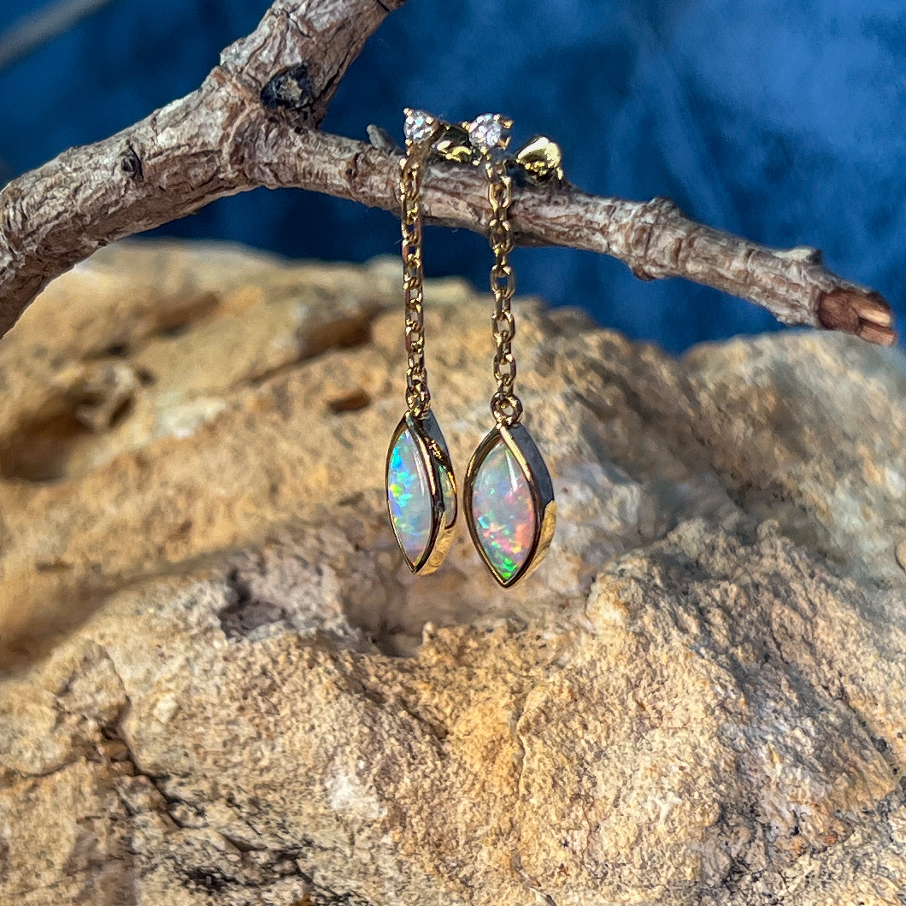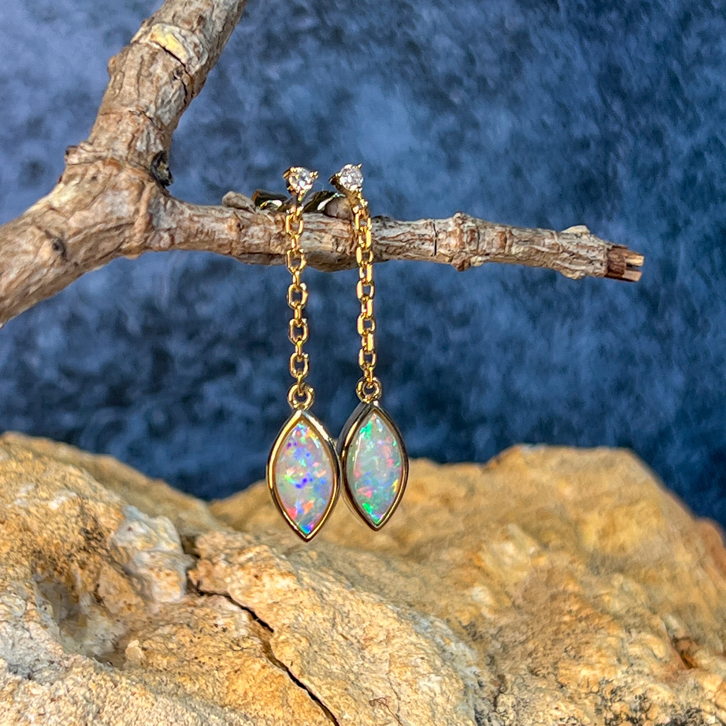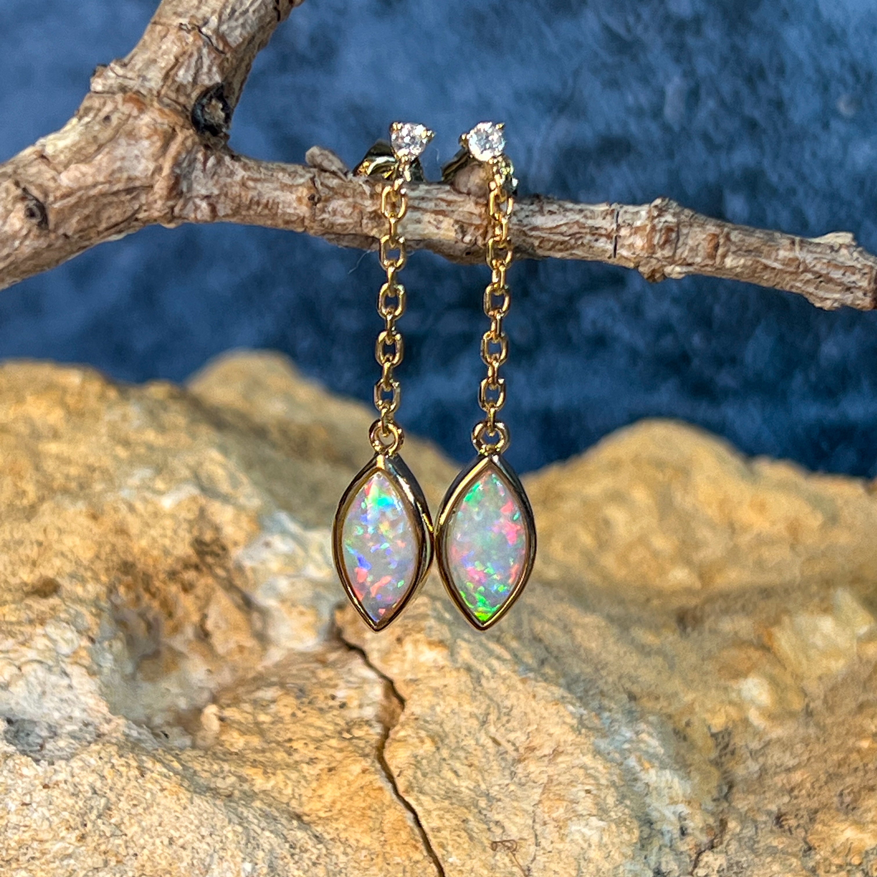 14kt Yellow Gold pair of dangling Crystal Marquise shape Opals and diamond earrings