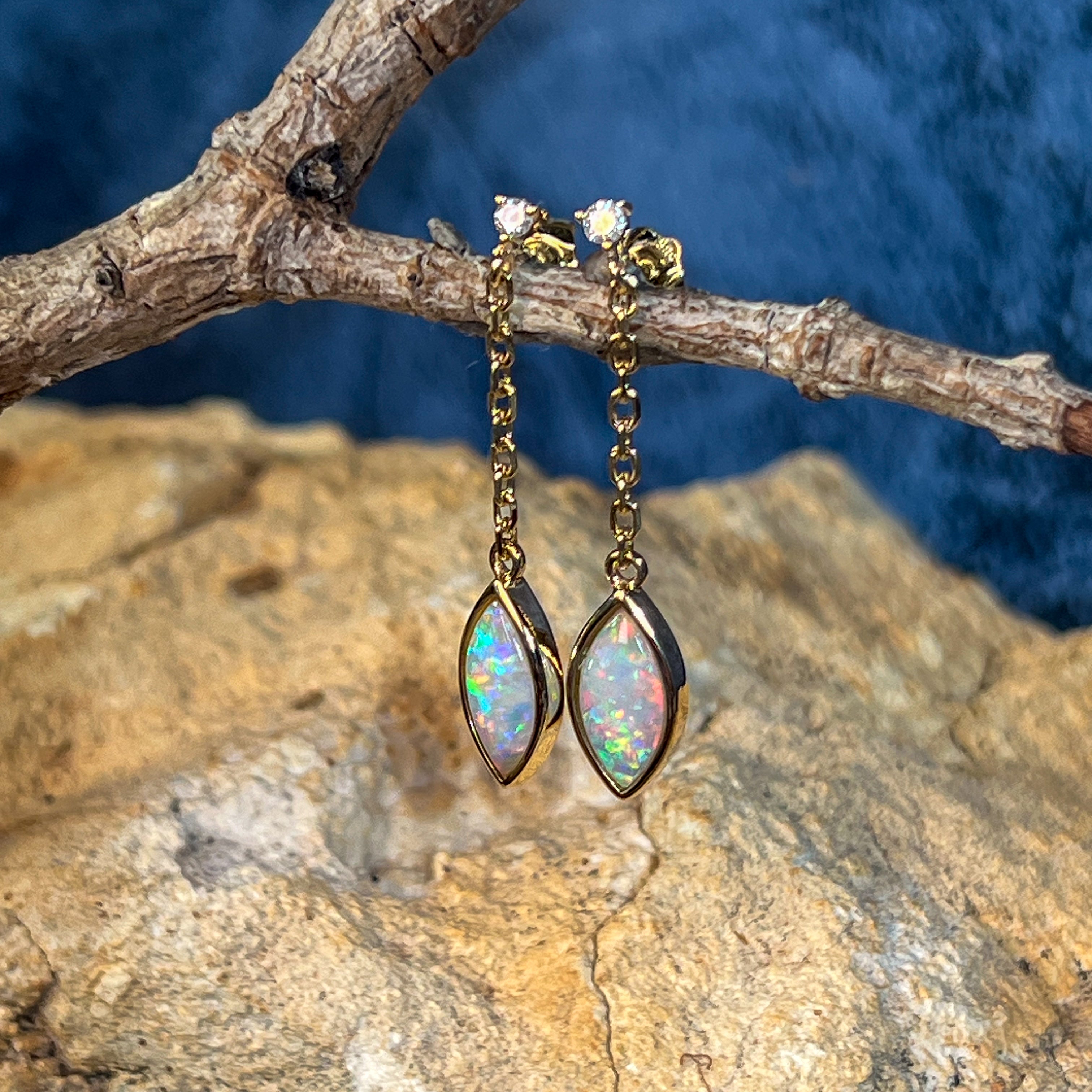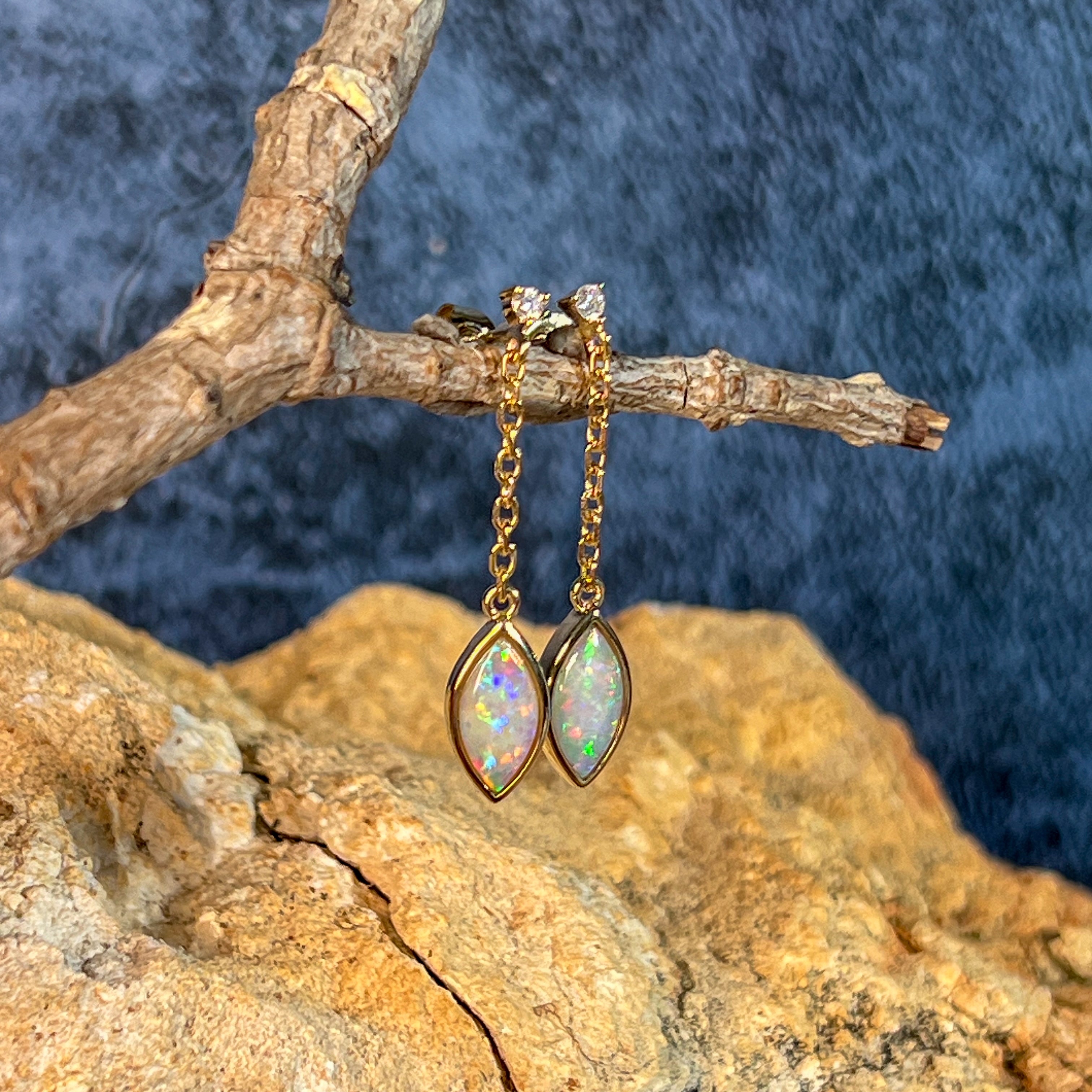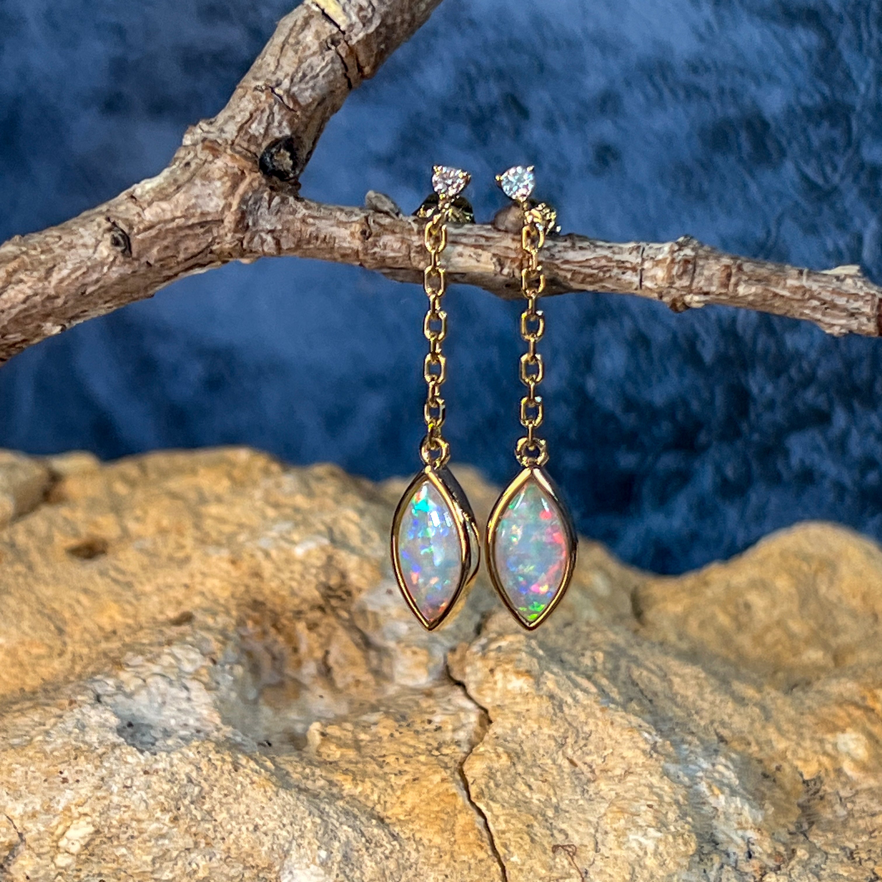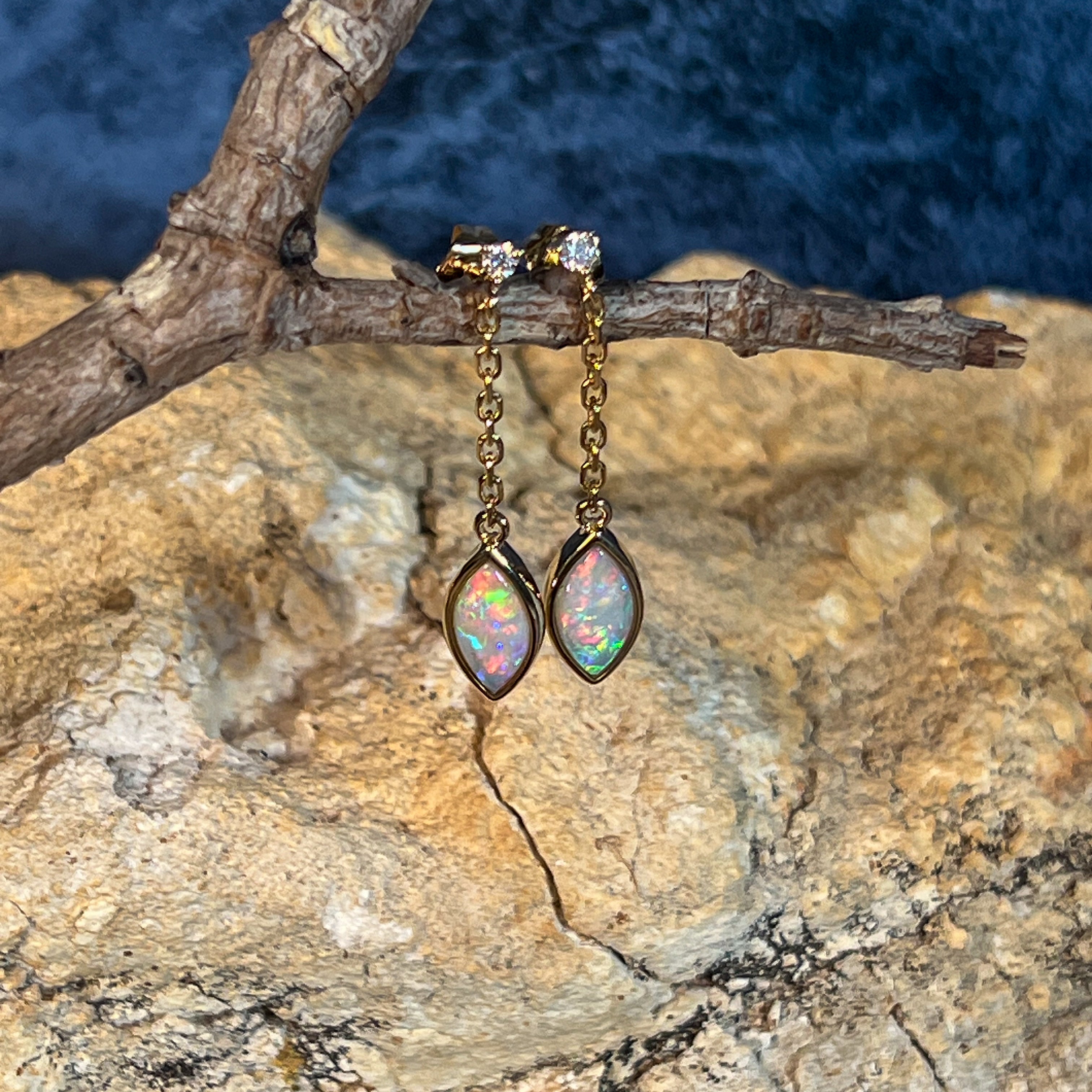 14kt Yellow Gold pair of dangling Crystal Marquise shape Opals and diamond earrings