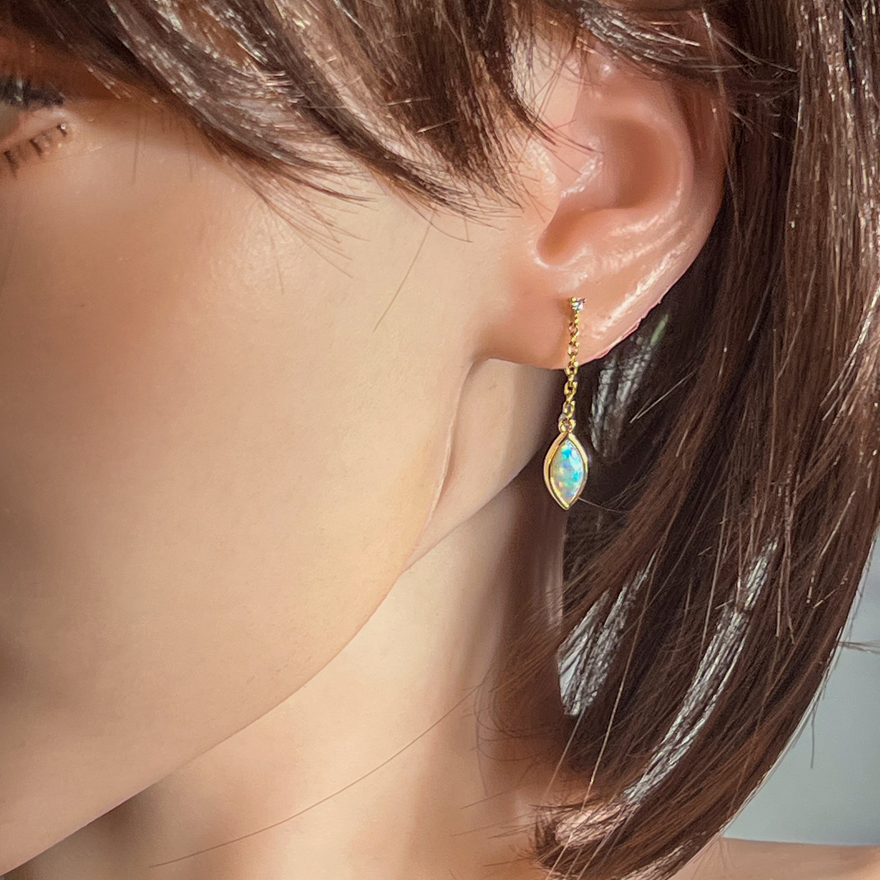 Elevate your elegance with this stunning pair of 14kt yellow gold earrings, featuring marquise-shaped opals that shimmer with every movement. Accented by sparkling diamonds, these modern dangling earrings add a touch of sophistication and vibrant color to any outfit. Perfect for special occasions or daily wear, they combine timeless beauty with contemporary style to make a captivating statement.
