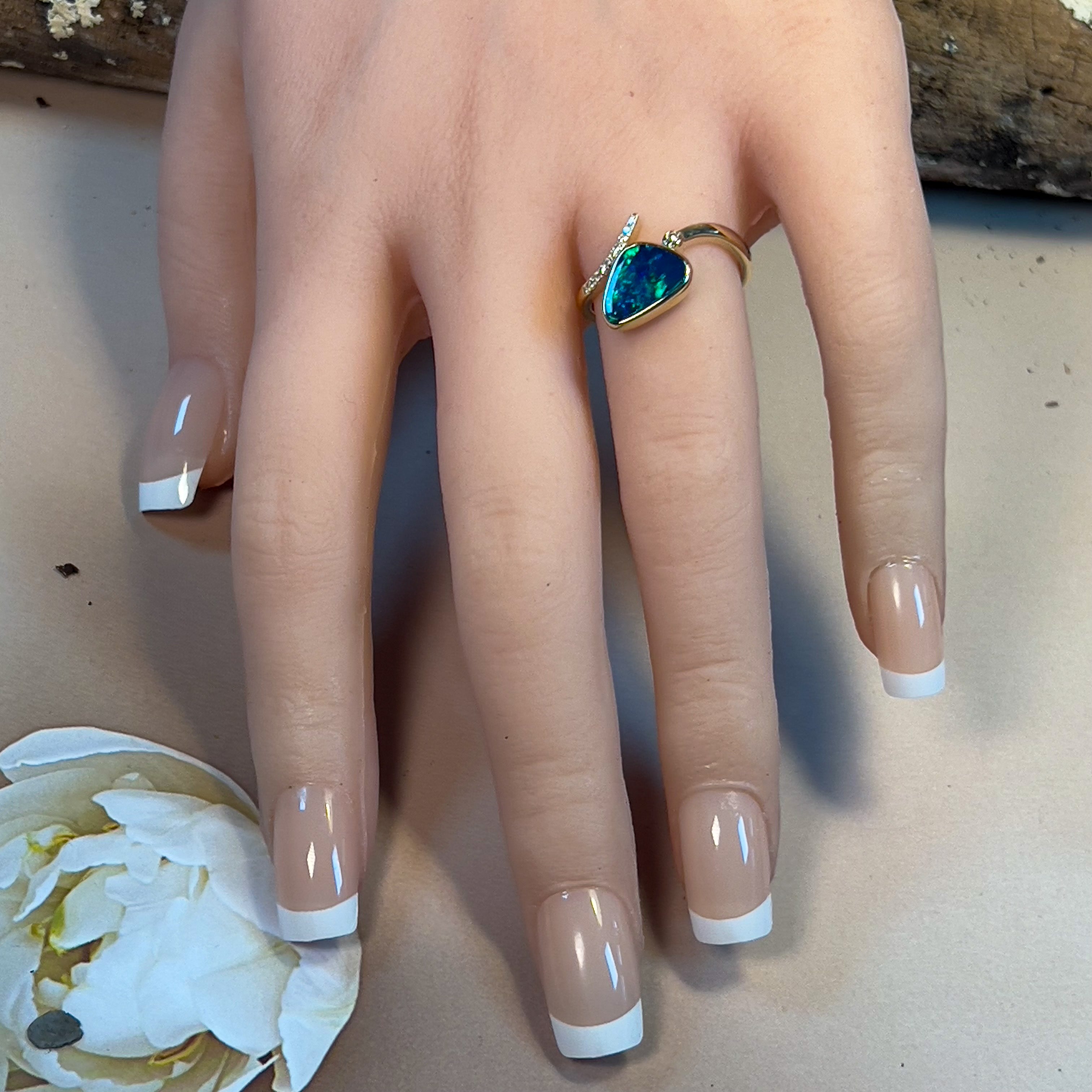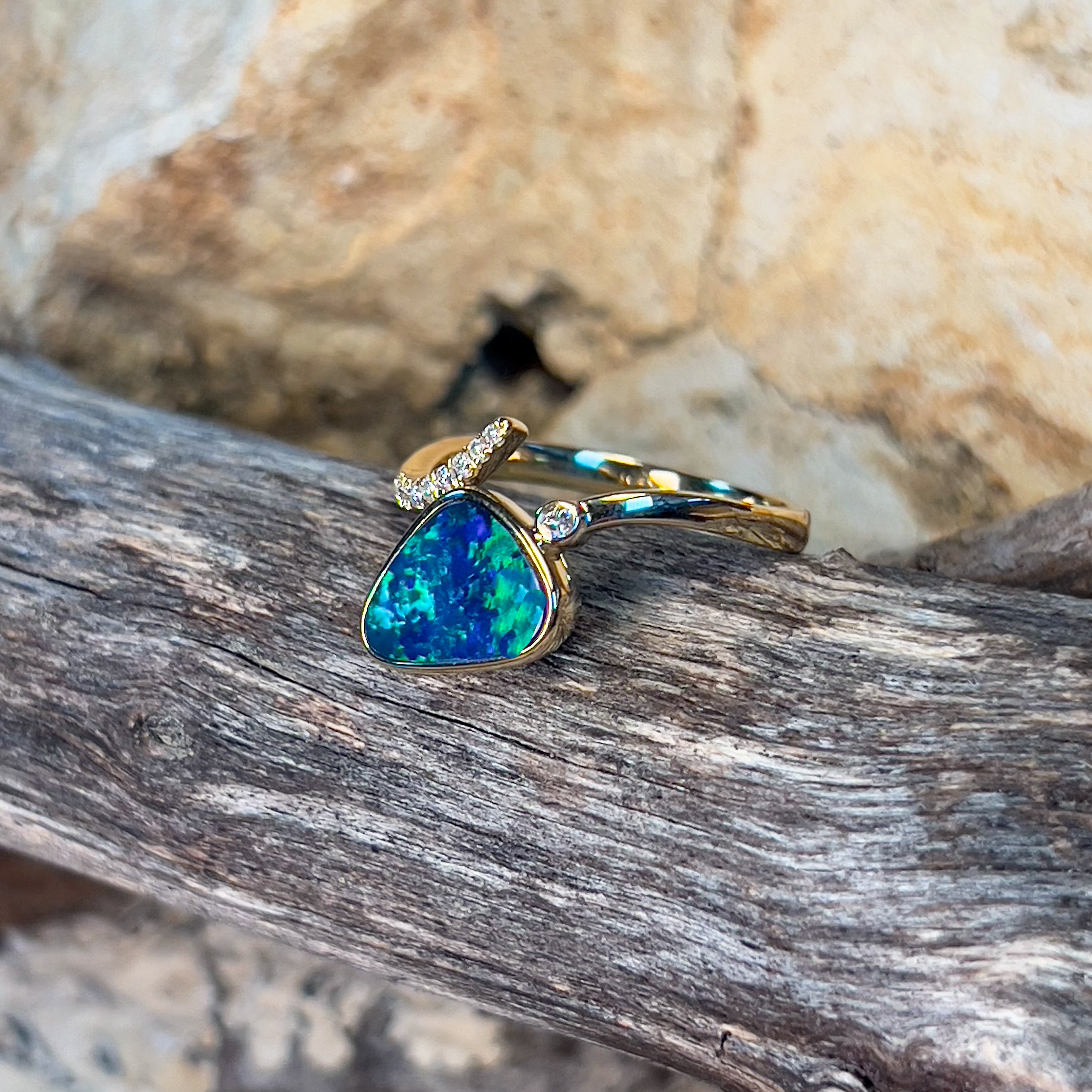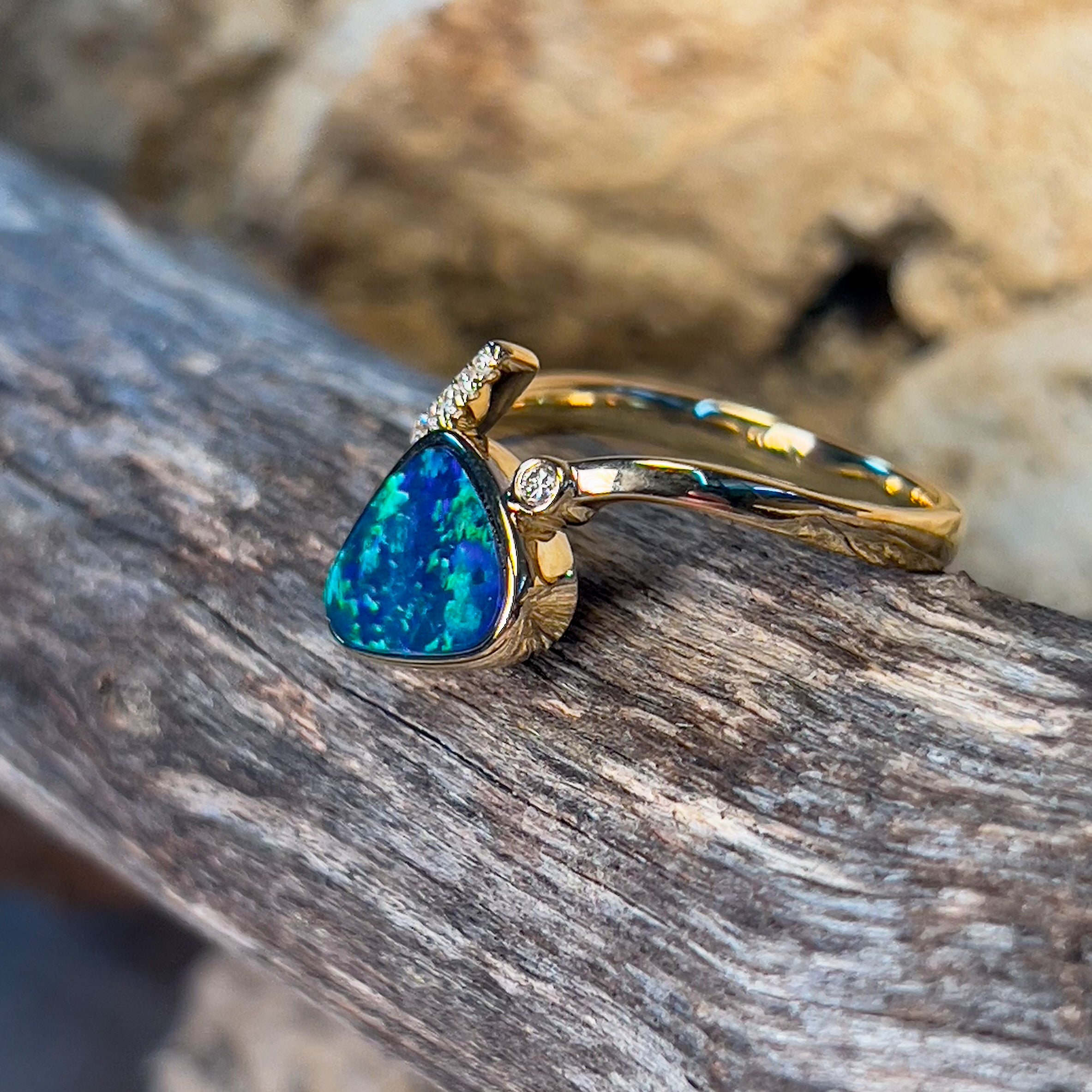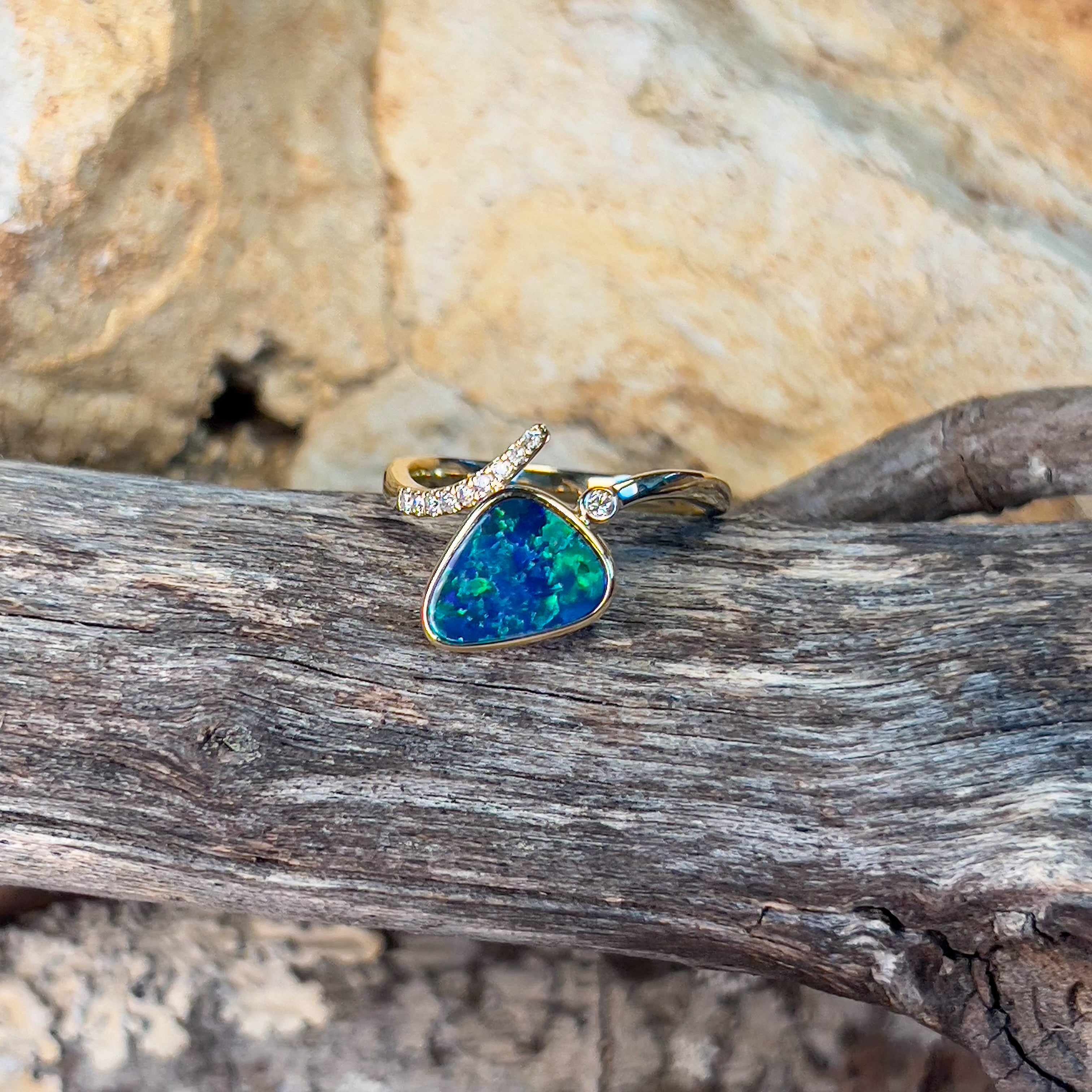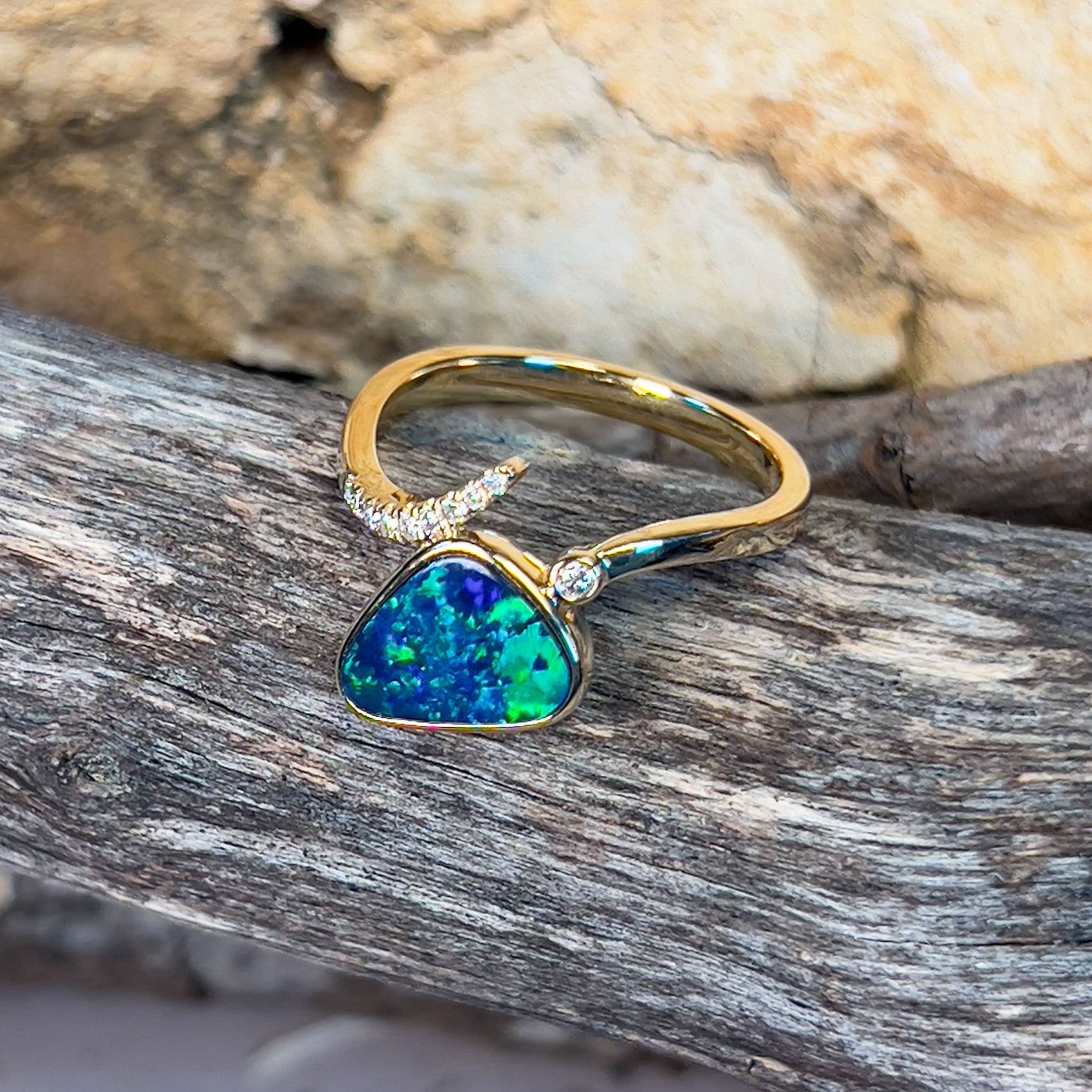 14kt Yellow Gold split shank Opal 1.37ct doublet and diamond ring