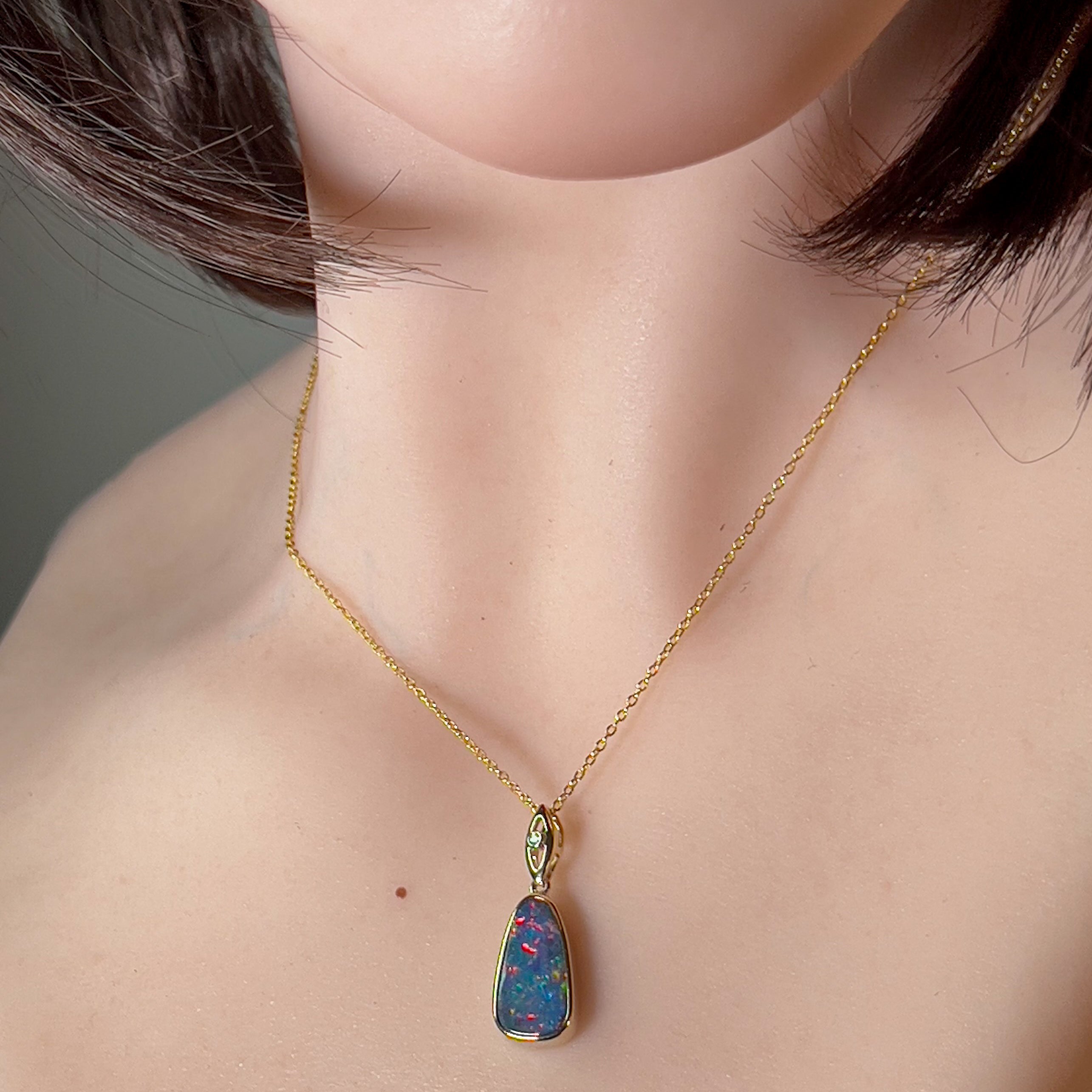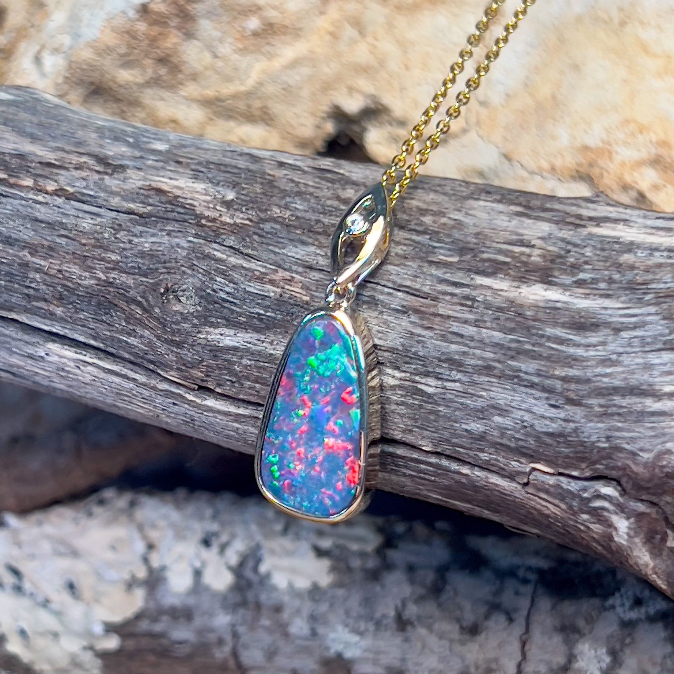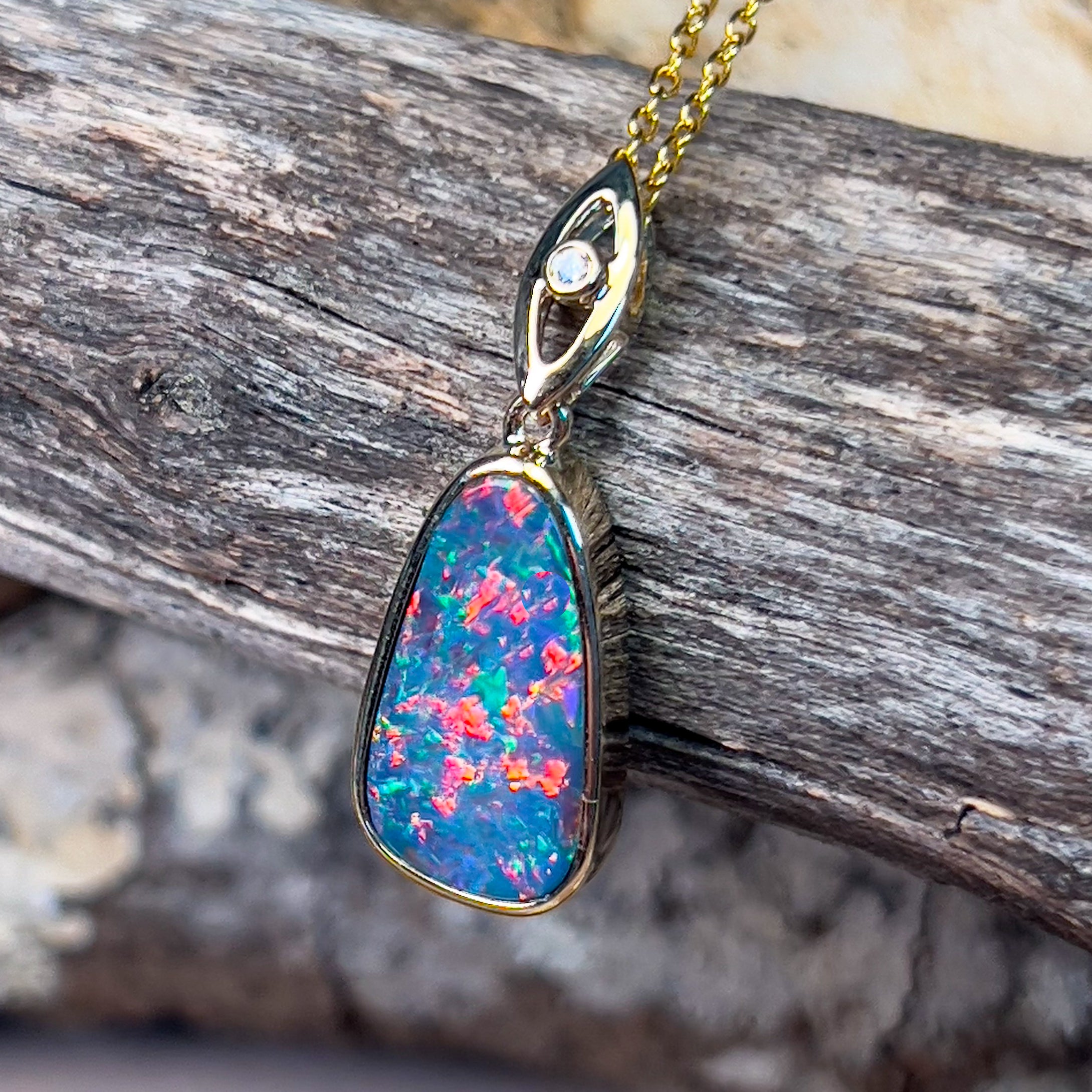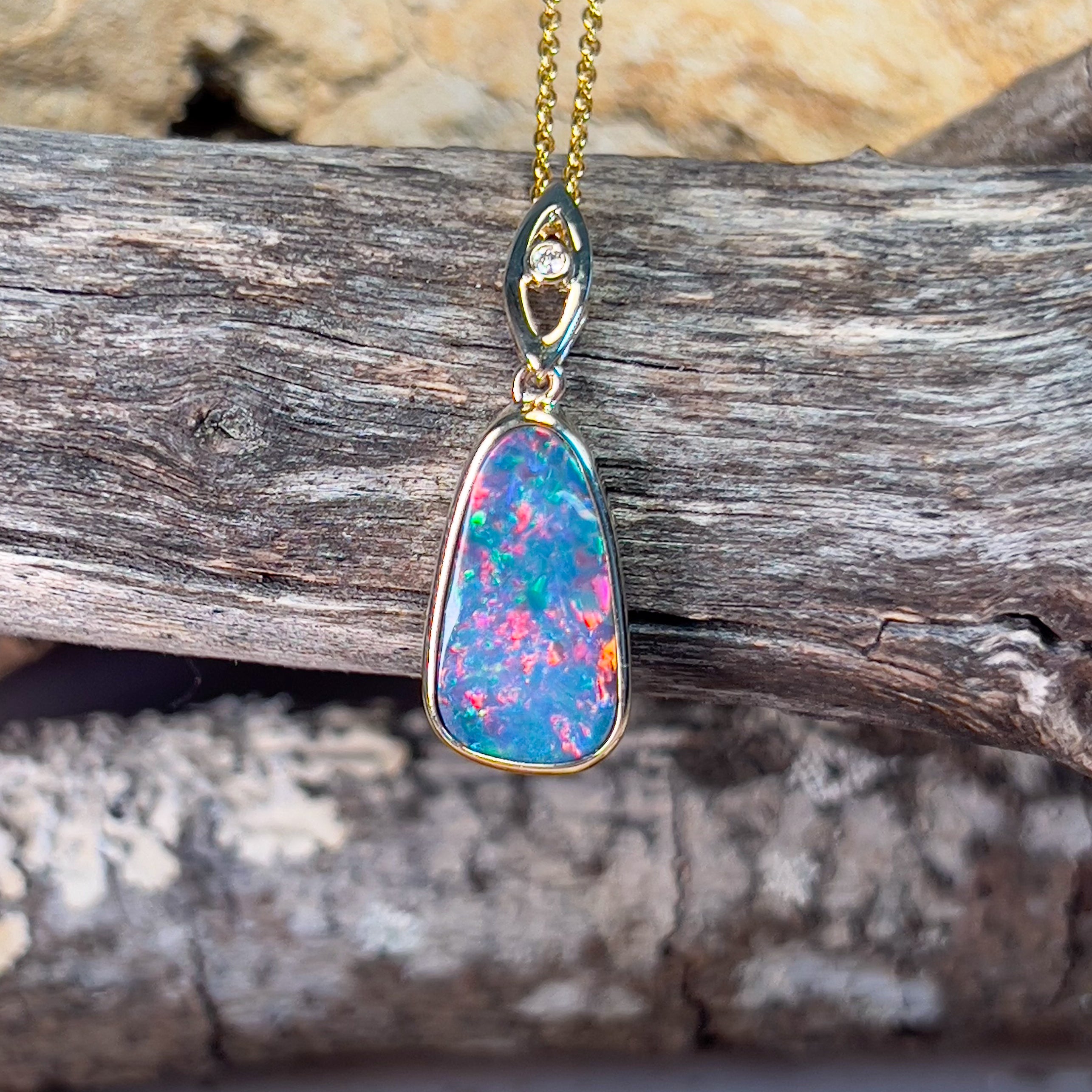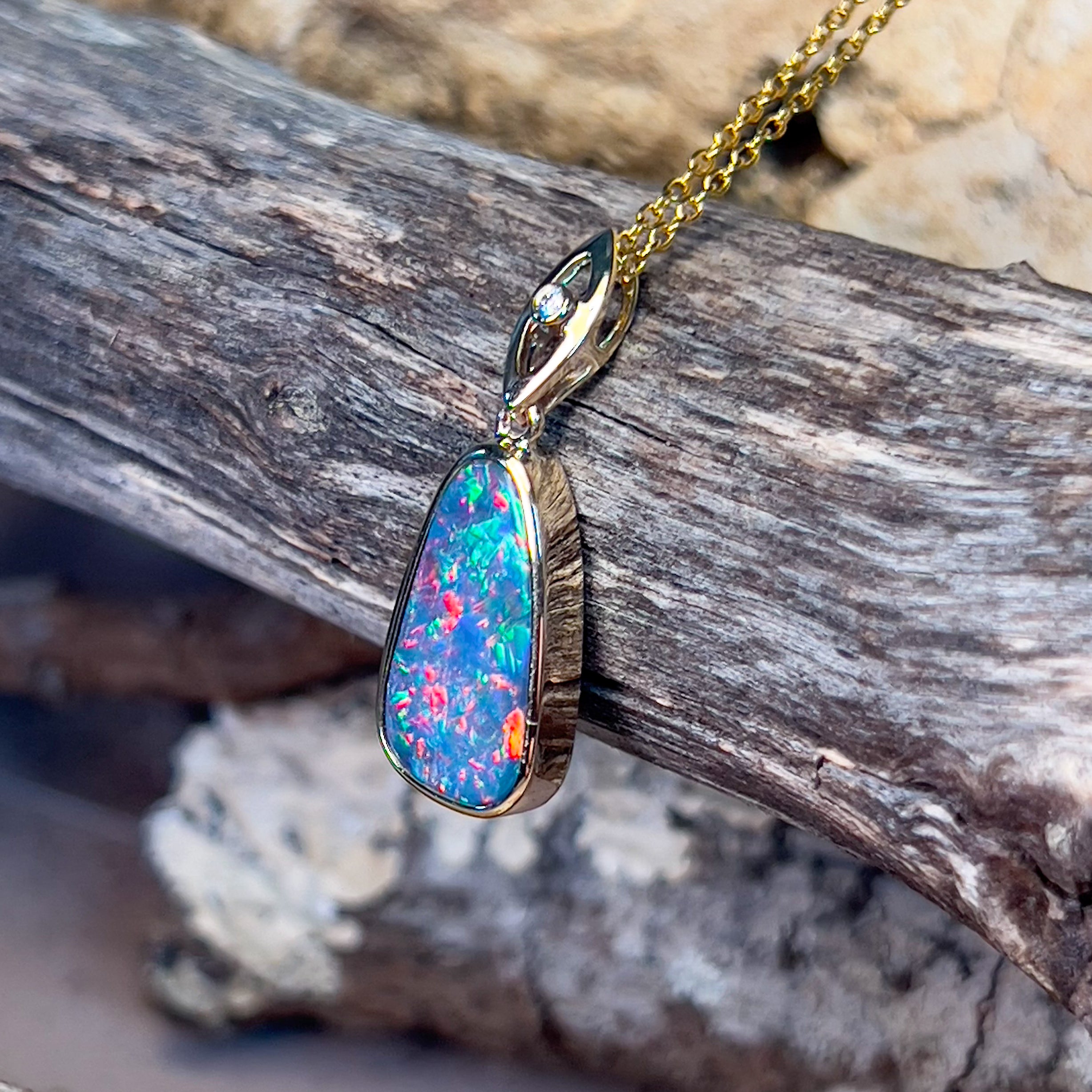14kt Yellow Gold teardrop shape Opal fire doublet with diamond pendant