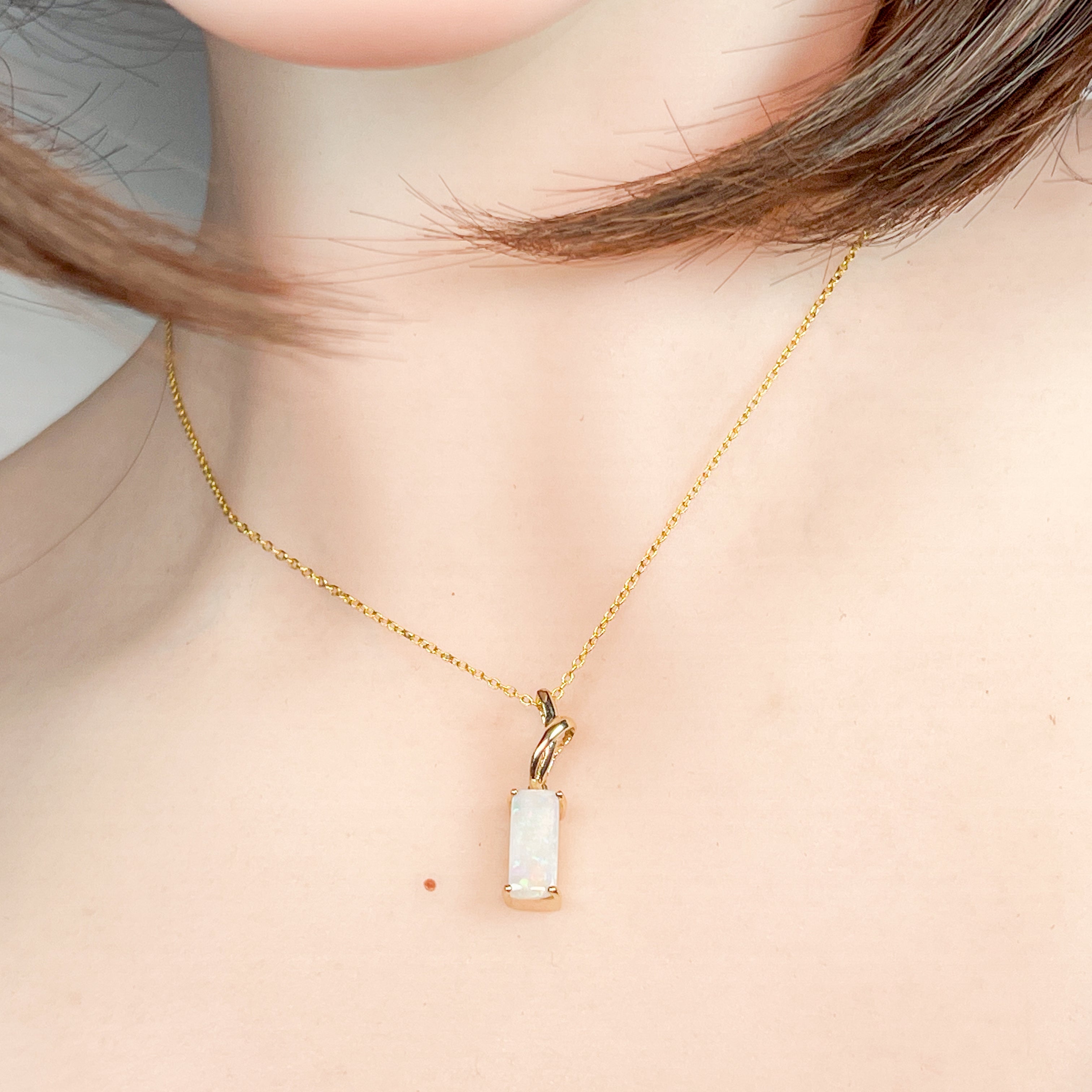 Elevate your elegance with this delicate 14kt yellow gold pendant featuring a stunning 1.38ct rectangular cut white opal. Its subtle yet radiant glow adds a refined touch to any outfit, perfect for everyday wear or special occasions. The dainty design offers timeless beauty that effortlessly complements your style.