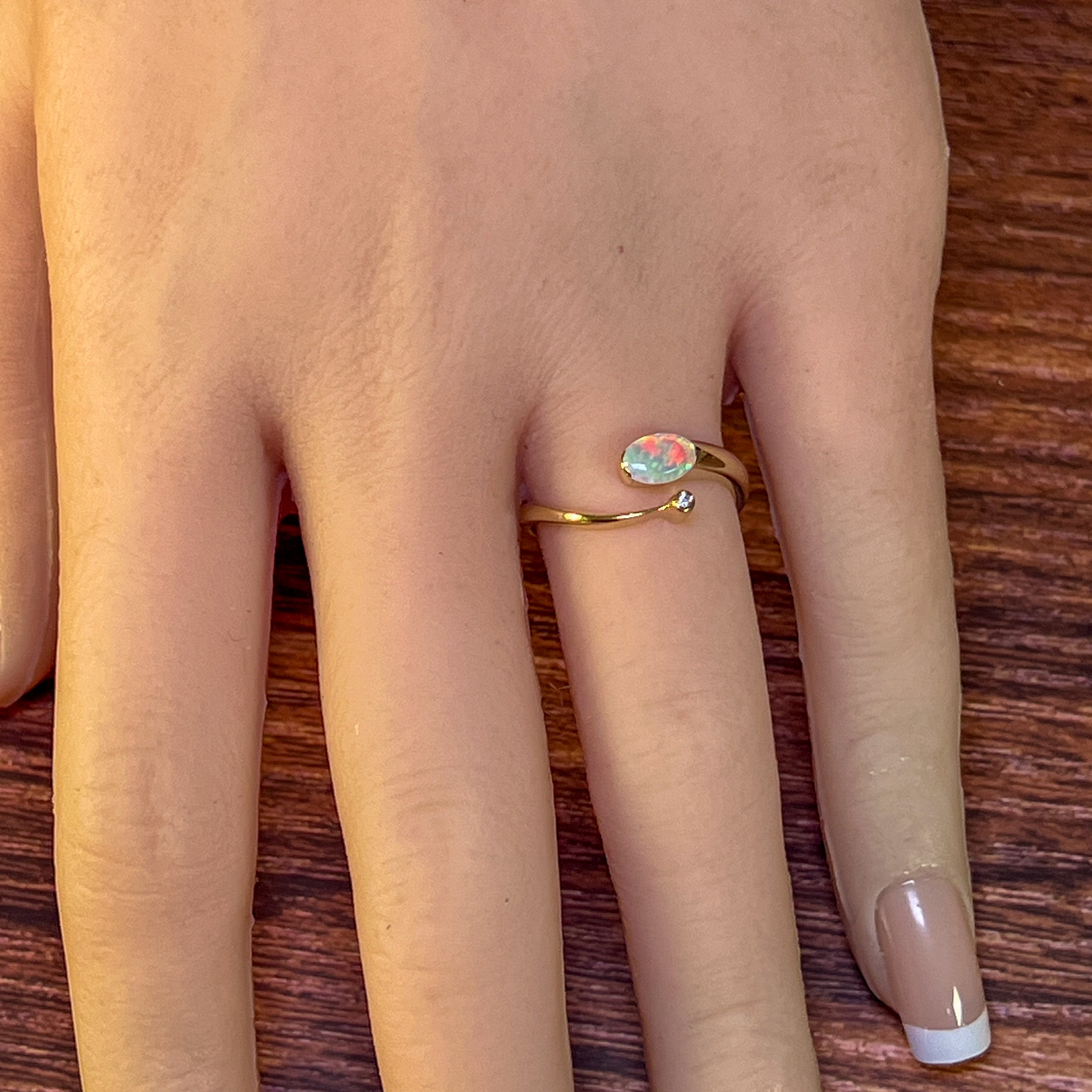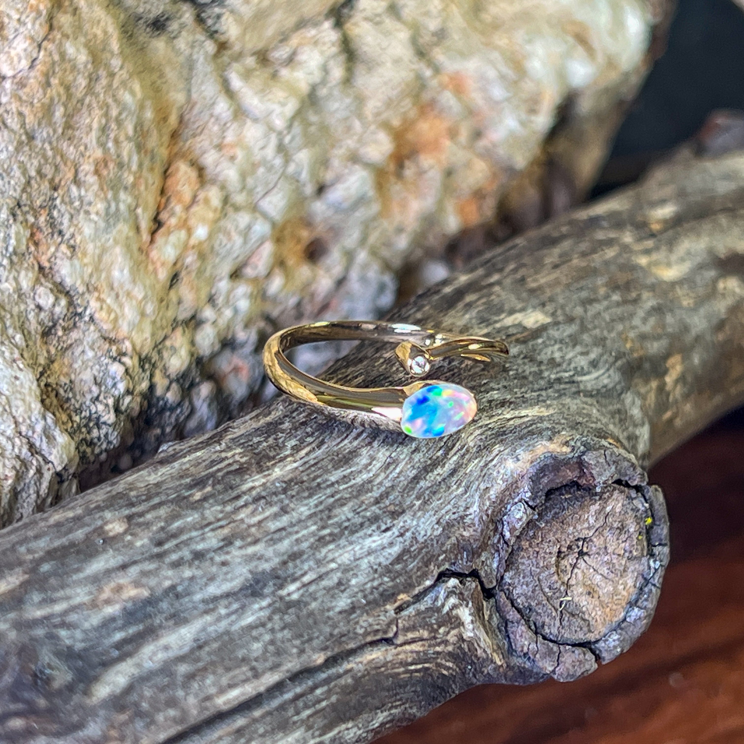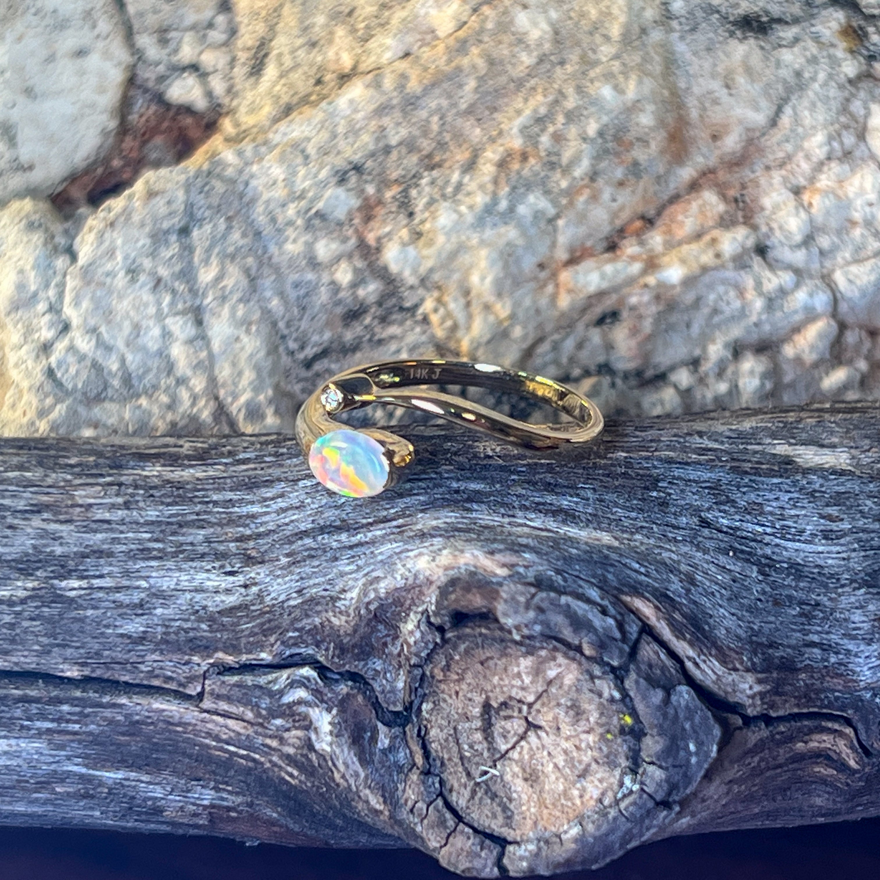 One 14kt Yellow Gold ring split open crossover with one South Australian Crystal Opal 0.26ct and one round brilliant cut diamond weighing 0.01ct. Weight of item = 1.78g