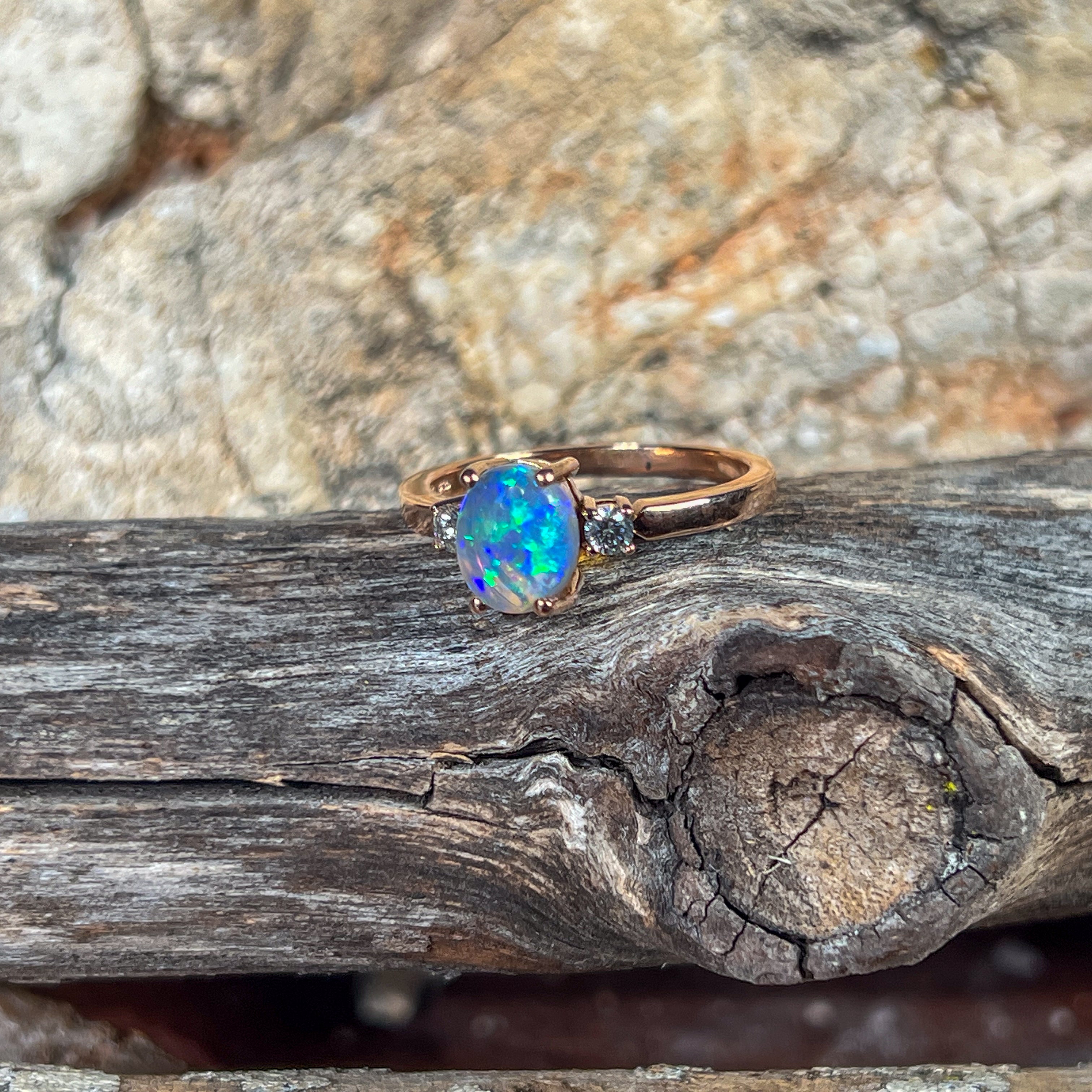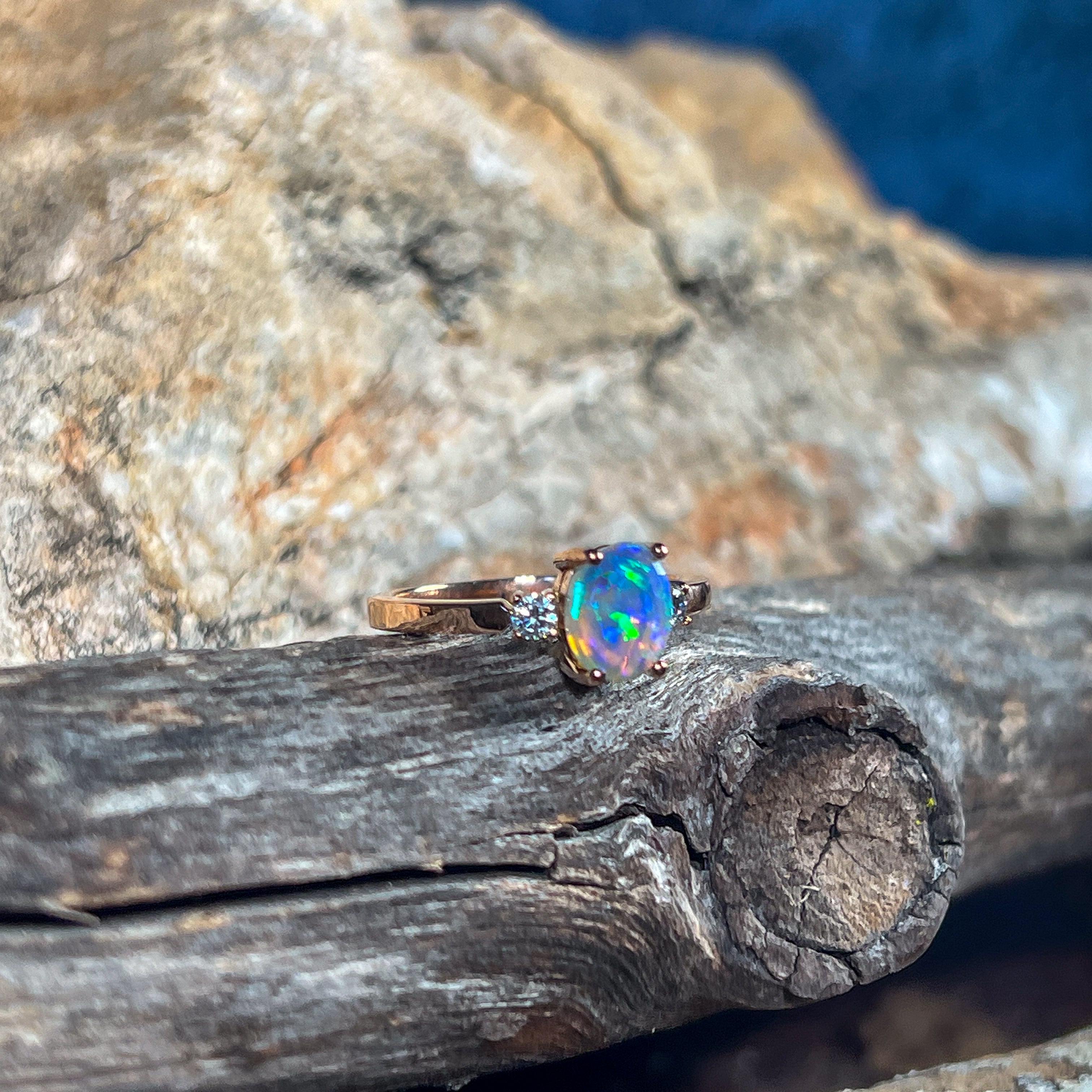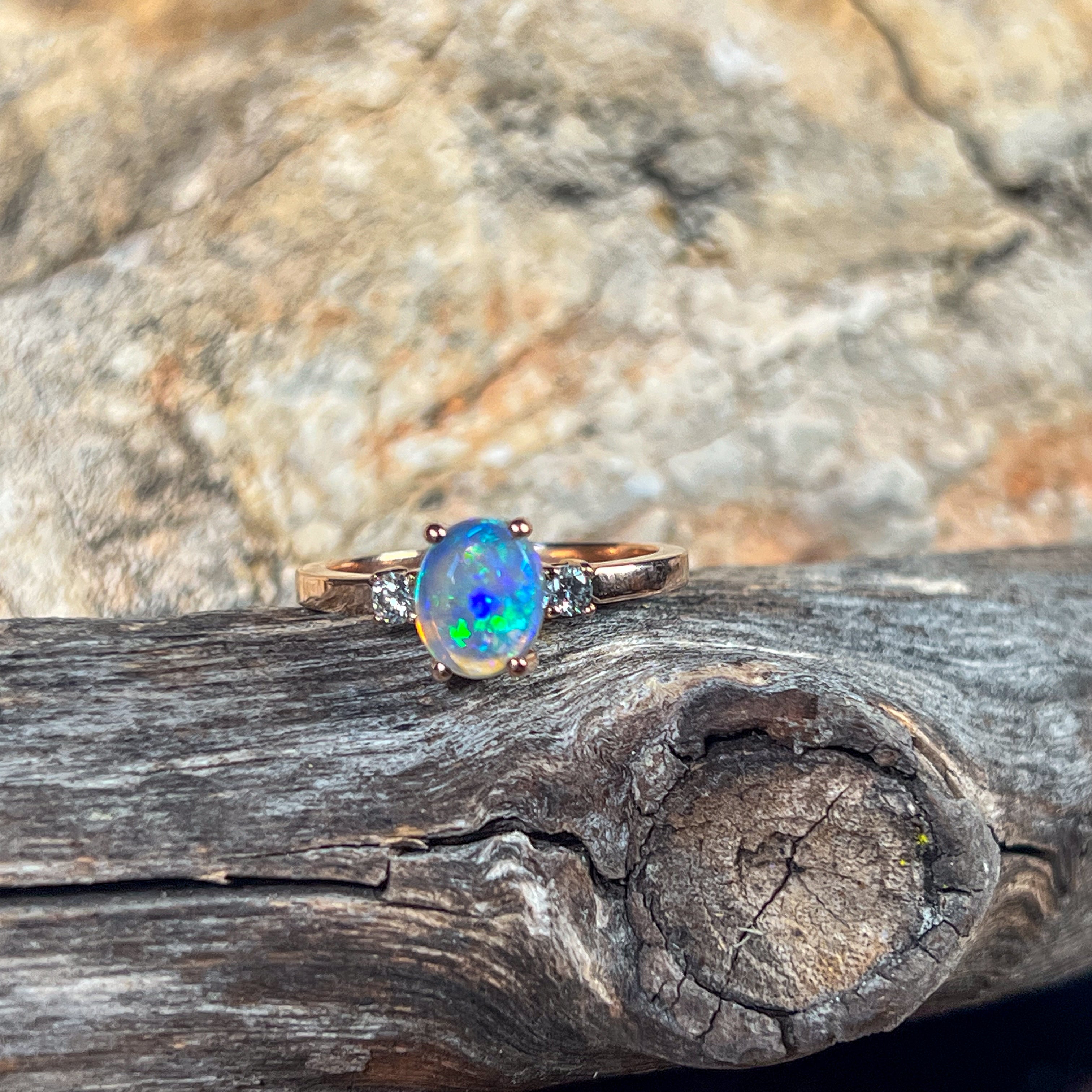 18kt Rose Gold 3 stone ring set with one Black Opal 1.35 and 2 diamonds