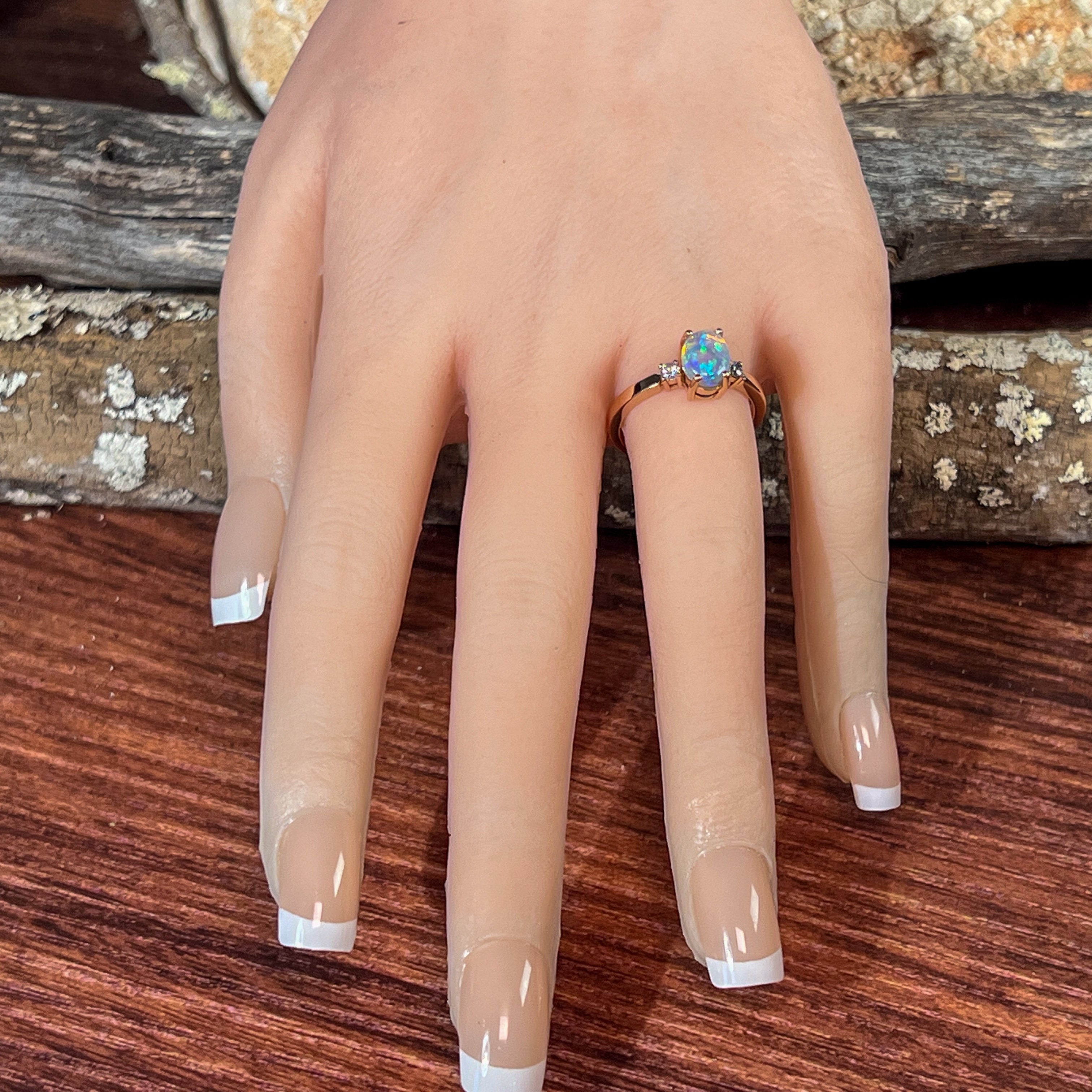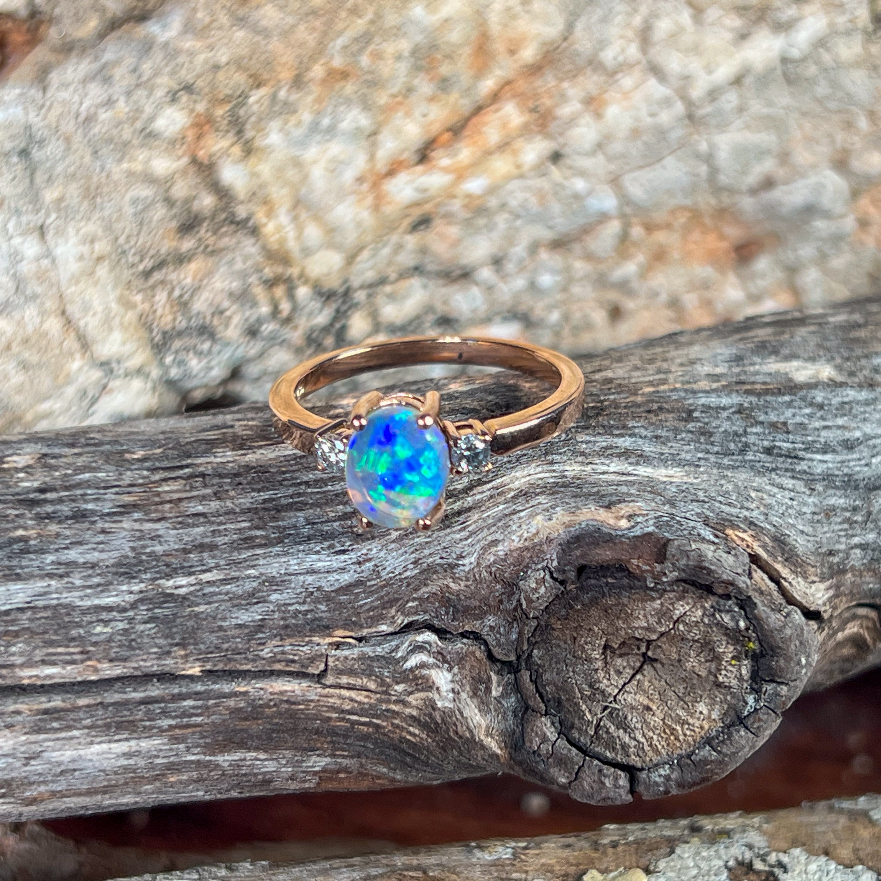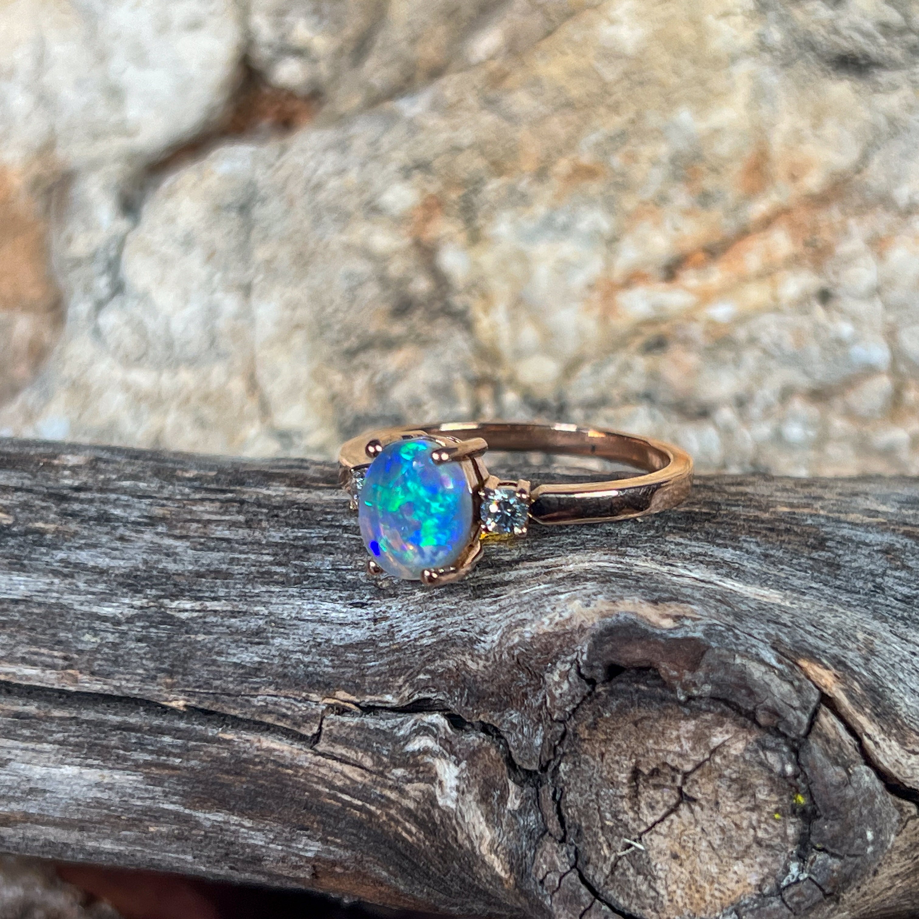 18kt Rose Gold 3 stone ring set with one Black Opal 1.35 and 2 diamonds