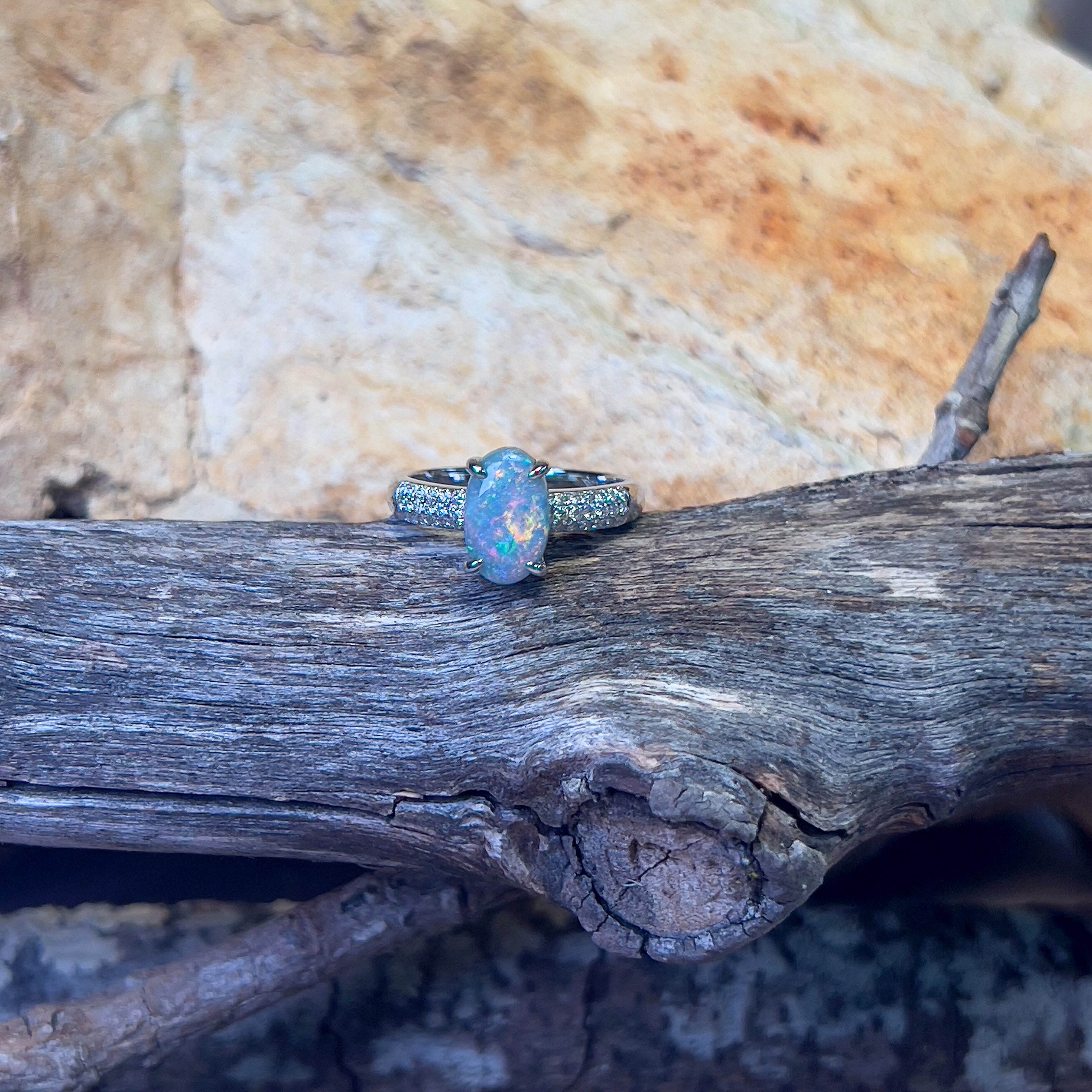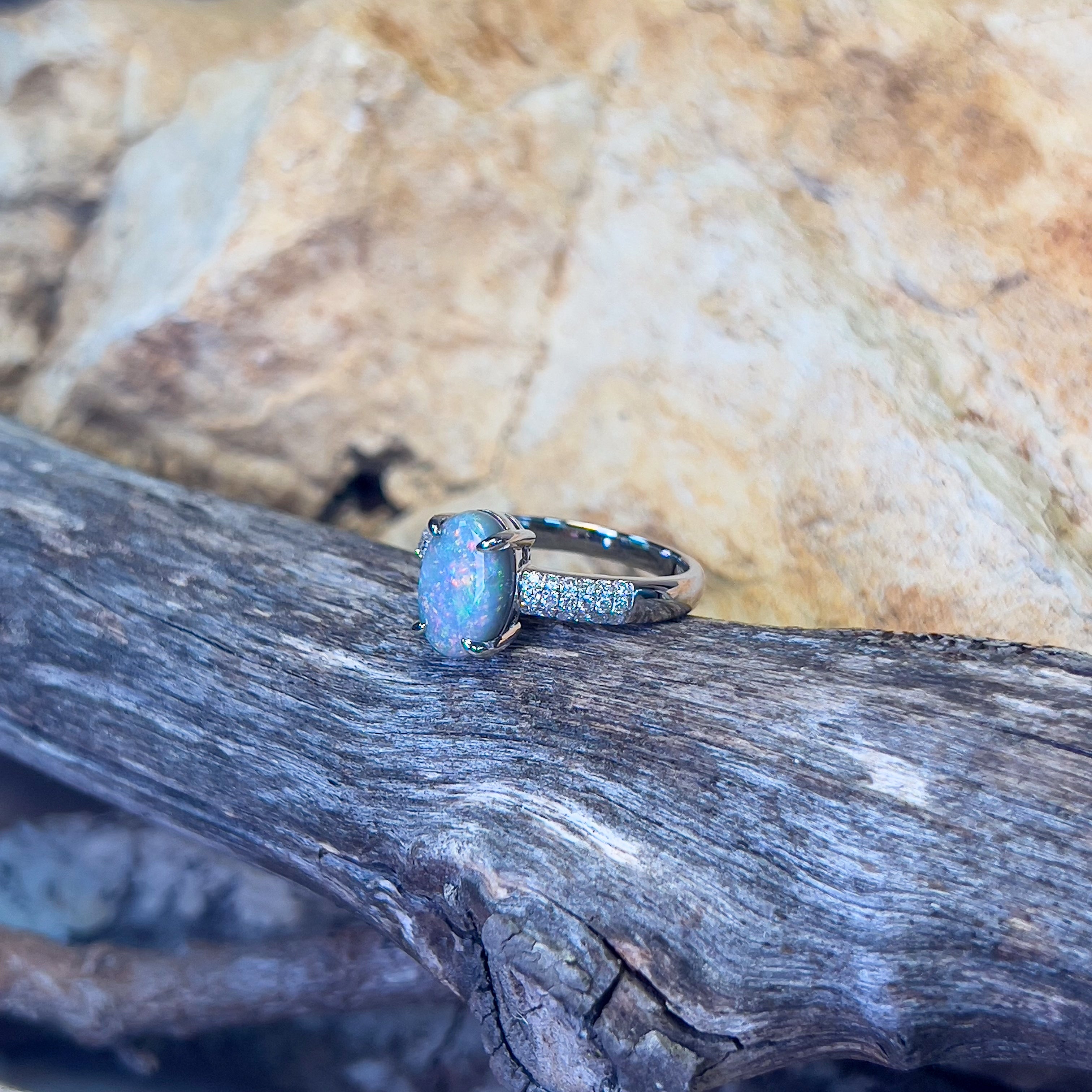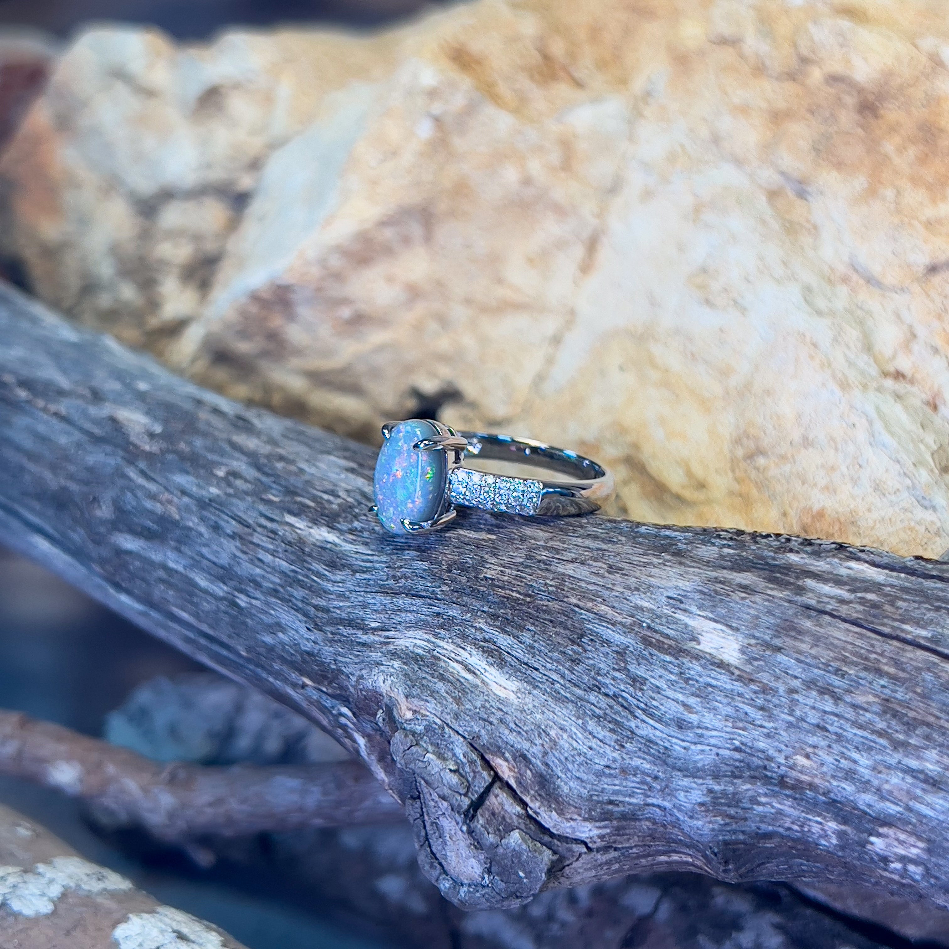 This exquisite 18kt white gold ring features a stunning black opal weighing 1.74ct and accented with sparkling diamonds. It's the perfect choice for an elegant and unique opal engagement ring that will be cherished for a lifetime. Stand out with this one-of-a-kind piece.