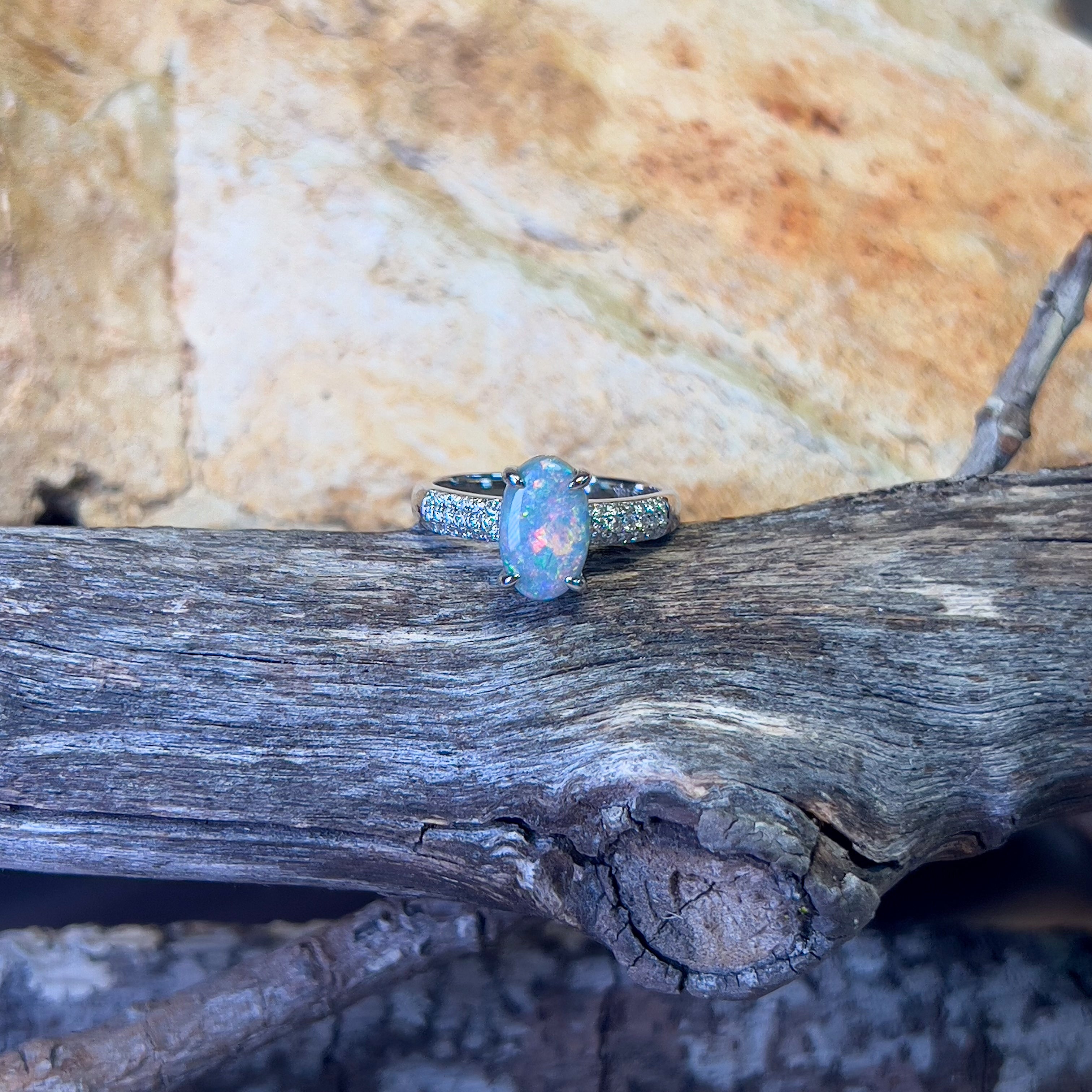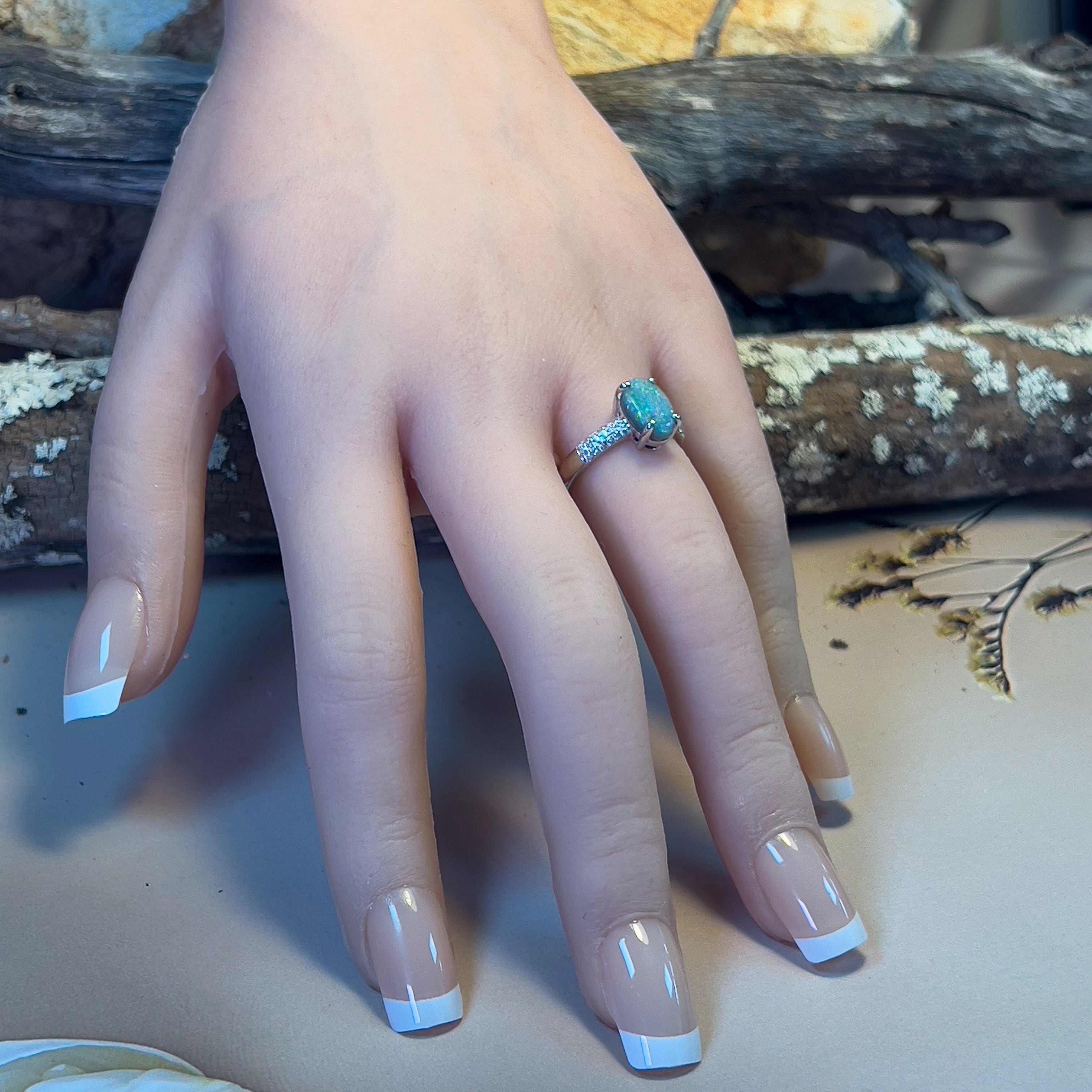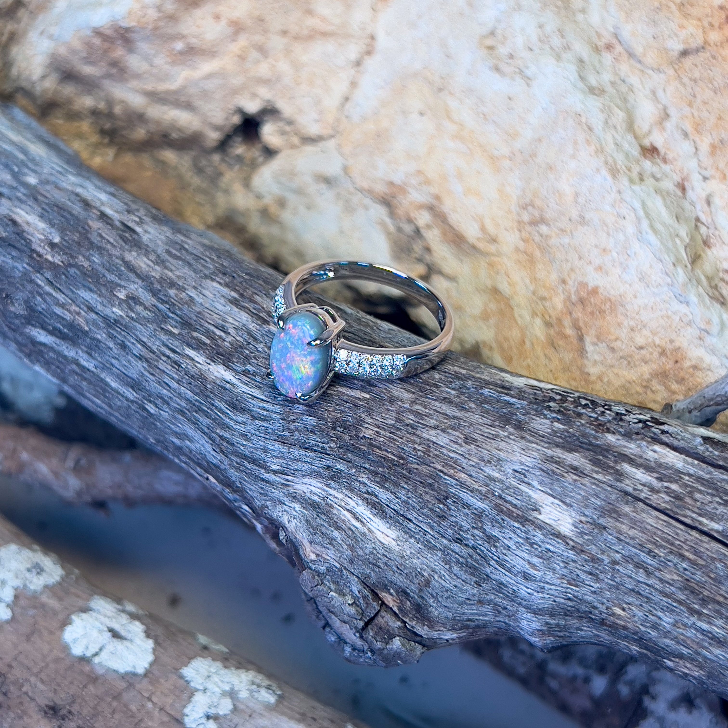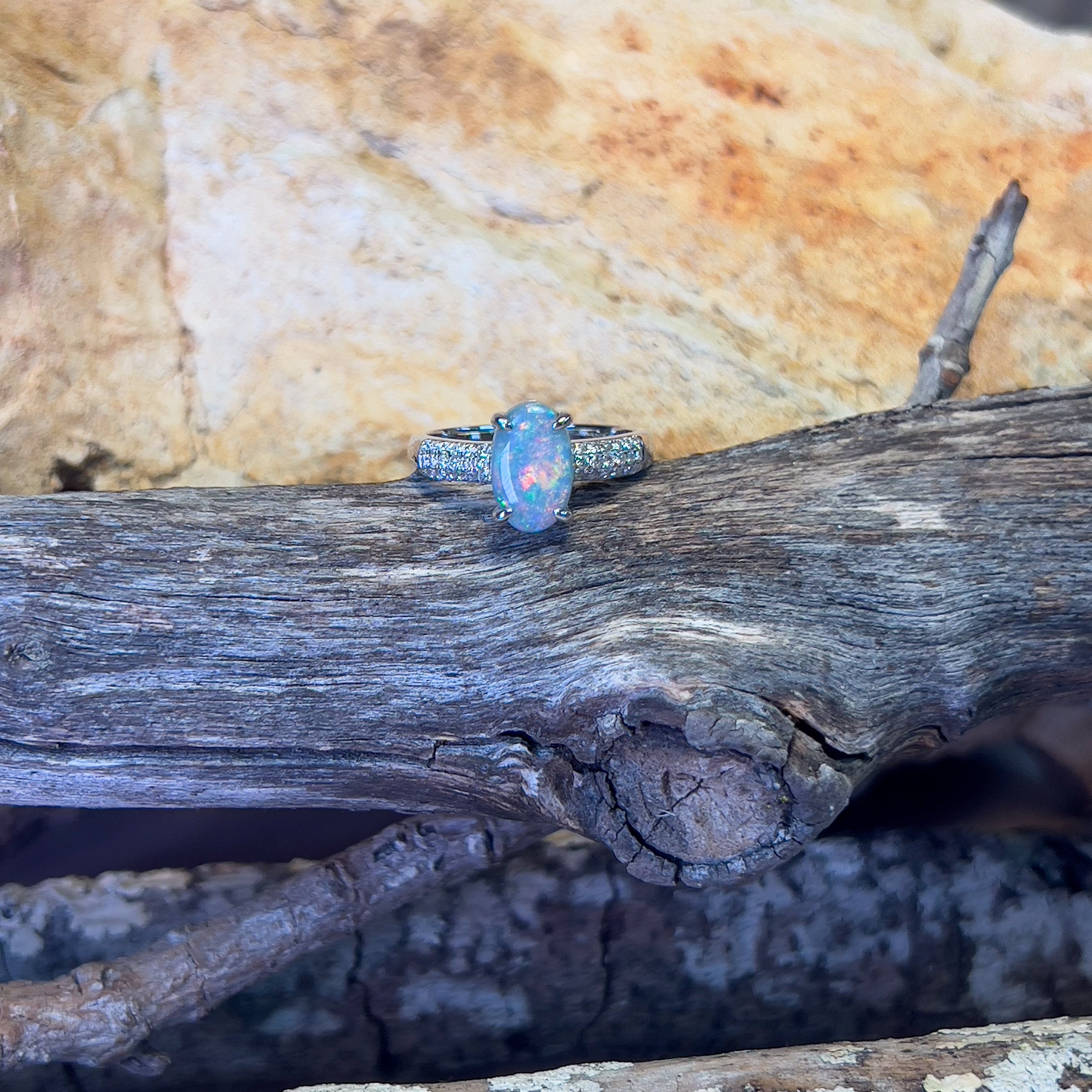 This exquisite 18kt white gold ring features a stunning black opal weighing 1.74ct and accented with sparkling diamonds. It's the perfect choice for an elegant and unique opal engagement ring that will be cherished for a lifetime. Stand out with this one-of-a-kind piece.