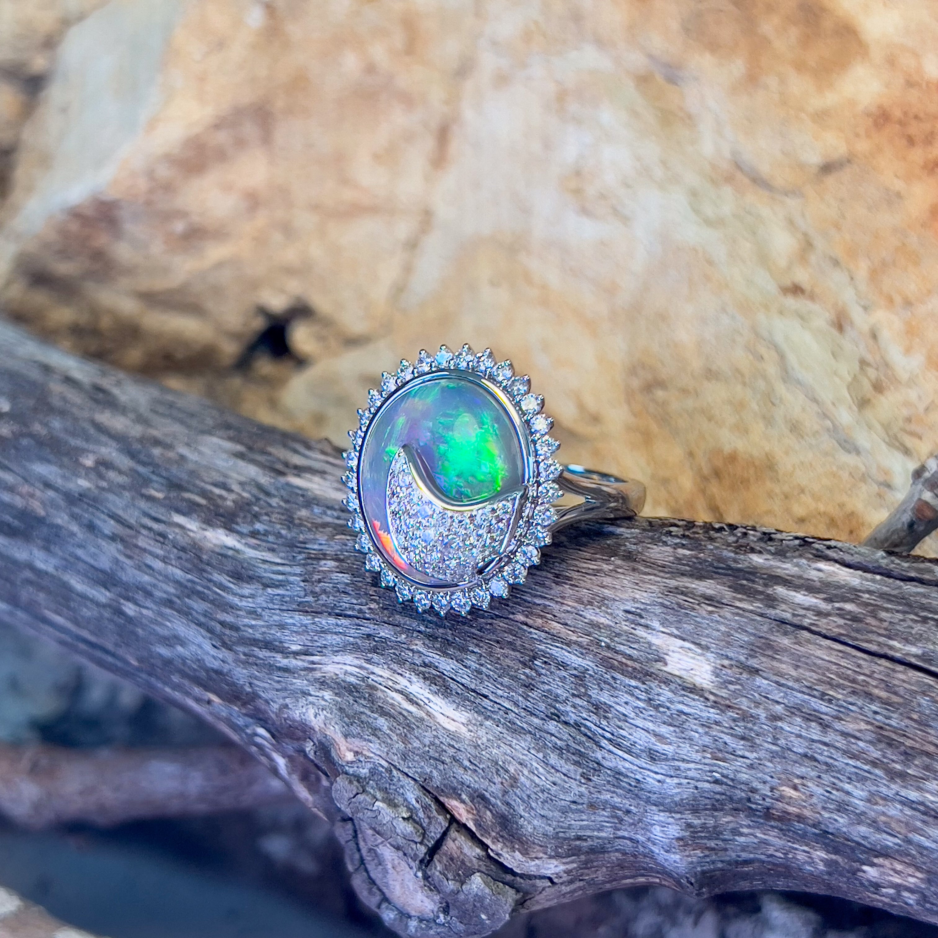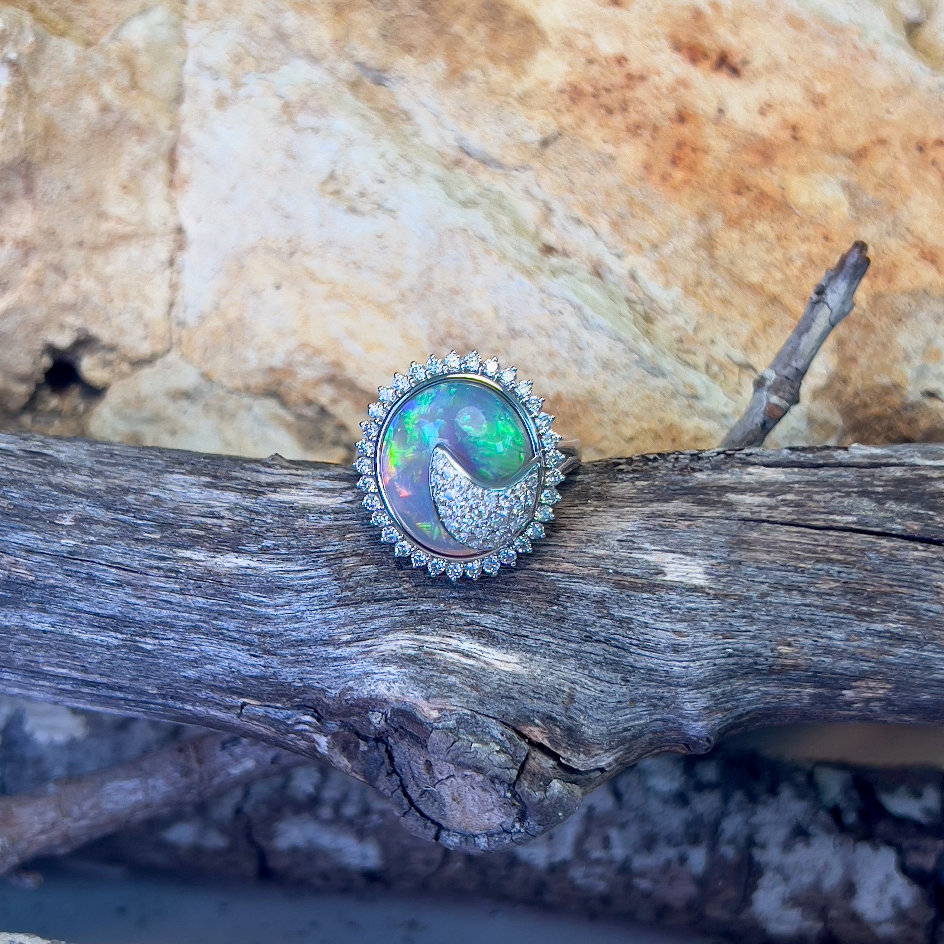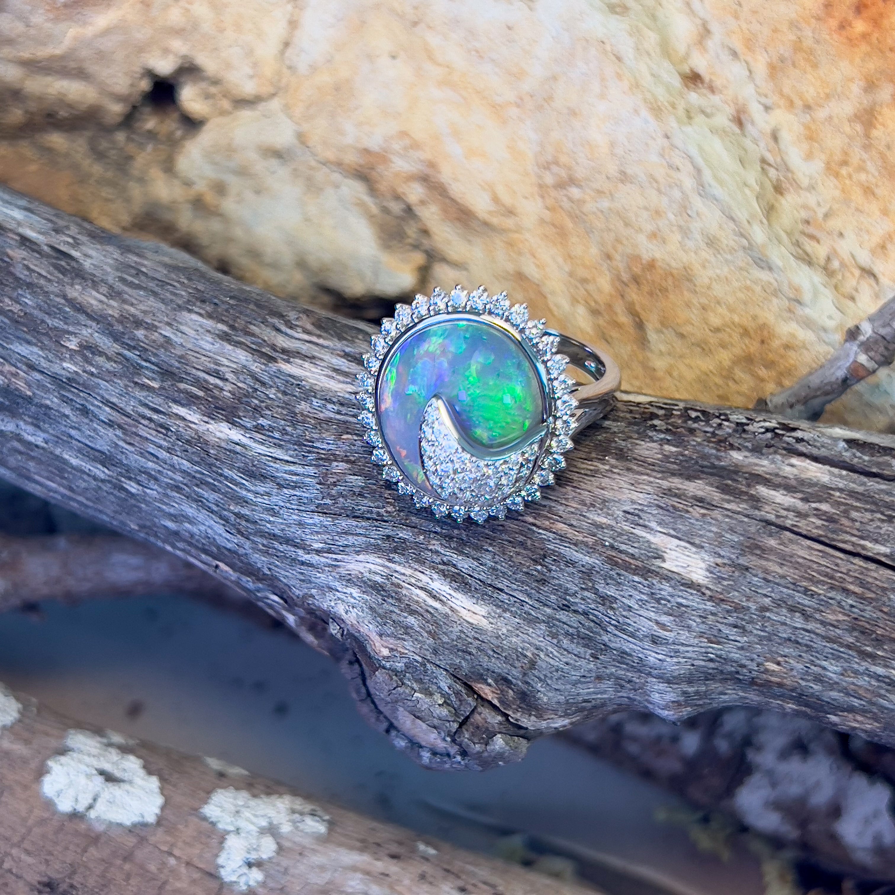 Indulge in timeless elegance with our 18kt White Gold cluster design Black Opal 4.94ct and Diamond ring. This luxurious black opal ring for women showcases a stunning 4.94ct black opal surrounded by sparkling diamonds, making it the perfect statement piece for any occasion. Elevate your style with this exquisite and exclusive ring.