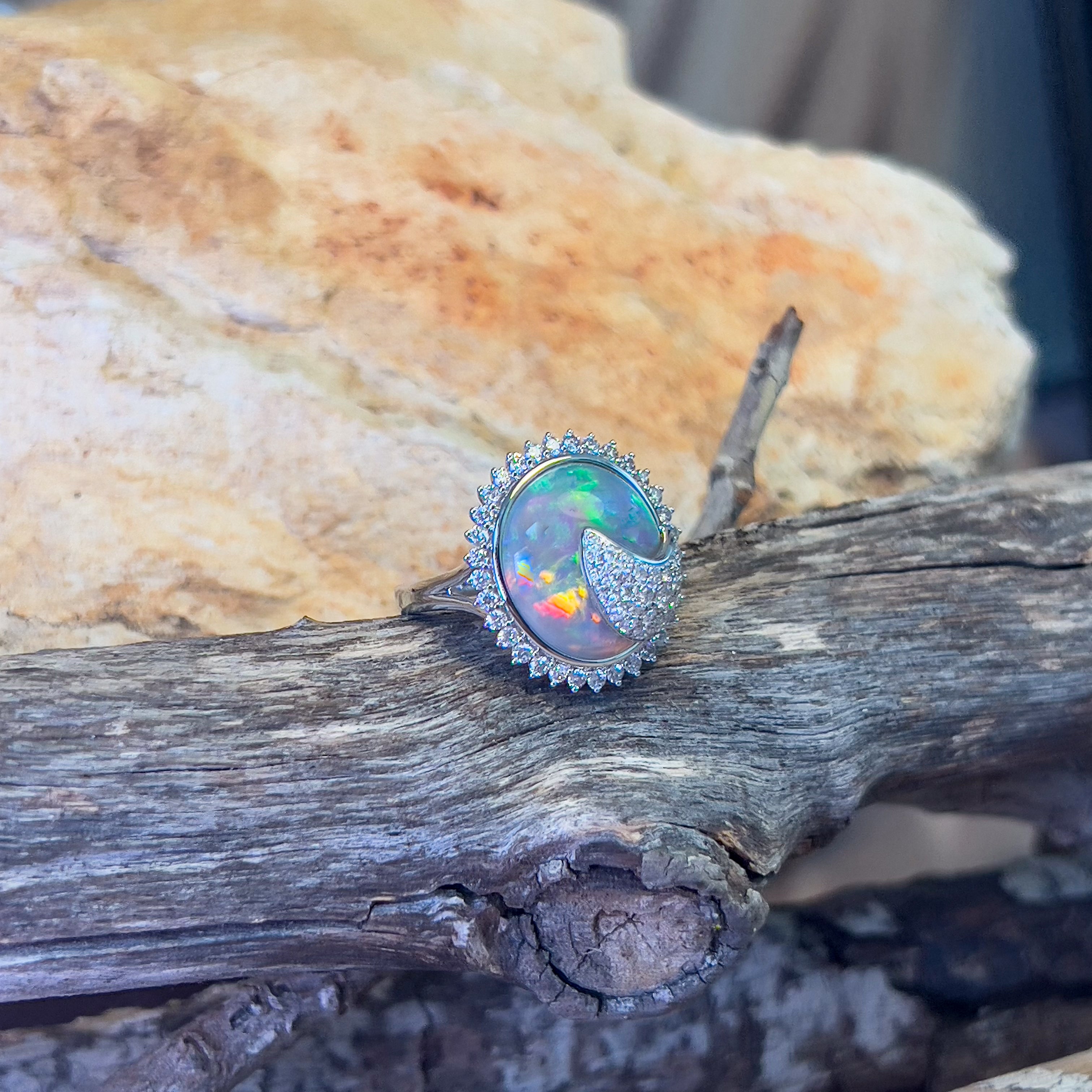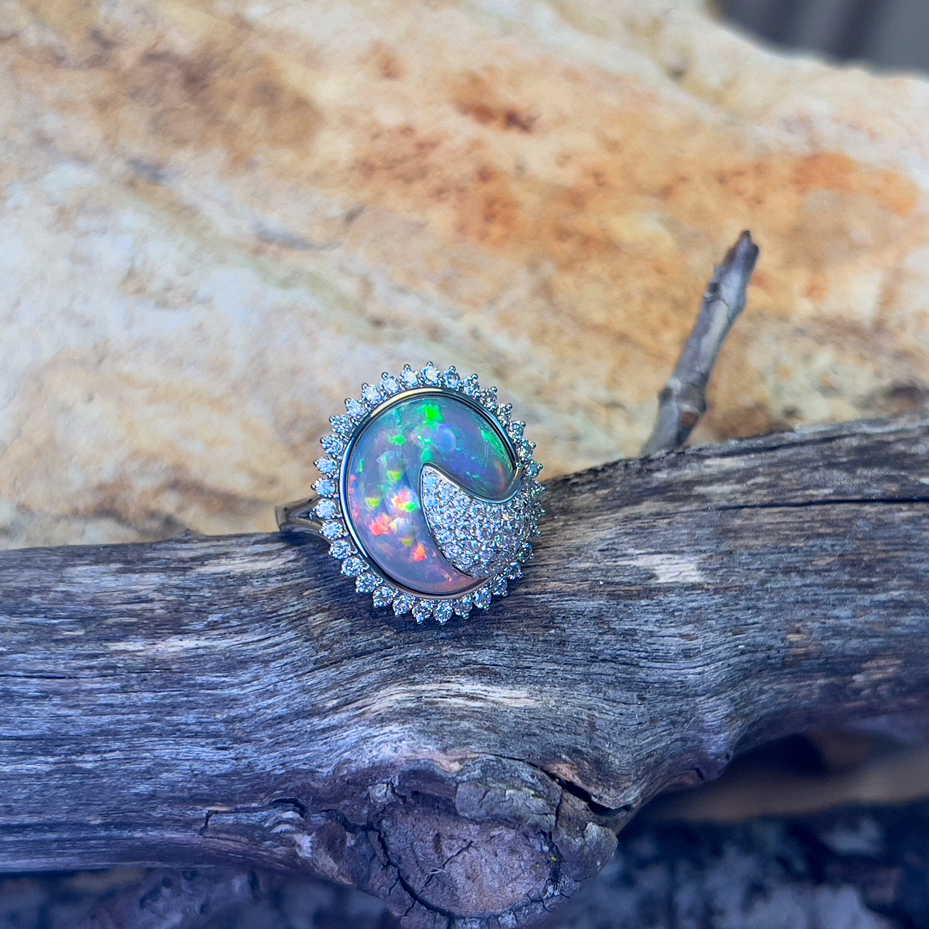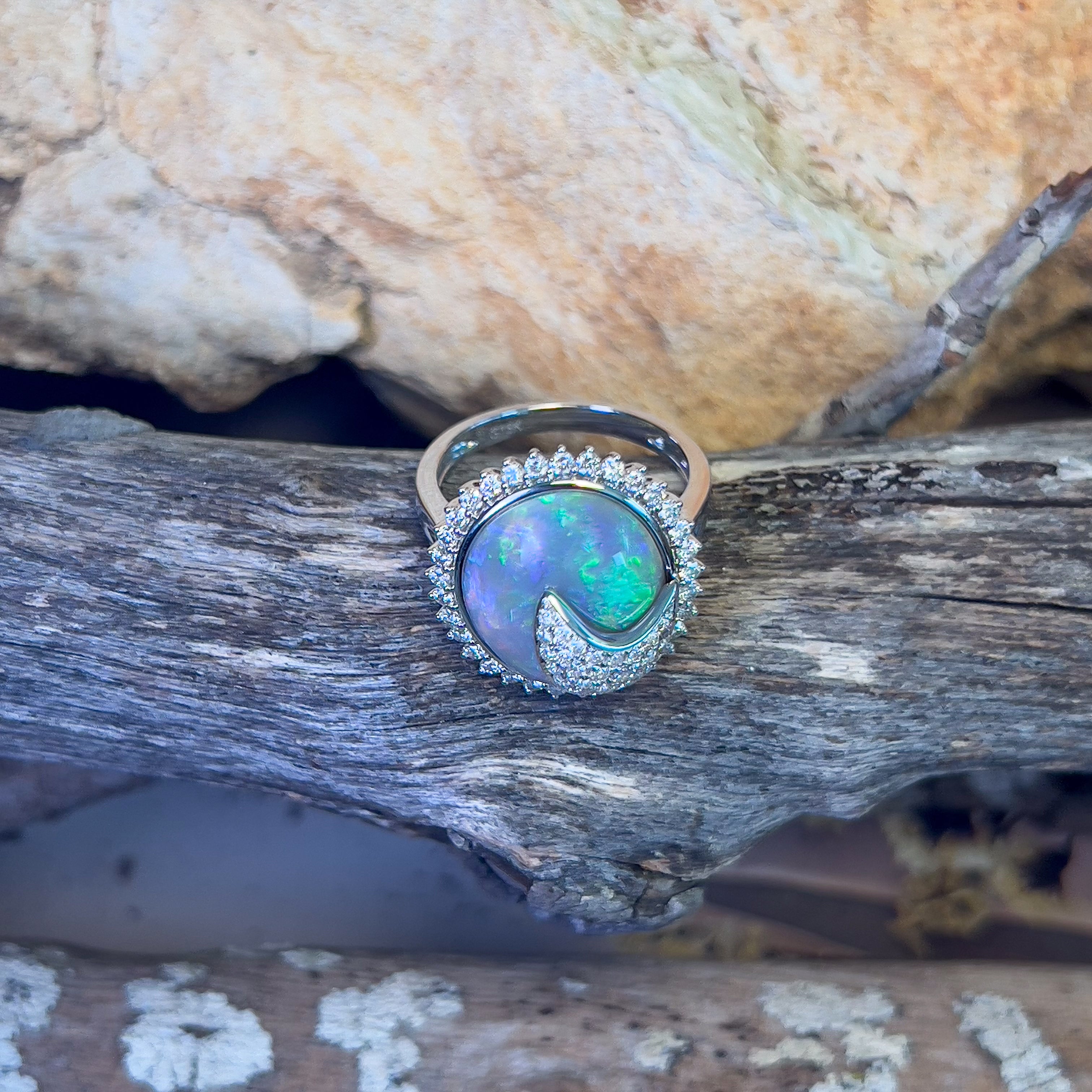 Indulge in timeless elegance with our 18kt White Gold cluster design Black Opal 4.94ct and Diamond ring. This luxurious black opal ring for women showcases a stunning 4.94ct black opal surrounded by sparkling diamonds, making it the perfect statement piece for any occasion. Elevate your style with this exquisite and exclusive ring.