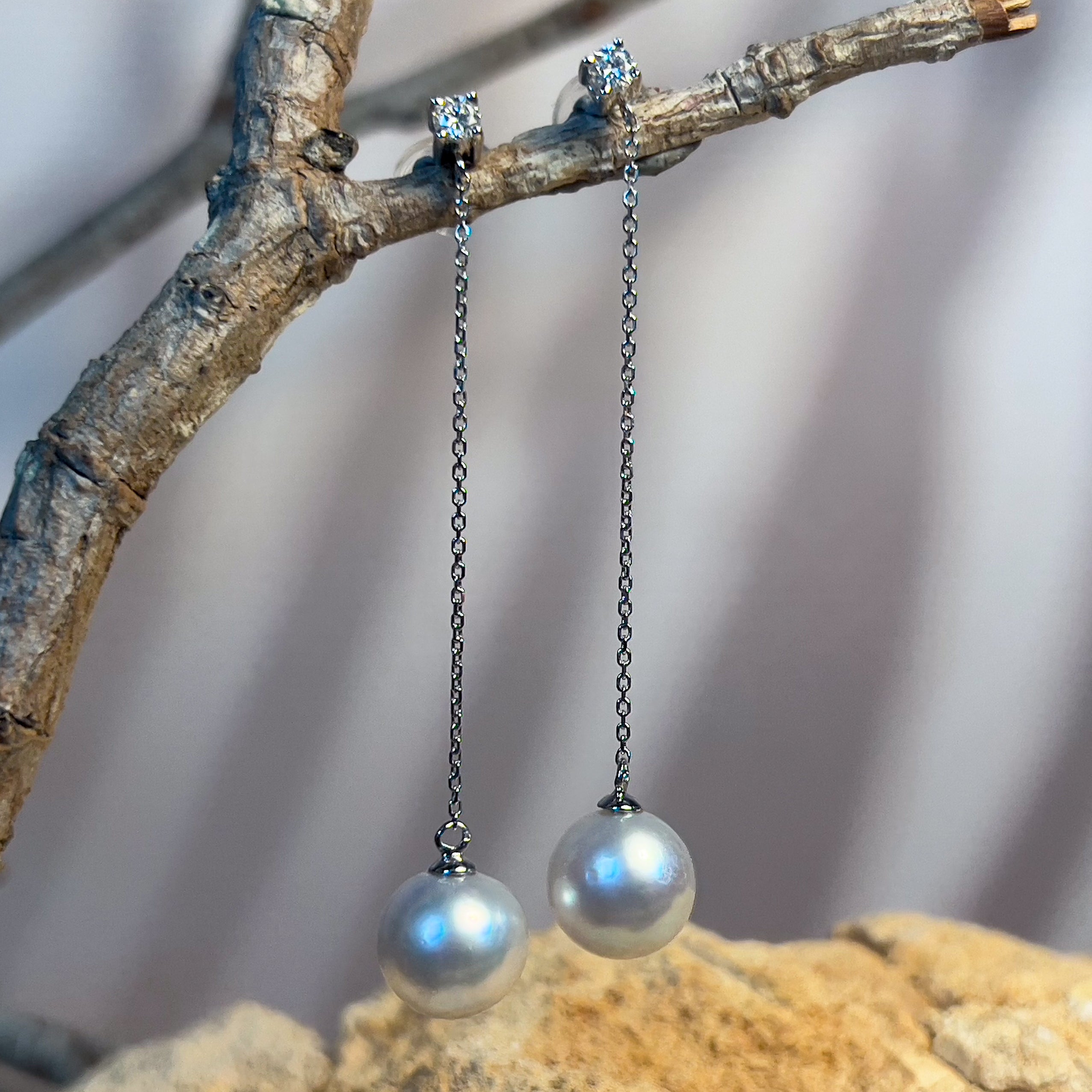 Indulge in ultimate luxury with our 18kt White Gold dangling earrings featuring 8.5-9mm South Sea pearls and dazzling diamonds. Allow the elegant white pearls to drop and sway with every step, making a statement of sophistication and exclusivity. Elevate any outfit to new heights with these exquisite pearl earrings.