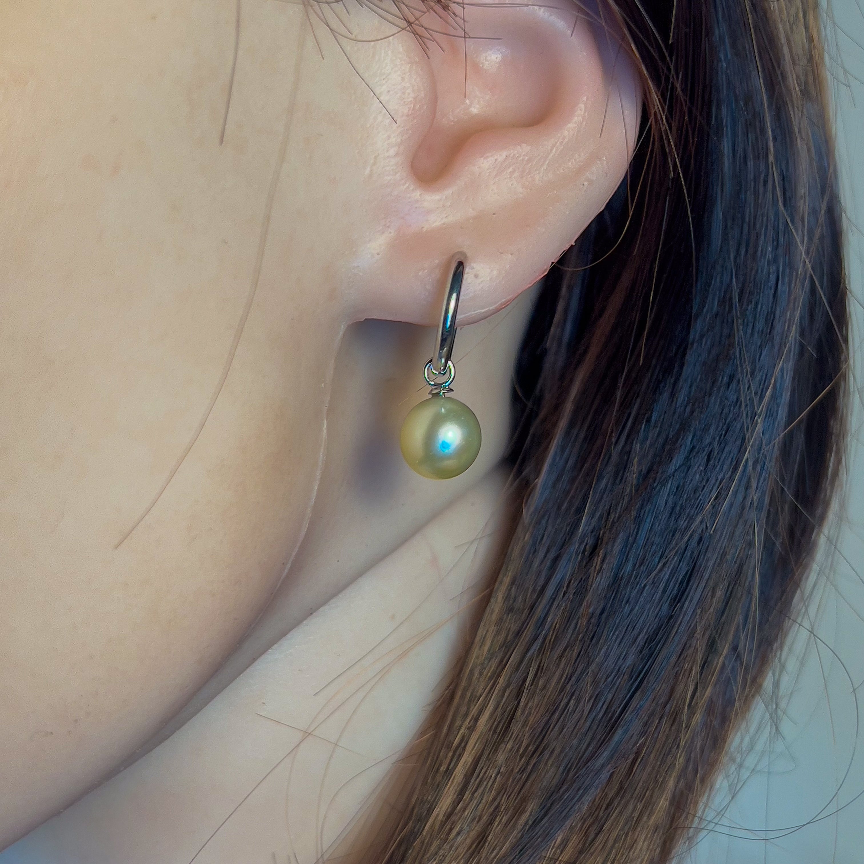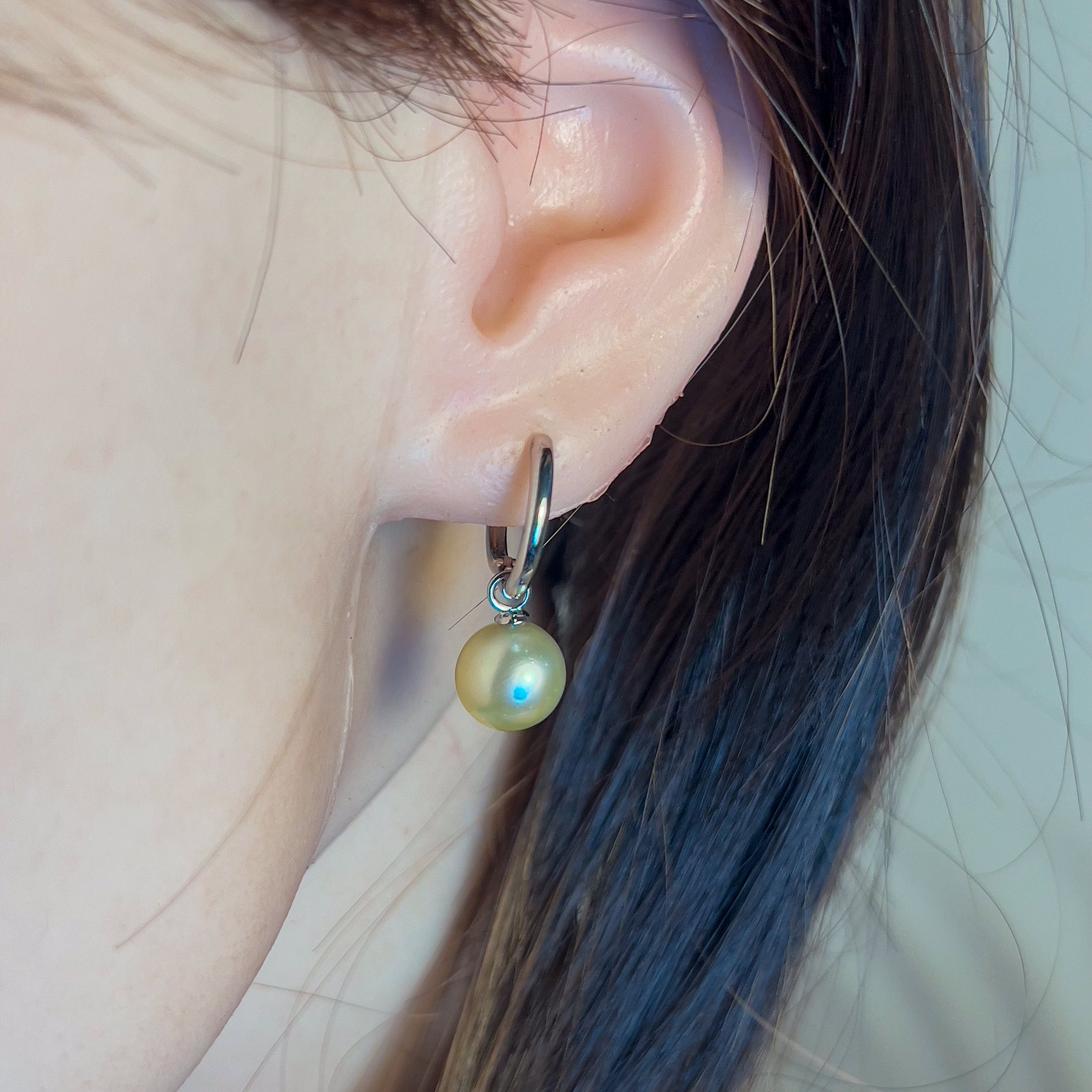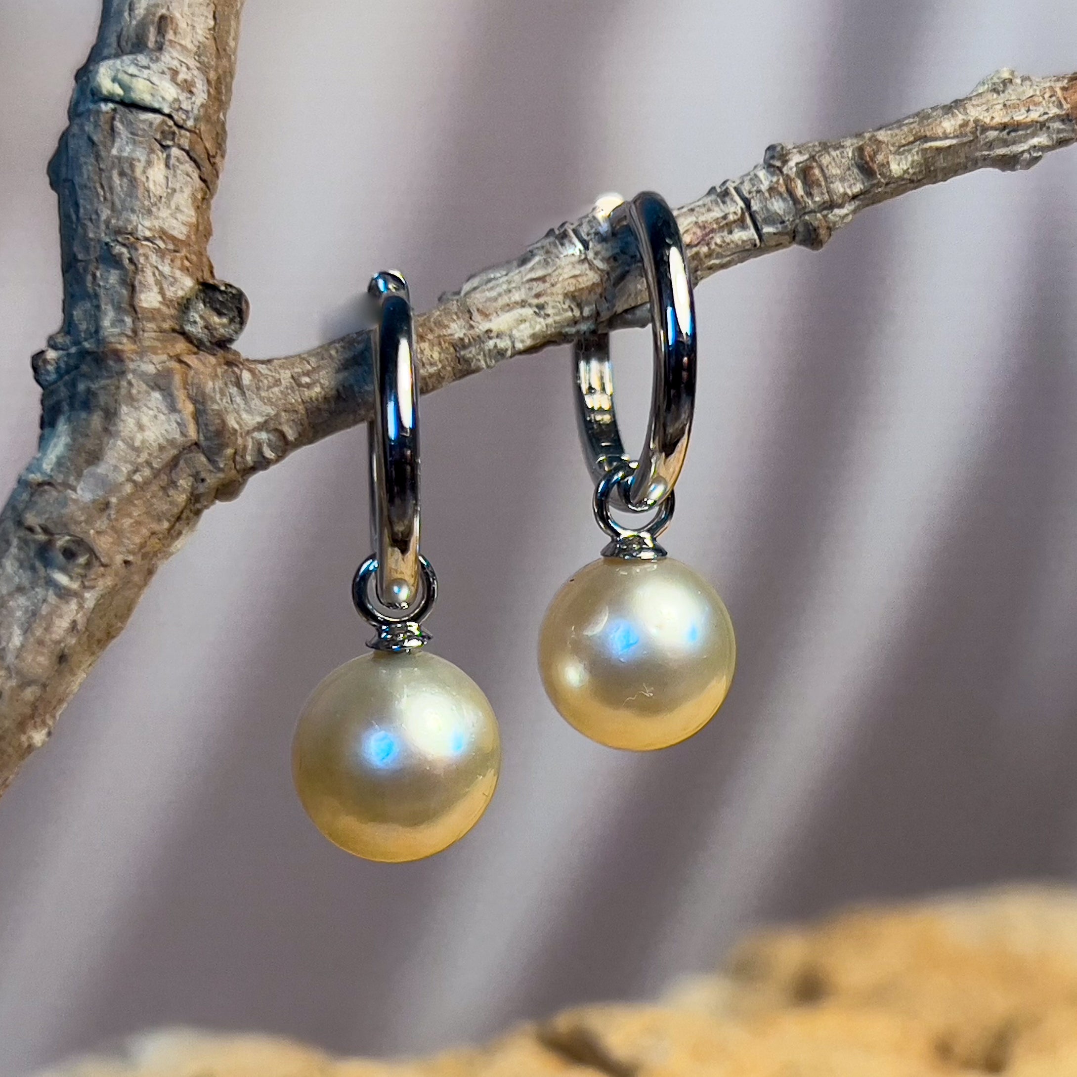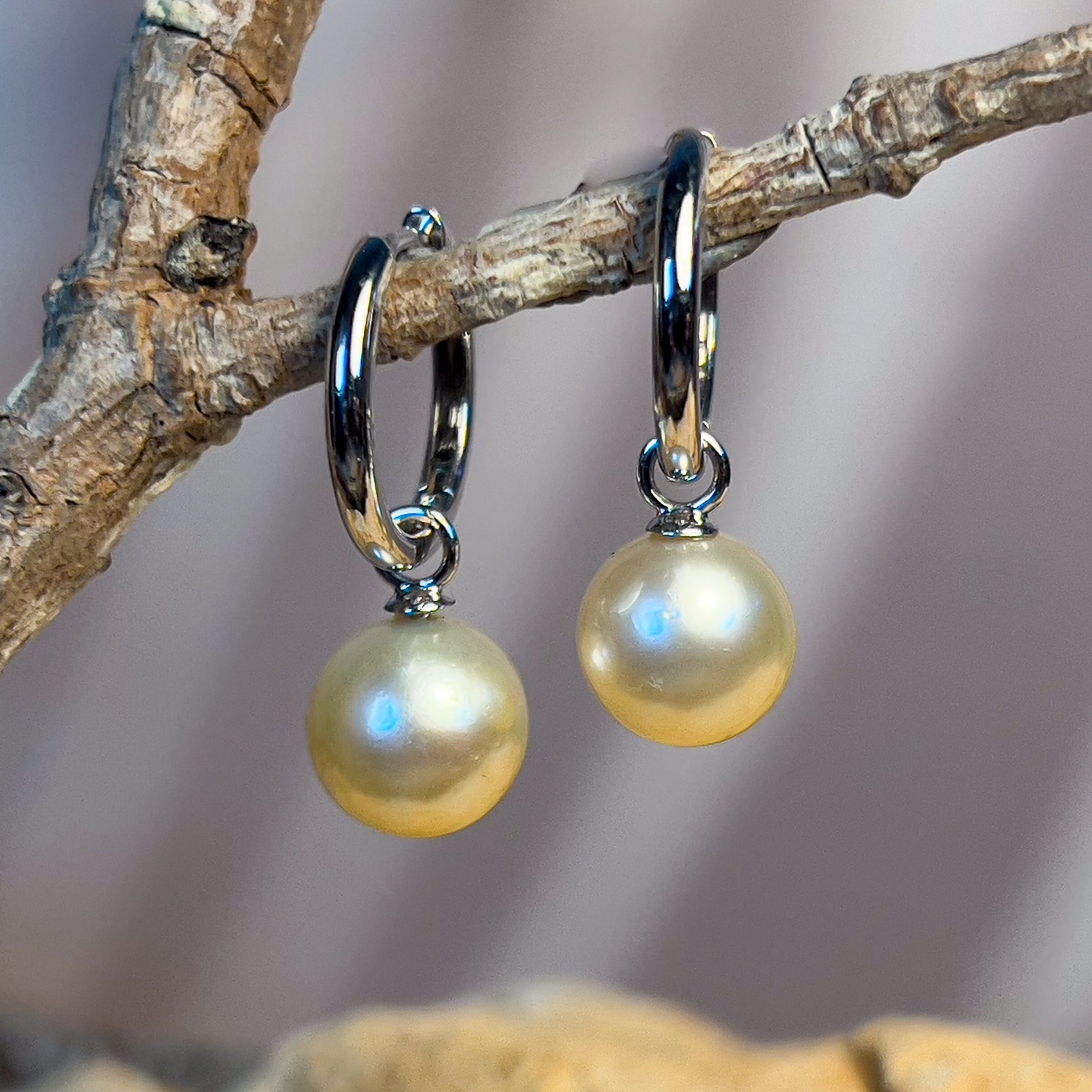 18kt White Gold Huggie Round style dangling 9-9.5mm South Sea Pearl Champagne earrings