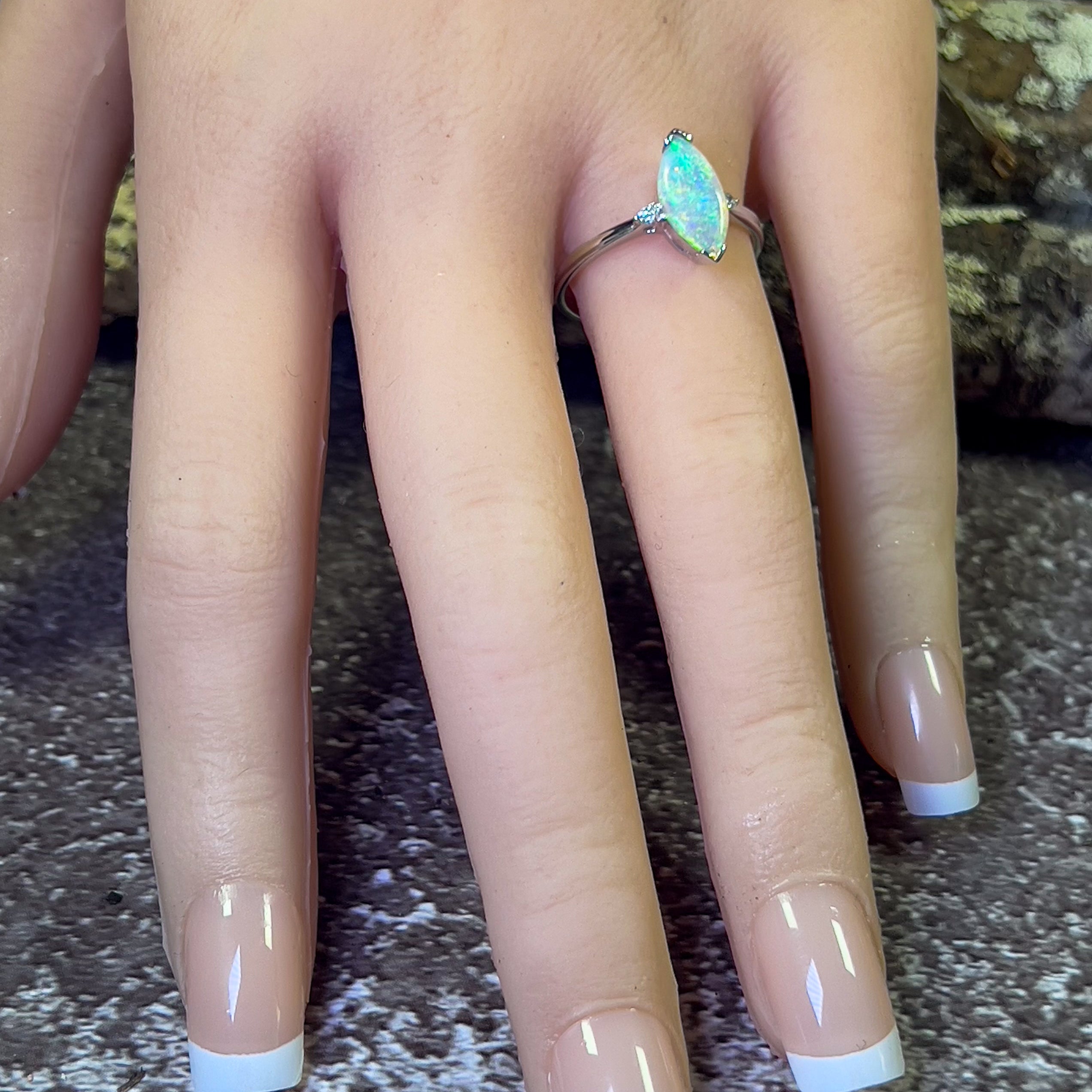 Experience the captivating beauty of our 18kt White Gold Marquise Crystal Opal and diamond ring! Featuring a stunning marquise teal blue opal, this ring exudes elegance and charm. Adorned with sparkling diamonds, it's the perfect accessory for any occasion. Elevate your style with this unique and luxurious piece.