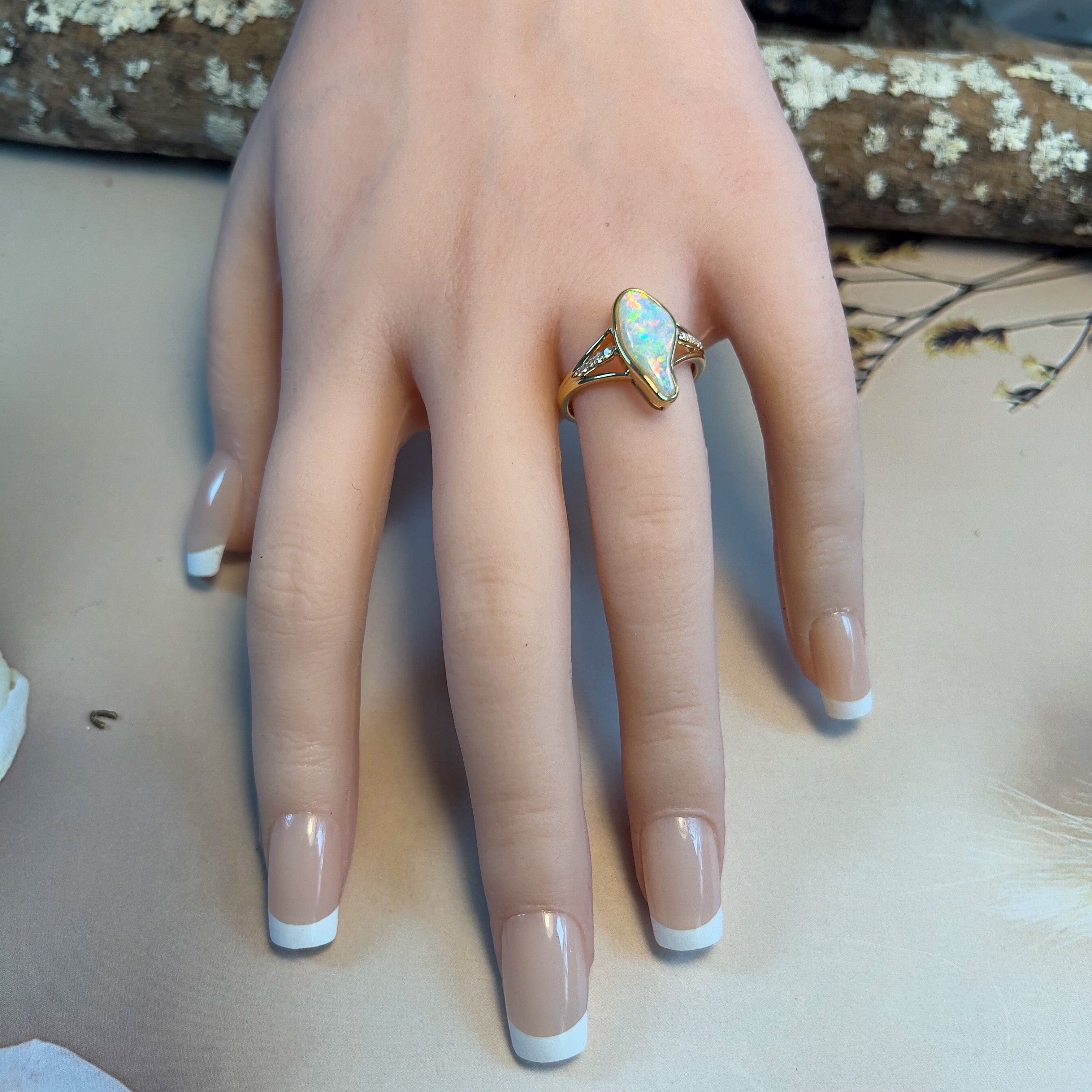Introducing our 18kt Yellow Gold ring with a stunning sharp play of colour featuring a 1.1ct freeform Opal and dazzling diamonds. A bold and unique addition to any jewelry collection. (Eye-catchingly quirky!)