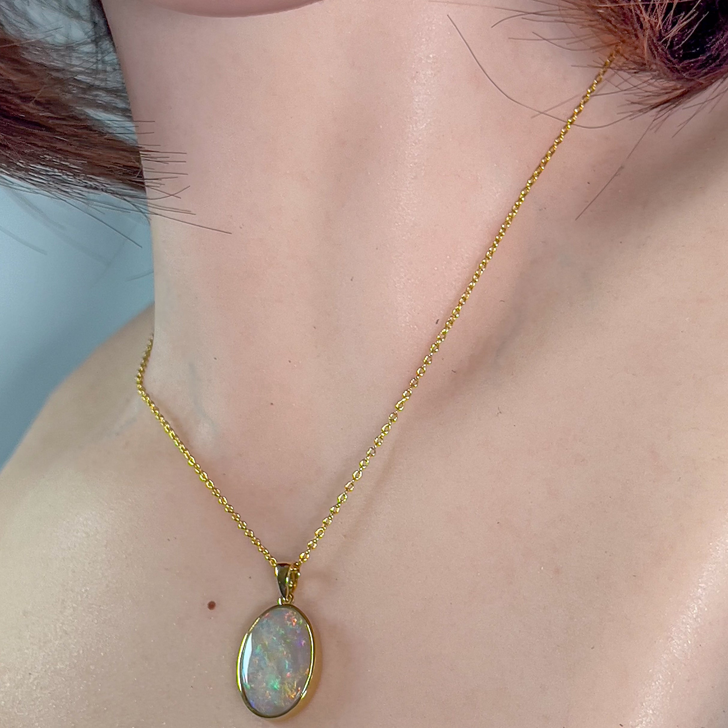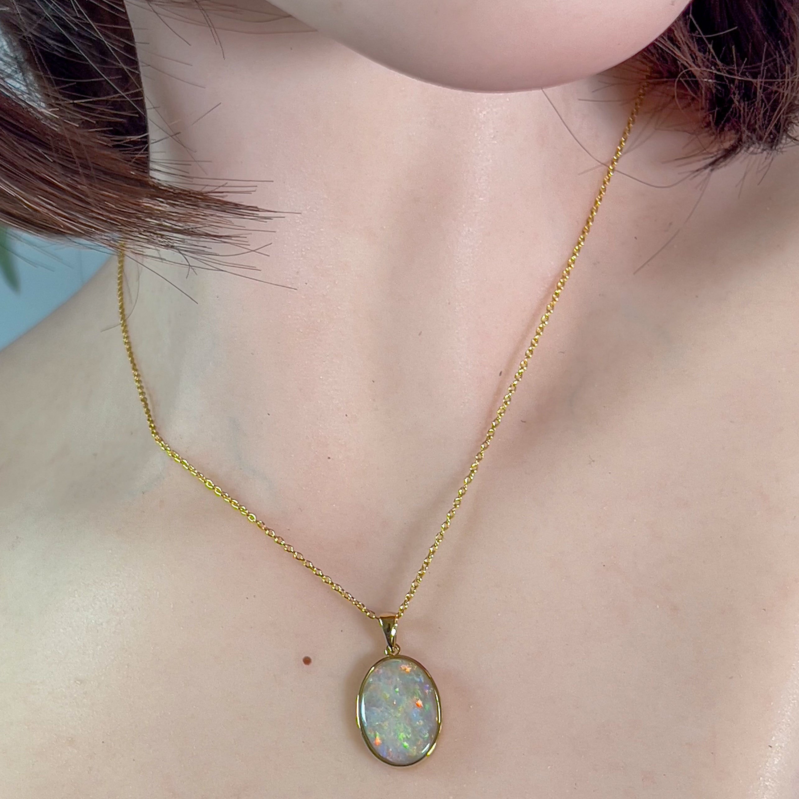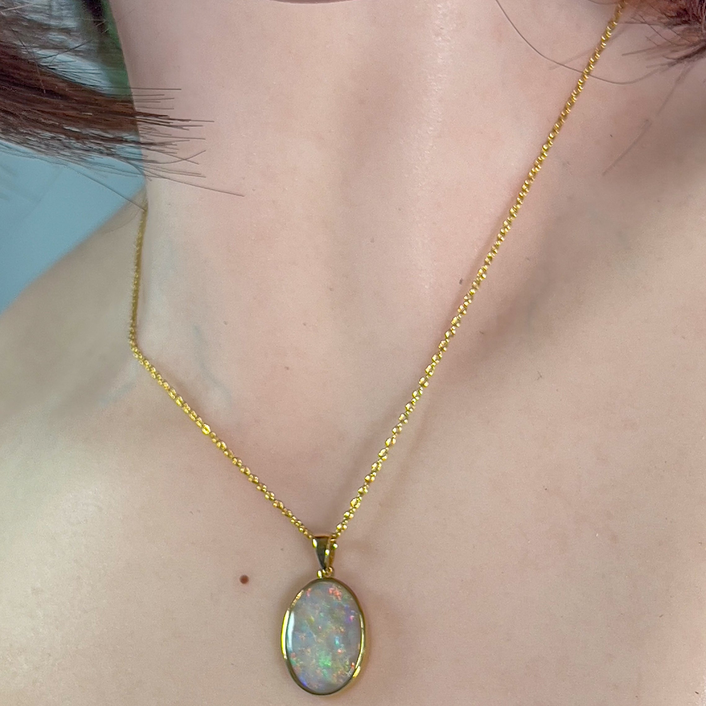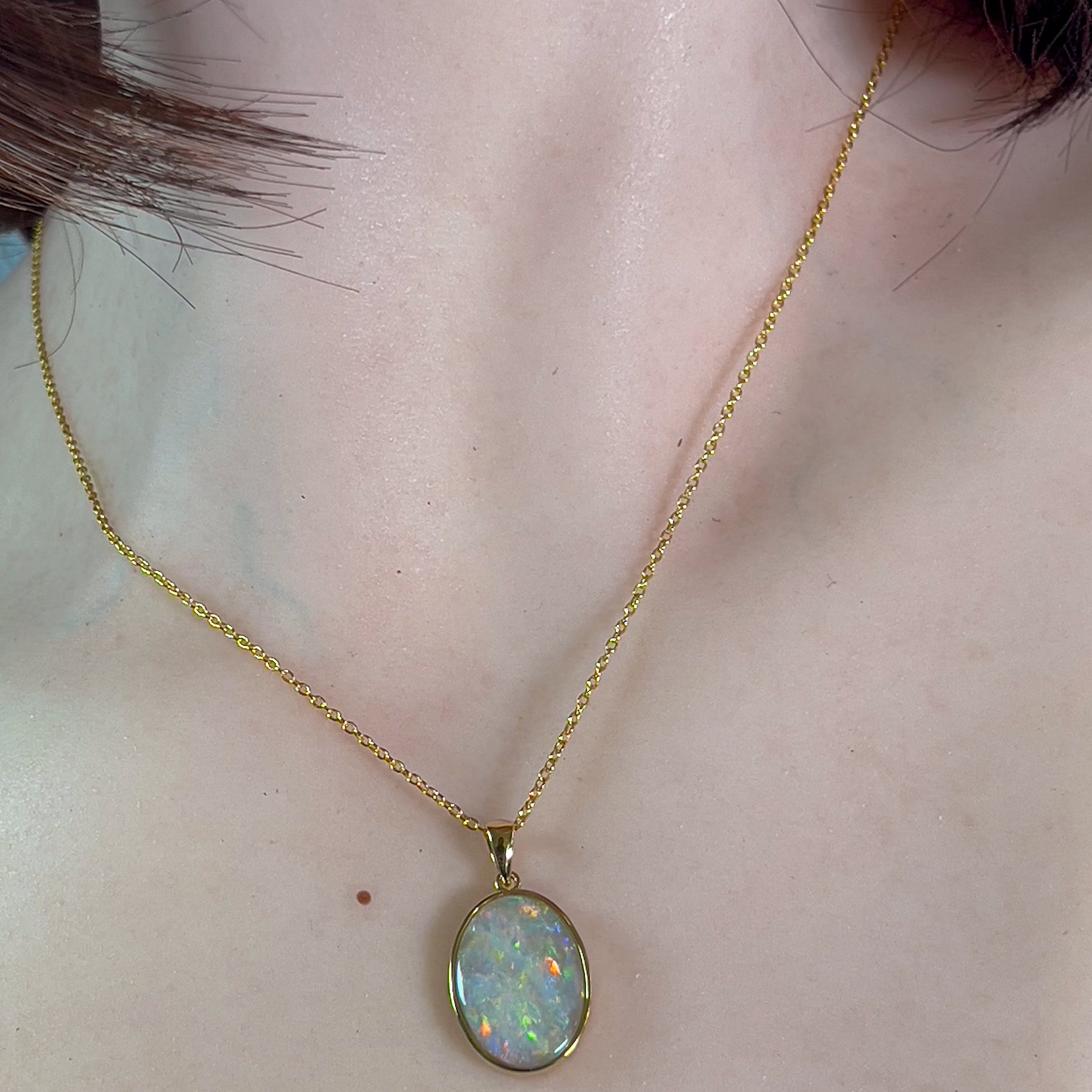Enhance any outfit with our stunning 18kt Yellow Gold Oval Opal pendant! The classic oval shape adds elegant simplicity to this piece, while the bezel setting ensures the opal stays securely in place. Elevate your style with the natural beauty of Opal.
