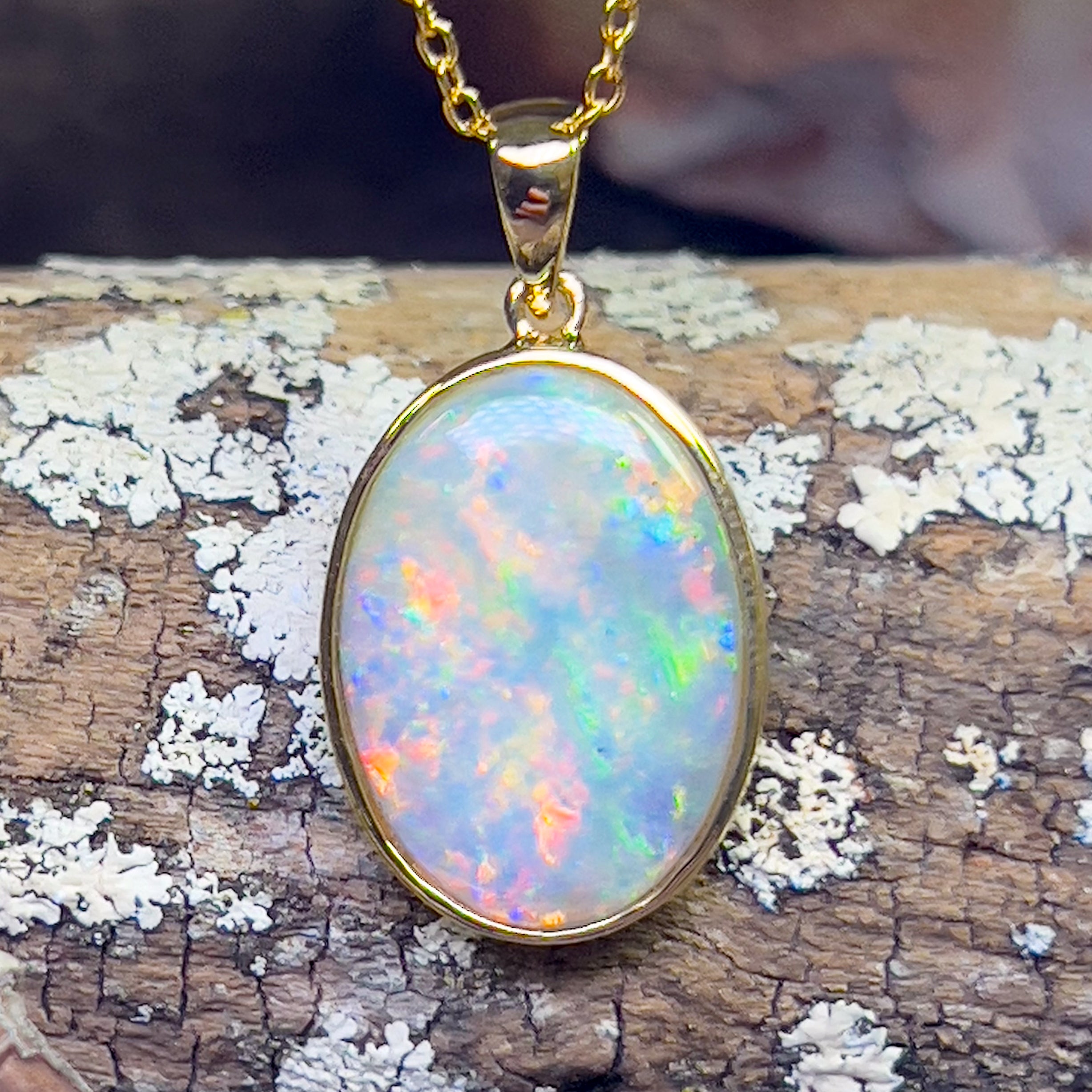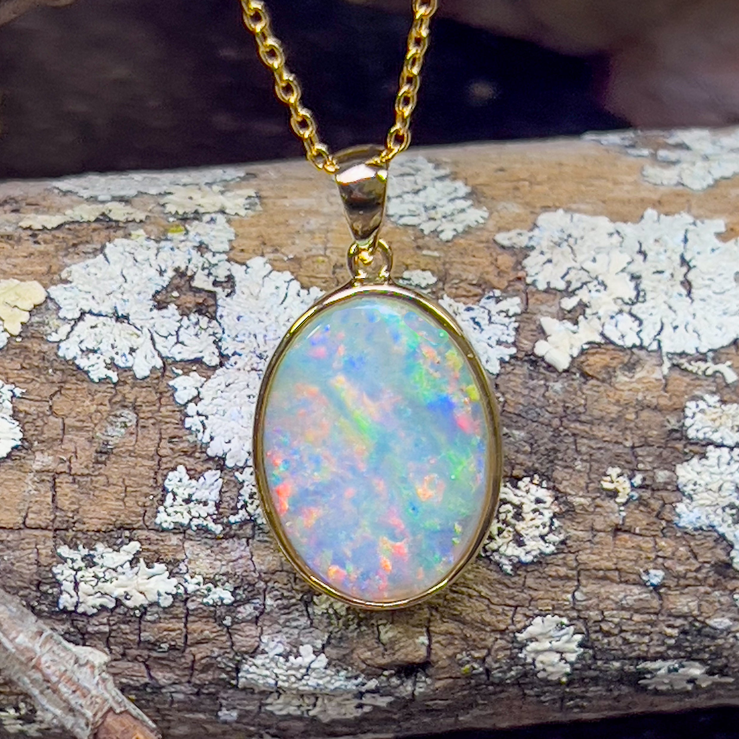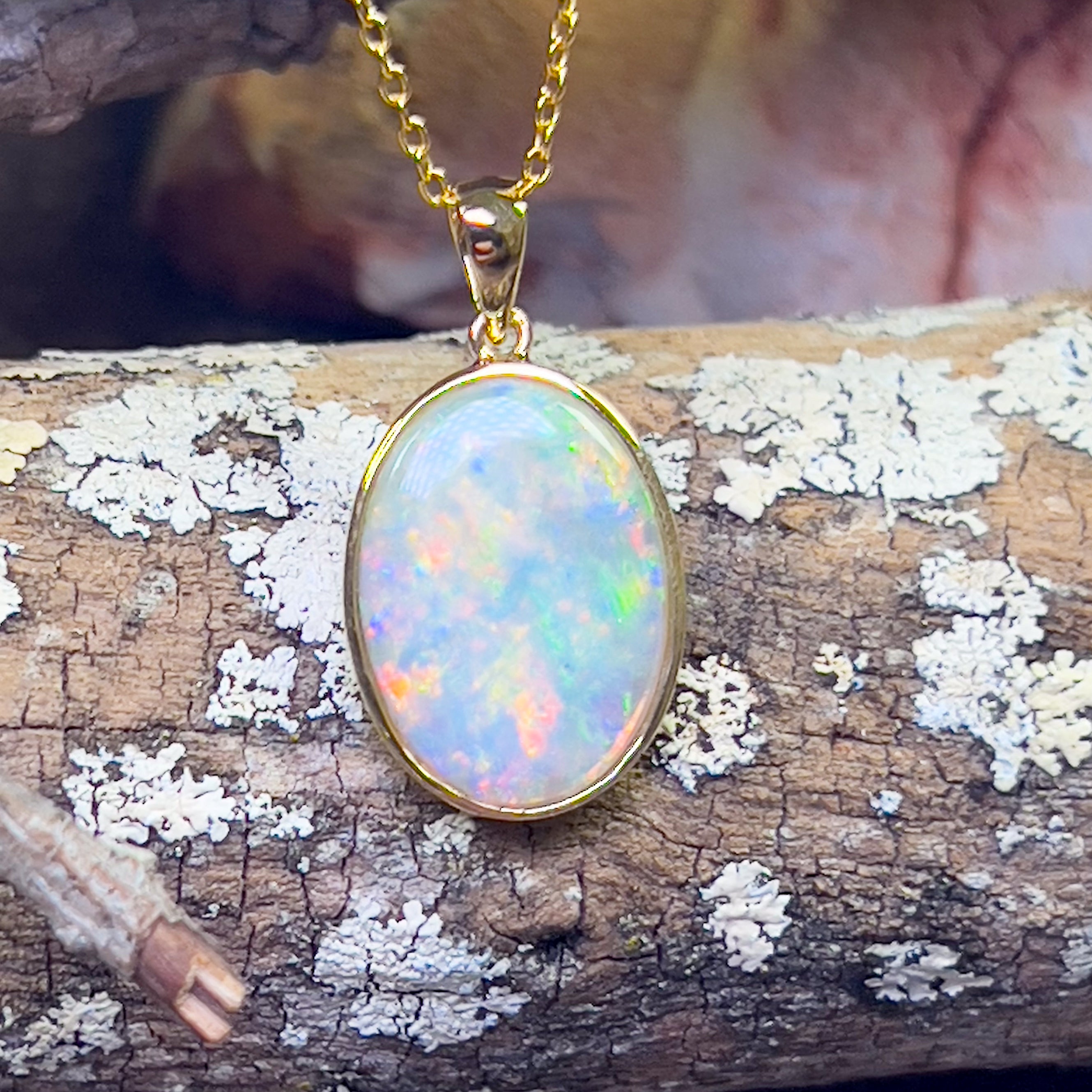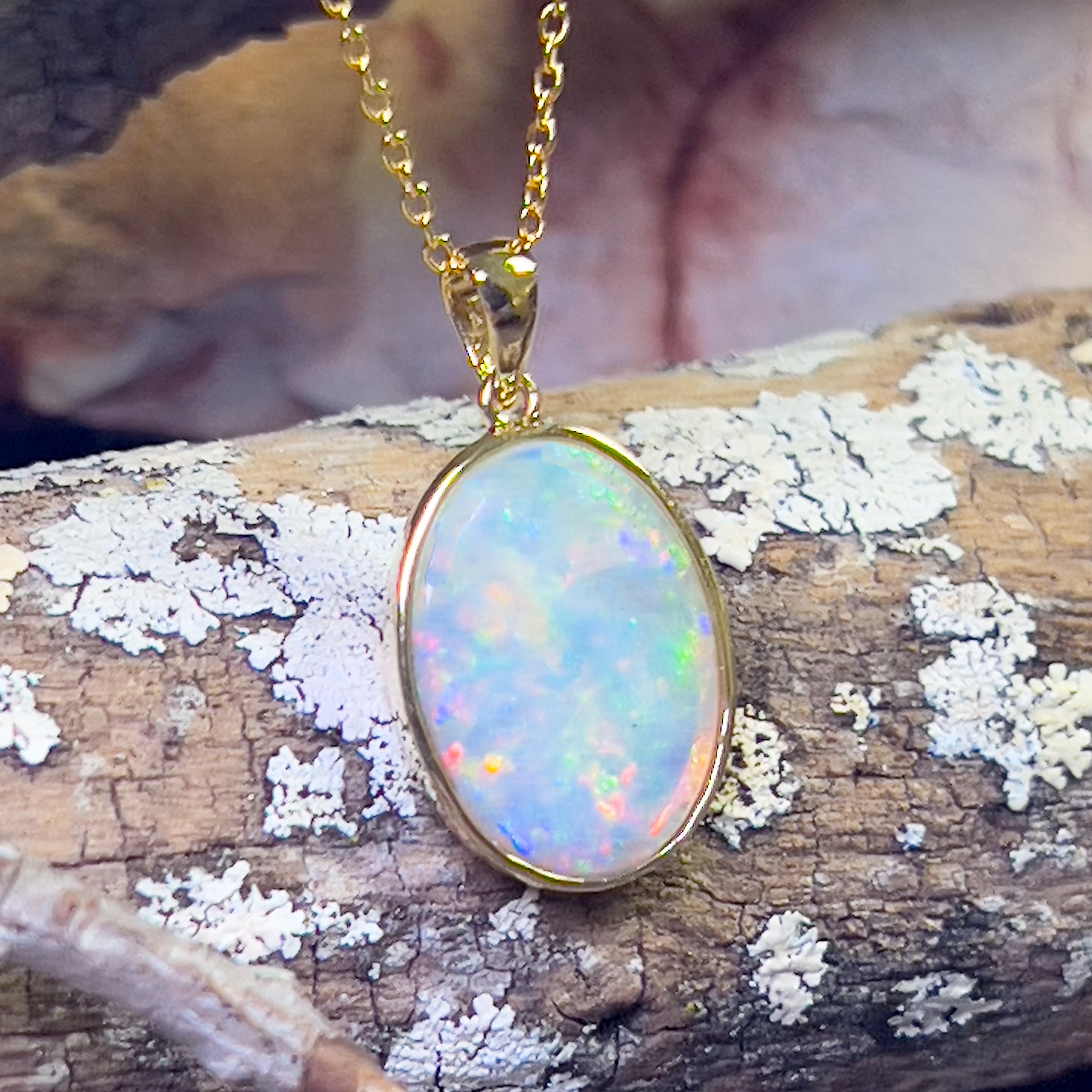 Enhance any outfit with our stunning 18kt Yellow Gold Oval Opal pendant! The classic oval shape adds elegant simplicity to this piece, while the bezel setting ensures the opal stays securely in place. Elevate your style with the natural beauty of Opal.