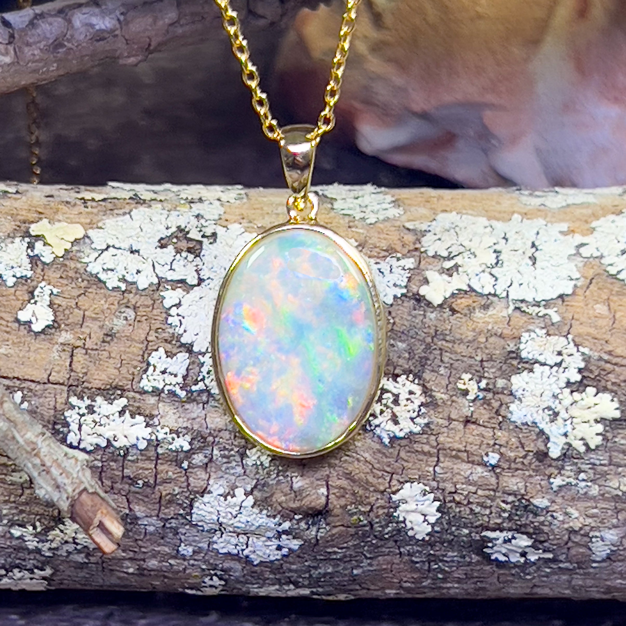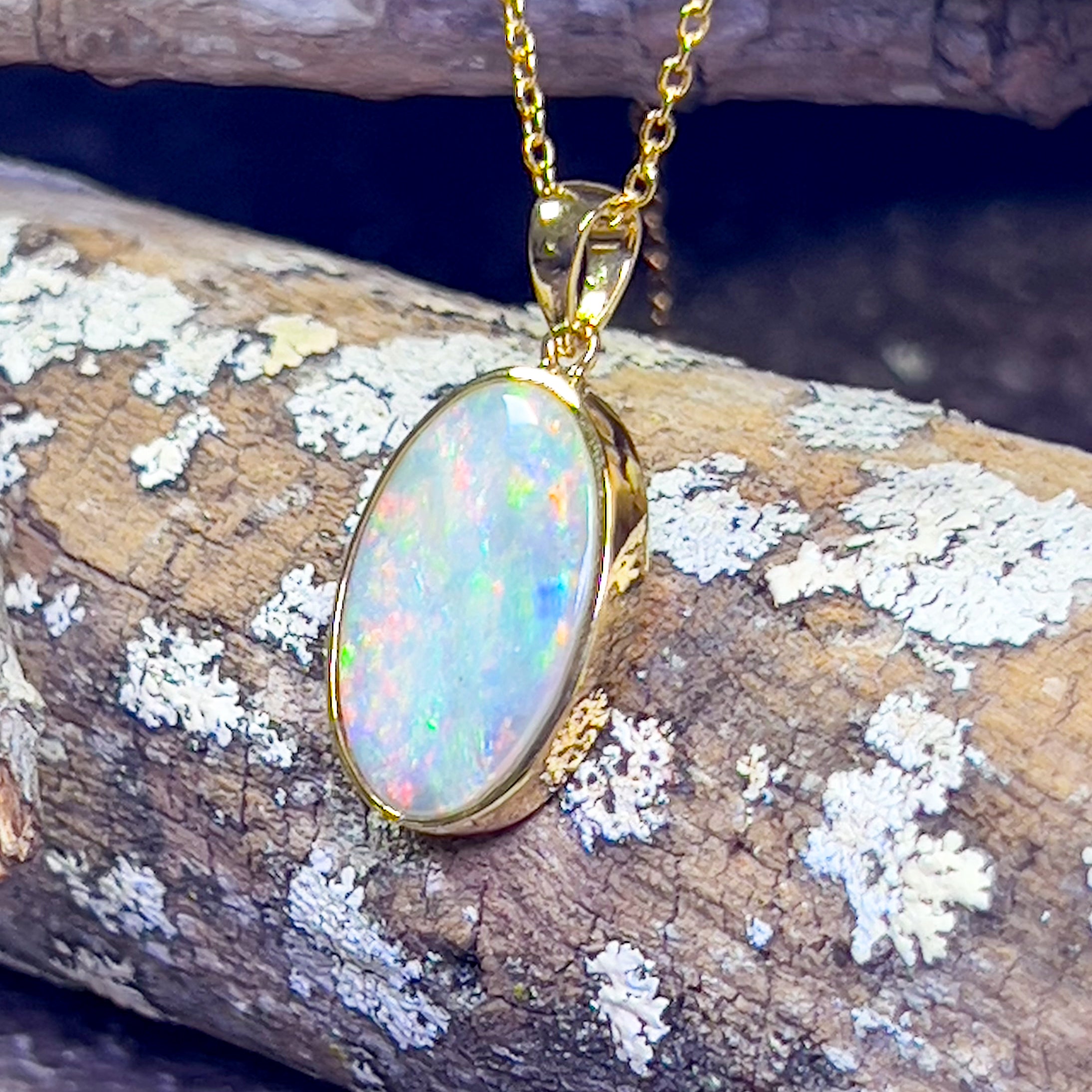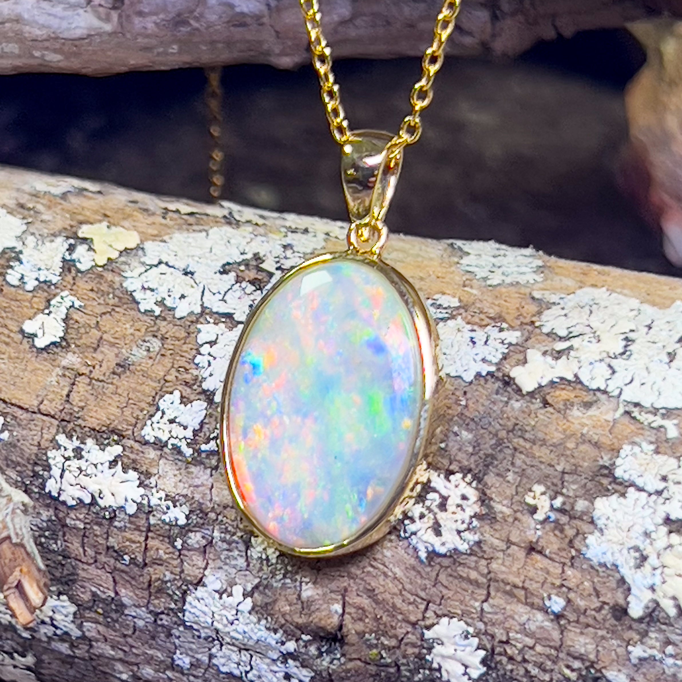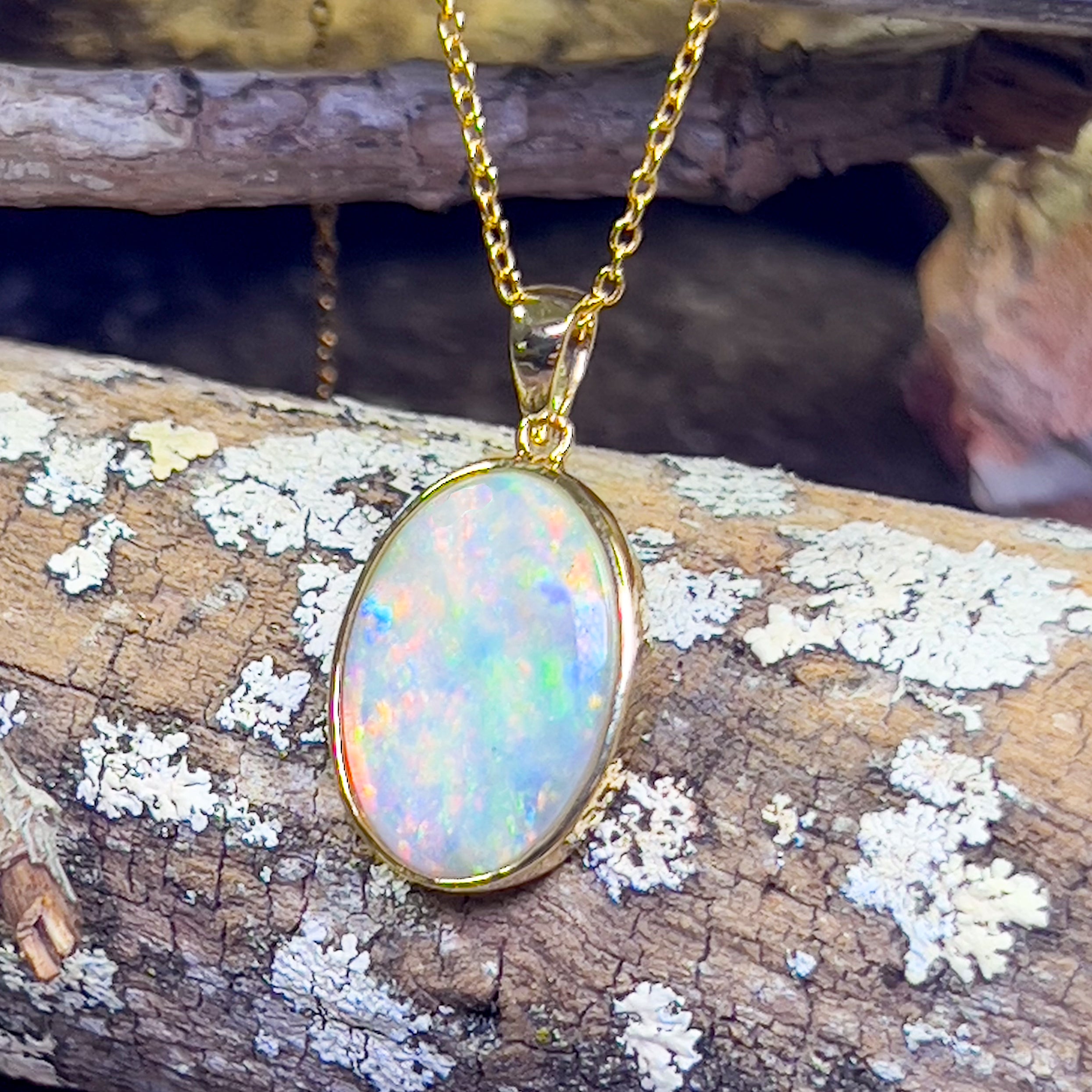 Enhance any outfit with our stunning 18kt Yellow Gold Oval Opal pendant! The classic oval shape adds elegant simplicity to this piece, while the bezel setting ensures the opal stays securely in place. Elevate your style with the natural beauty of Opal.